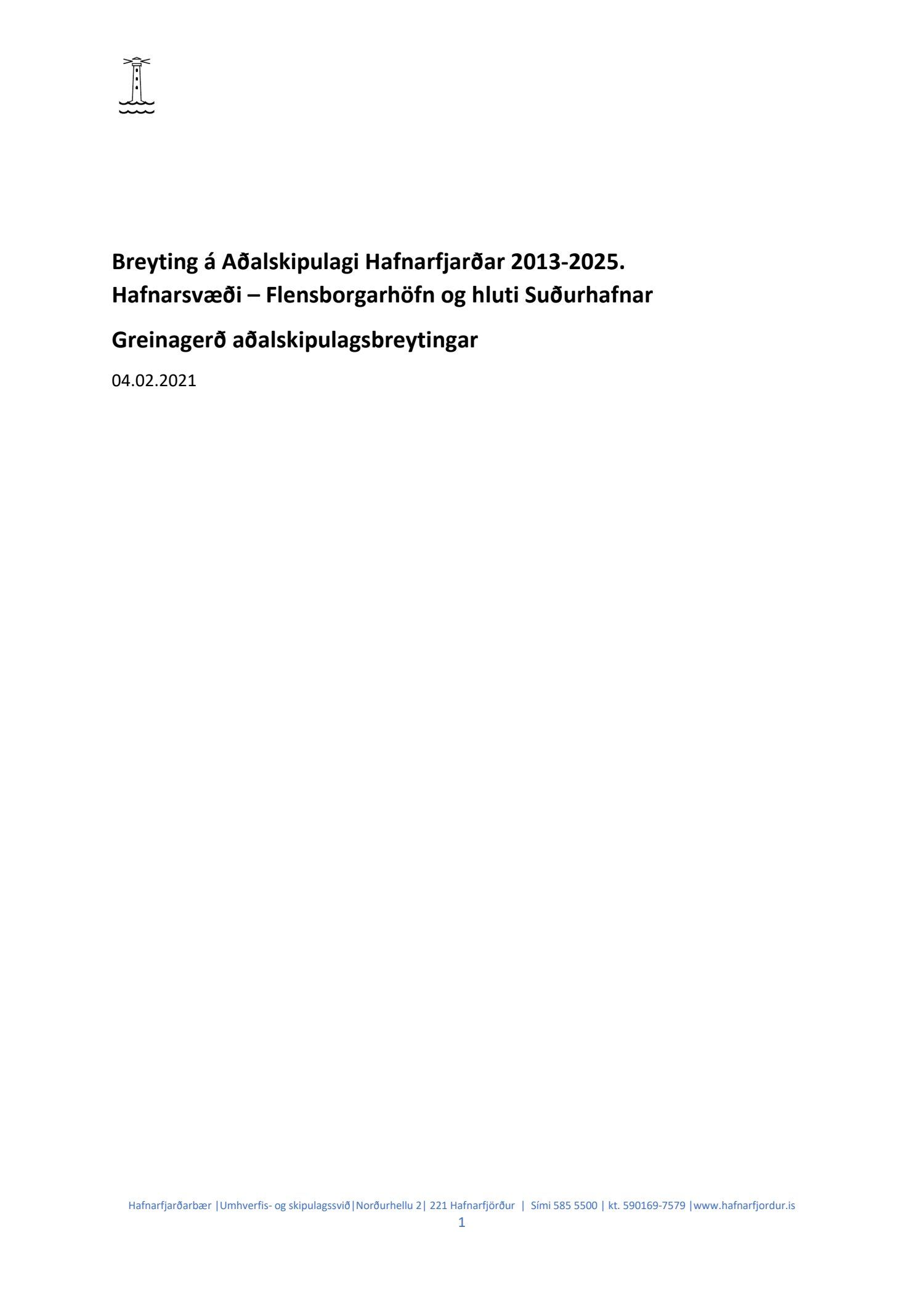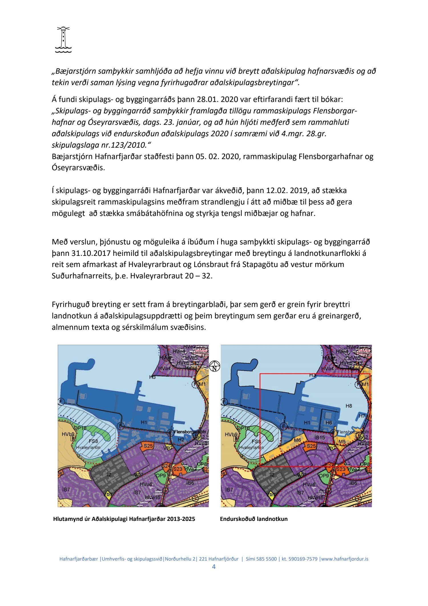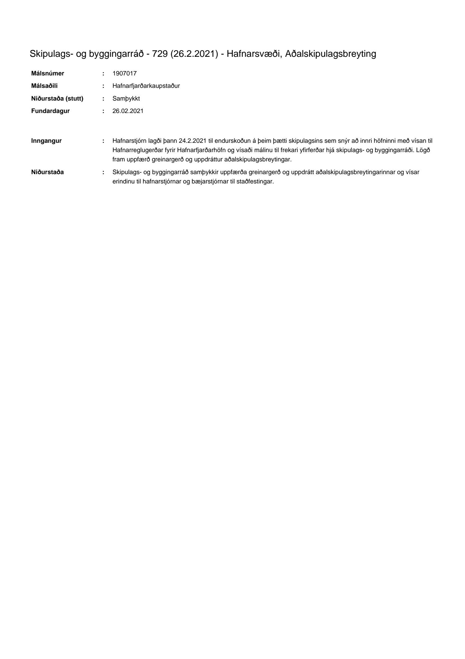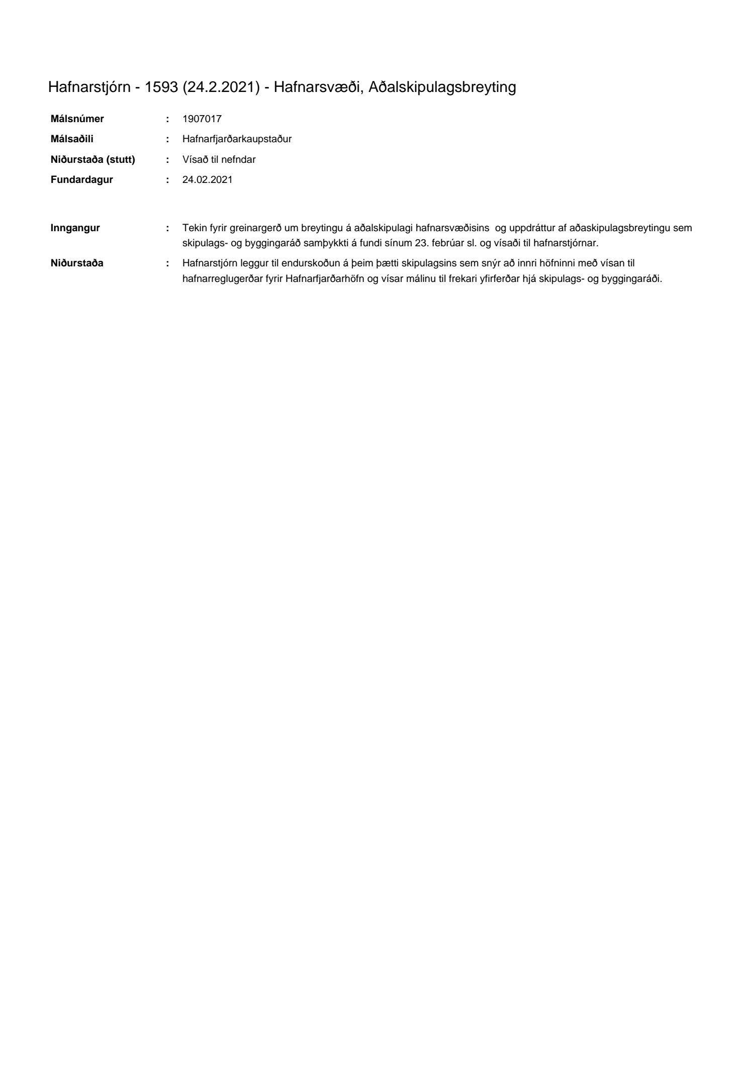 Hafnarstjórn lagði þann 24.2.2021 til endurskoðun á þeim þætti skipulagsins sem snýr að innri höfninni með vísan til Hafnarreglugerðar fyrir Hafnarfjarðarhöfn og vísaði málinu til frekari yfirferðar hjá skipulags- og byggingarráði. Lögð fram uppfærð greinargerð og uppdráttur aðalskipulagsbreytingar.