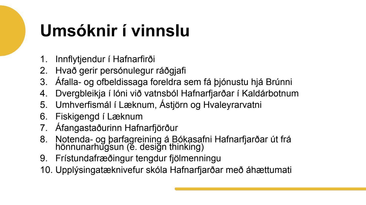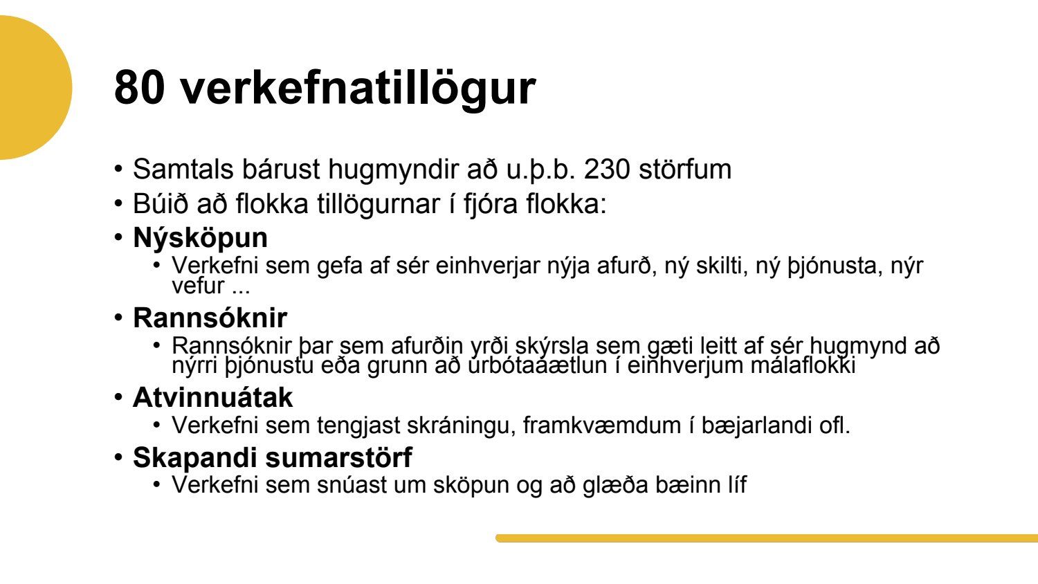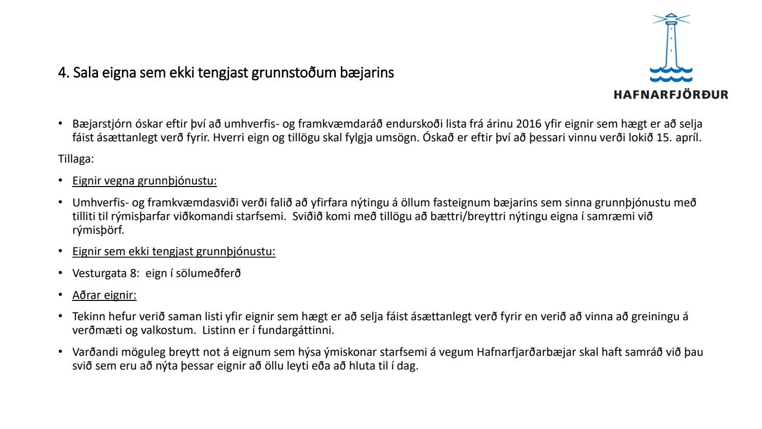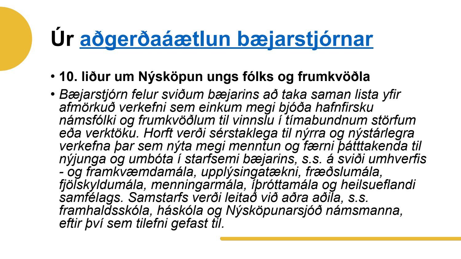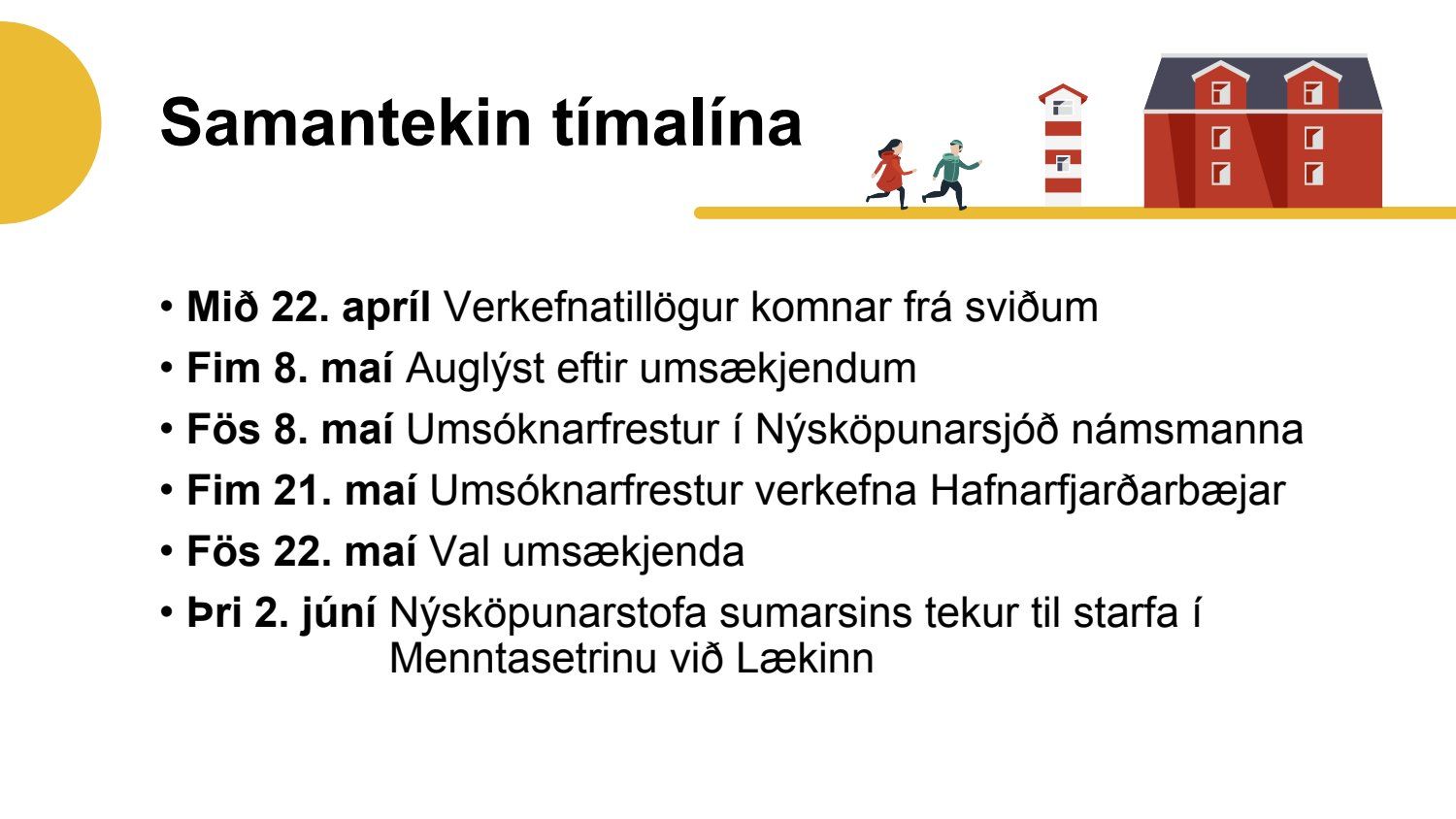 Farið yfir stöðu mála á vinnu við að skapa ný störf í bæjarfélaginu sem hægt verði að bjóða hafnfirsku námsfólki og frumkvöðlum í sumar. Bæjarráð samþykkir að fjölga slíkum störfum um allt að 250 í sumar og að undirbúa opnun ,,Nýsköpunarstofu sumarsins? í Menntasetrinu við Lækinn. Þar verði aðstaða fyrir fyrir ungmenni og frumkvöðla í sumar til að sinna nýsköpunarverkefnum eftir auglýsingar Hafnarfjarðarbæjar þar um og úthlutun verkefna.