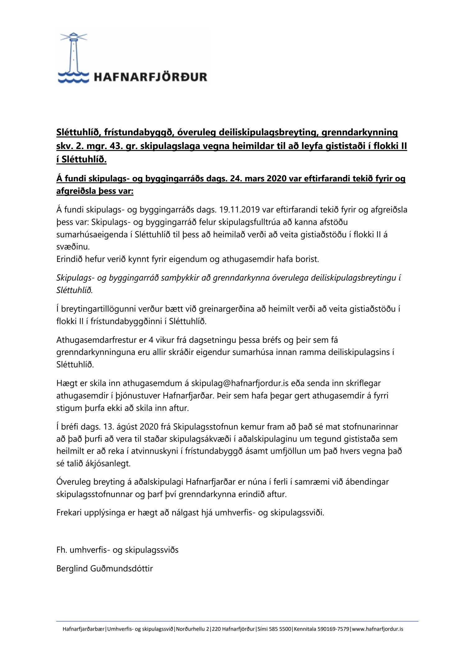 Á fundi skipulags- og byggingarráðs þann 24. mars sl. var samþykkt að grenndarkynna óverulega breytingu á deiliskipulagi Sléttuhlíðar þar sem bætt yrði í greinargerðina heimild til að samþykkja gistiaðstöðu í flokki II í frístundabyggðinni í Sléttuhlíð. Skipulags- og byggingarráð samþykkti breytingu á deiliskipulaginu samanber umsögn skipulagsfulltrúa og vísaði erindinu til staðfestingar í bæjarstjórn.
