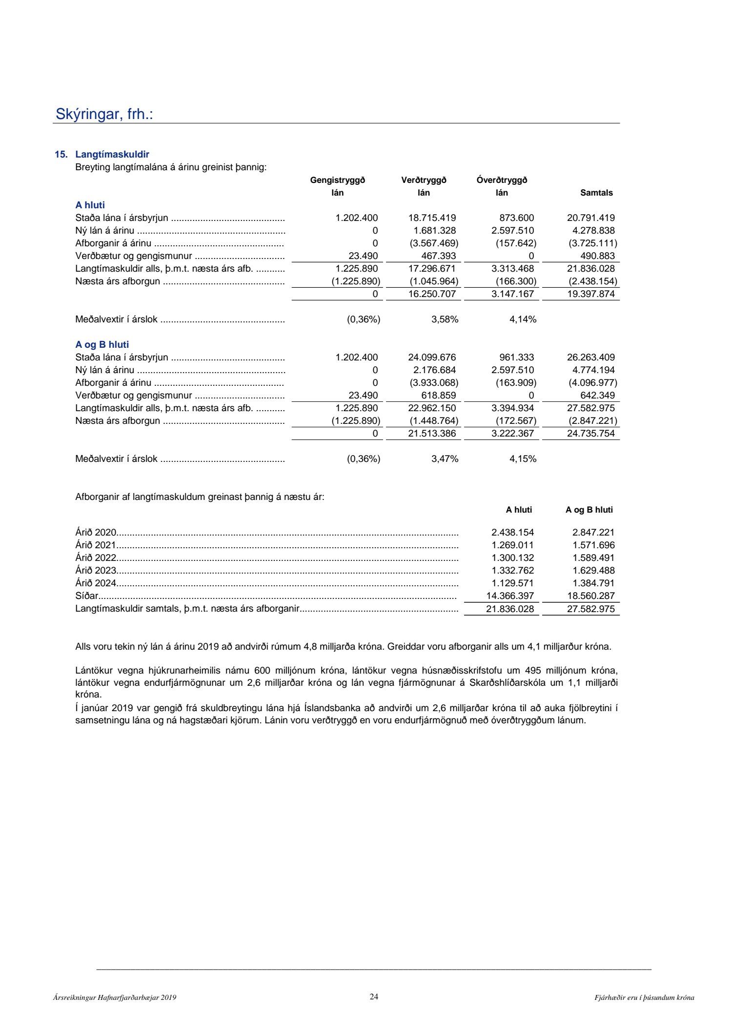 Til að mæta þessu reyndist nauðsynlegt að grípa til lántöku eins og sést í sjóðstreymisyfirliti - fjármögnunarhreyfingar: Tekin ný framkvæmdalán uppá 4,3 milljarða en fjárhagsáætlun gerði ráð fyrir 1,7 milljarði. Hluti þessarar upphæðar var notuð til að greiða afborganir langtímalána uppá 3,7 milljarða á meðan fjárhagsáætlun gerði ráð fyrir afborgunum uppá 1,1 milljarð. Það er að ný lán umfram fjárhagsáætlun 2019 voru 2,5 milljarðar, og afborganir umfram fjárhagsáætlun 2019 nam 2,2 milljörðum. Mismunur þarna á er 300 milljónir.
