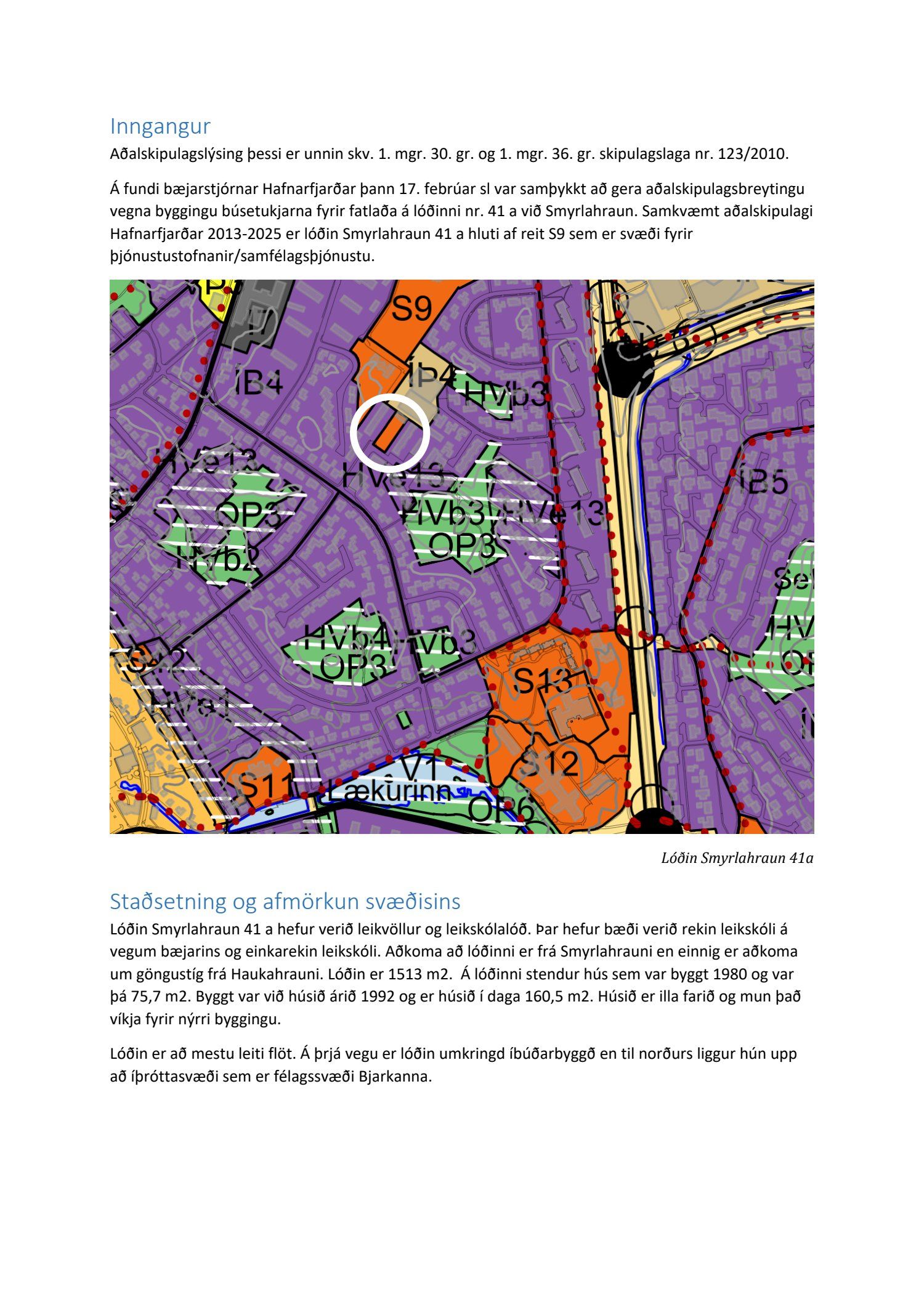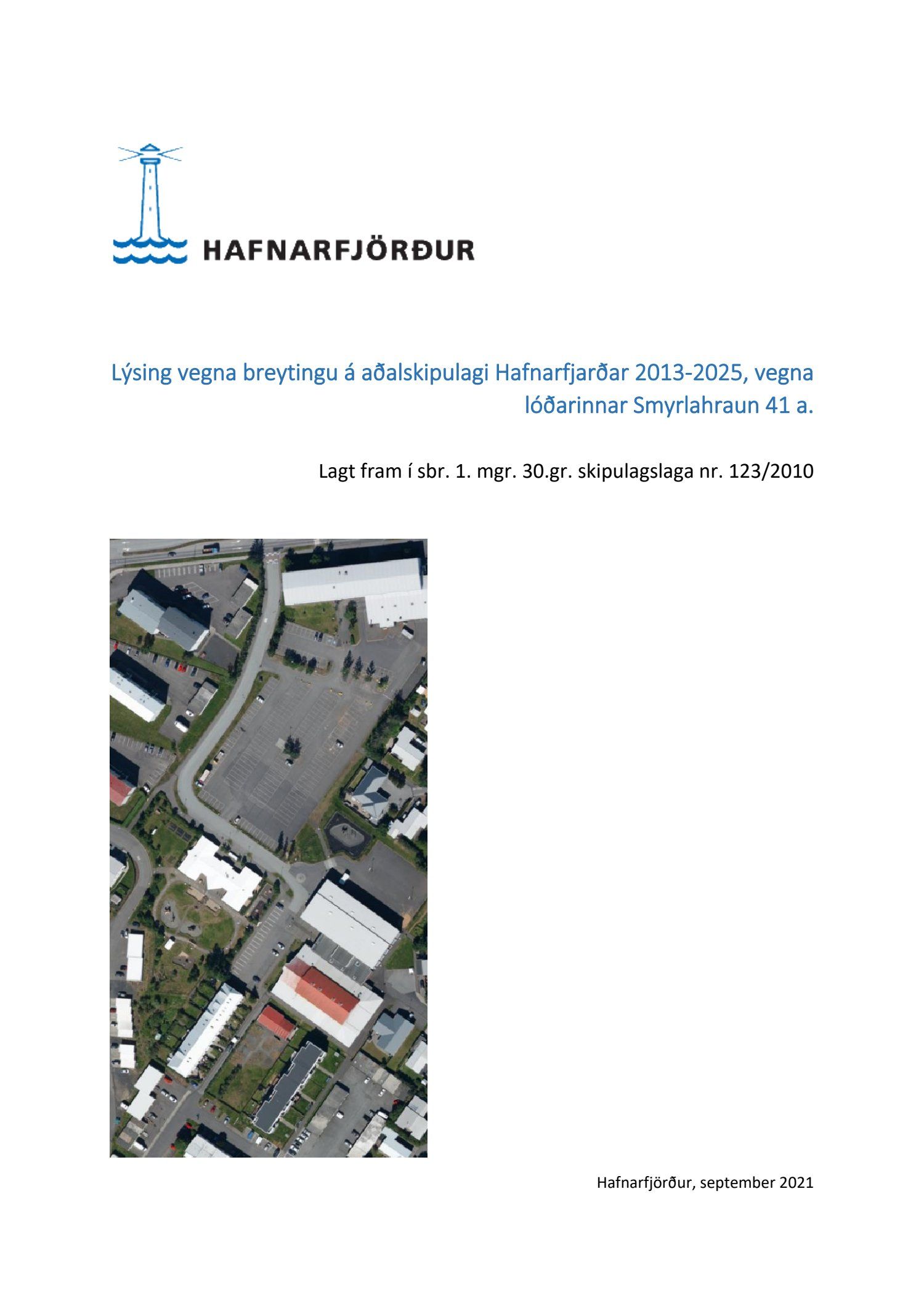 Skipulags- og byggingarráð samþykkti 4. maí 2021 að málsmeðferð vegna aðalskipulagsbreytinga Smyrlahrauns 41a færi skv. 1. mgr. 36. greinar skipulagslaga. Lögð fram lýsing vegna breytinga á aðalskipulagi Hafnarfjarðar 2013-2025. Breytingin snýr að landnotkun. Skipulags- og byggingarráð leggur til við bæjarstjórn að gerð verði breyting á aðalskipulagi Hafnarfjarðar 2013-2025 er varðar landnotkun Smyrlahrauns 41a. Skipulags- og byggingarráð samþykkir framlagða lýsingu og visar til staðfestingar í bæjarstjórn.