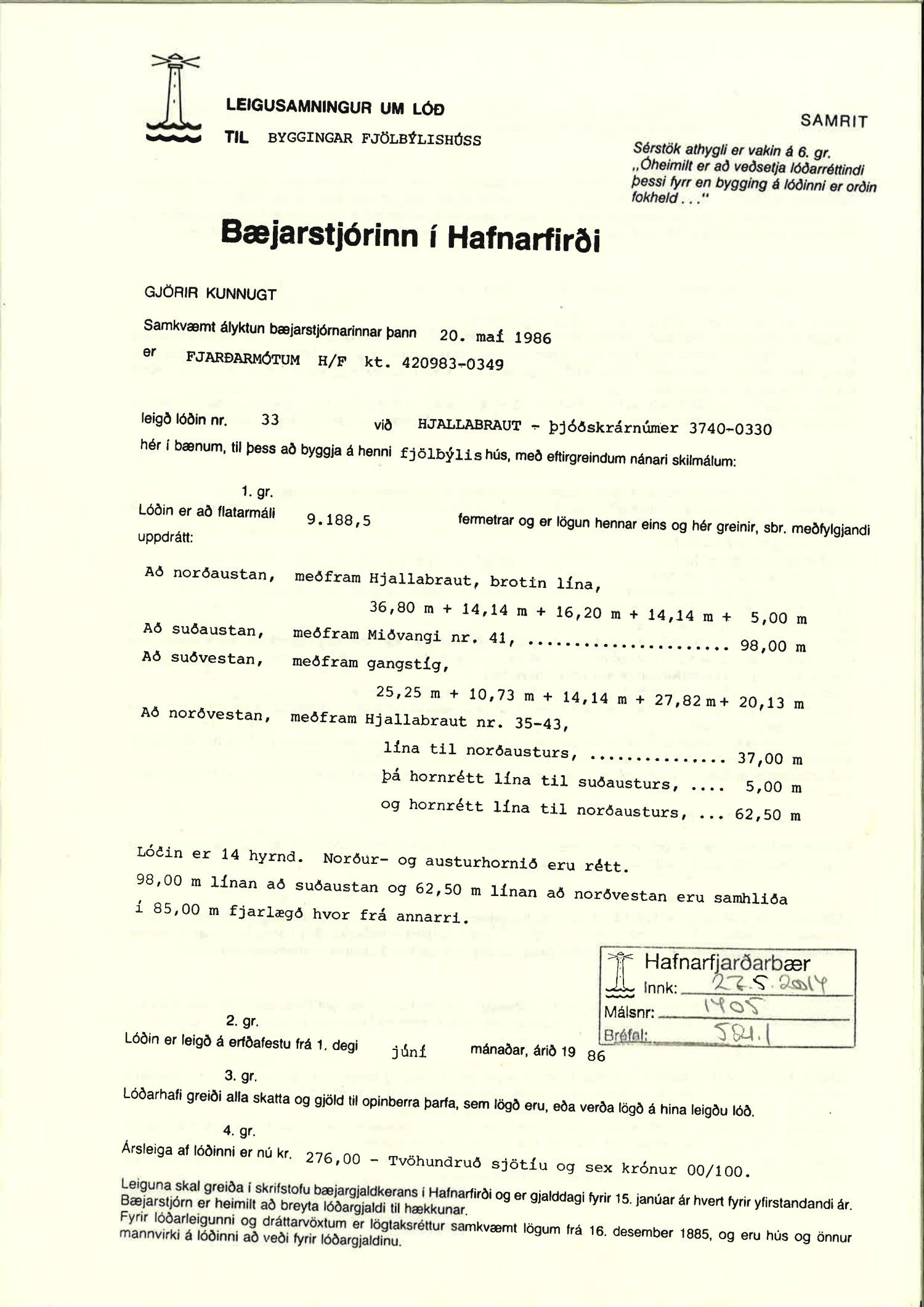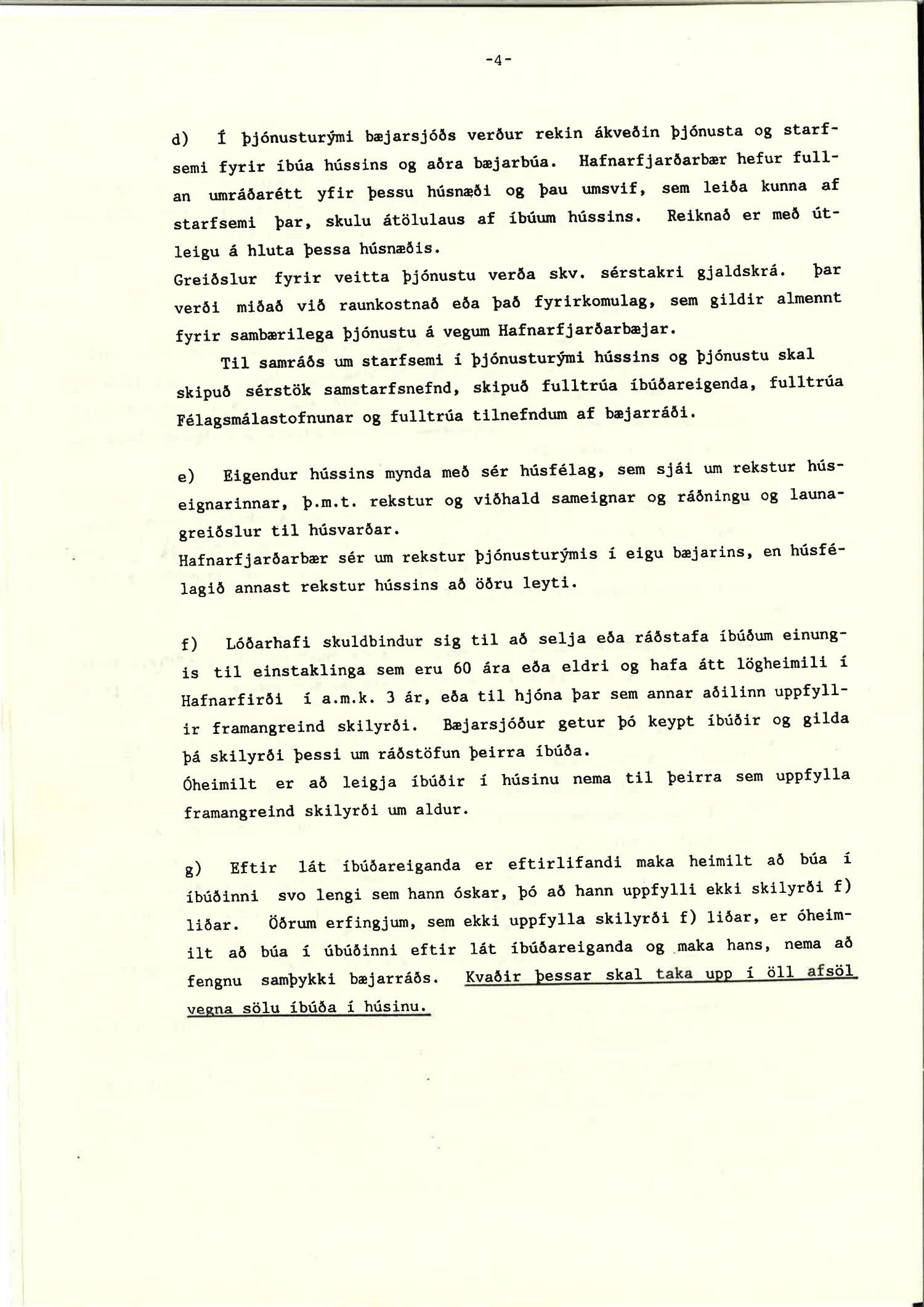 Bæjarráð samþykkir að kvöð í lóðarleigusamningi um að íbúðir skulu aðeins seldar þeim sem hafa átt lögheimili í Hafnarfirði í a.m.k. 3 ár, sbr. f. lið 14. gr., skuli falla niður.
