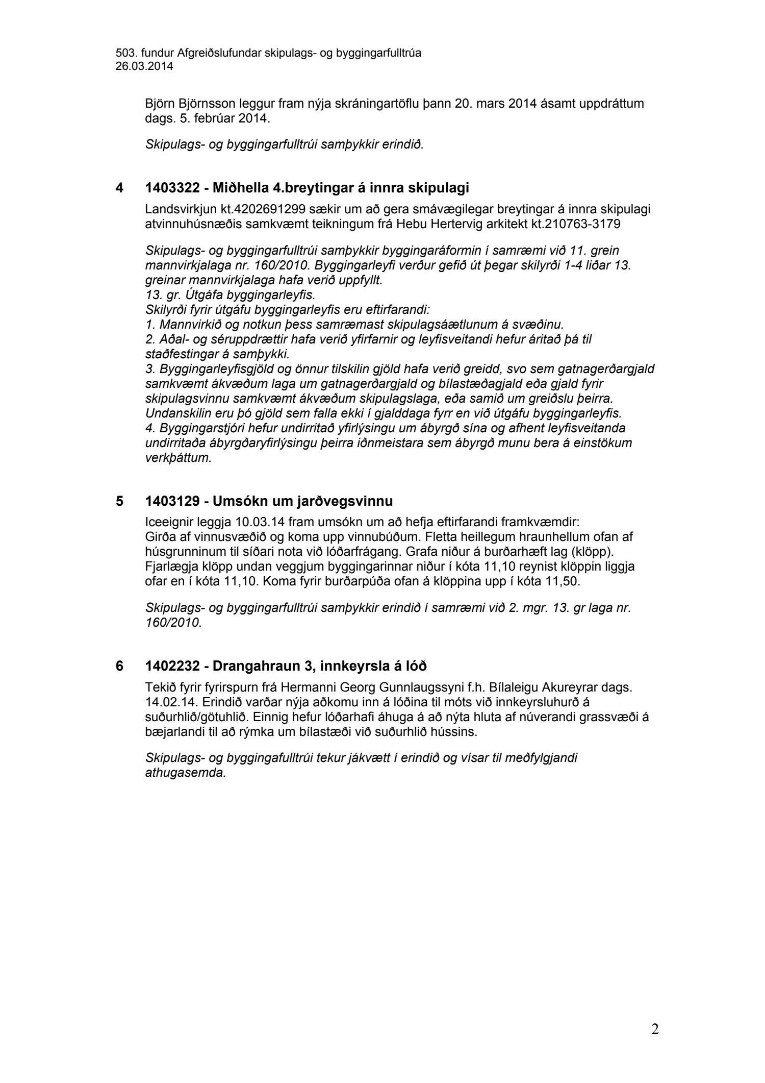 Lagðar fram fundargerðir frá afgreiðslufundum skipulags- og byggingarfulltrúa dags. 26.03.14 og 02.04.14. A-liður afgreiddur af byggingarfulltrúa samkvæmt mannvirkjalögum nr.160/2010.