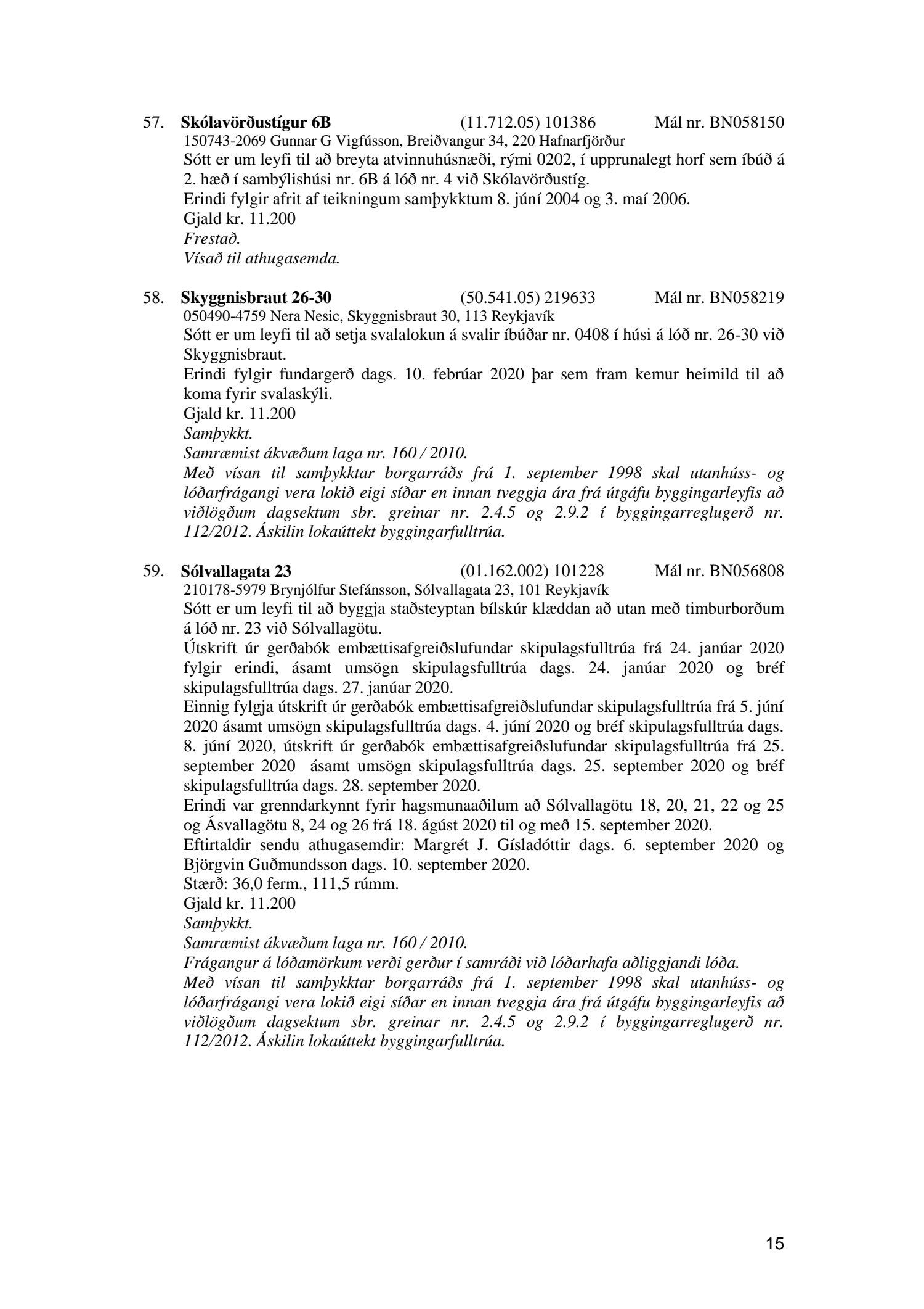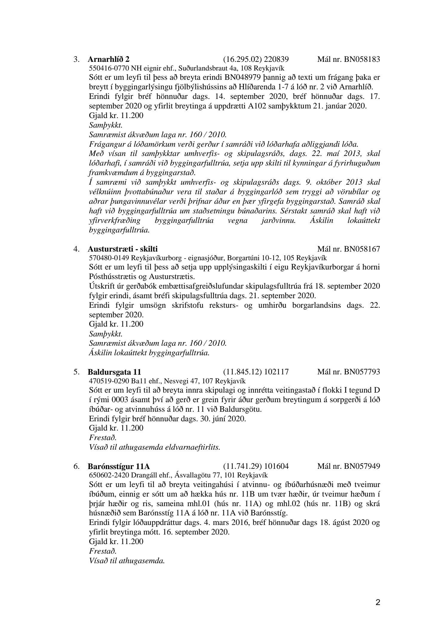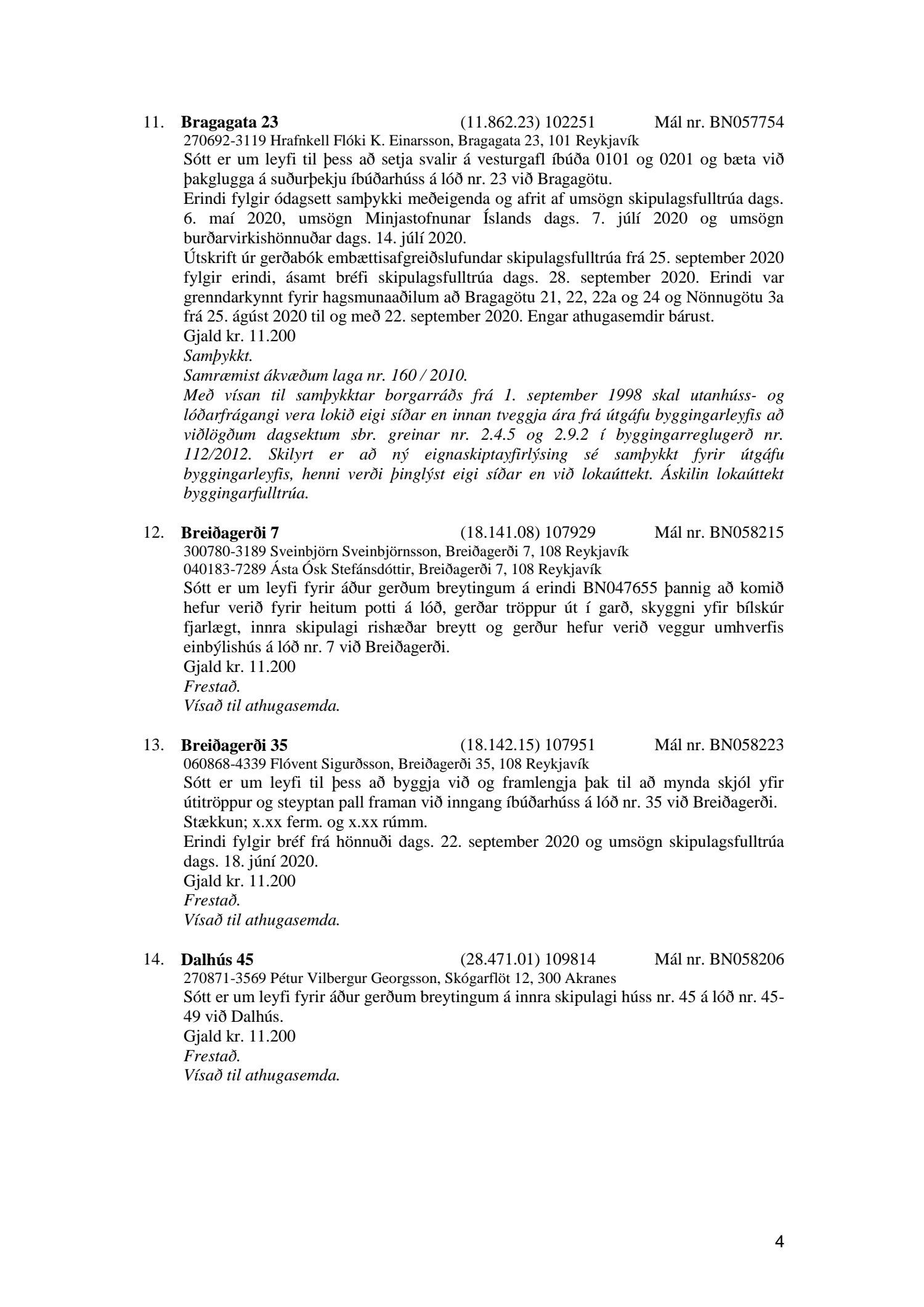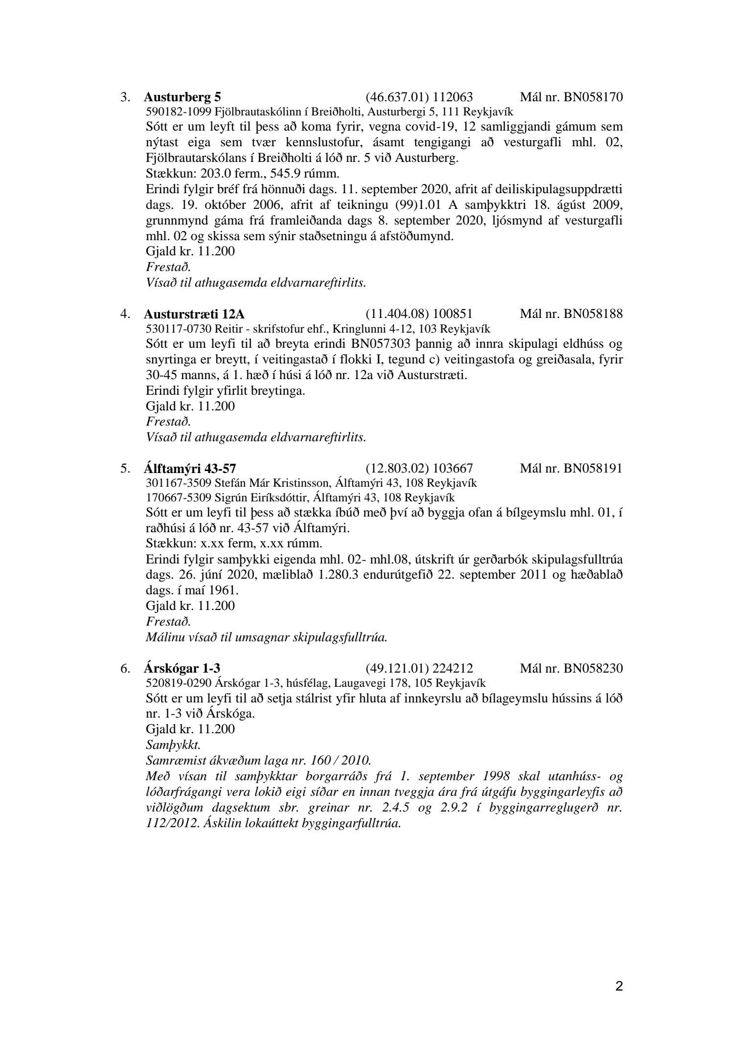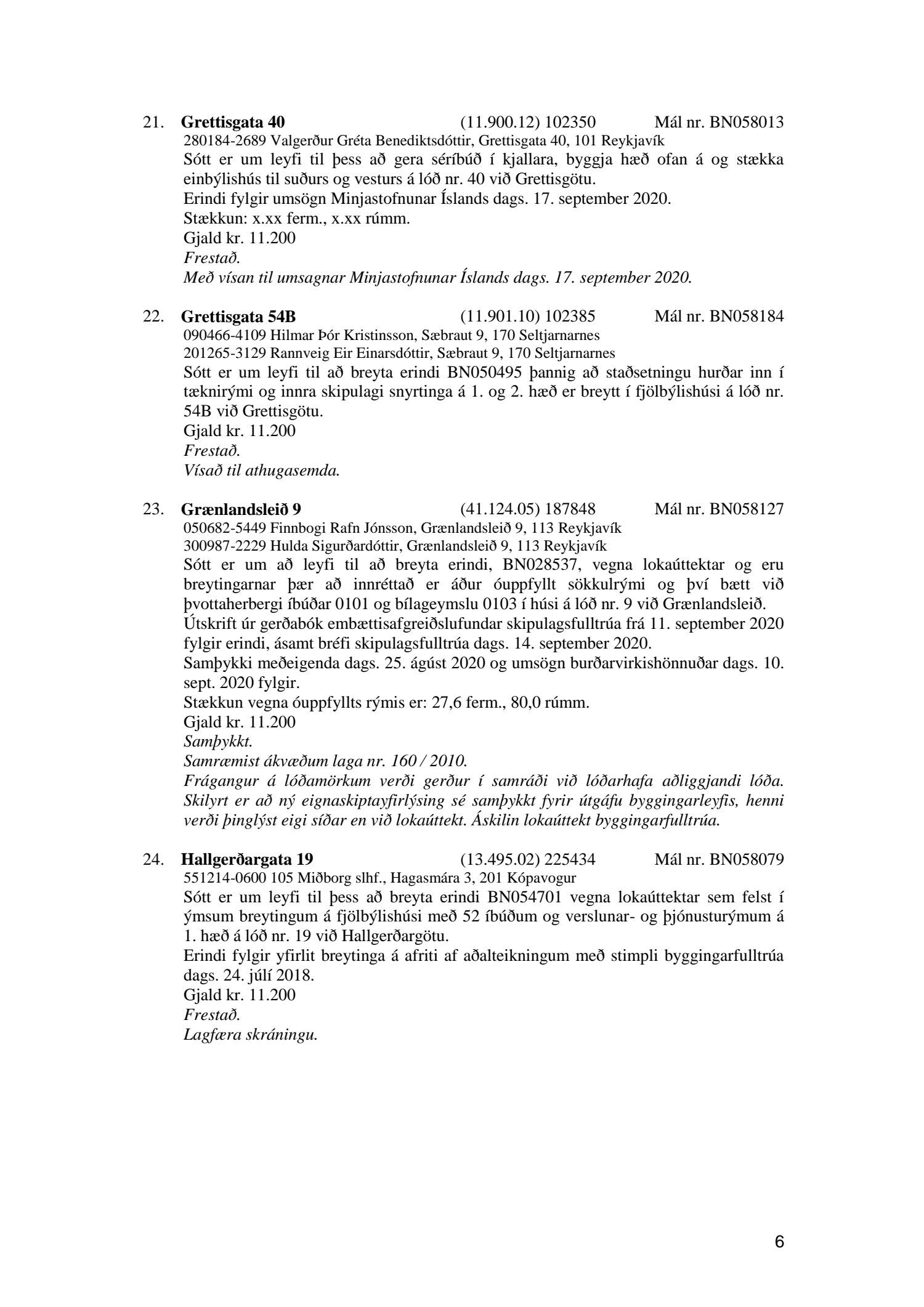 Fylgiskjal með fundargerð þessari er fundargerð afgreiðslufundar byggingarfulltrúa nr. 1084 frá 22. september 2020 og fundargerð afgreiðslufundar byggingarfulltrúa nr. 1085 frá 29. september 2020.
