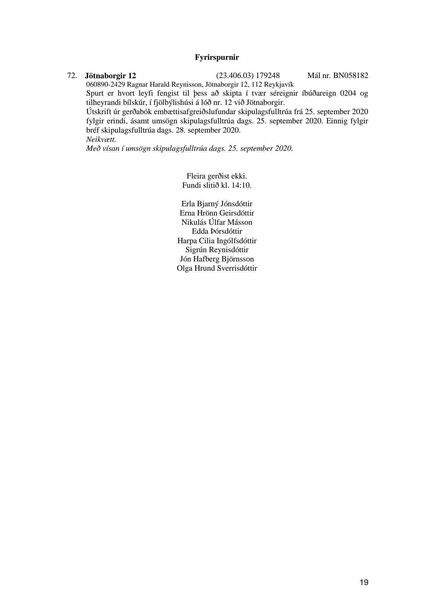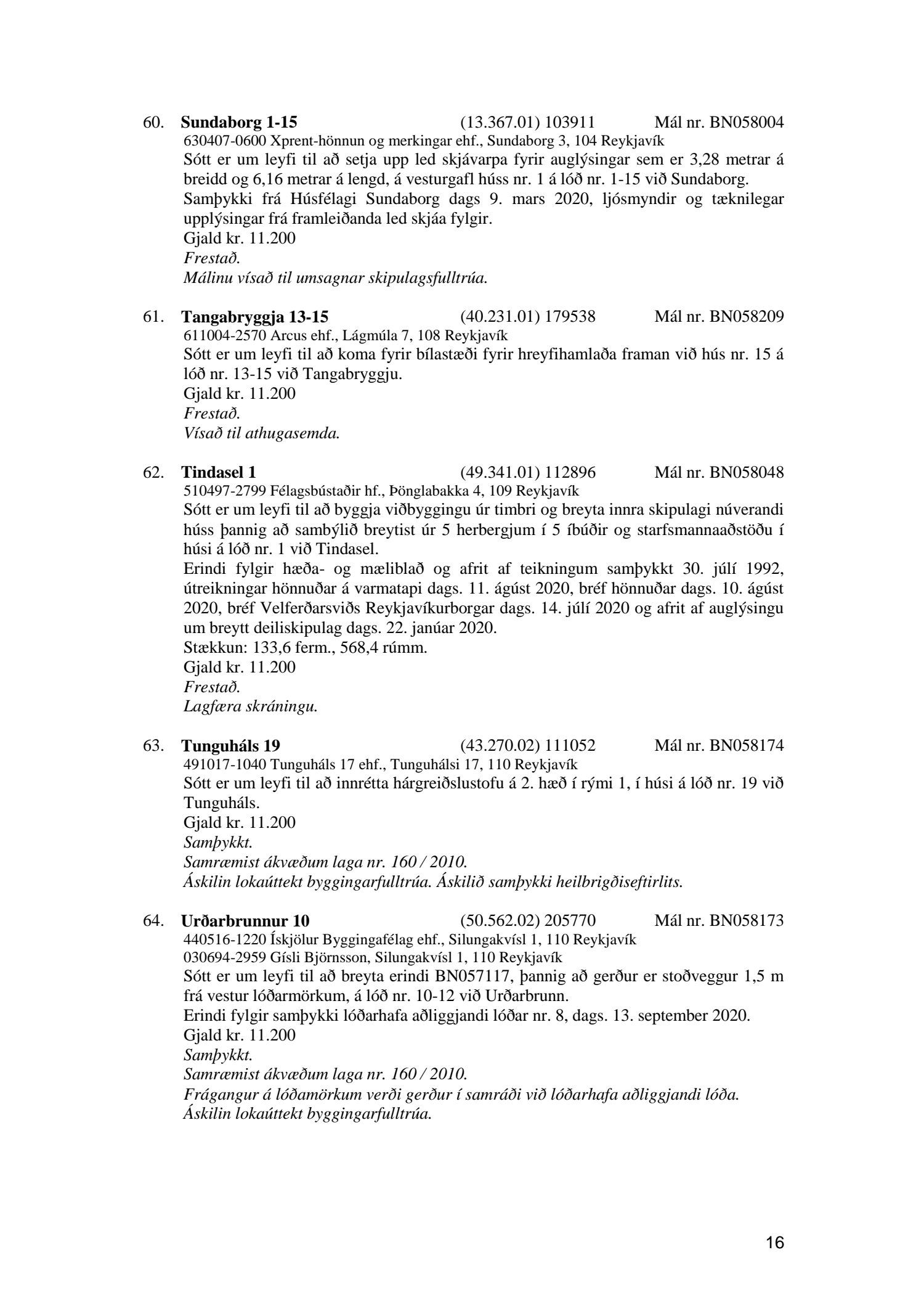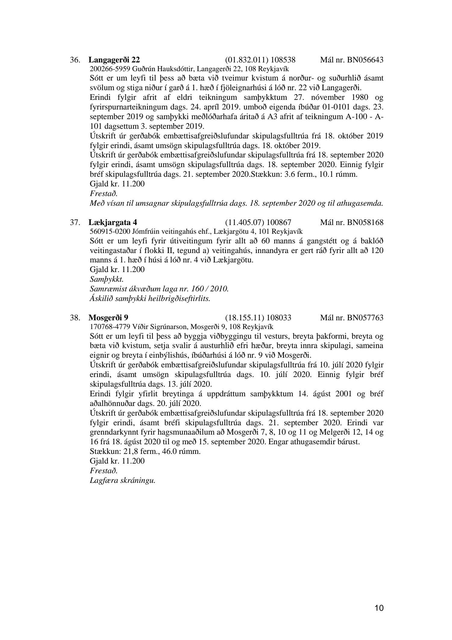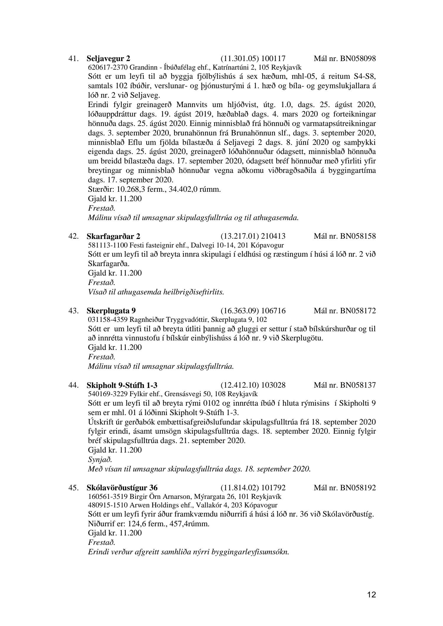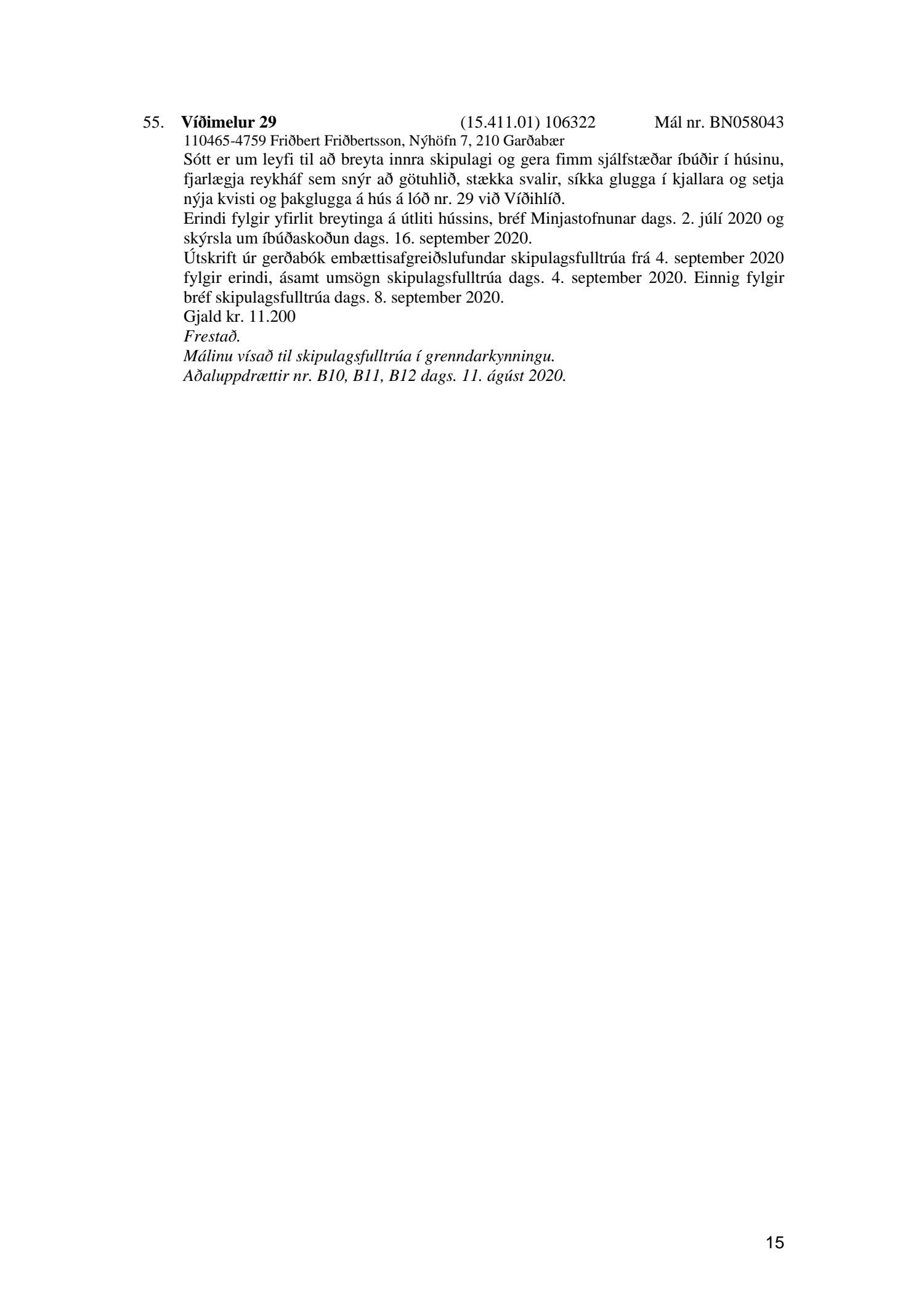 Fylgiskjal með fundargerð þessari er fundargerð afgreiðslufundar byggingarfulltrúa nr. 1084 frá 22. september 2020 og fundargerð afgreiðslufundar byggingarfulltrúa nr. 1085 frá 29. september 2020.