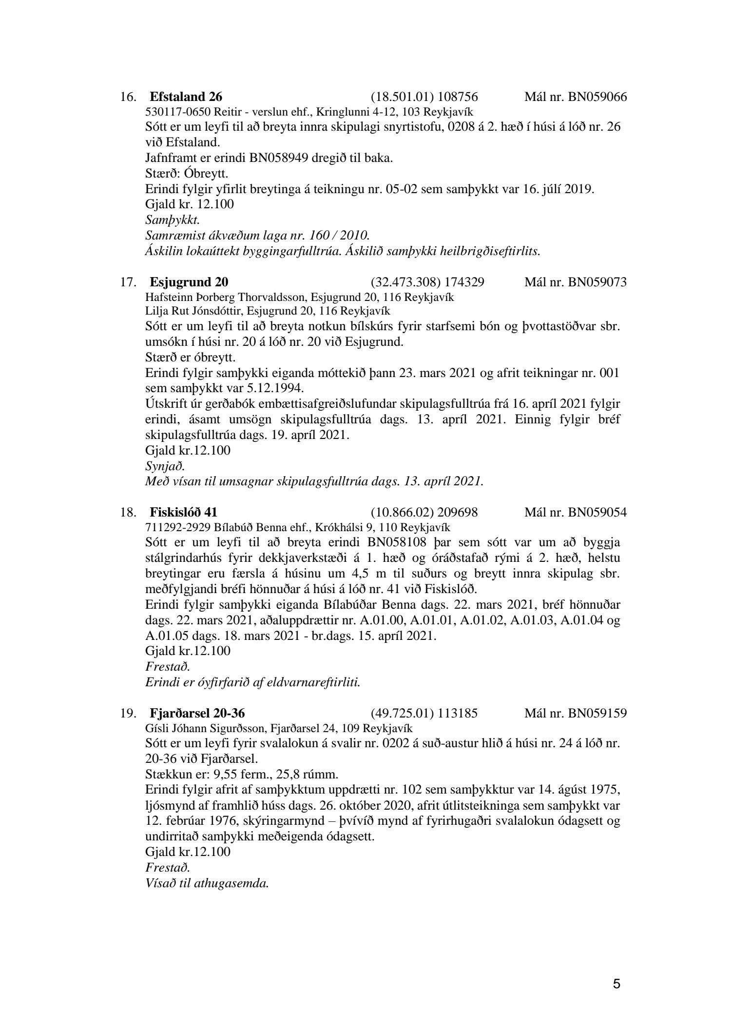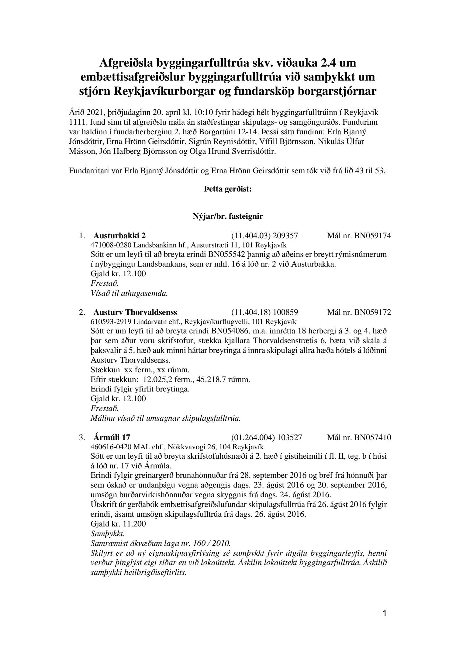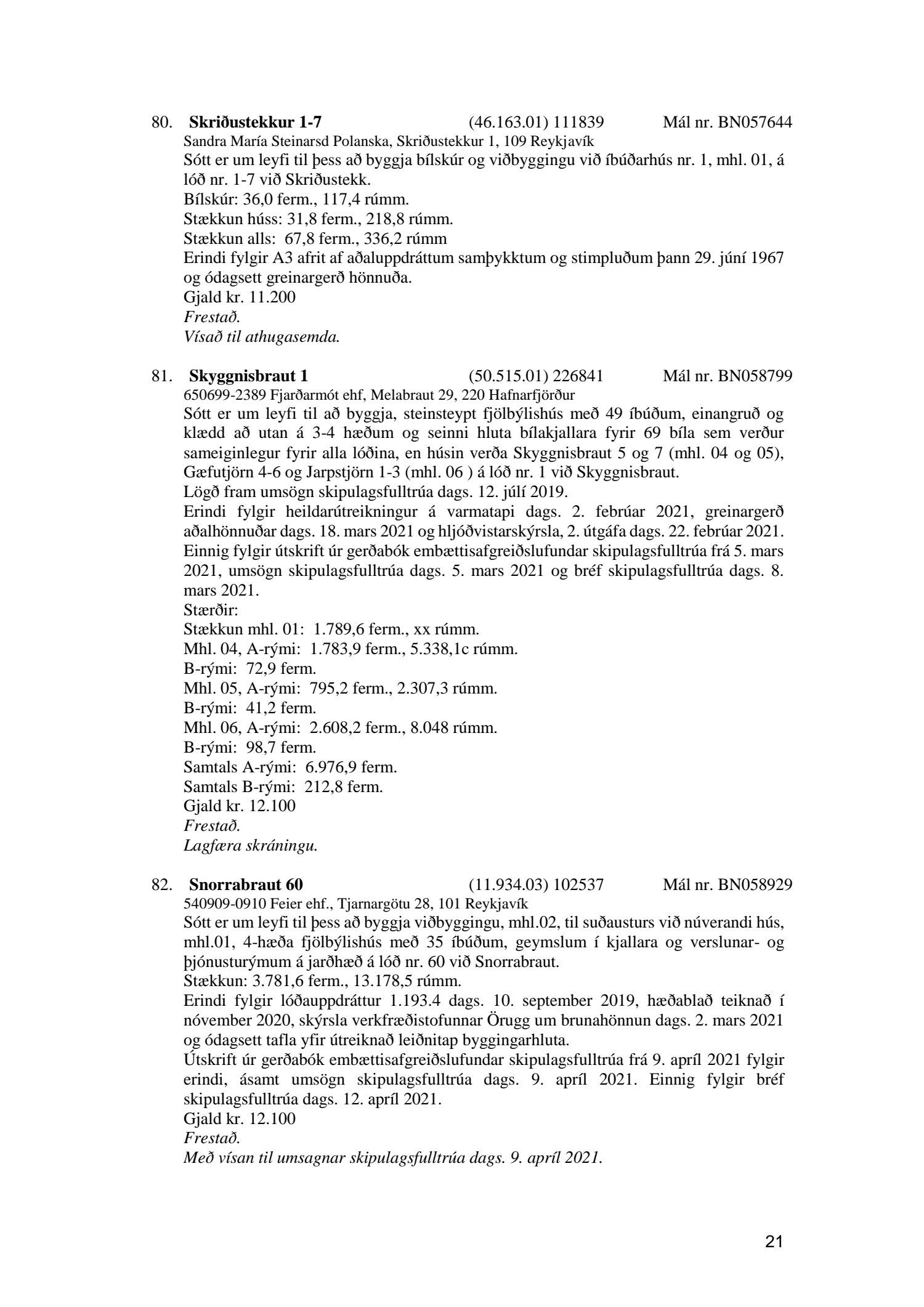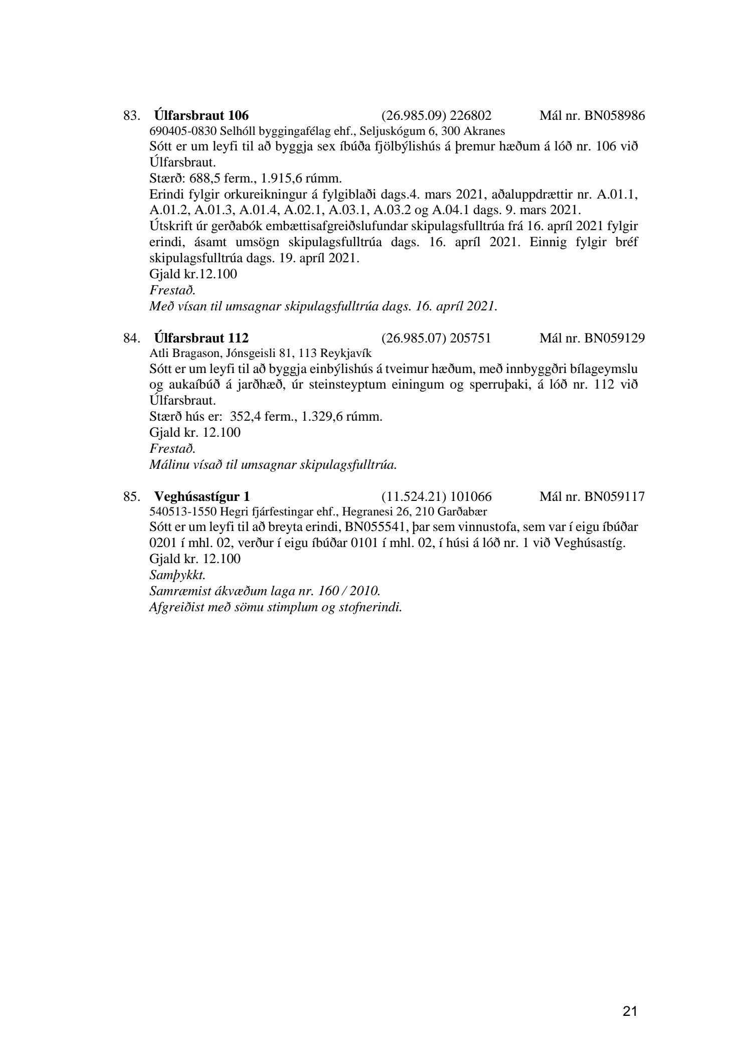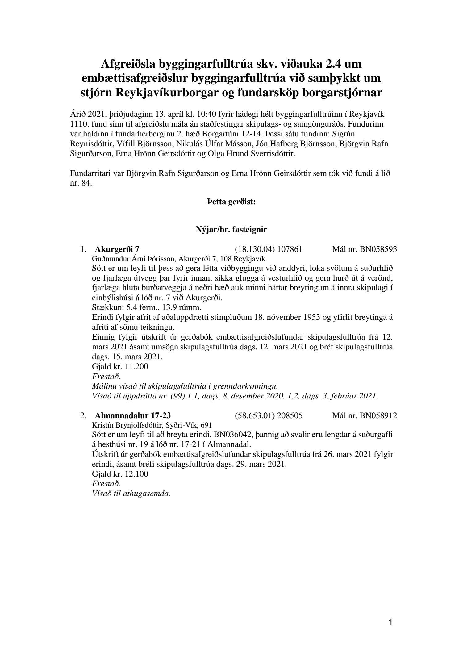 Fylgiskjal með fundargerð þessari er fundargerð afgreiðslufundar byggingarfulltrúa nr. 1110 frá 13. apríl 2021 og nr. 1111 frá 20. apríl 2021.