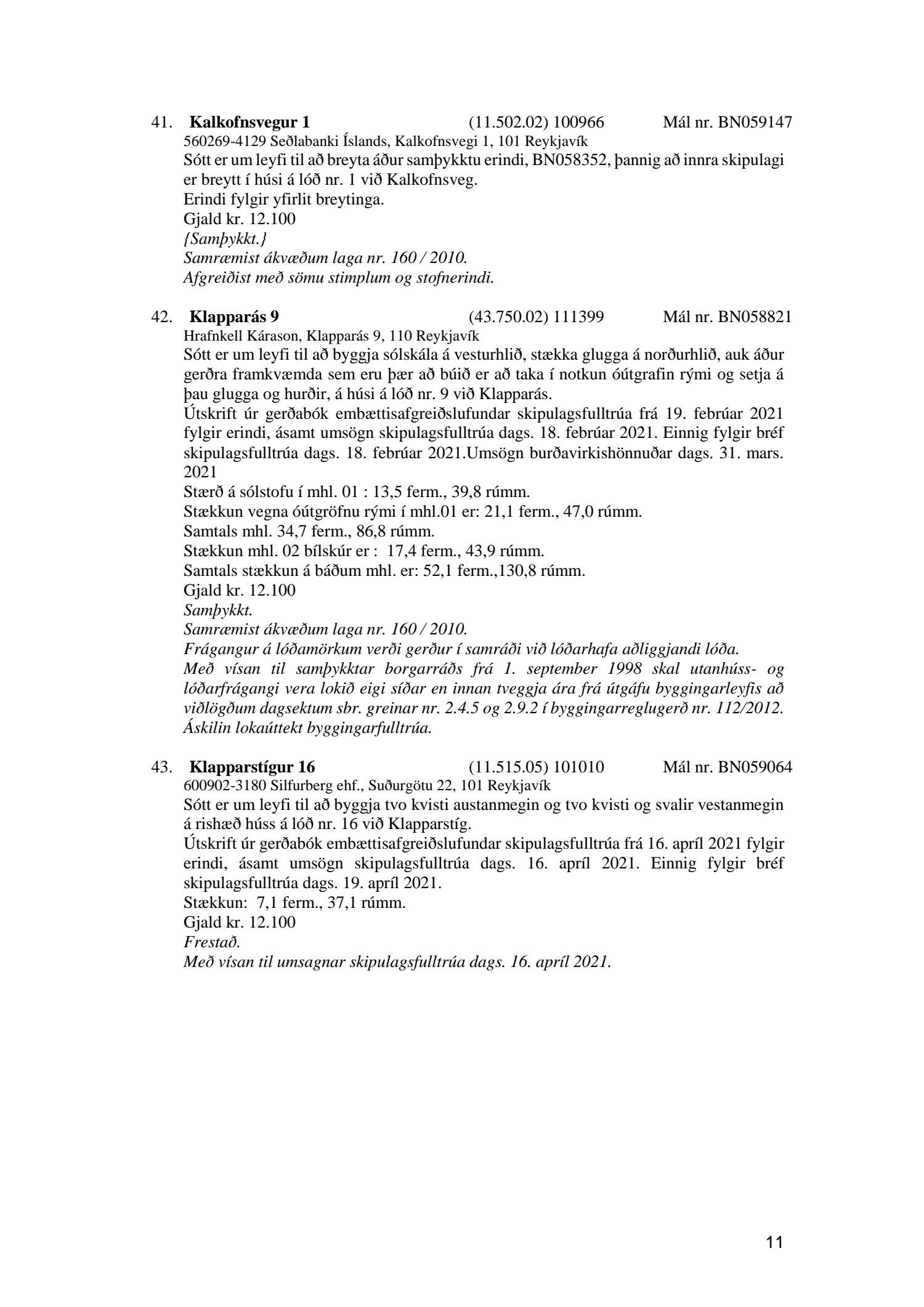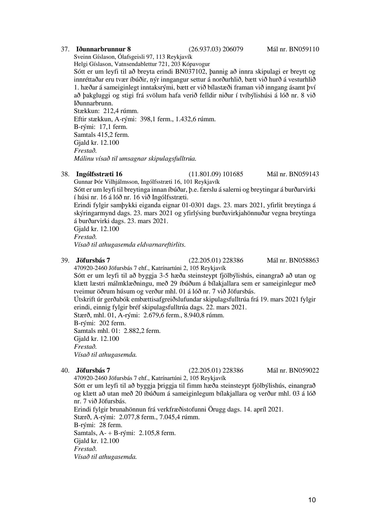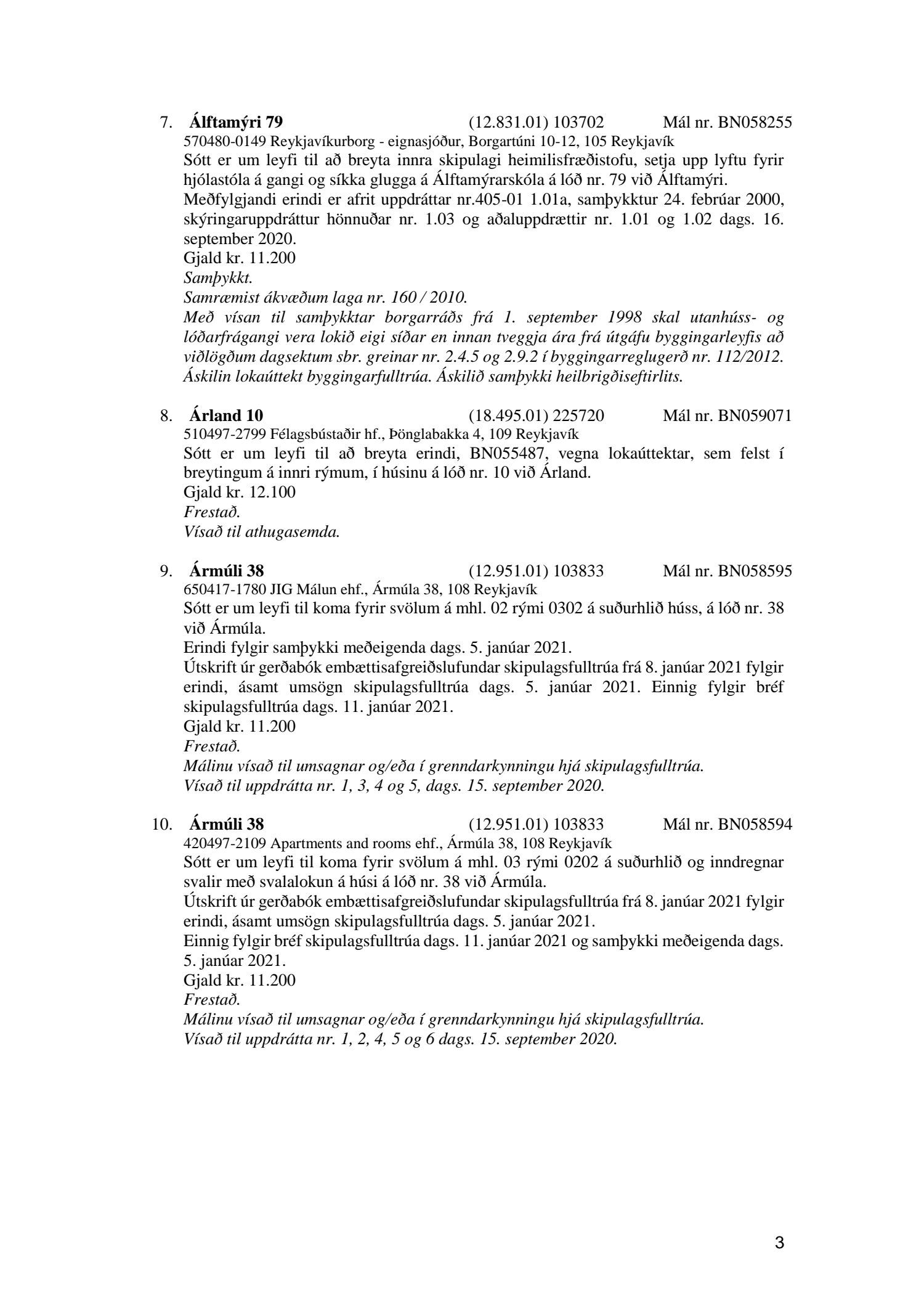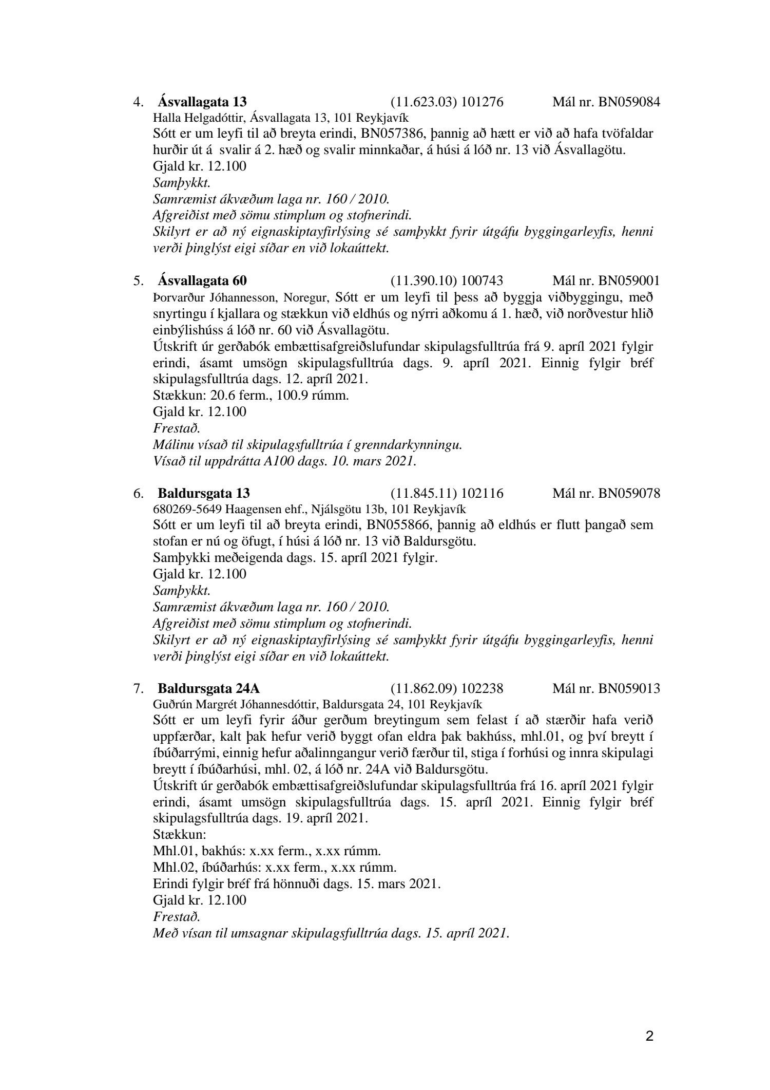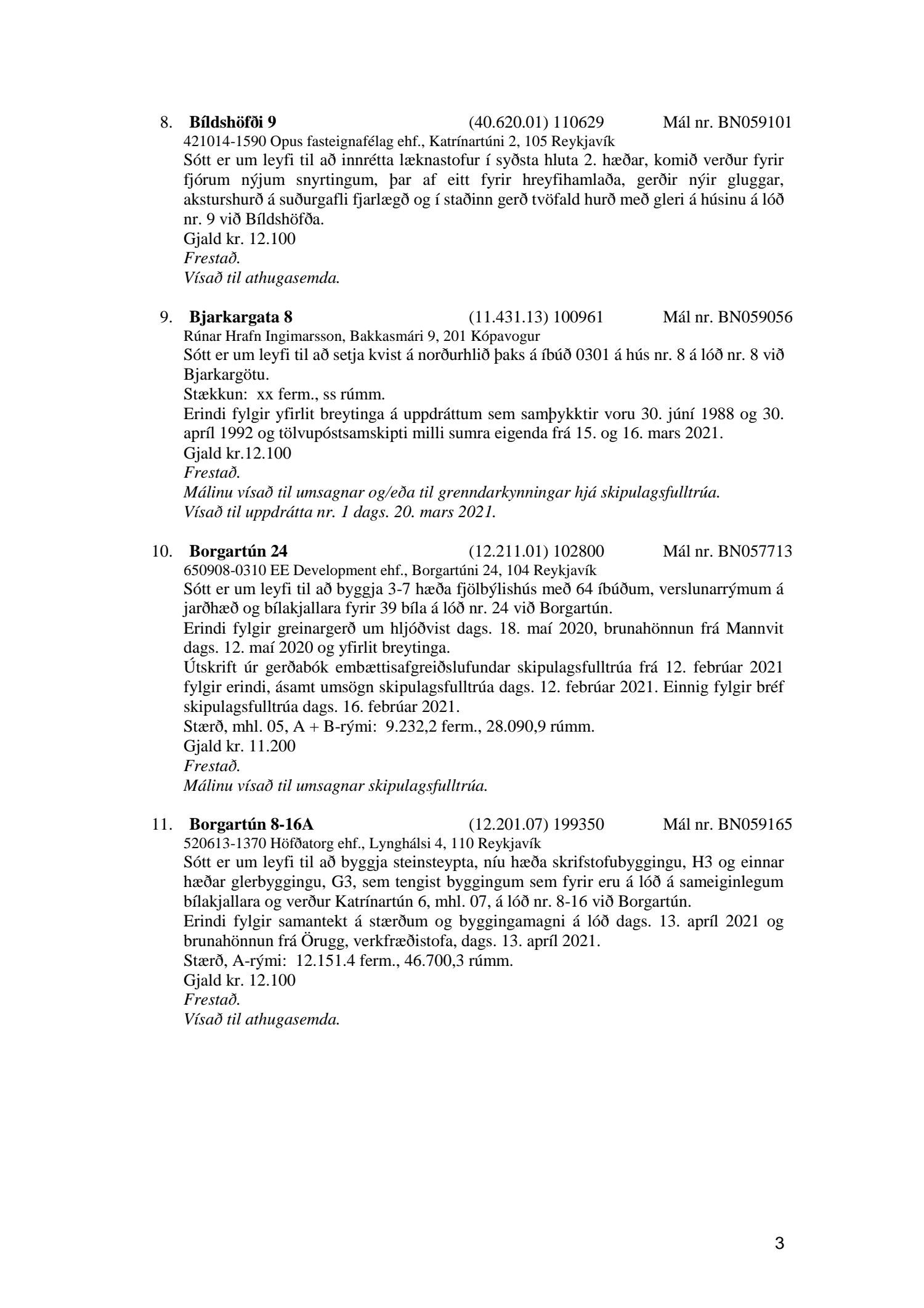 Fylgiskjal með fundargerð þessari er fundargerð afgreiðslufundar byggingarfulltrúa nr. 1110 frá 13. apríl 2021 og nr. 1111 frá 20. apríl 2021.