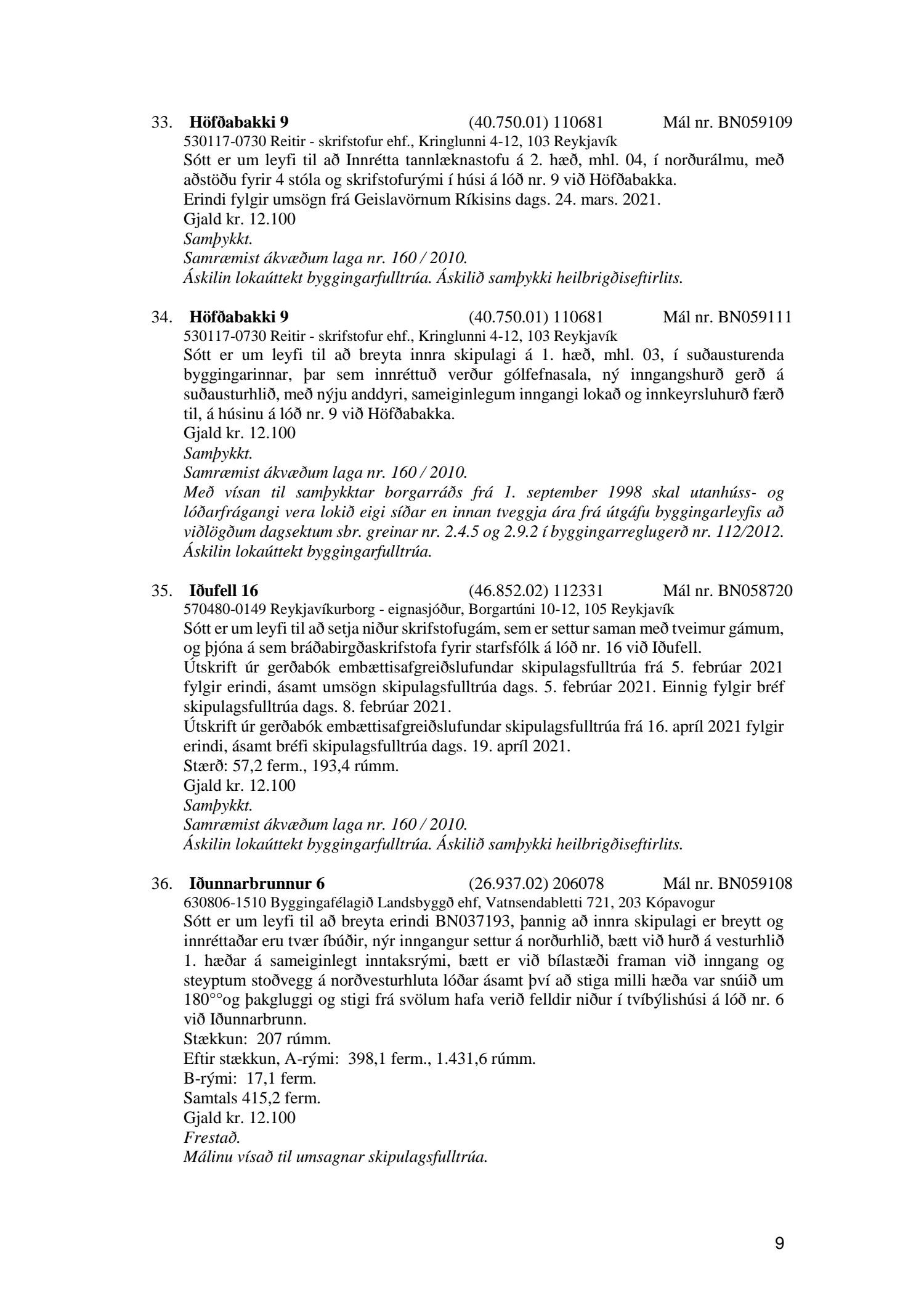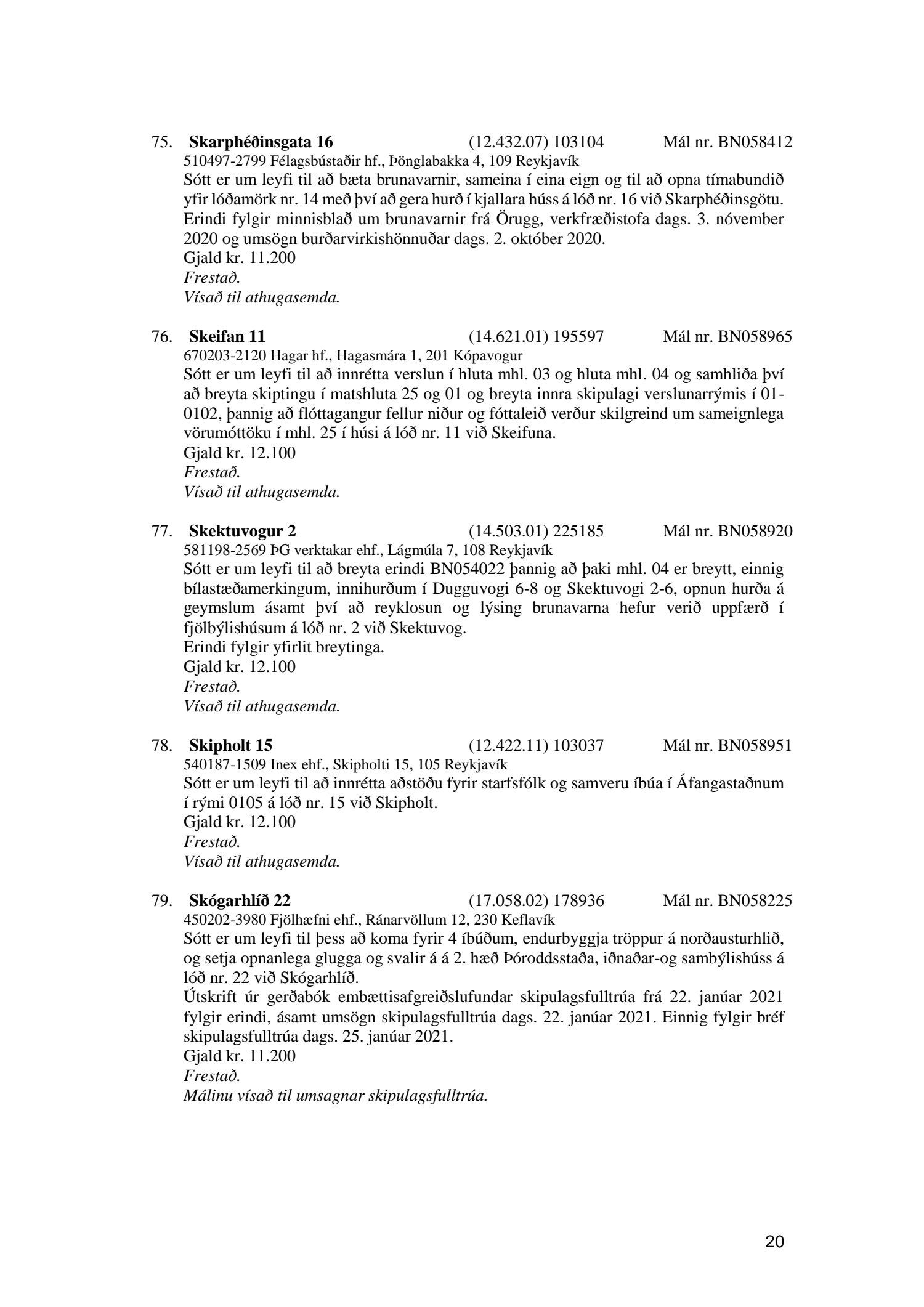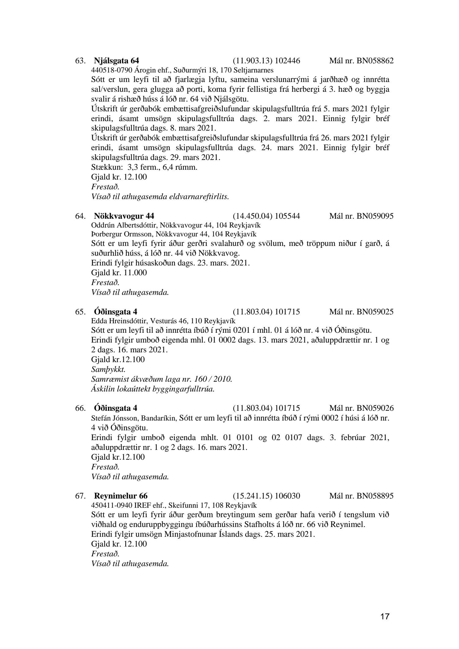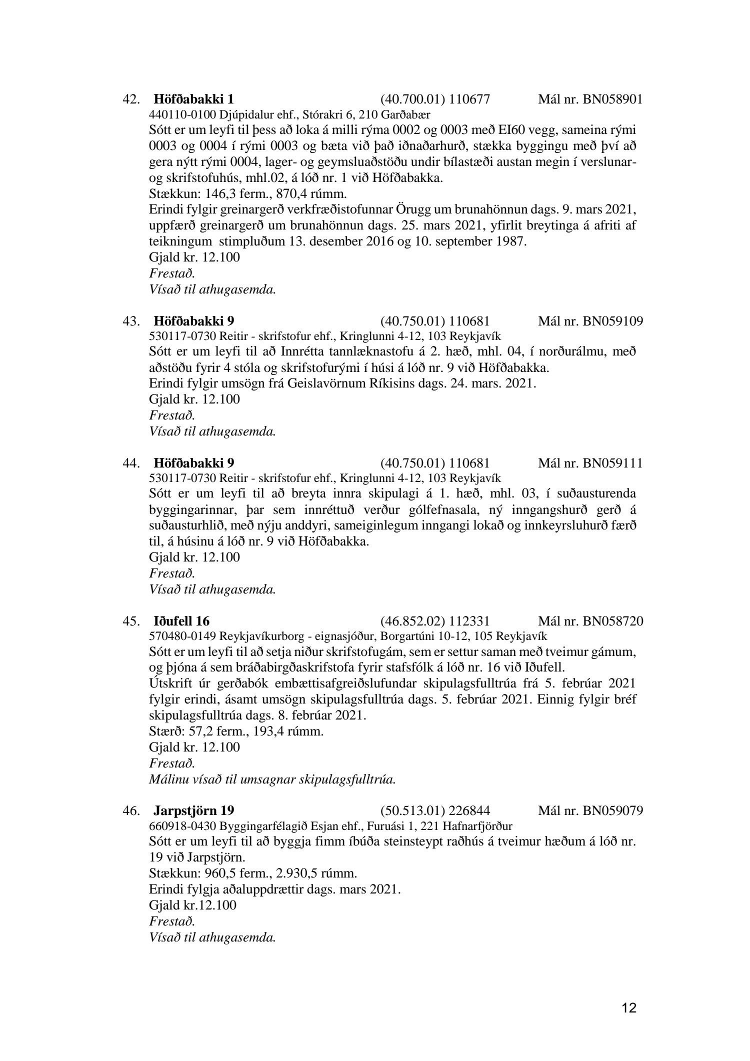 Fylgiskjal með fundargerð þessari er fundargerð afgreiðslufundar byggingarfulltrúa nr. 1110 frá 13. apríl 2021 og nr. 1111 frá 20. apríl 2021.
