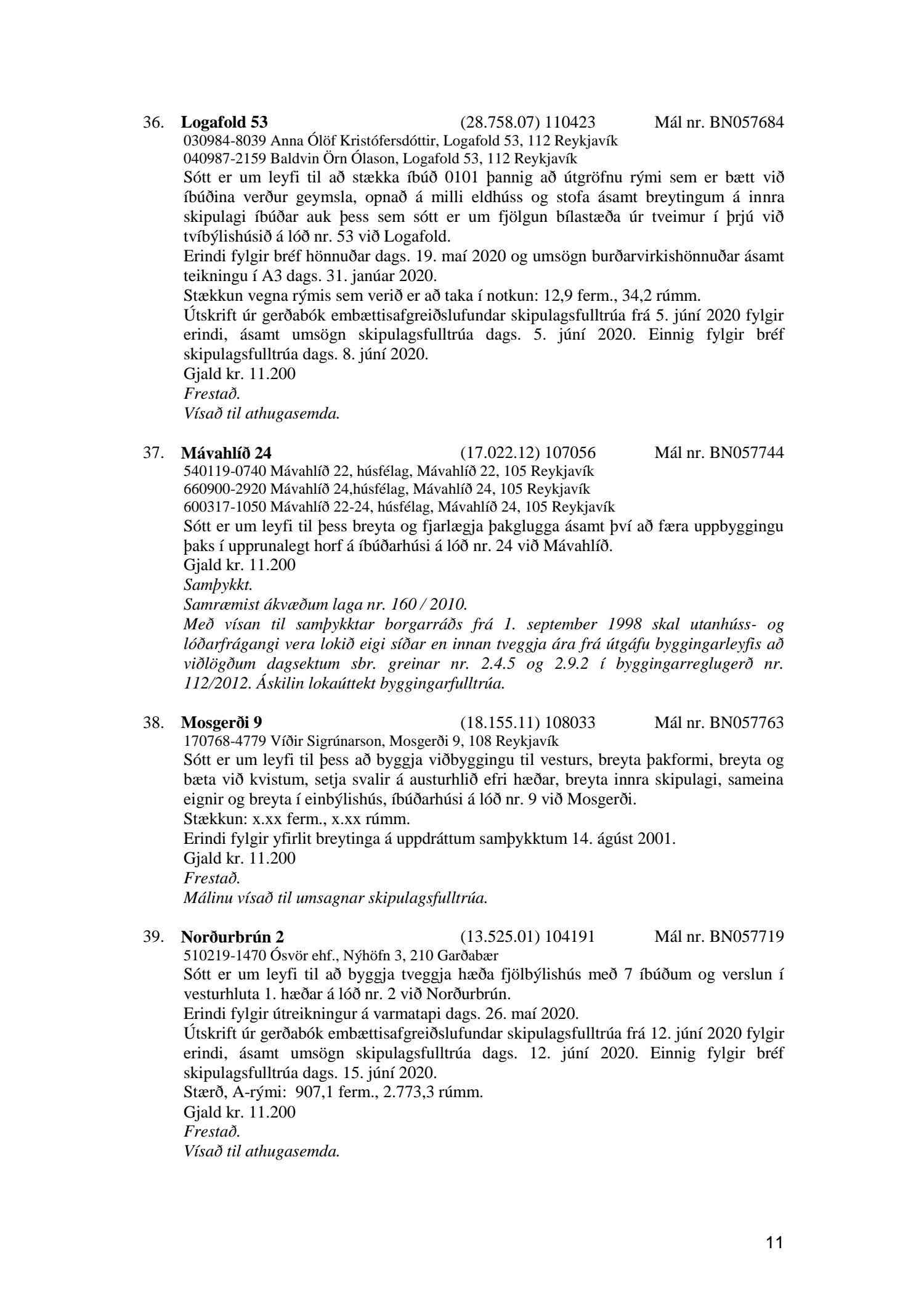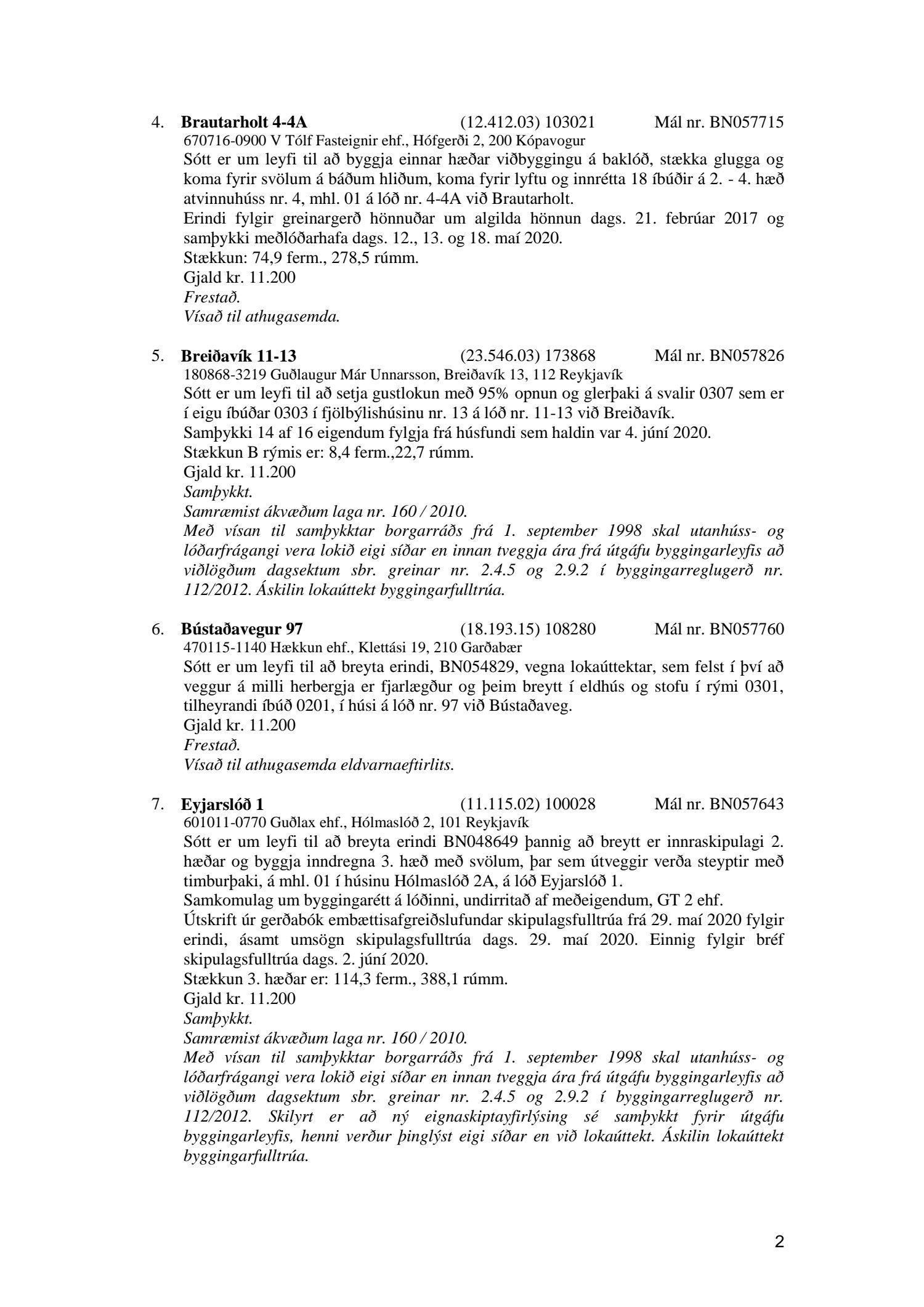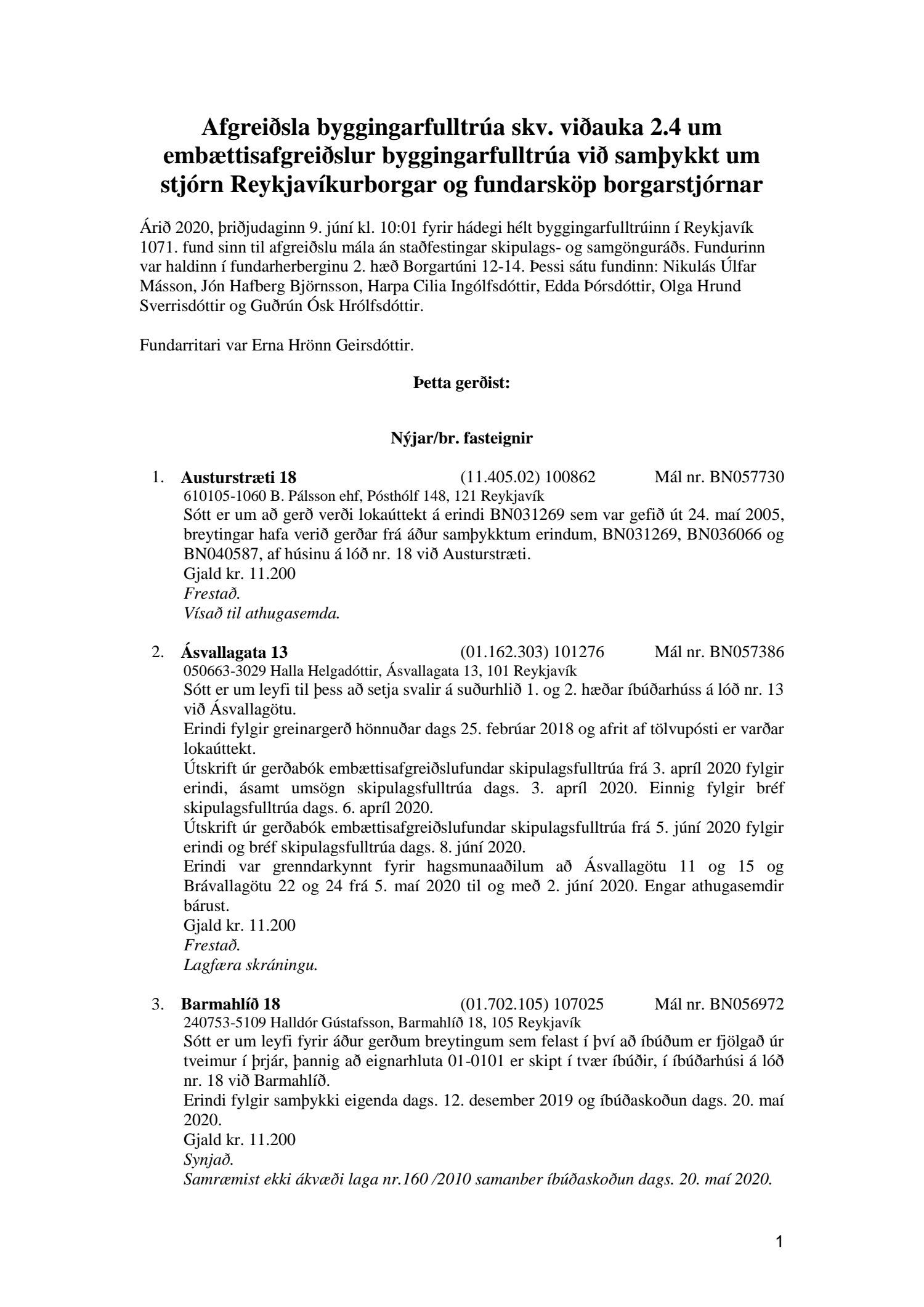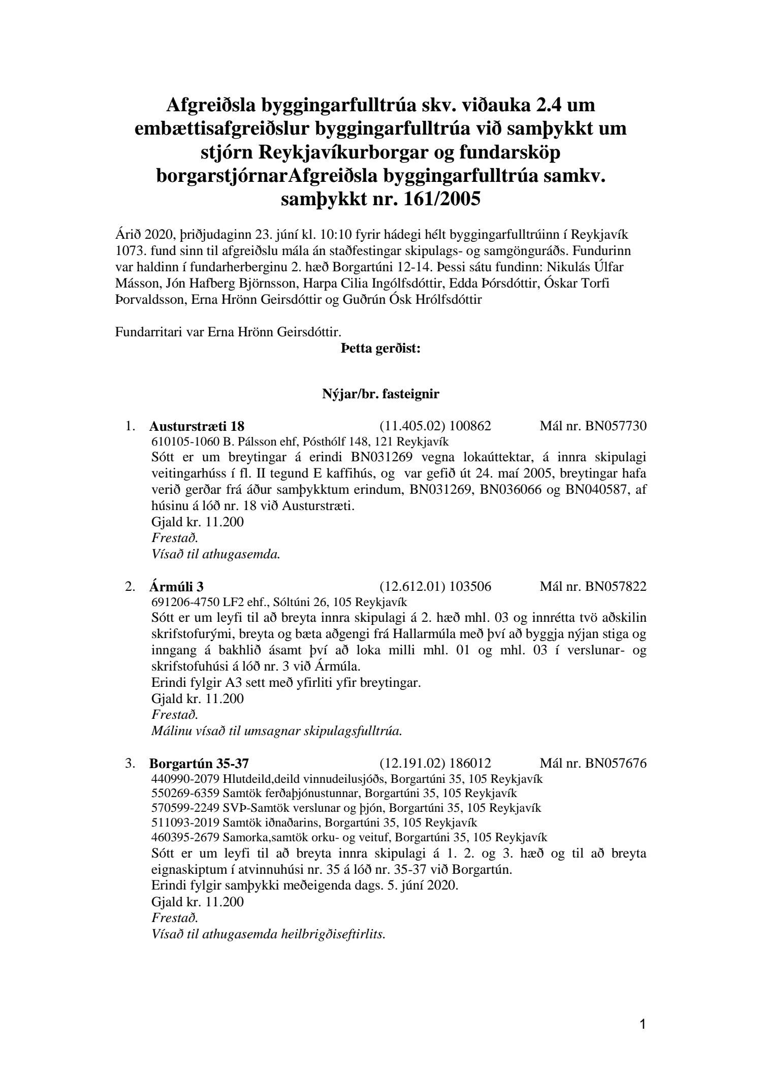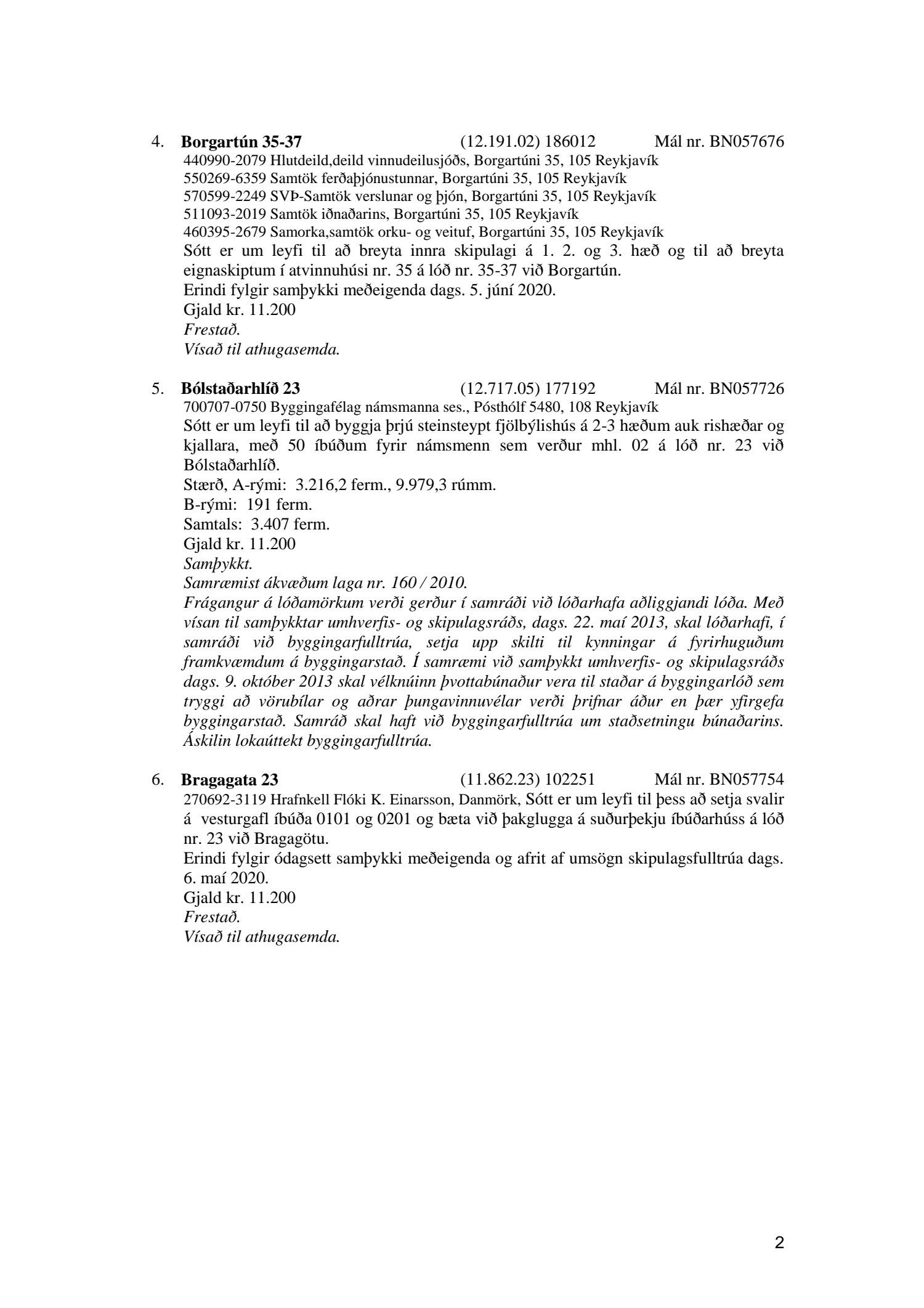 Fylgiskjal með fundargerð þessari er fundargerð afgreiðslufundar byggingarfulltrúa nr. 1071 frá 9. júní 2020, nr. 1072 frá 16. júní 2020 og nr. 1073 frá 23. júní 2020.