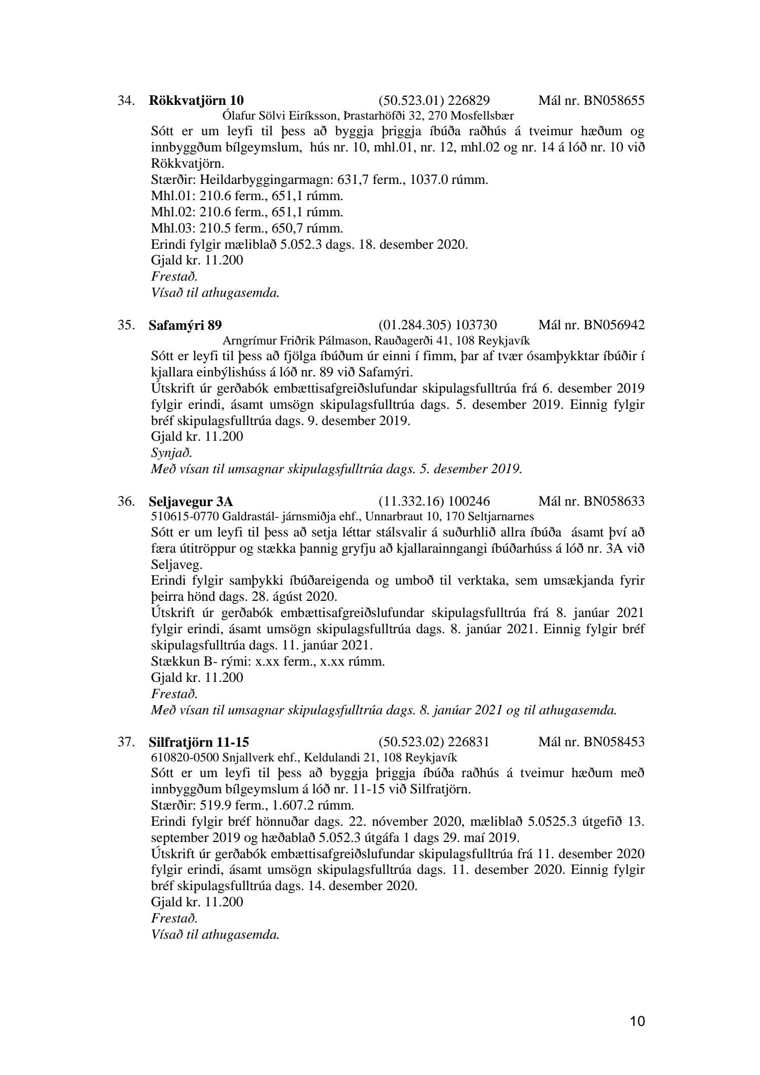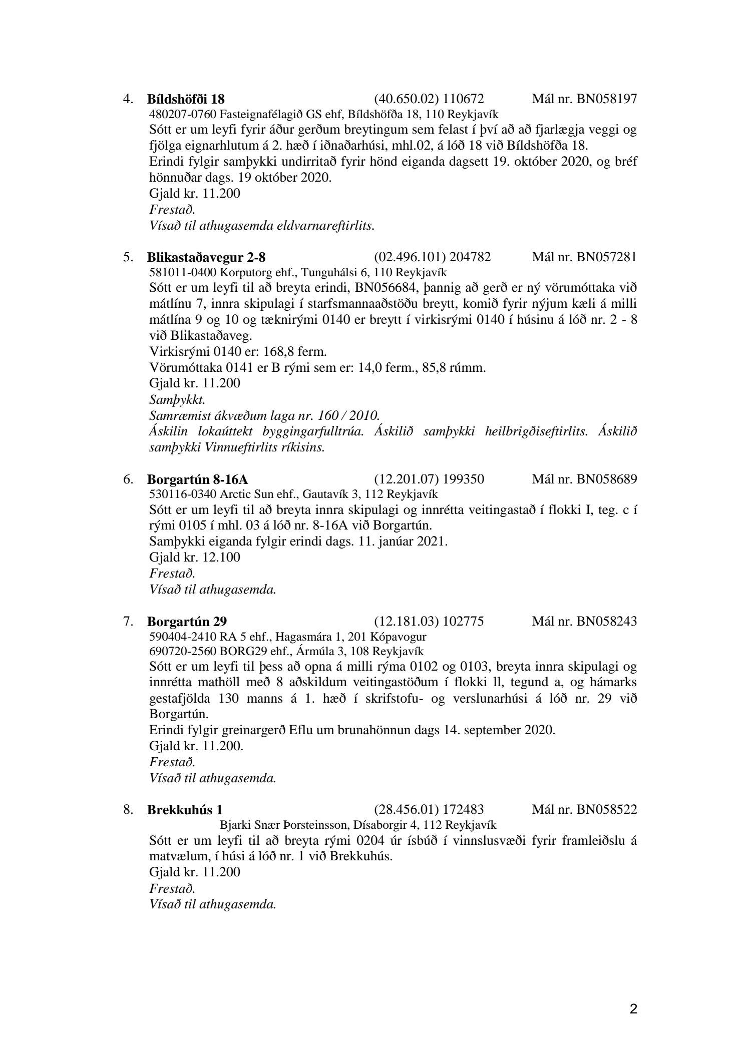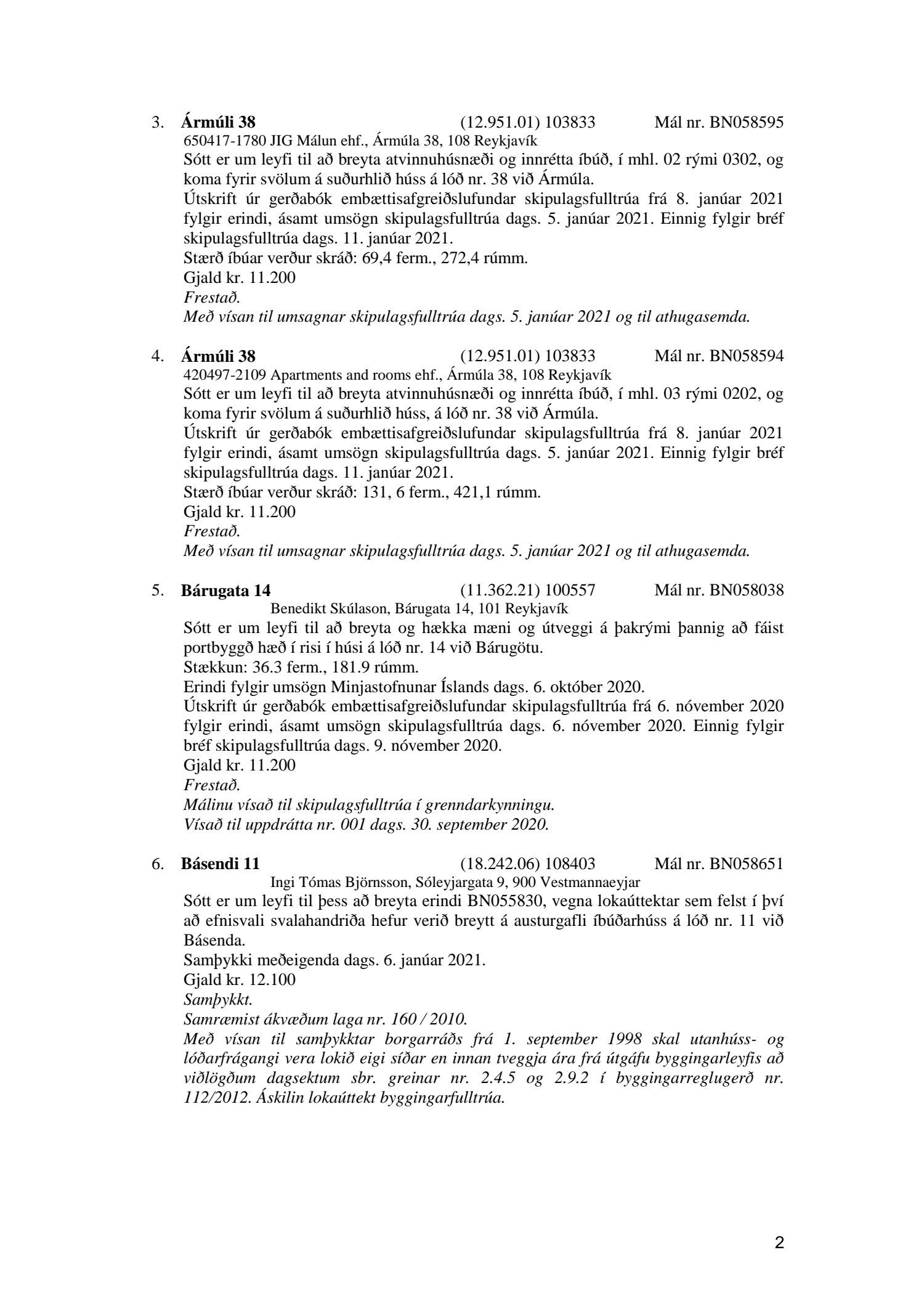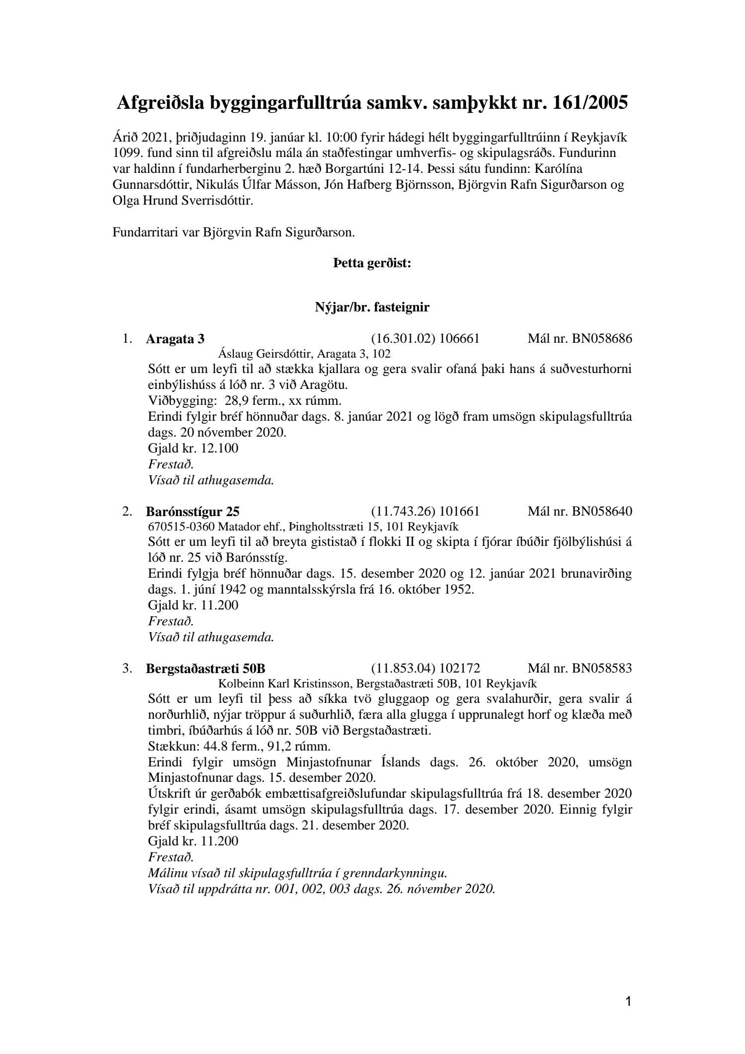 Fylgiskjal með fundargerð þessari eru fundargerðir afgreiðslufundar byggingarfulltrúa nr. 1098 frá 12. janúar 2021 og nr. 1099 frá 19. janúar 2021.