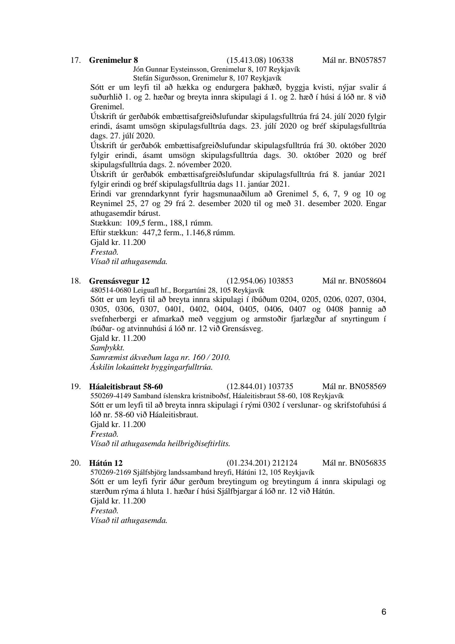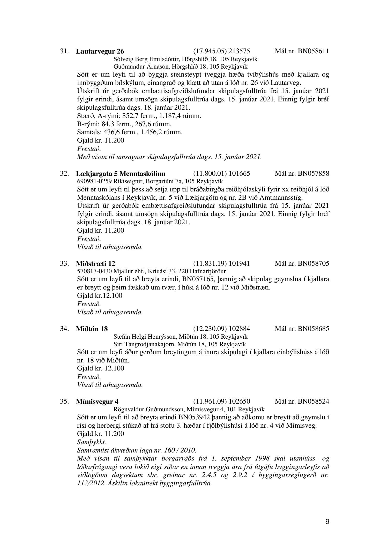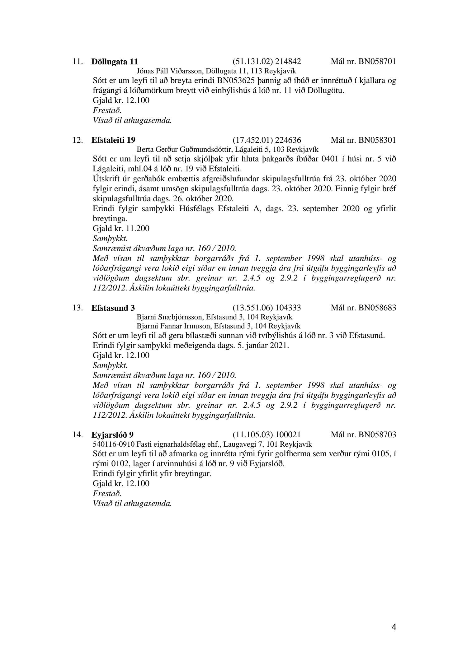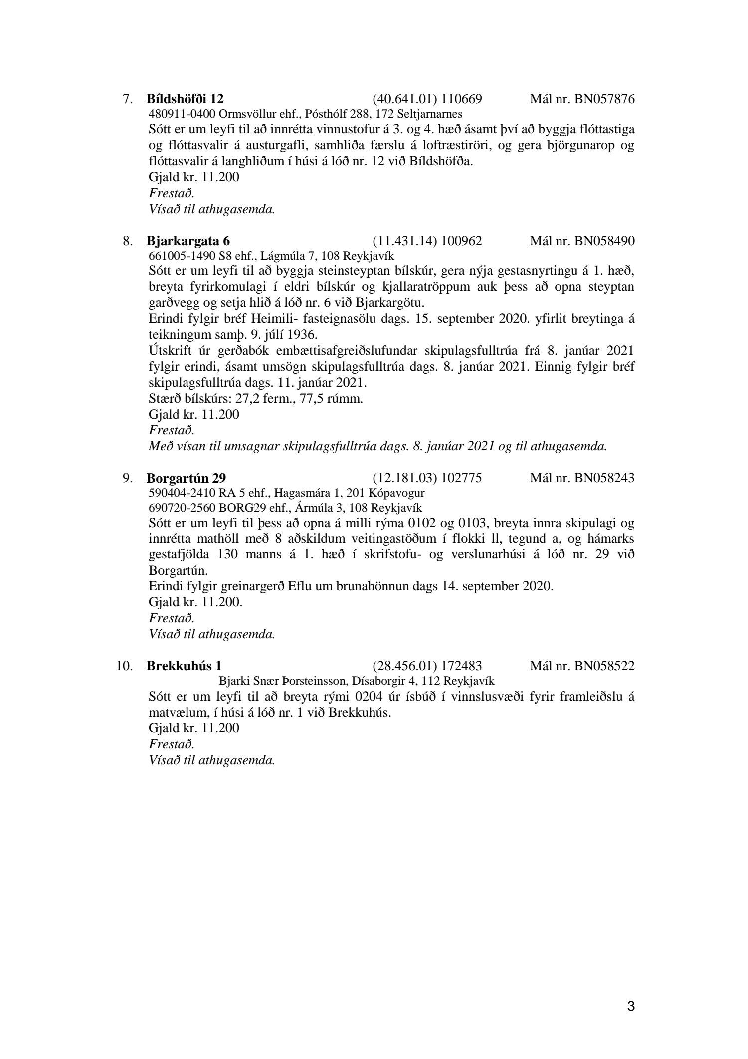 Fylgiskjal með fundargerð þessari eru fundargerðir afgreiðslufundar byggingarfulltrúa nr. 1098 frá 12. janúar 2021 og nr. 1099 frá 19. janúar 2021.