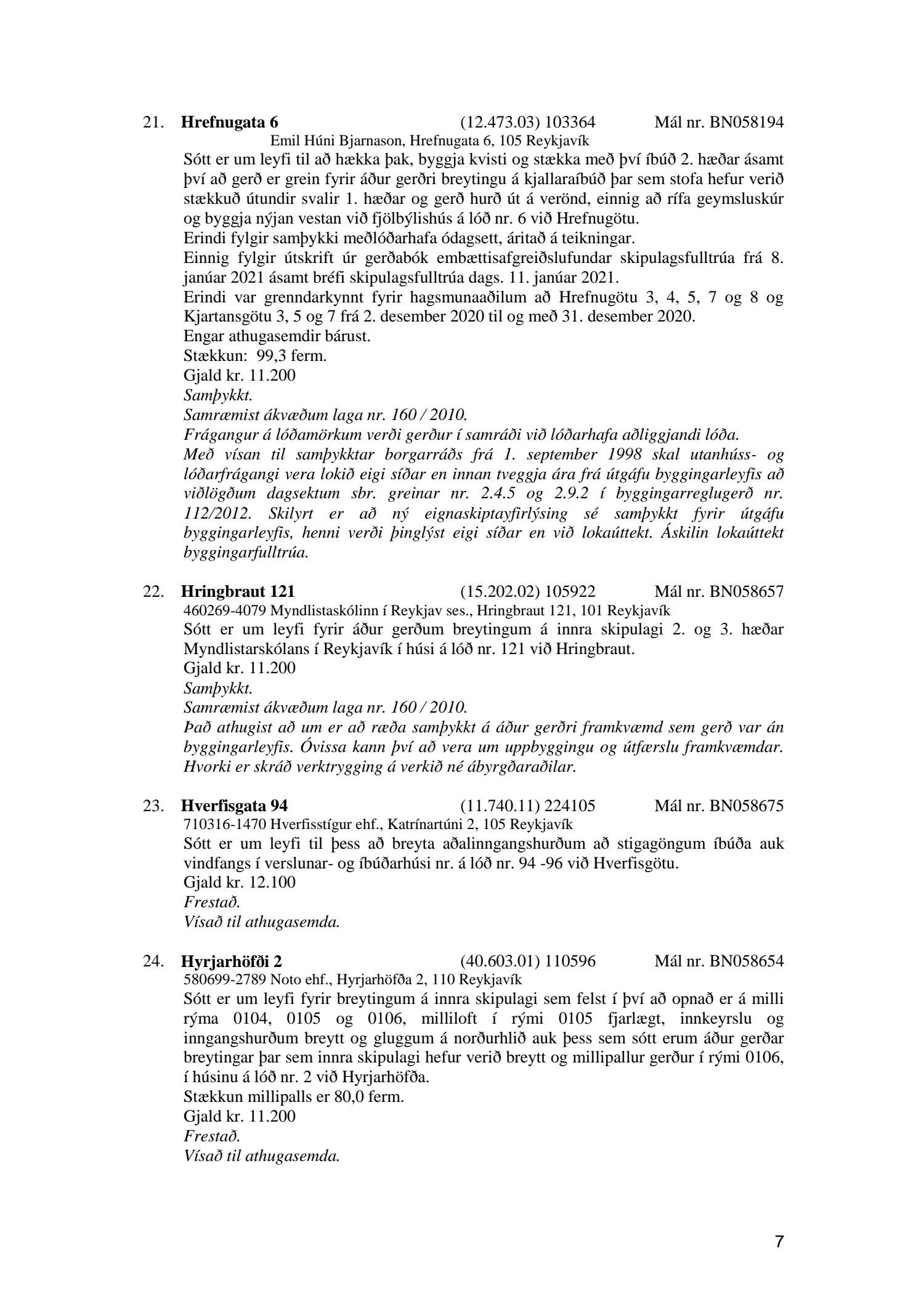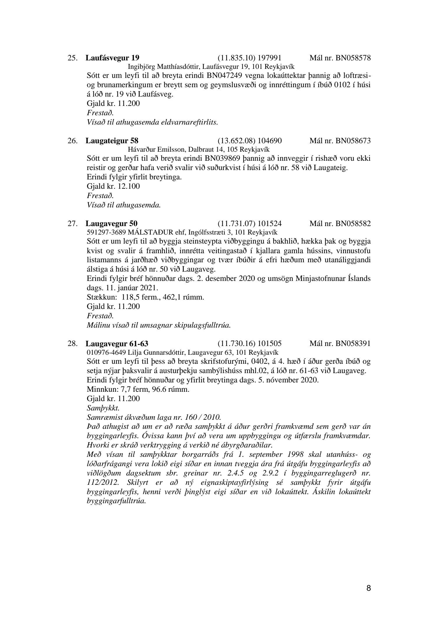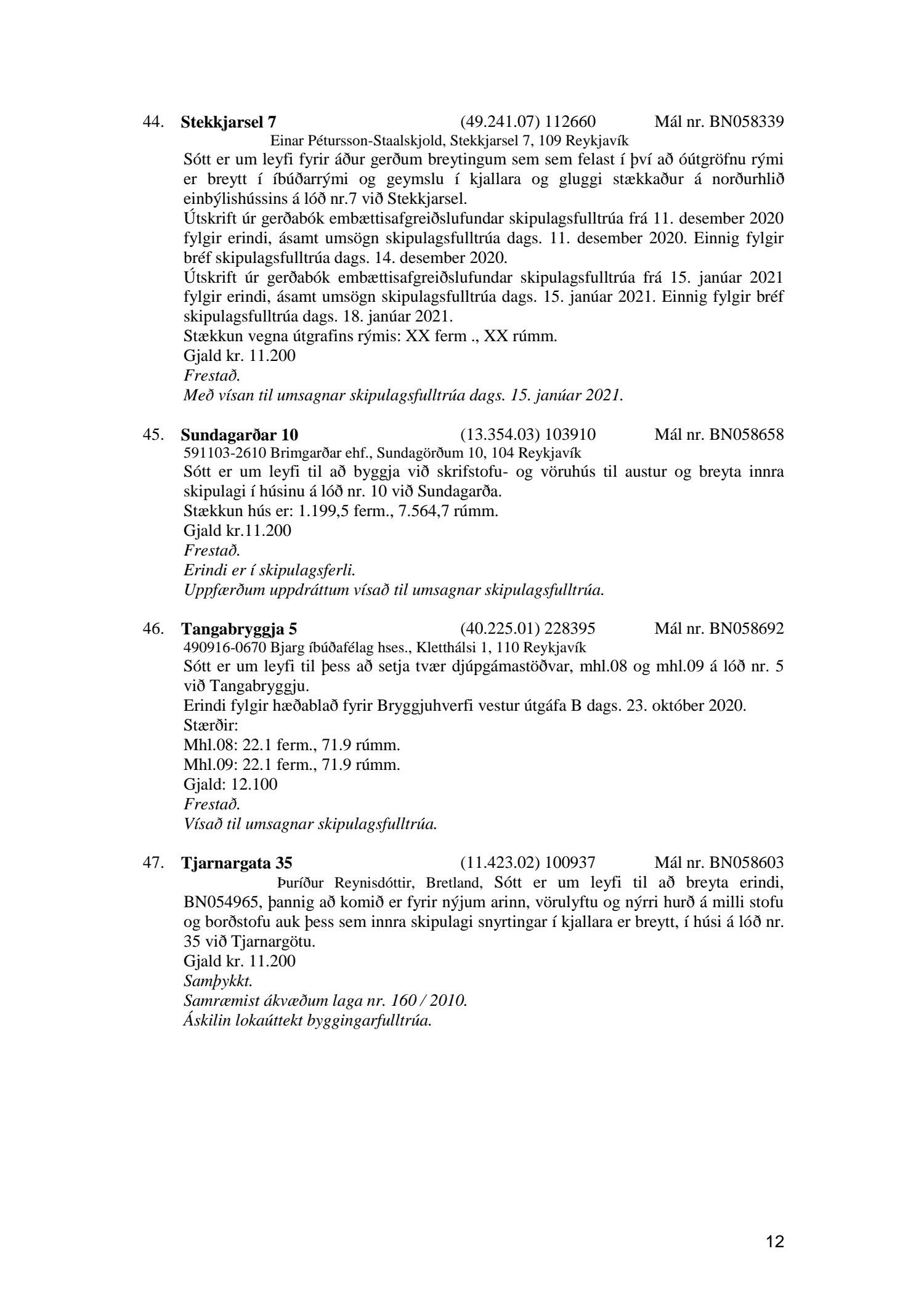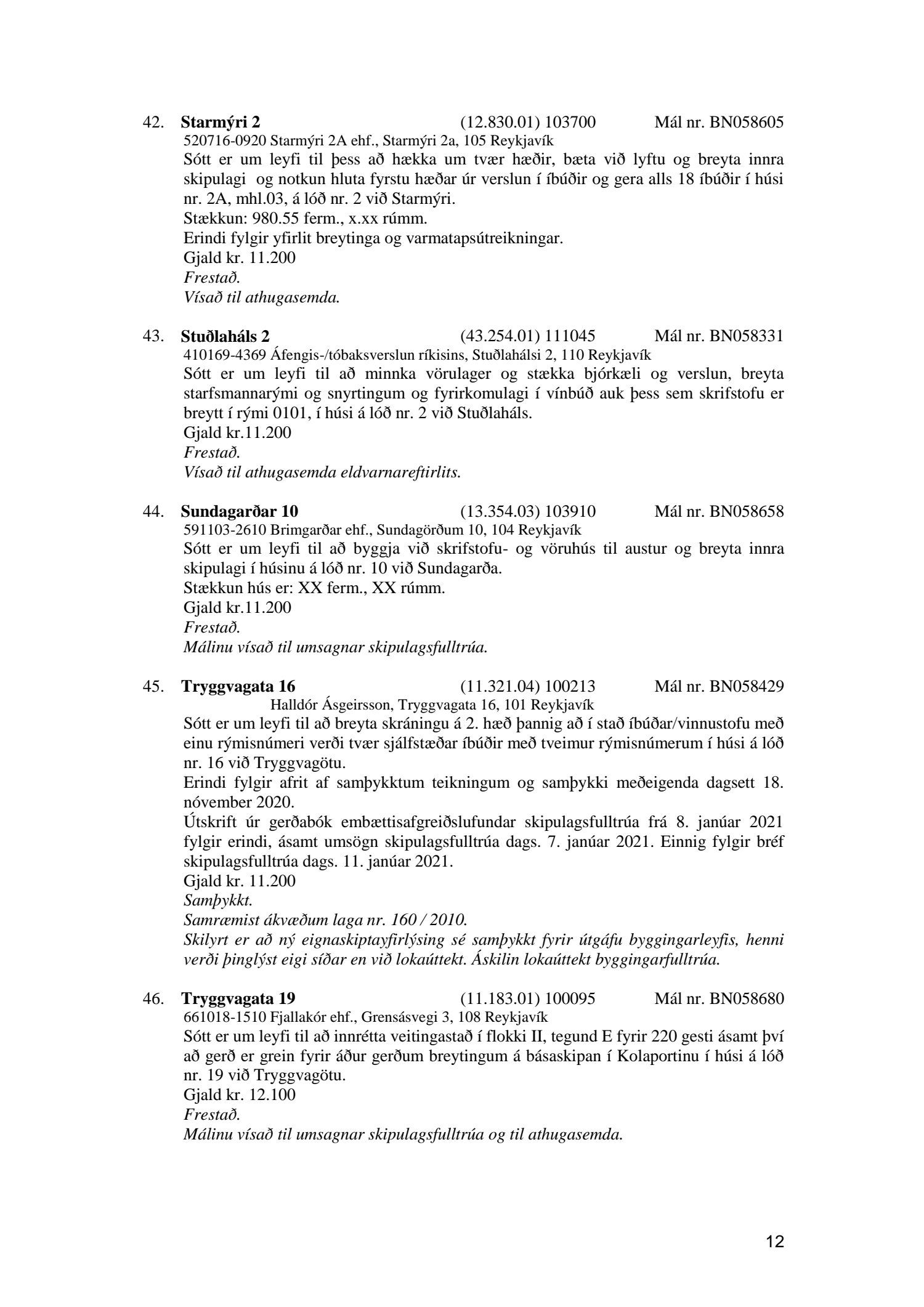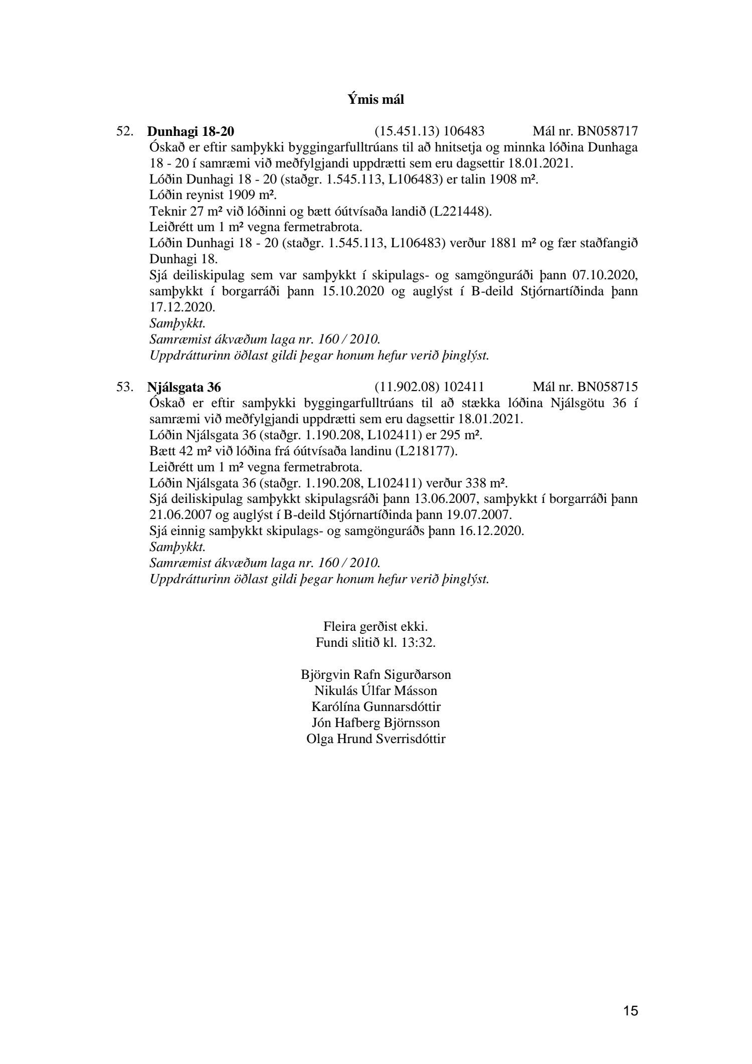 Fylgiskjal með fundargerð þessari eru fundargerðir afgreiðslufundar byggingarfulltrúa nr. 1098 frá 12. janúar 2021 og nr. 1099 frá 19. janúar 2021.