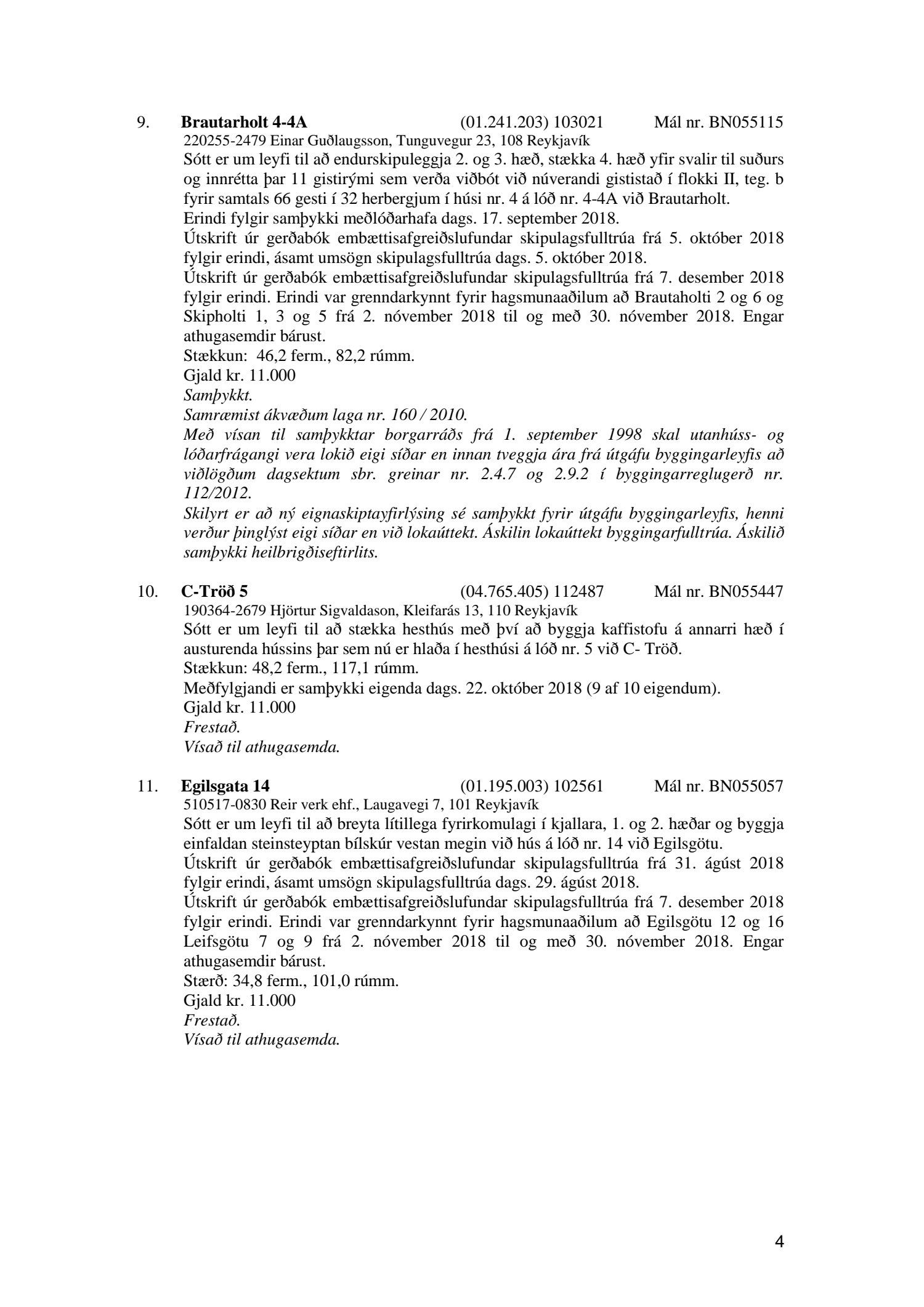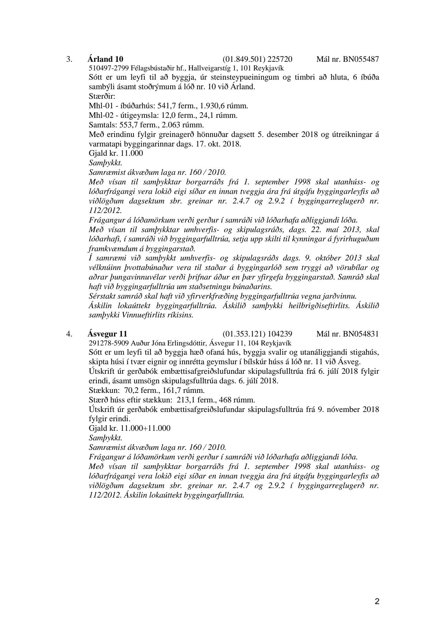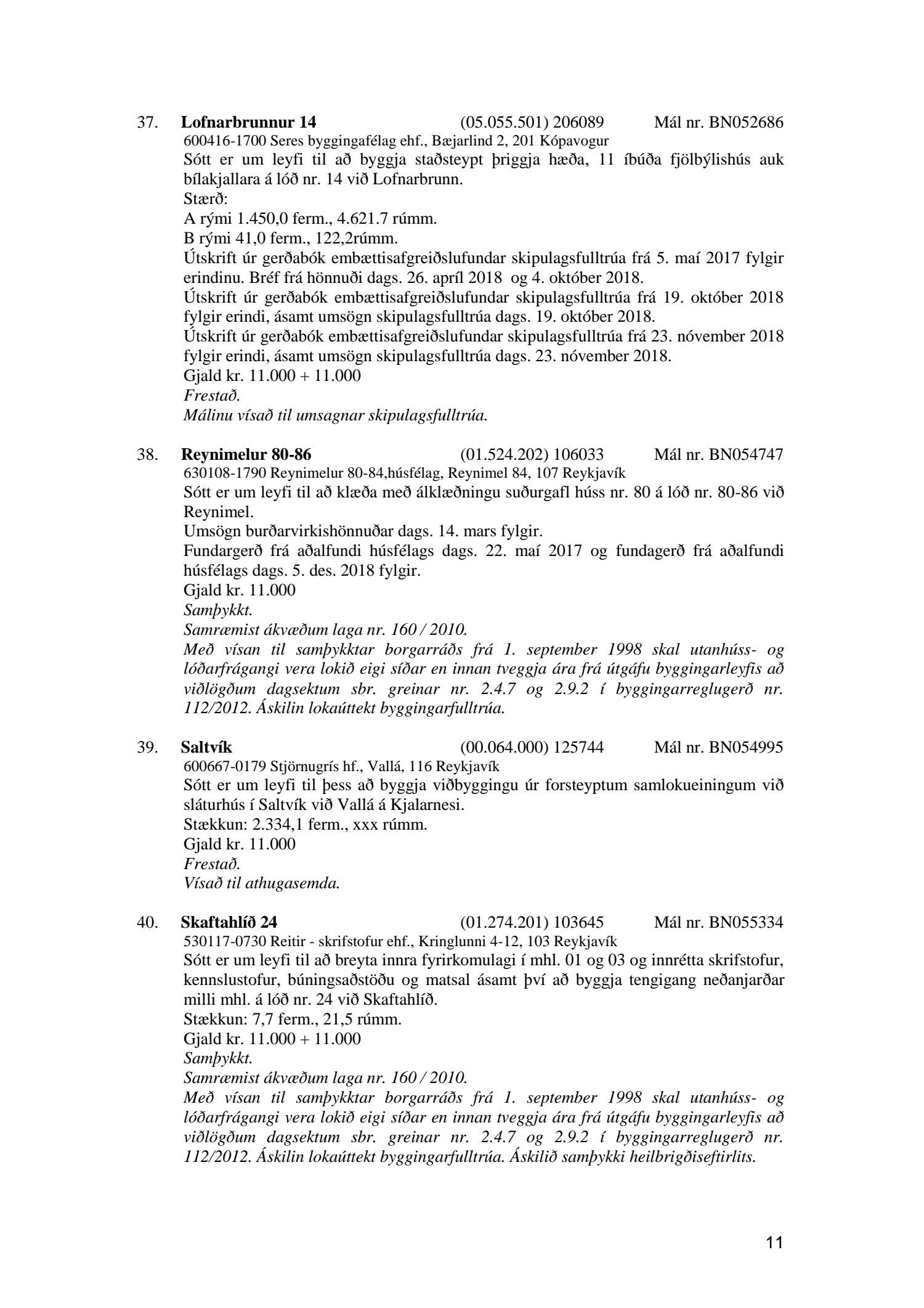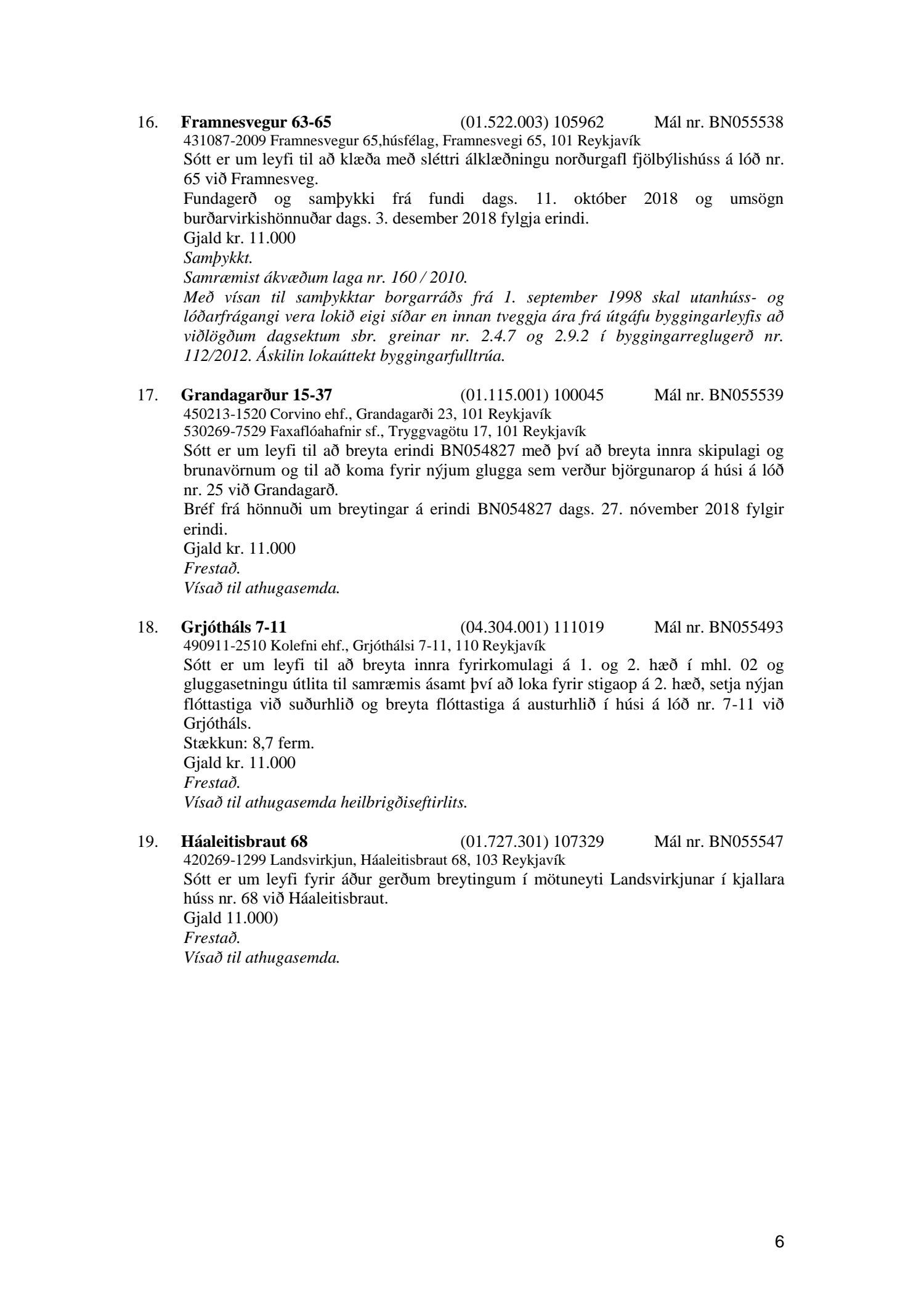 Afgreiðslufundir byggingarfulltrúa 11. og 18. desember 2018