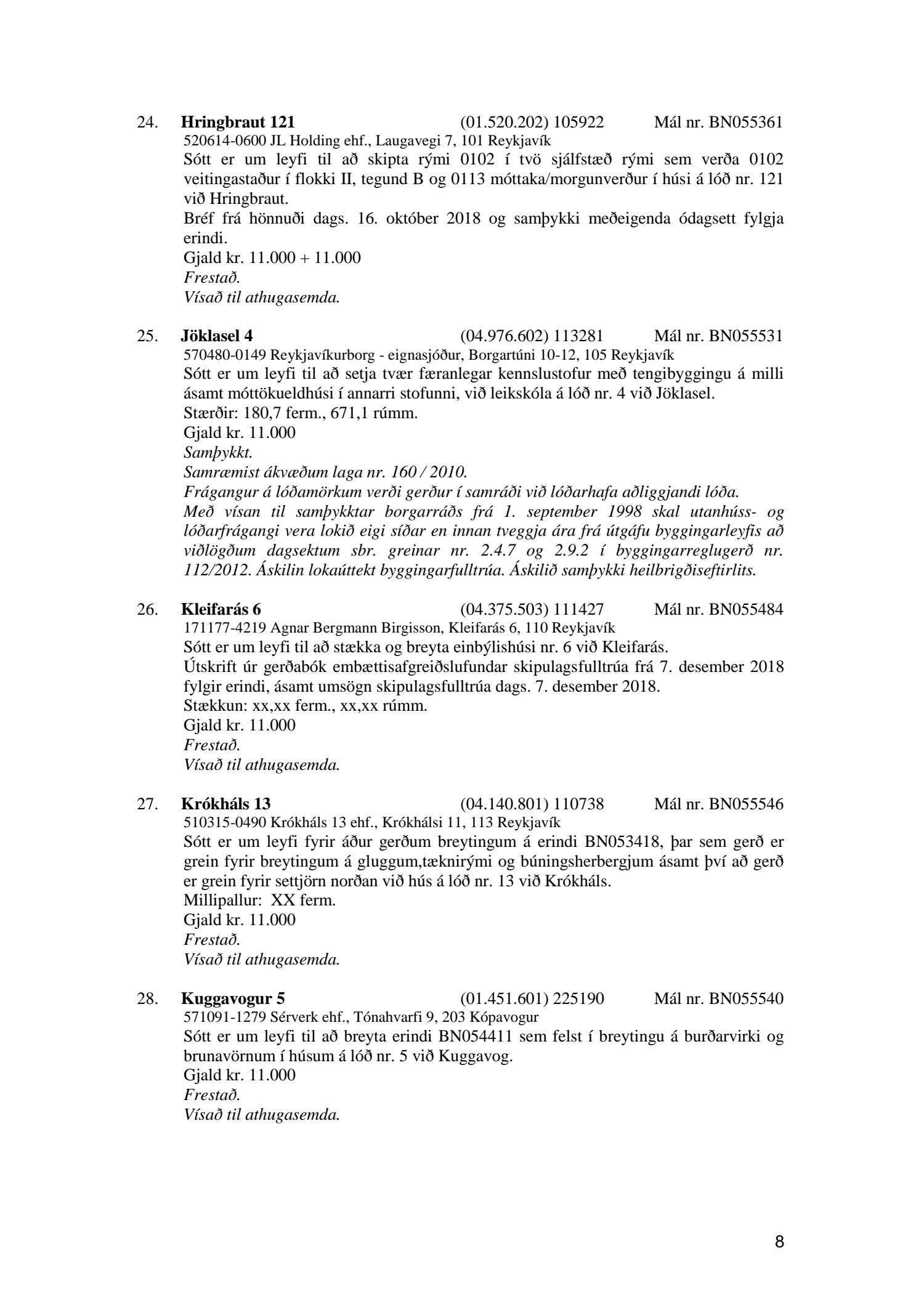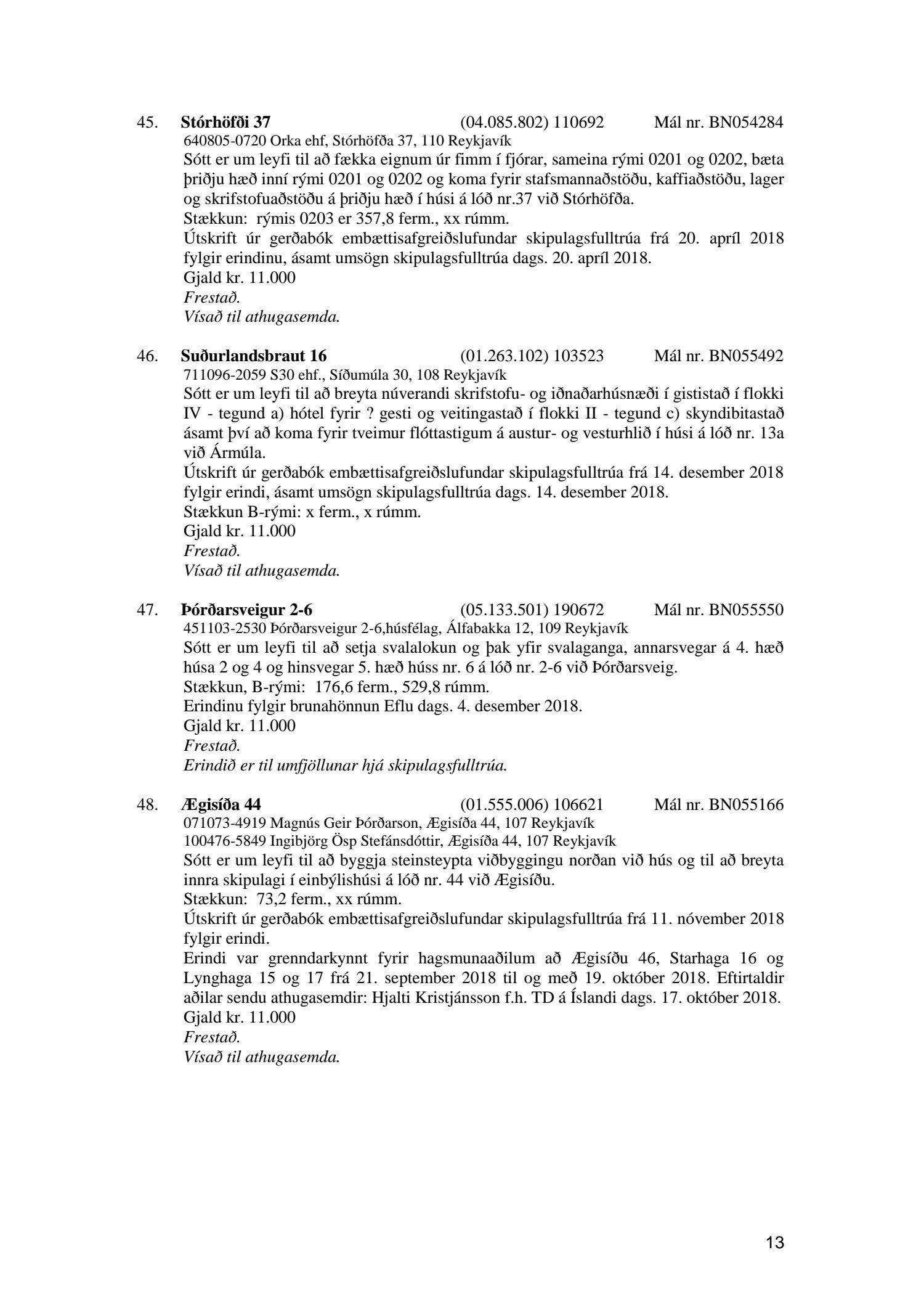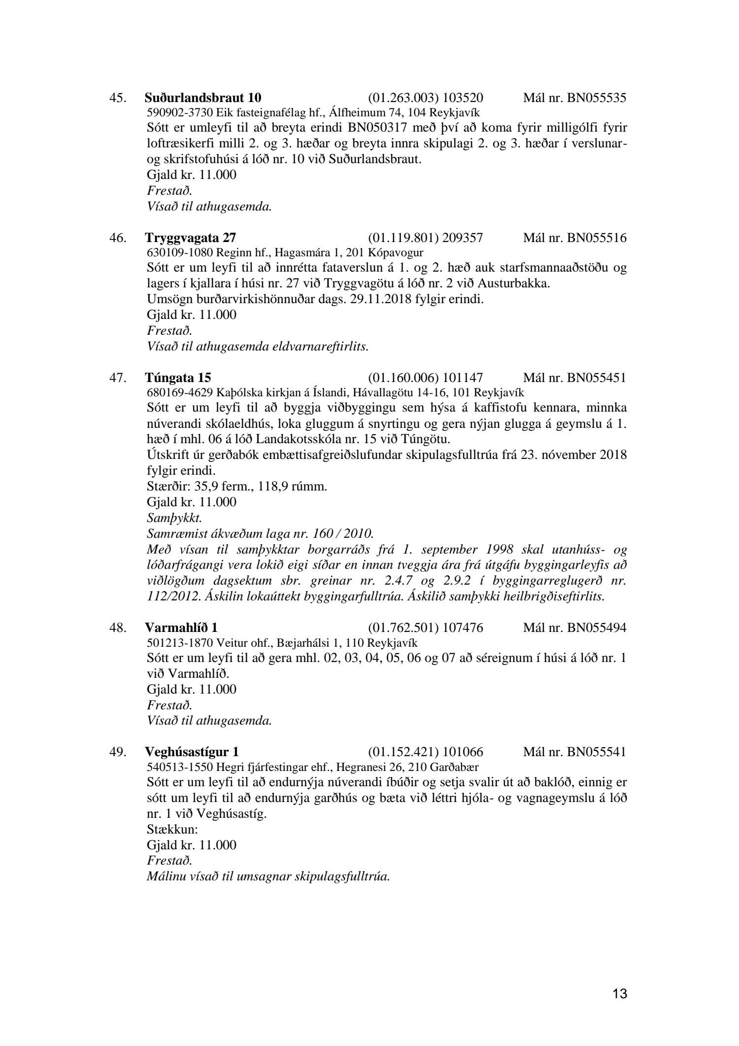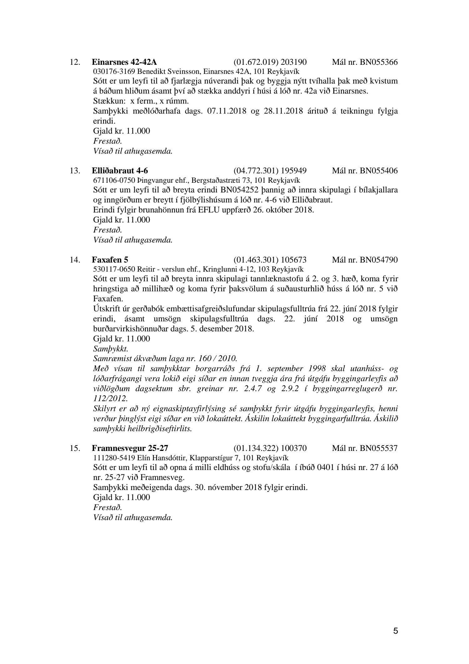 Afgreiðslufundir byggingarfulltrúa 11. og 18. desember 2018