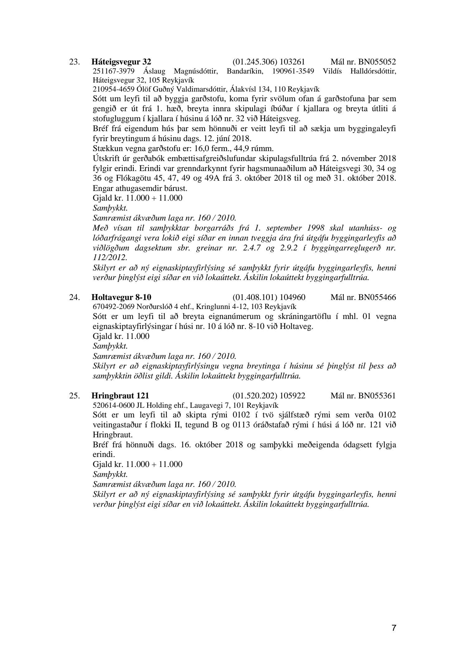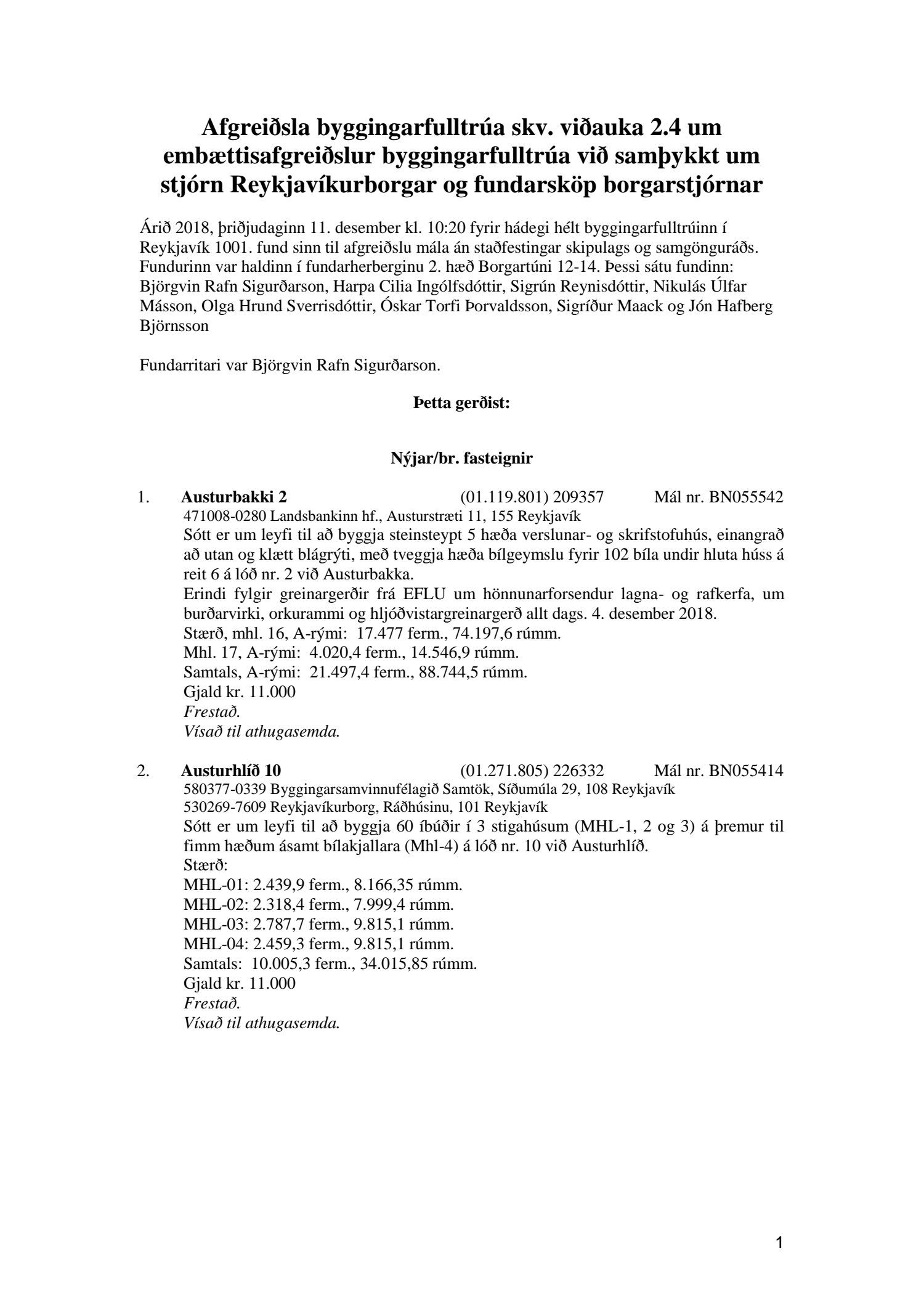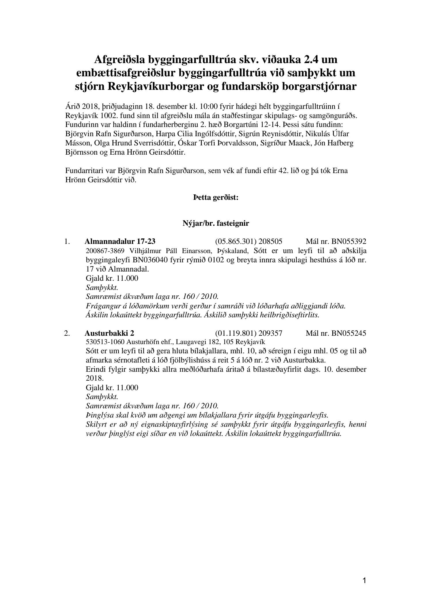 Fylgiskjal með fundargerð þessari er fundargerð afgreiðslufundar byggingarfulltrúa nr. 1001 frá 11. desember 2018 og fundargerð afgreiðslufundar byggingarfulltrúa nr. 1002 frá 18. desember 2018.