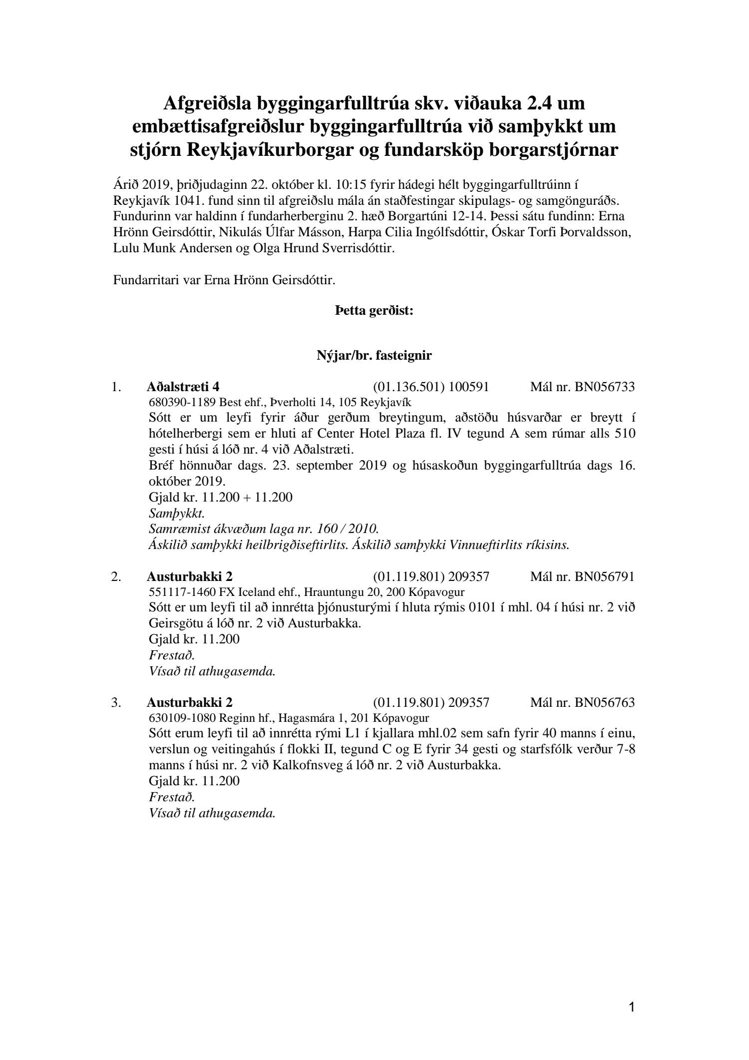 Fylgiskjal með fundargerð þessari er fundargerð afgreiðslufundar byggingarfulltrúa nr. 1041 frá 22. október 2019.