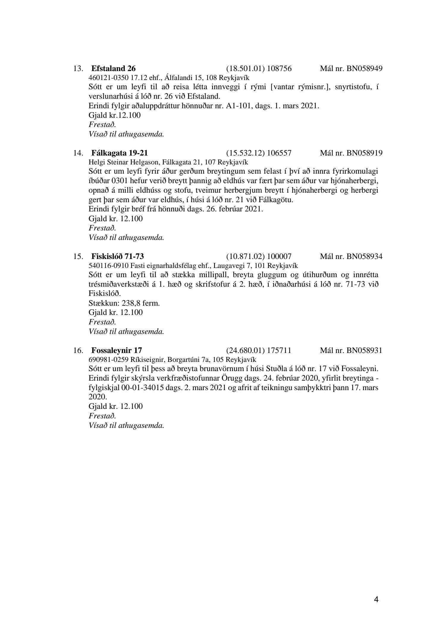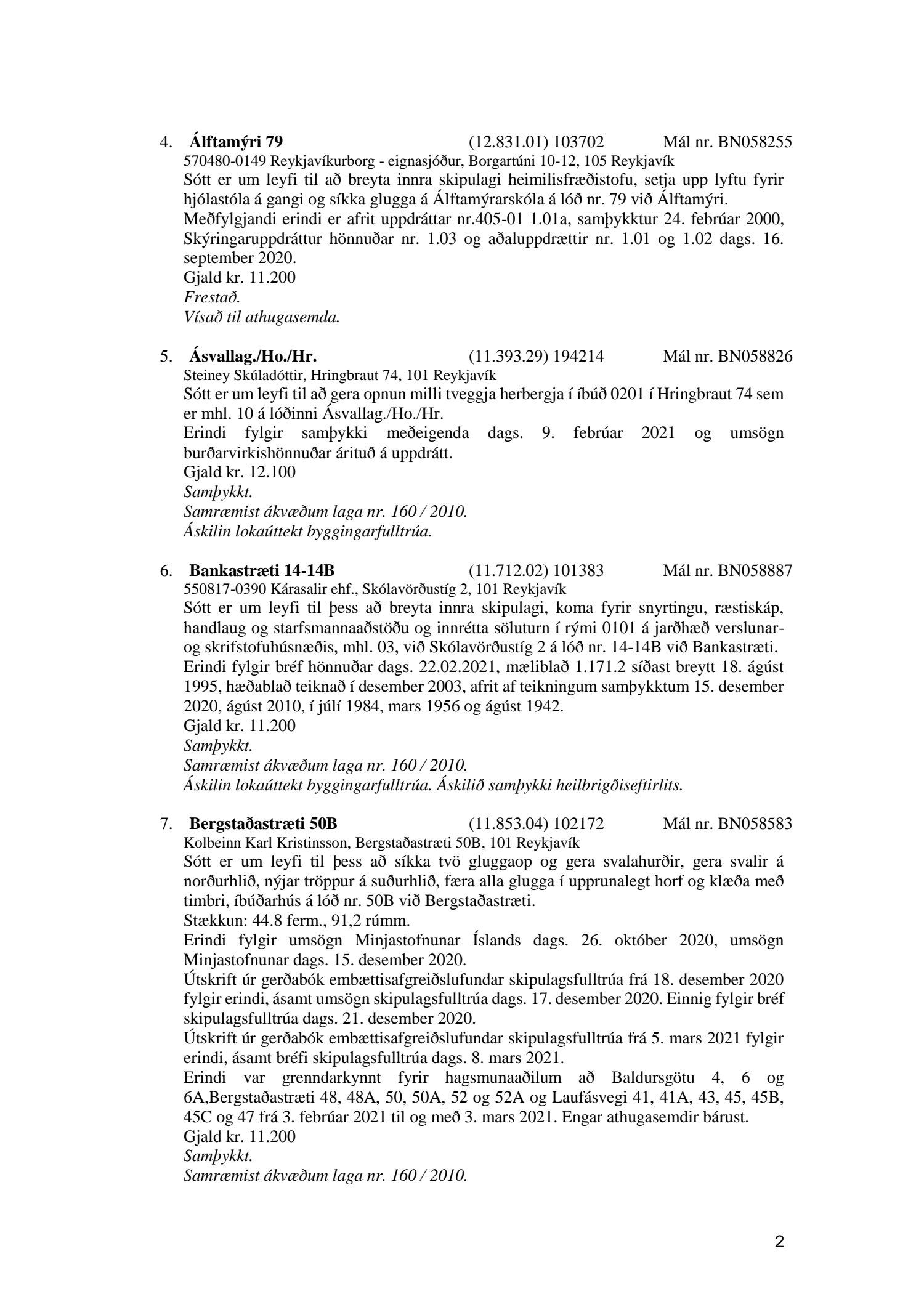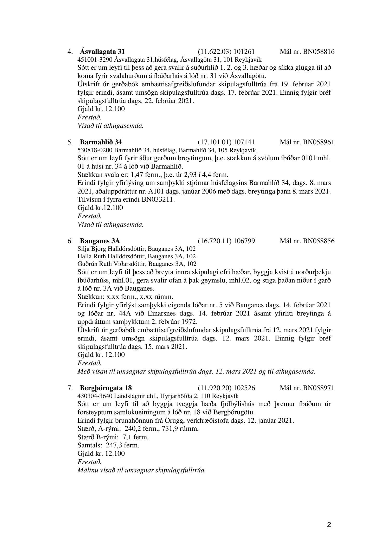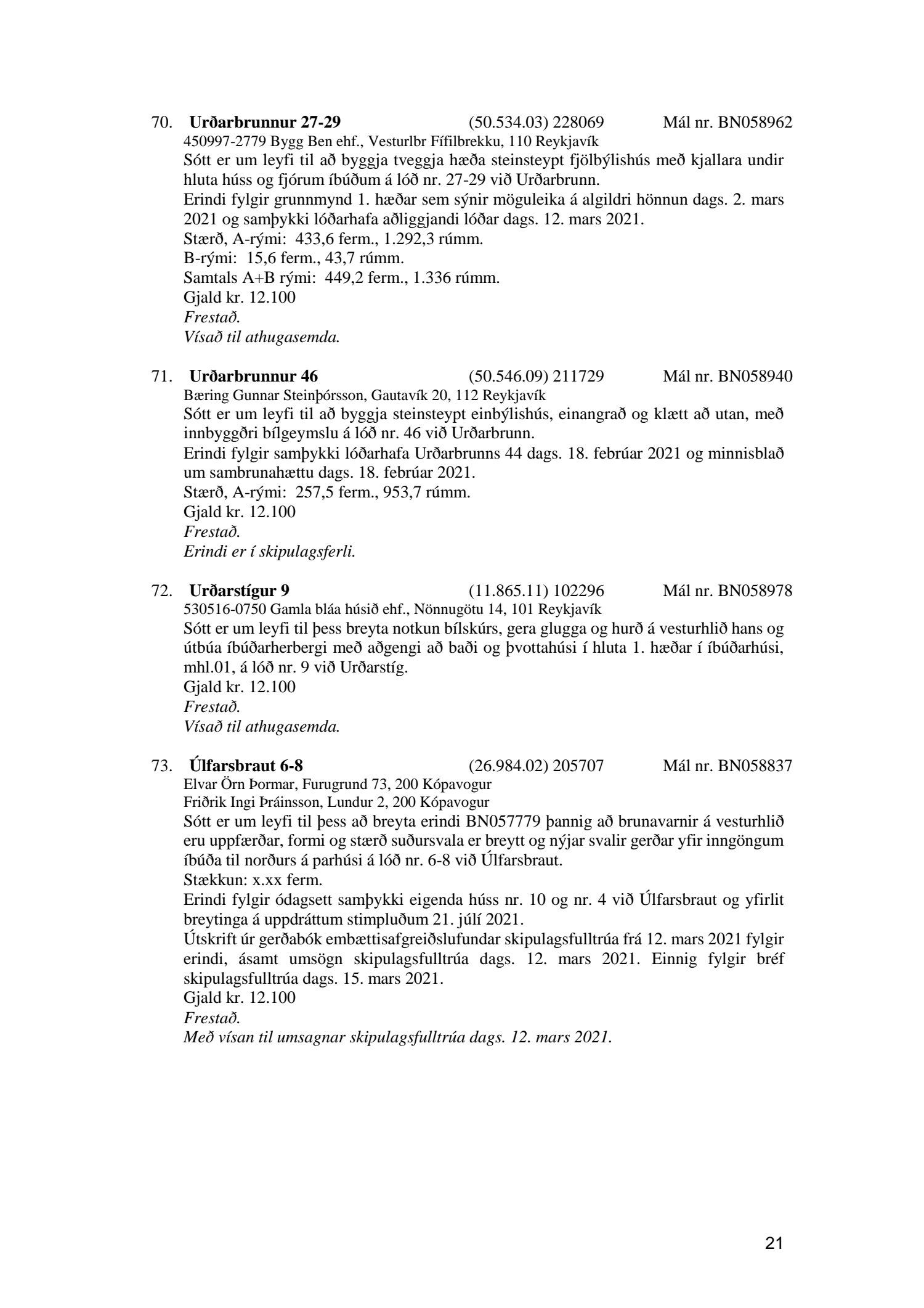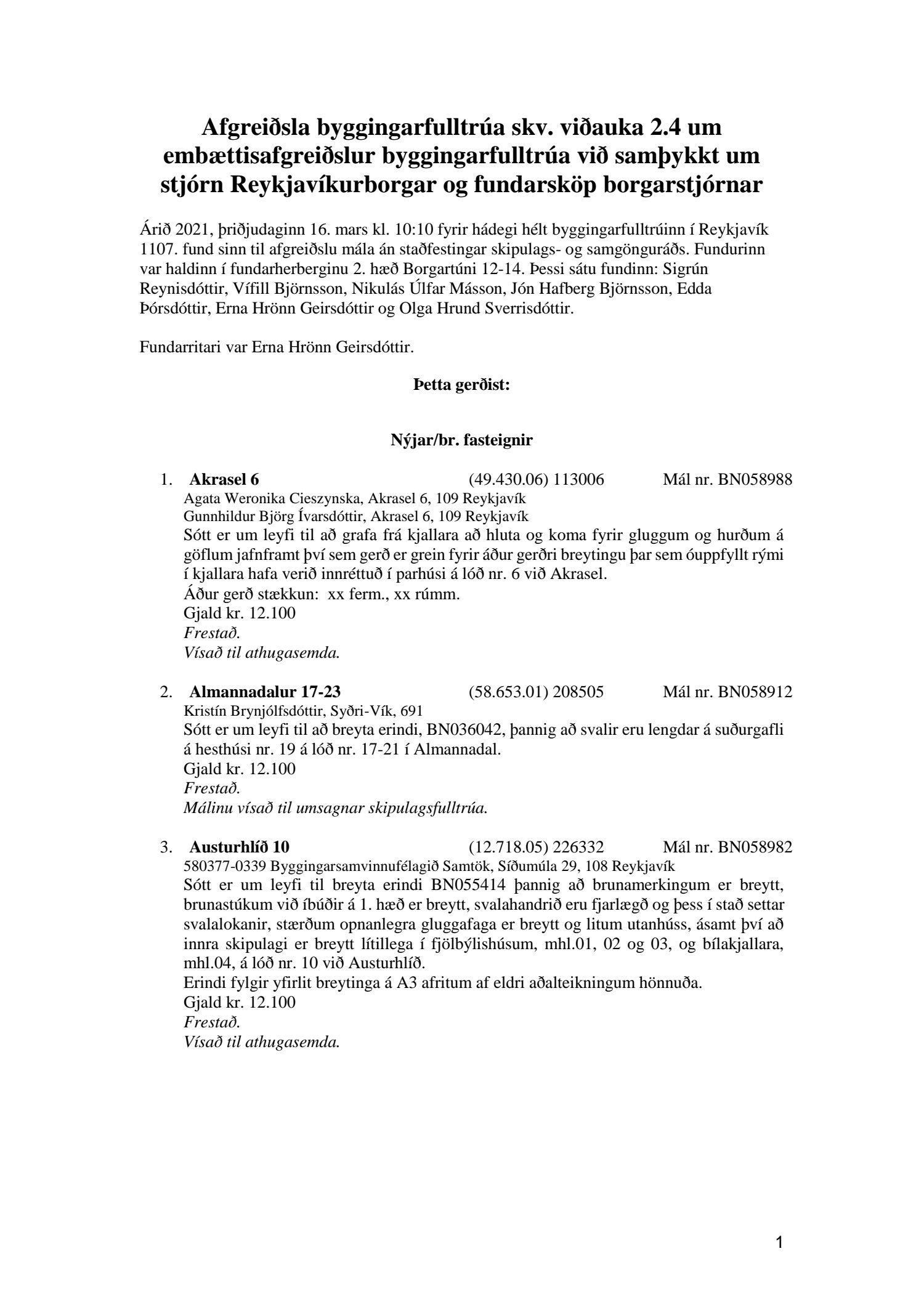 Fylgiskjal með fundargerð þessari eru fundargerðir afgreiðslufundar byggingarfulltrúa nr. 1106 frá 9. mars 2021 og nr. 1107 frá 16. mars 2021.