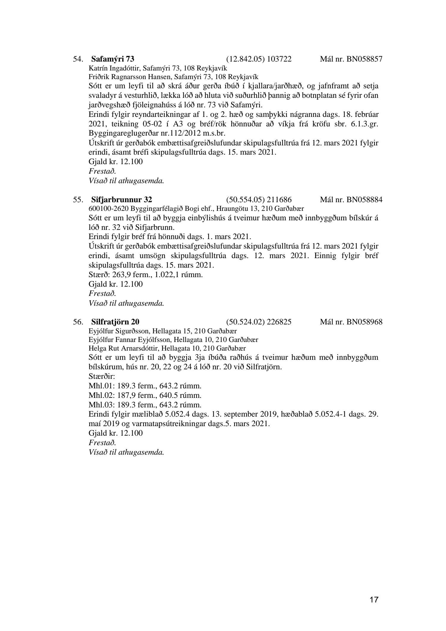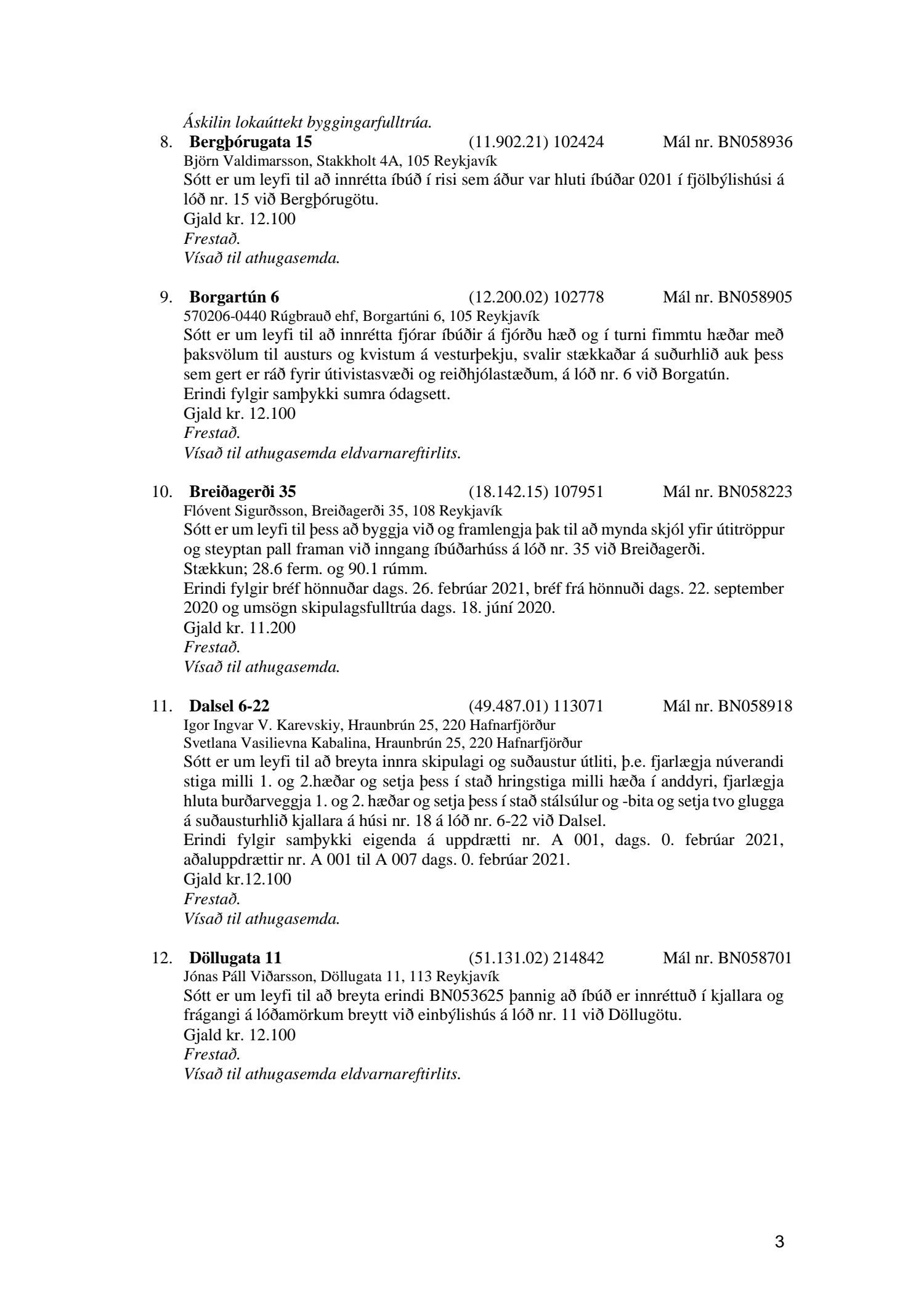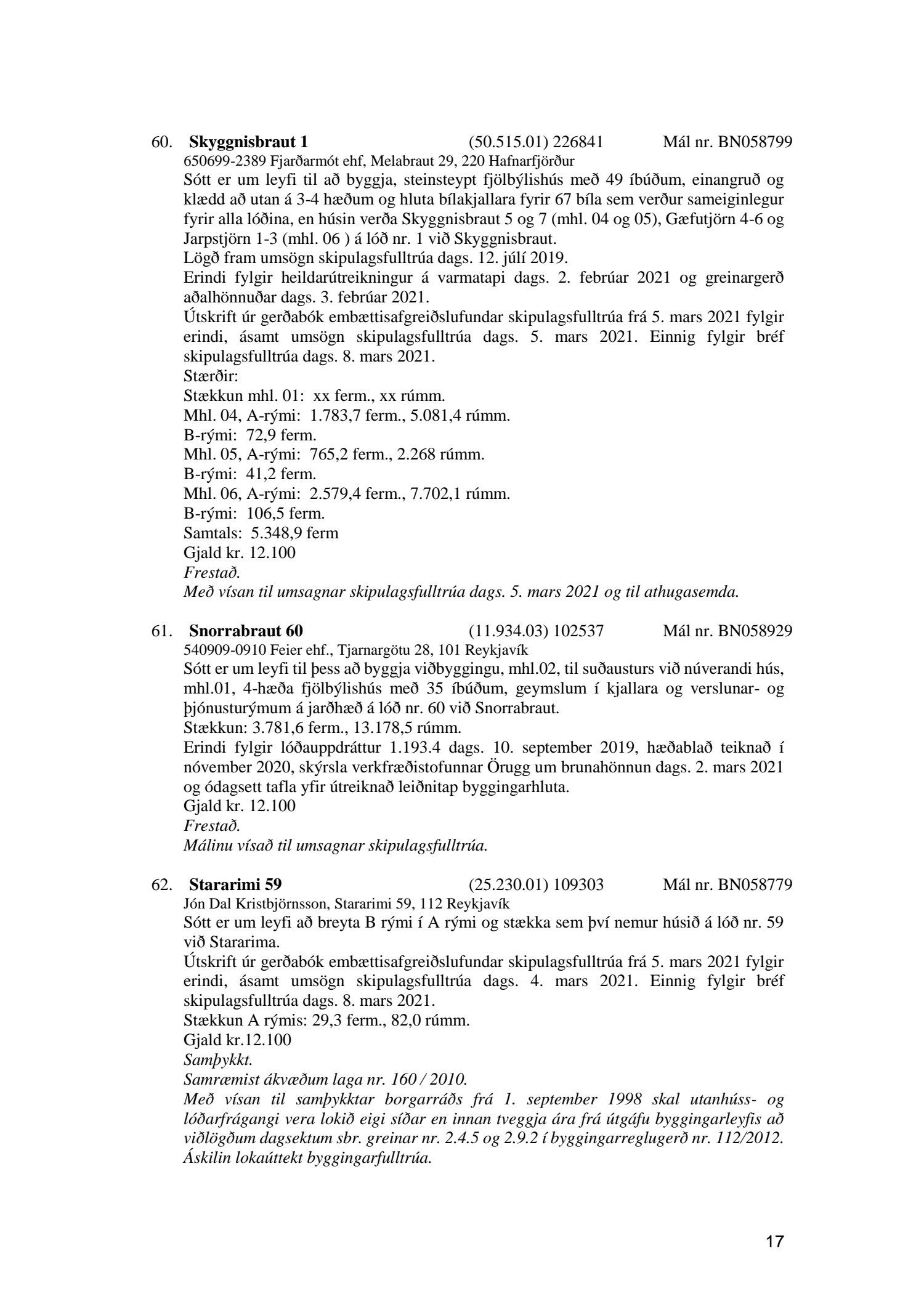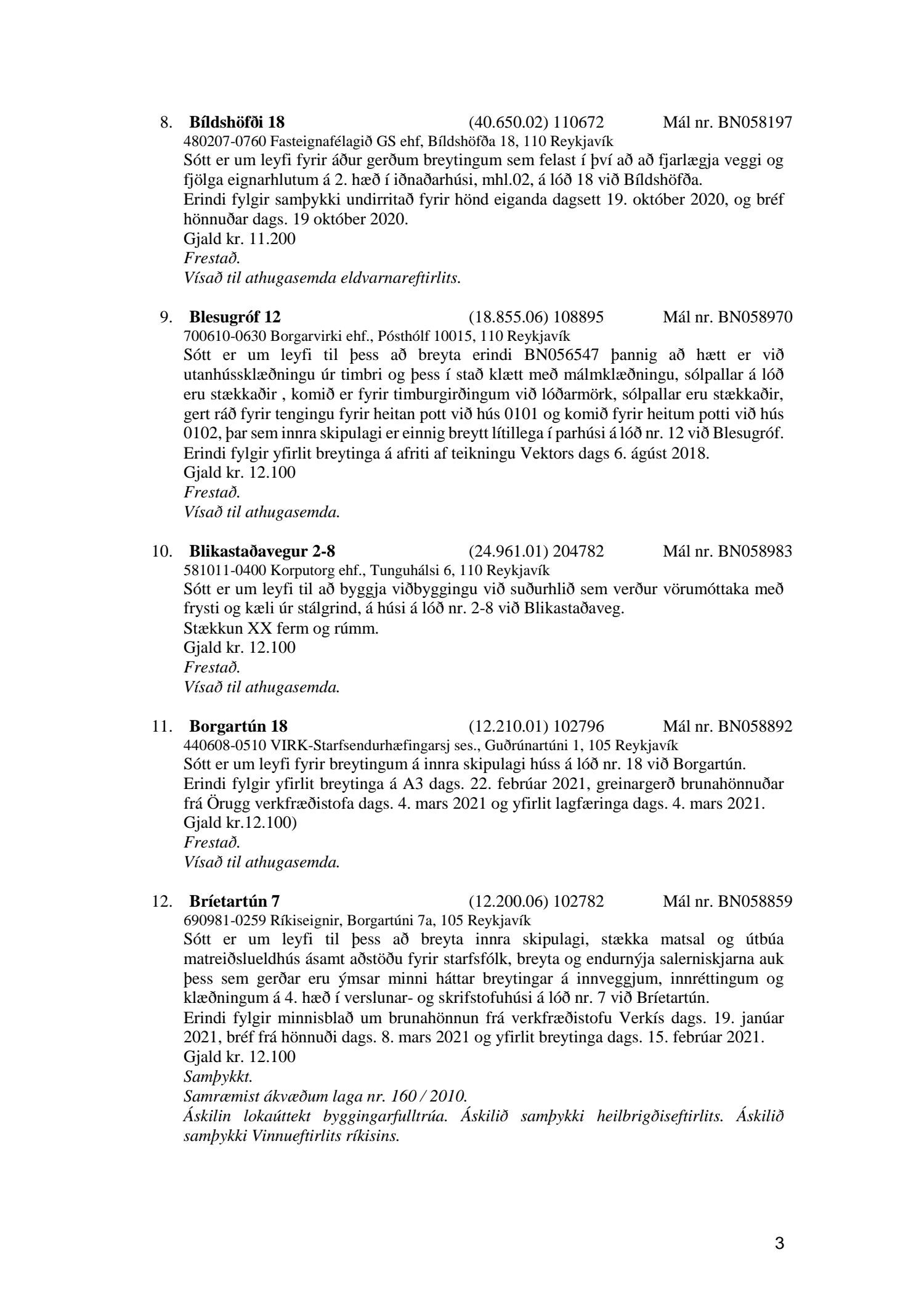 Fylgiskjal með fundargerð þessari eru fundargerðir afgreiðslufundar byggingarfulltrúa nr. 1106 frá 9. mars 2021 og nr. 1107 frá 16. mars 2021.