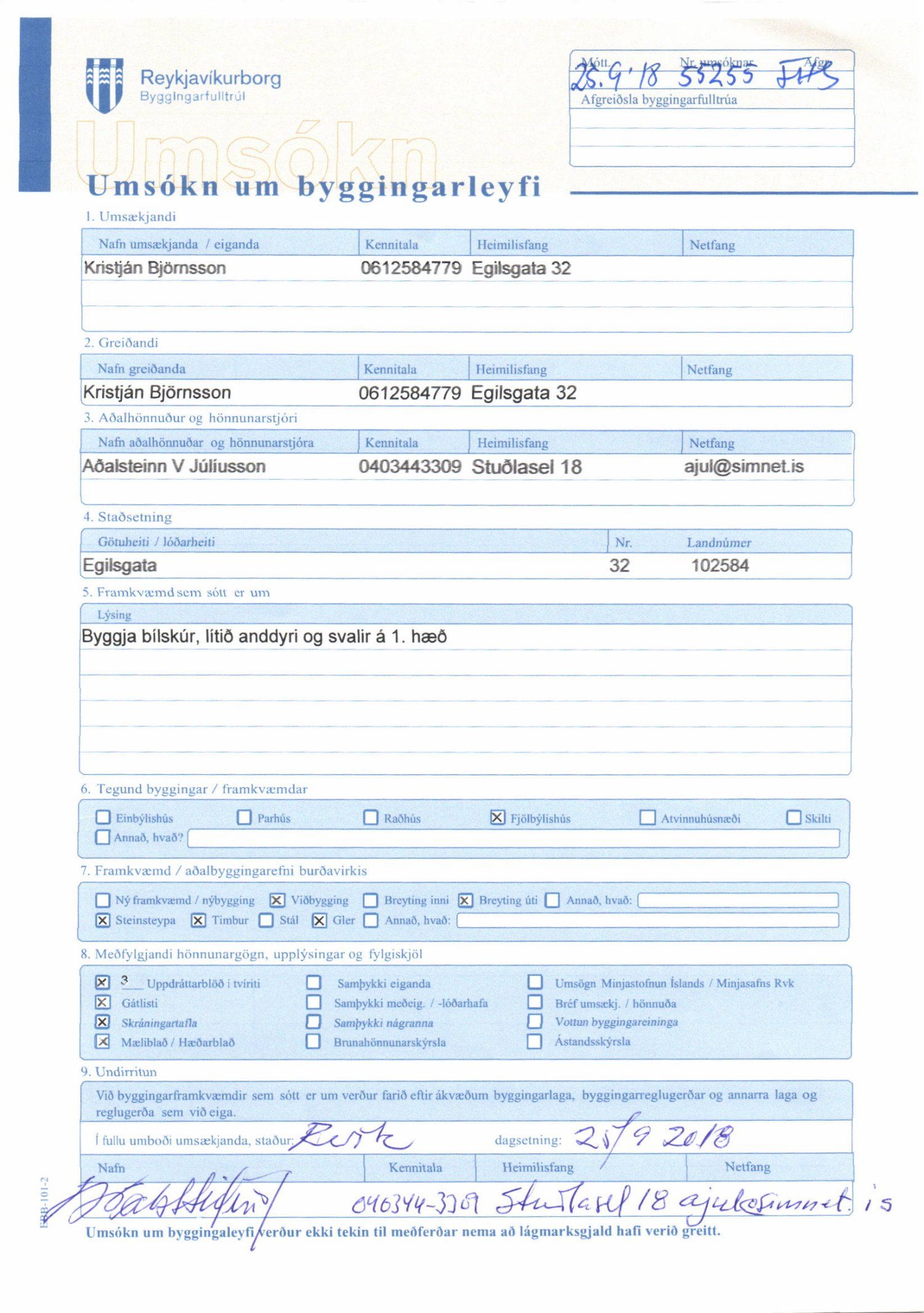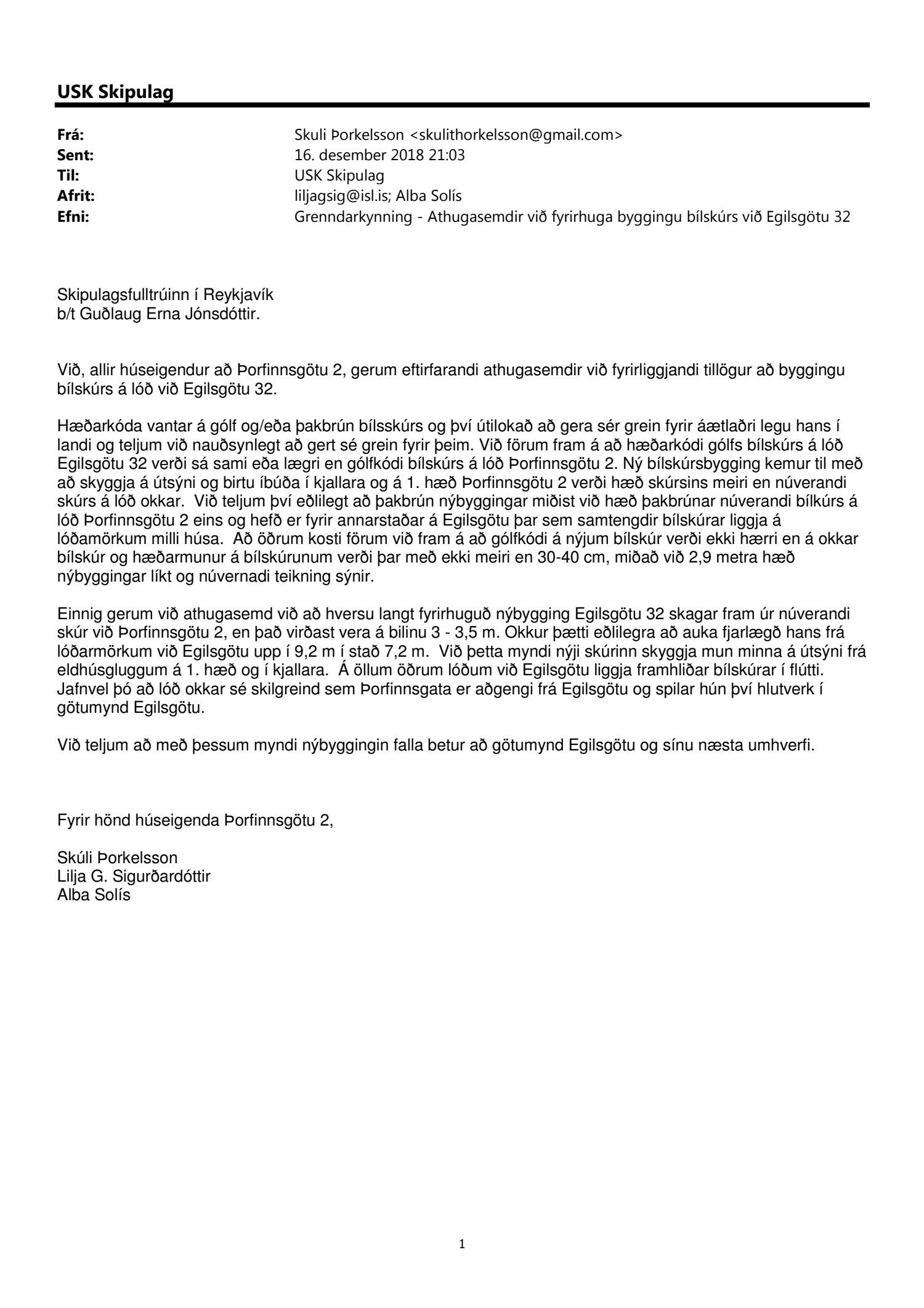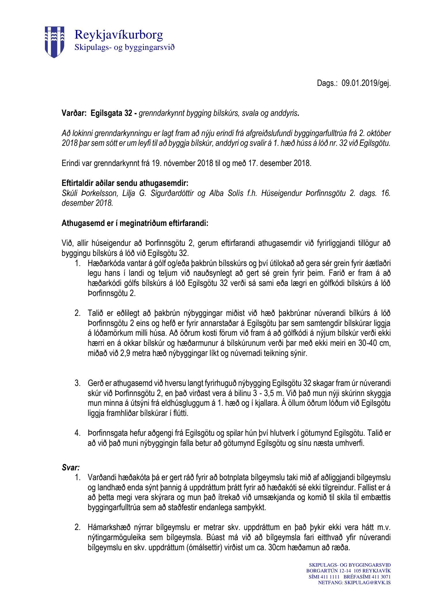 Að lokinni grenndarkynningu er lagt fram að nýju erindi frá afgreiðslufundi byggingarfulltrúa frá 2. október 2018 þar sem sótt er um leyfi til að byggja bílskúr, anddyri og svalir á 1. hæð húss á lóð nr. 32 við Egilsgötu. Erindi var grenndarkynnt frá 19. nóvember 2018 til og með 17. desember 2018. Eftirtaldir aðilar sendu athugasemdir: Skúli Þorkelsson, Lilja G. Sigurardóttir og Alba Solís f.h. Húseigendur Þorfinnsgötu 2. dags. 16. desember 2018. Einnig er lögð fram umsögn skipulagsfulltrúa dags. 9. janúar 2019. Bílskúr: 32 ferm., 93,3 rúmm. Stækkun húss: xx ferm., xx rúmm. Gjald kr. 11.000