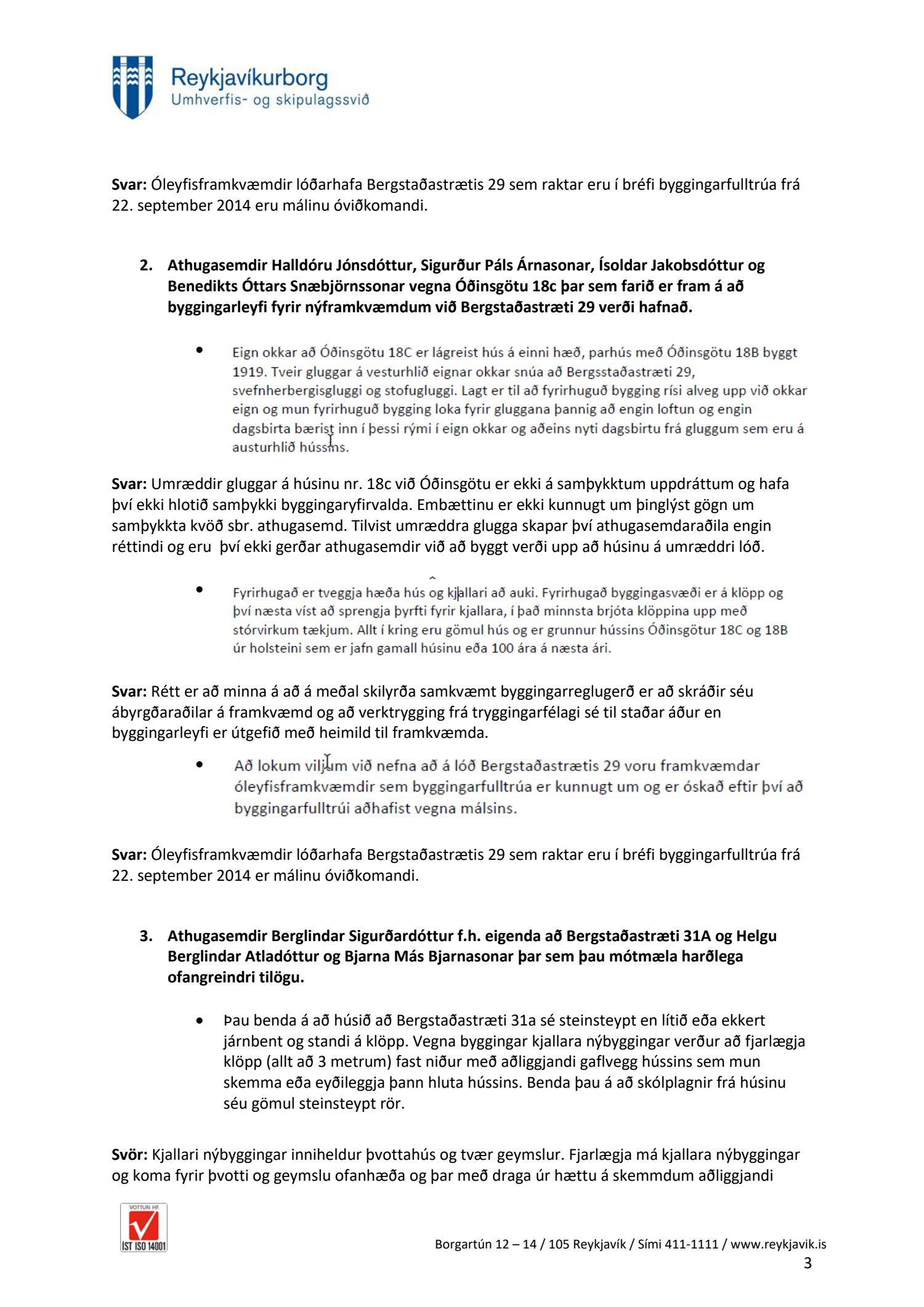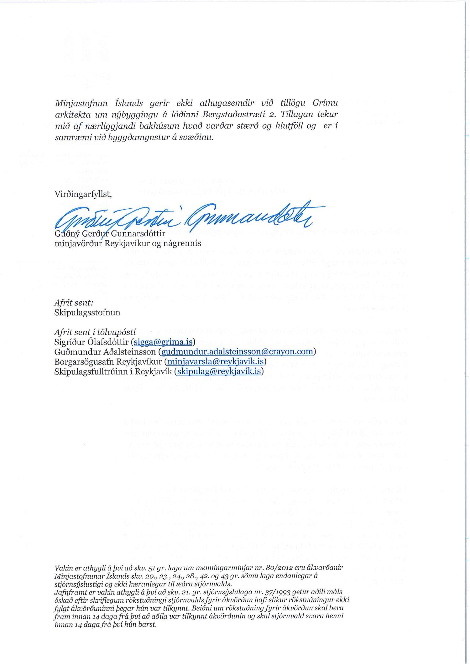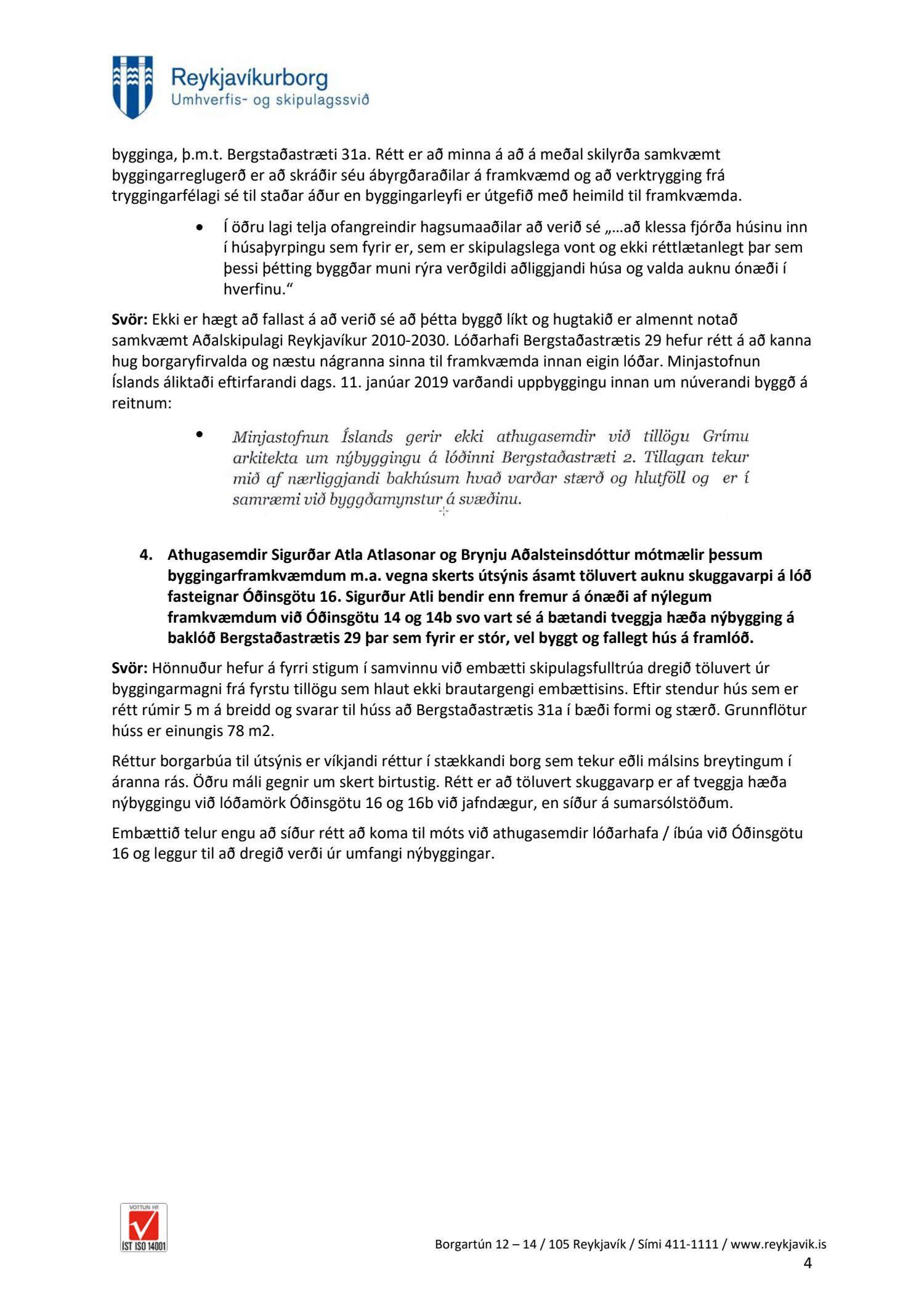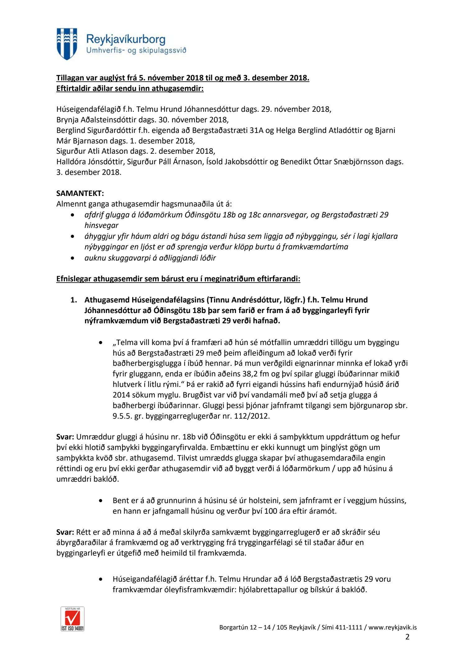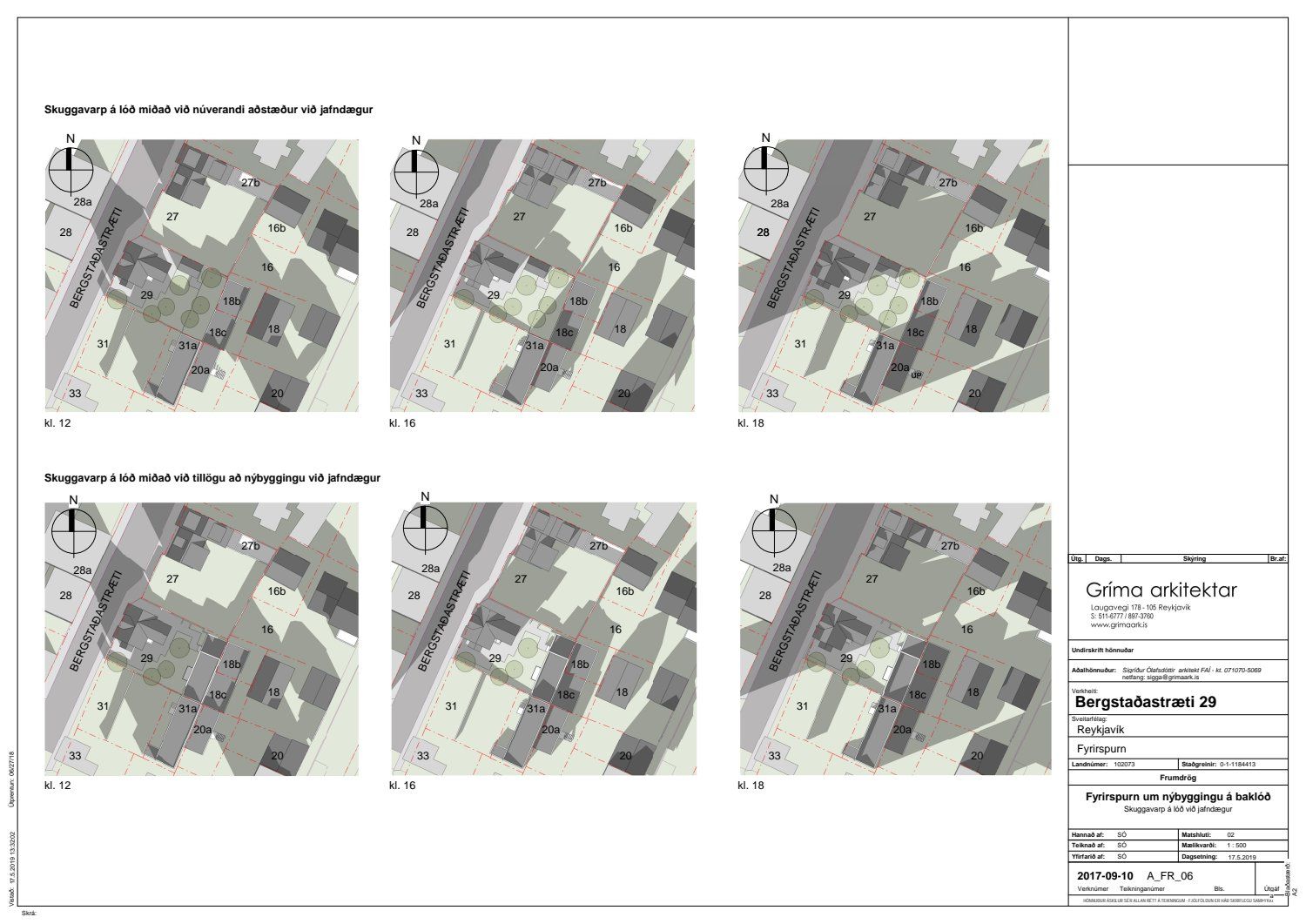Að lokinni grenndarkynningu er lagt fram að nýju erindi frá afgreiðslufundi byggingarfulltrúa frá 23. október 2018 þar sem sótt er um leyfi til byggja mhl. 02 sem er tveggja hæða steinsteypt íbúðarhús með kjallara á lóð nr. 29 við Bergstaðastræti. Erindi var grenndarkynnt frá 5. nóvember 2018 til og með 3. desember 2018. Eftirtaldir aðilar sendu athugasemdir: Húseigendafélagið f.h. Telmu Hrund Jóhannesdóttur dags. 29. nóvember 2018, Brynja Aðalsteinsdóttir dags. 30. nóvember 2018, Berglind Sigurðardóttir f.h. eigenda að Bergstaðastræti 31A og Helga Berglind Atladóttir og Bjarni Már Bjarnason dags. 1. desember 2018, Sigurður Atli Atlason dags. 2. desember 2018 og Halldóra Jónsdóttir, Sigurður Páll Árnason, Ísold Jakobsdóttir og Benedikt Óttar Snæbjörnsson dags. 3. desember 2018. Einnig er lagður fram uppdráttur/sniðmyndir GRÍMA-arkitekta dags. 21. desember 2018 og umsögn Minjastofnunar Íslands dags. 11. janúar 2019. Jafnframt eru lagðir fram lagfærðir uppdættir GRÍMA-arkitekta ehf. dags. 16. maí 2019. Erindinu var vísað til umsagnar verkefnisstjóra á embættisafgreiðslufundi skipulagsfulltrúa 7. desember 2018 og er nú lagt fram að nýju.