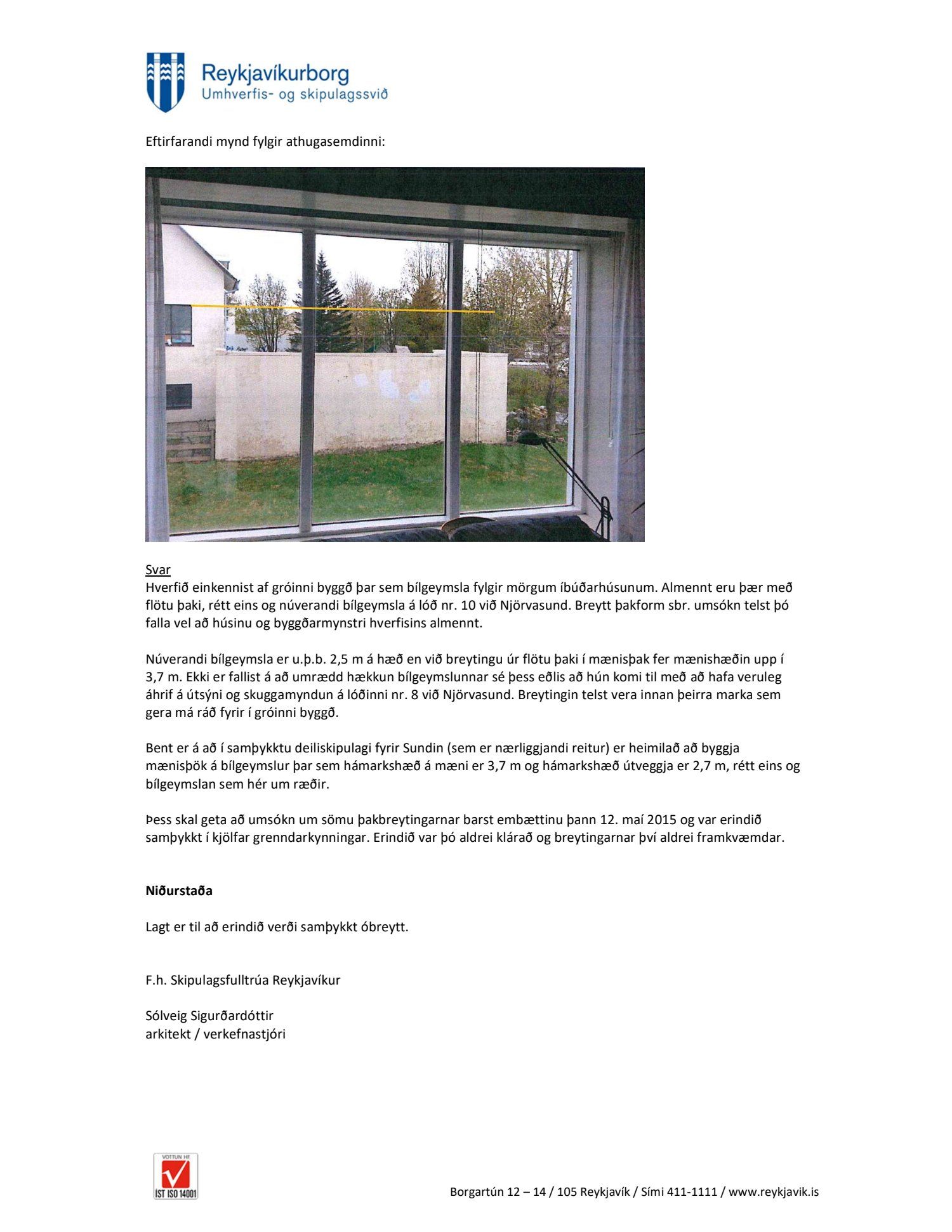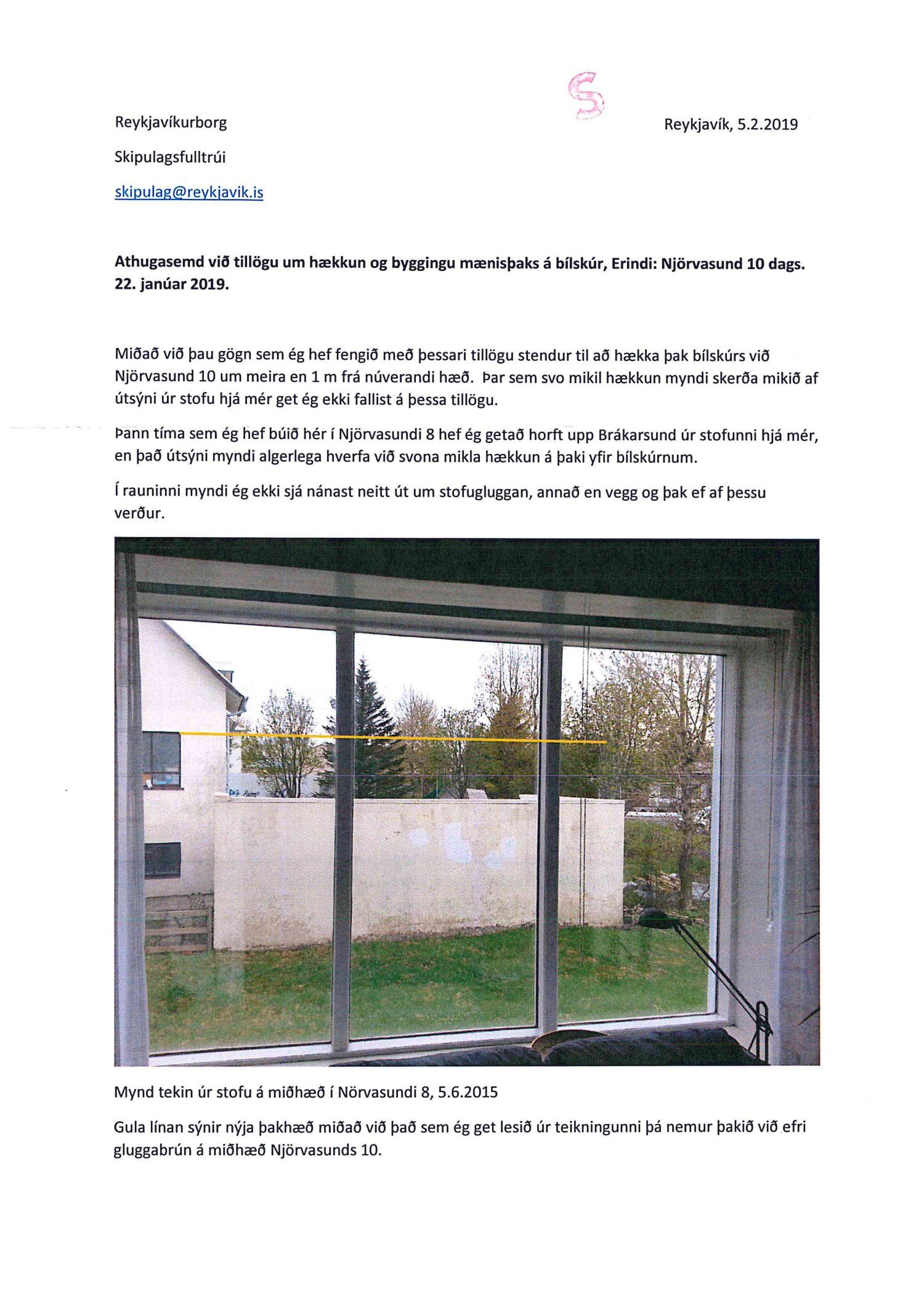 Að lokinni grenndarkynningu er lagt fram að nýju erindi frá afgreiðslufundi byggingarfulltrúa frá 20. nóvember 2018 þar sem sótt er um leyfi til að hækka og byggja mænisþak á bílskúr og til að byggja verönd með skjólveggjum og heitum potti með öryggisloki sem verður sérafnotaflötur íbúðar 0101 á lóð nr. 10 við Njörvasund. Erindi var grenndarkynnt frá 24. janúar 2019 til og með 21. febrúar 2019. Eftirtaldir aðilar sendu athugasemdir: Jens Fylkisson og Haukur Jensson dags. 5. febrúar 2019. Erindinu var vísað til umsagnar verkefnisstjóra á embættisafgreiðslufundi skipulagsfulltrúa 1. mars 2019 og er nú lagt fram að nýju.
