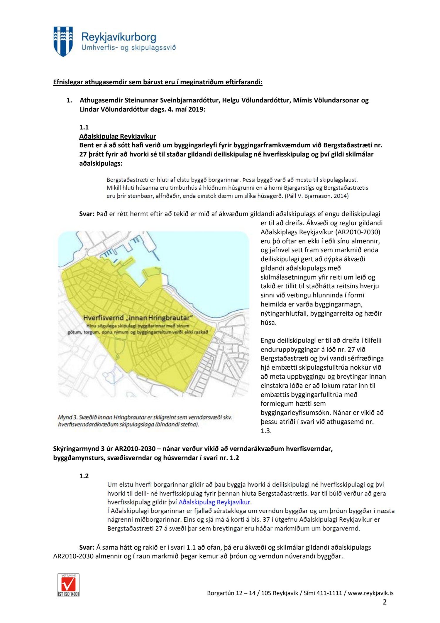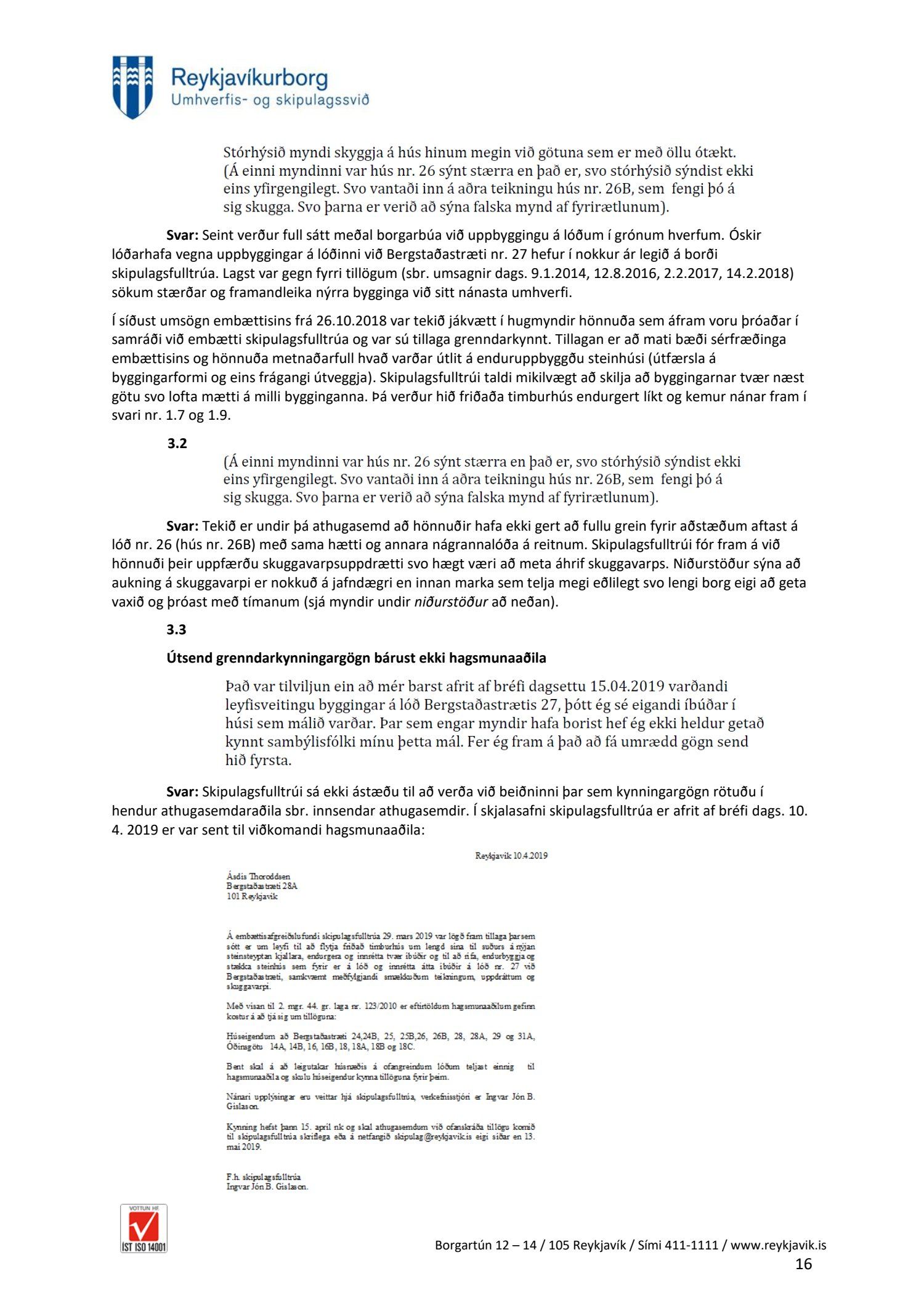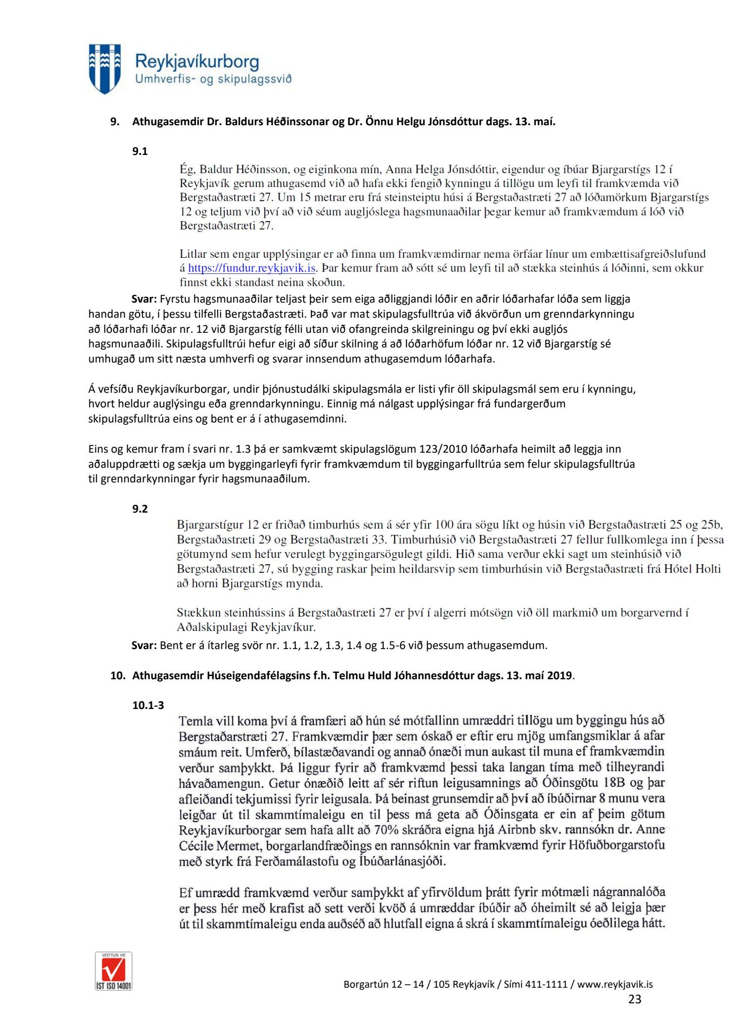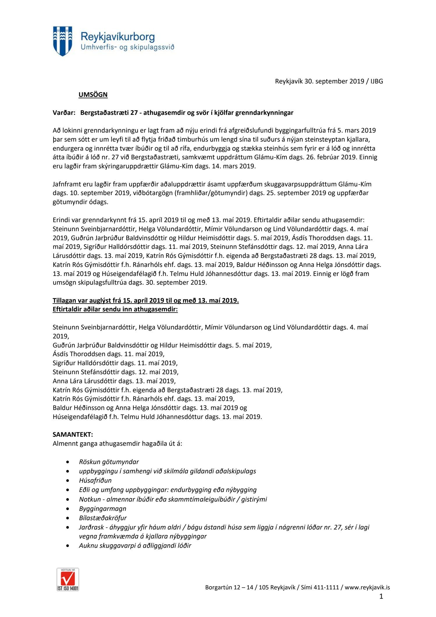 Erindi var grenndarkynnt frá 15. apríl 2019 til og með 13. maí 2019. Eftirtaldir aðilar sendu athugasemdir: Steinunn Sveinbjarnardóttir, Helga Völundardóttir, Mímir Völundarson og Lind Völundardóttir dags. 4. maí 2019, Guðrún Jarþrúður Baldvinsdóttir og Hildur Heimisdóttir dags. 5. maí 2019, Ásdís Thoroddsen dags. 11. maí 2019, Sigríður Halldórsdóttir dags. 11. maí 2019, Steinunn Stefánsdóttir dags. 12. maí 2019, Anna Lára Lárusdóttir dags. 13. maí 2019, Katrín Rós Gýmisdóttir f.h. eigenda að Bergstaðastræti 28 dags. 13. maí 2019, Katrín Rós Gýmisdóttir f.h. Ránarhóls ehf. dags. 13. maí 2019, Baldur Héðinsson og Anna Helga Jónsdóttir dags. 13. maí 2019 og Húseigendafélagið f.h. Telmu Huld Jóhannesdóttur dags. 13. maí 2019. Einnig er lögð fram umsögn skipulagsfulltrúa dags. 30. september 2019.