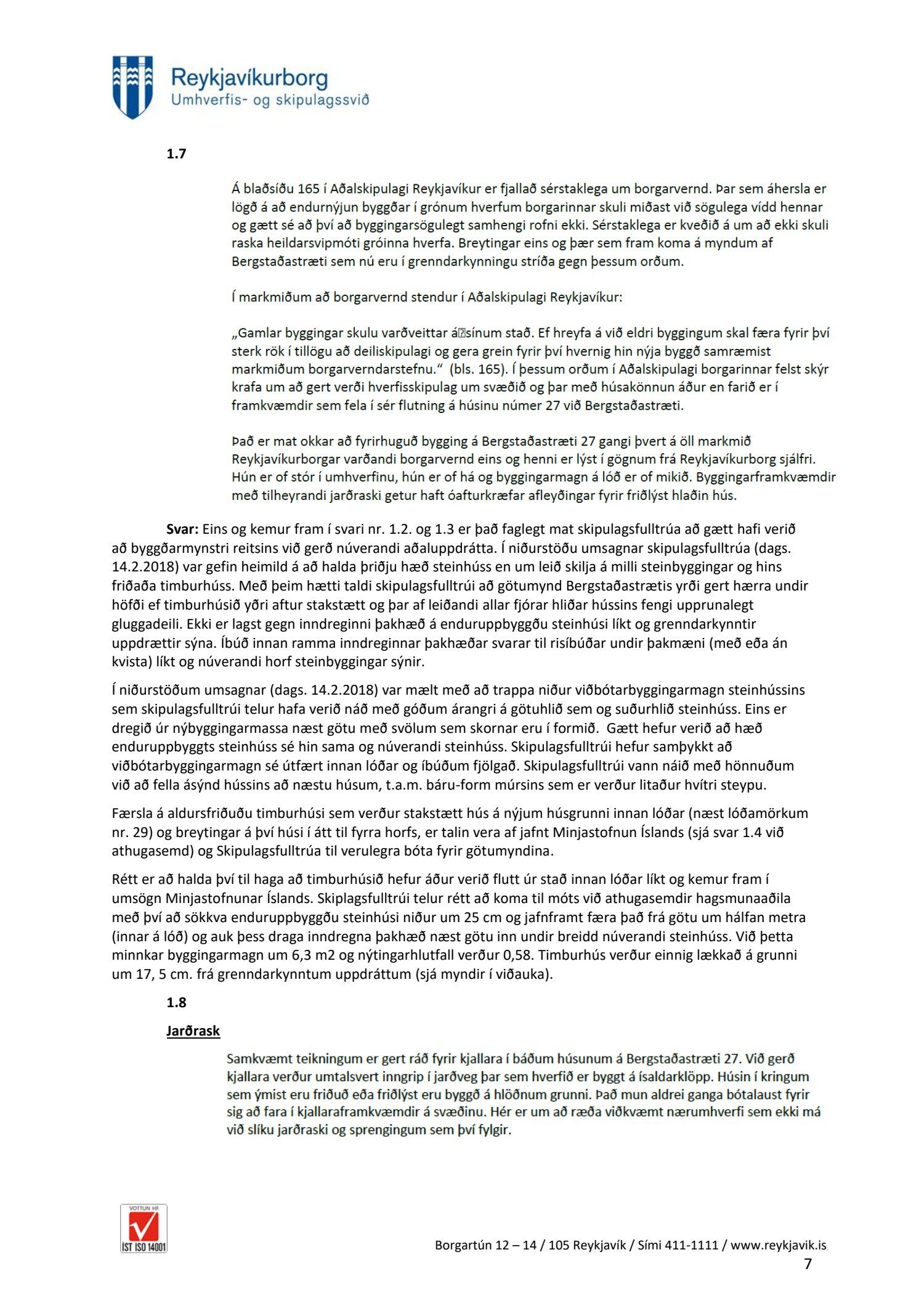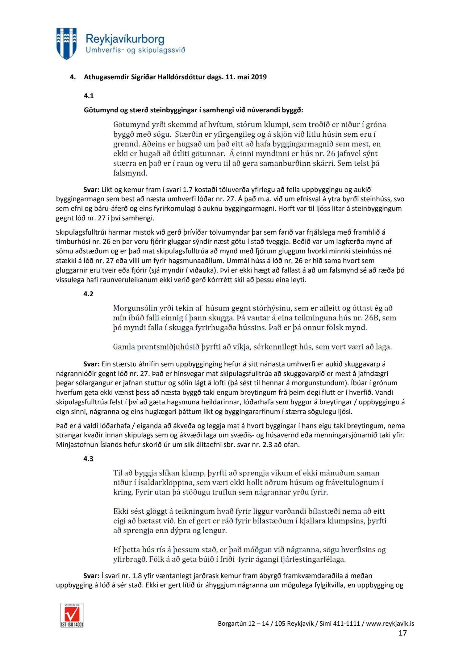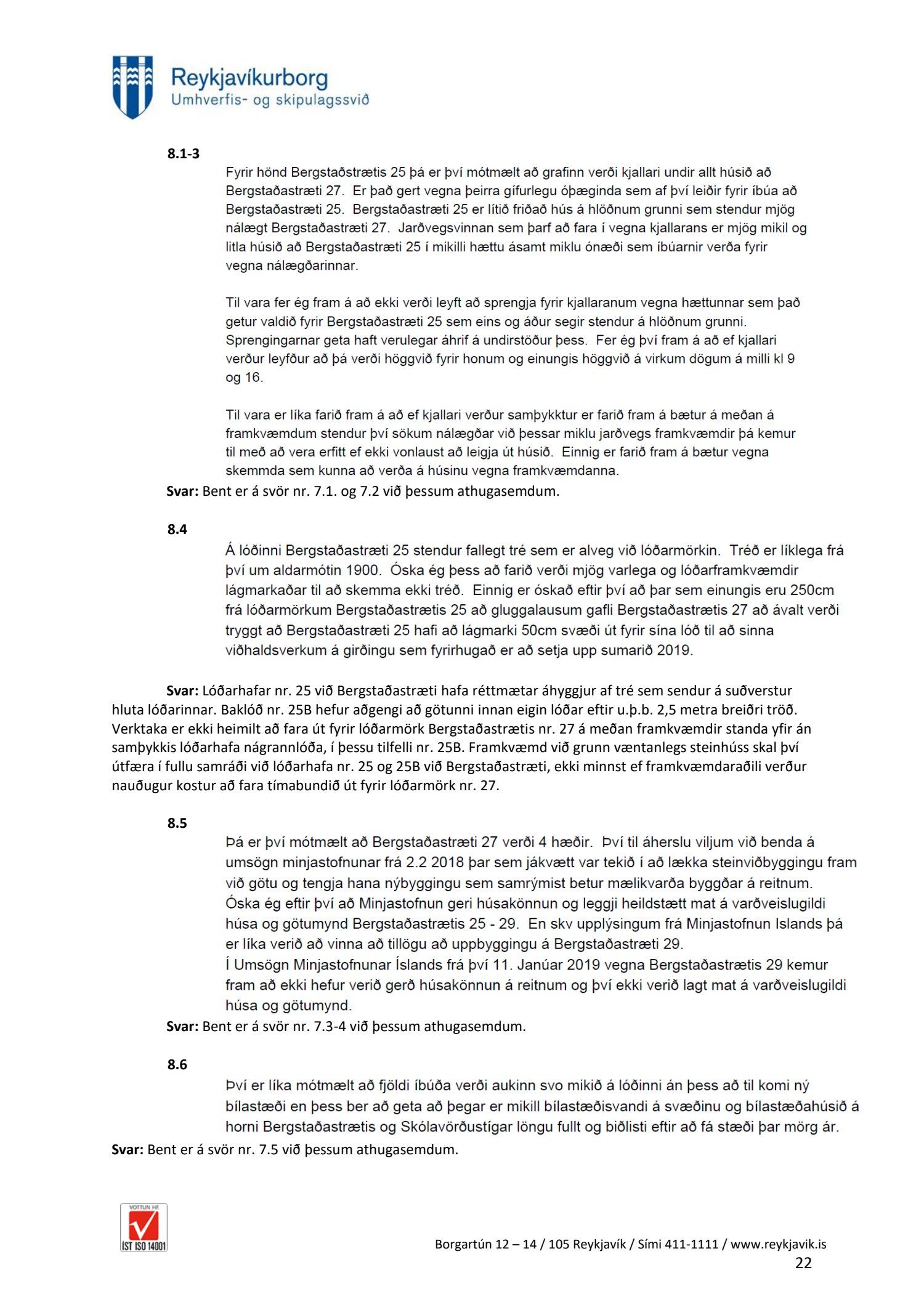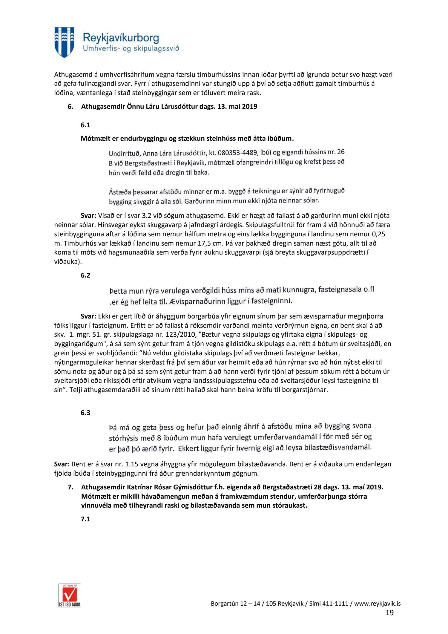 Erindi var grenndarkynnt frá 15. apríl 2019 til og með 13. maí 2019. Eftirtaldir aðilar sendu athugasemdir: Steinunn Sveinbjarnardóttir, Helga Völundardóttir, Mímir Völundarson og Lind Völundardóttir dags. 4. maí 2019, Guðrún Jarþrúður Baldvinsdóttir og Hildur Heimisdóttir dags. 5. maí 2019, Ásdís Thoroddsen dags. 11. maí 2019, Sigríður Halldórsdóttir dags. 11. maí 2019, Steinunn Stefánsdóttir dags. 12. maí 2019, Anna Lára Lárusdóttir dags. 13. maí 2019, Katrín Rós Gýmisdóttir f.h. eigenda að Bergstaðastræti 28 dags. 13. maí 2019, Katrín Rós Gýmisdóttir f.h. Ránarhóls ehf. dags. 13. maí 2019, Baldur Héðinsson og Anna Helga Jónsdóttir dags. 13. maí 2019 og Húseigendafélagið f.h. Telmu Huld Jóhannesdóttur dags. 13. maí 2019. Einnig er lögð fram umsögn skipulagsfulltrúa dags. 30. september 2019.