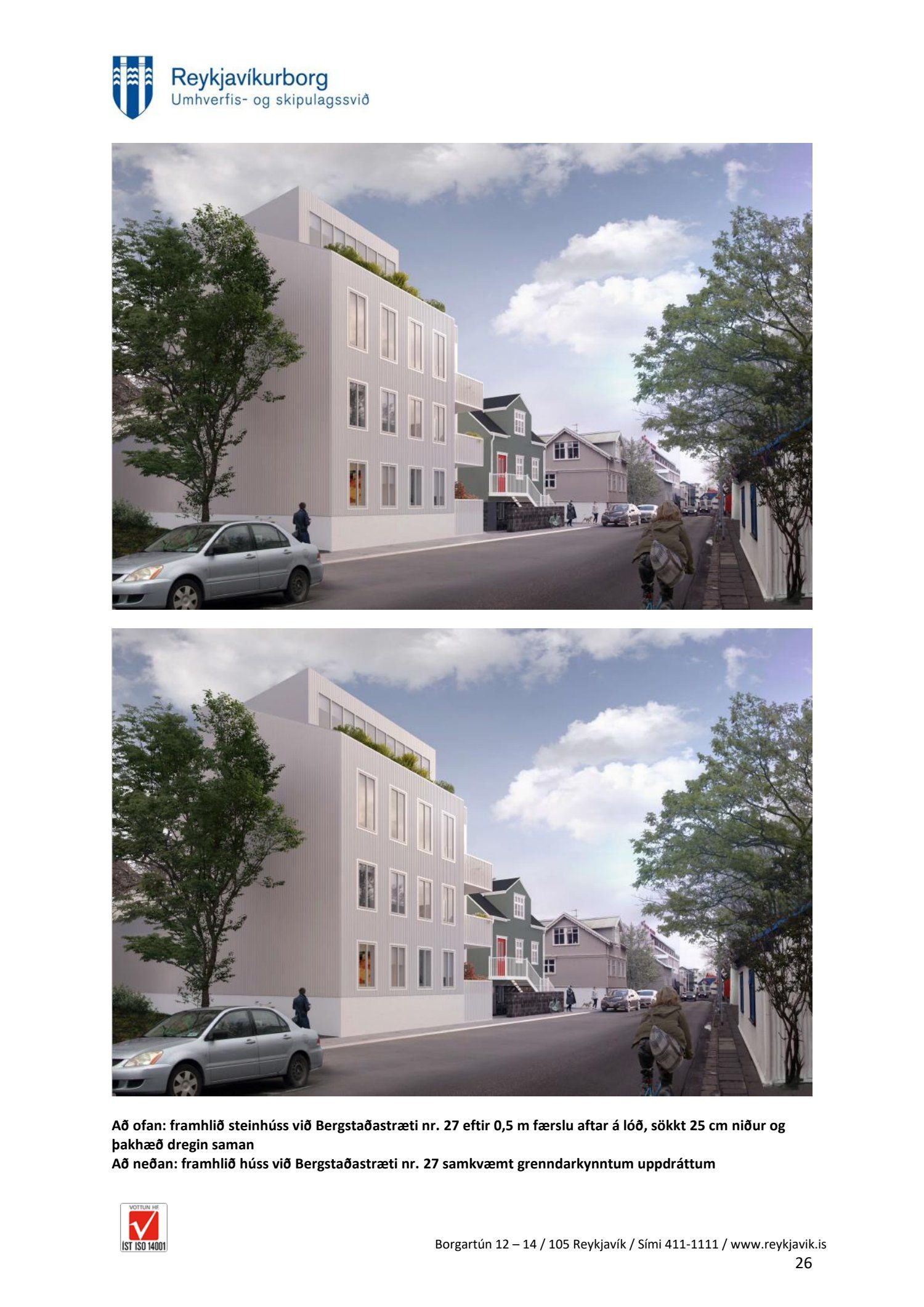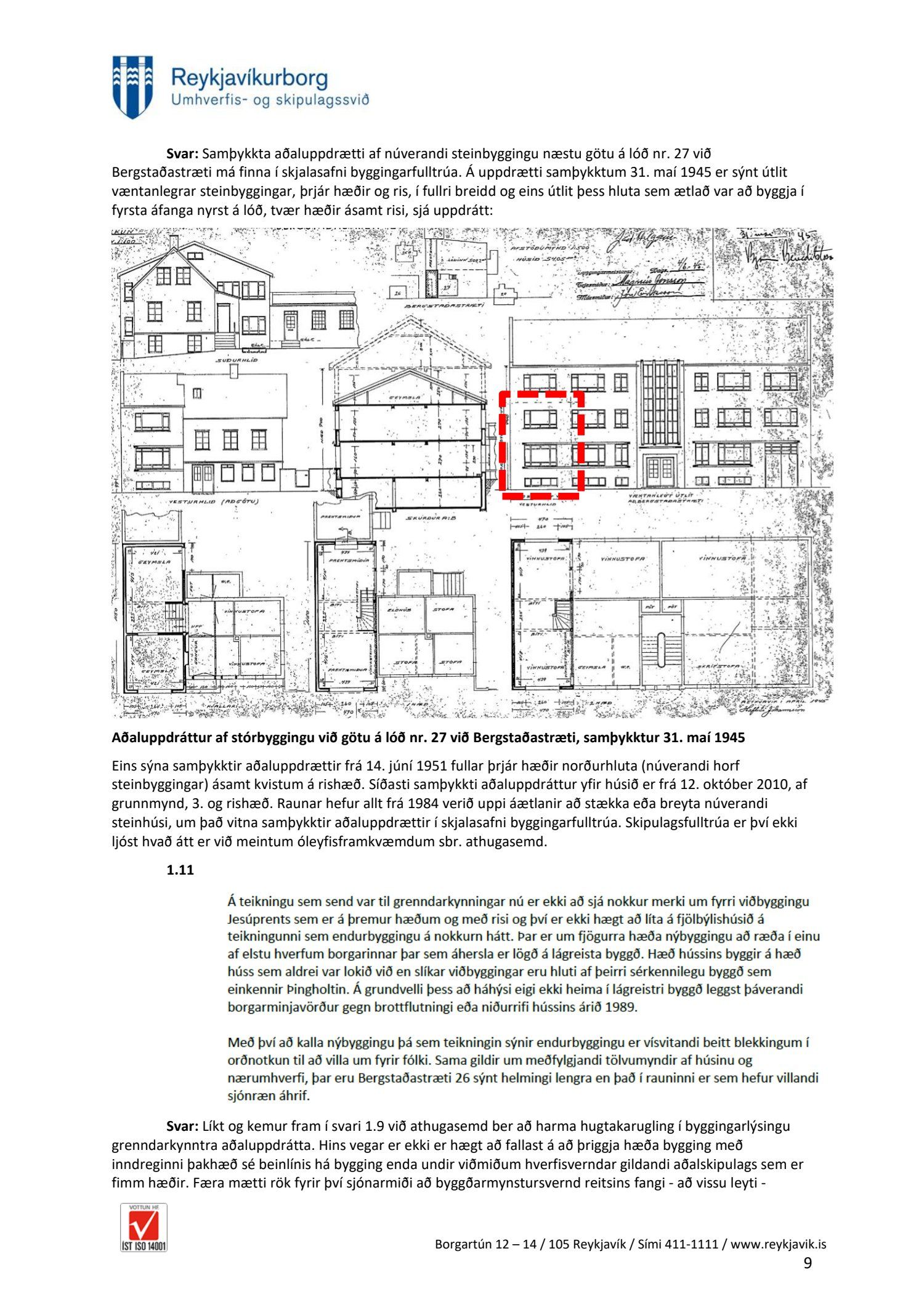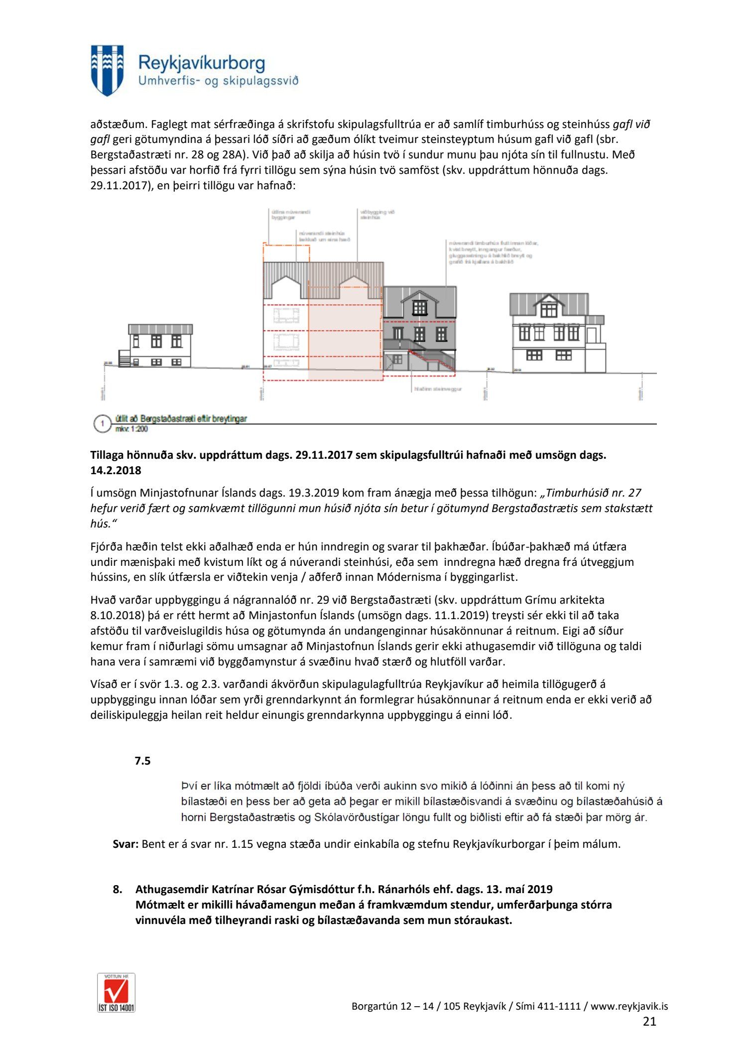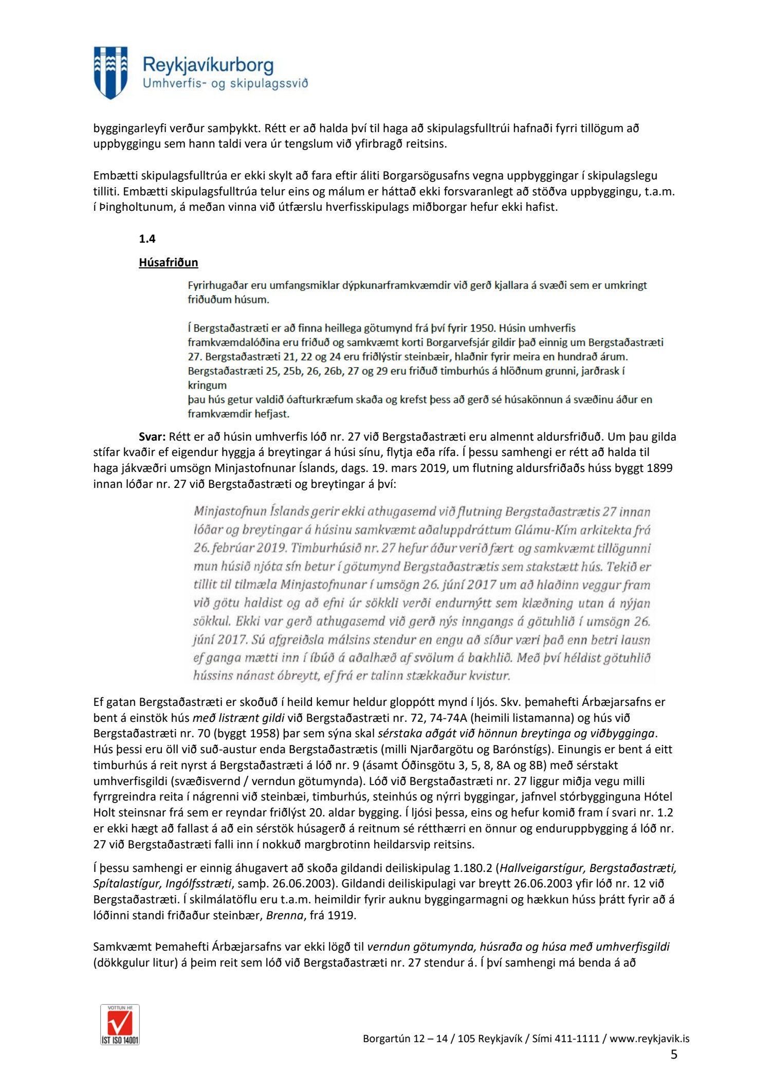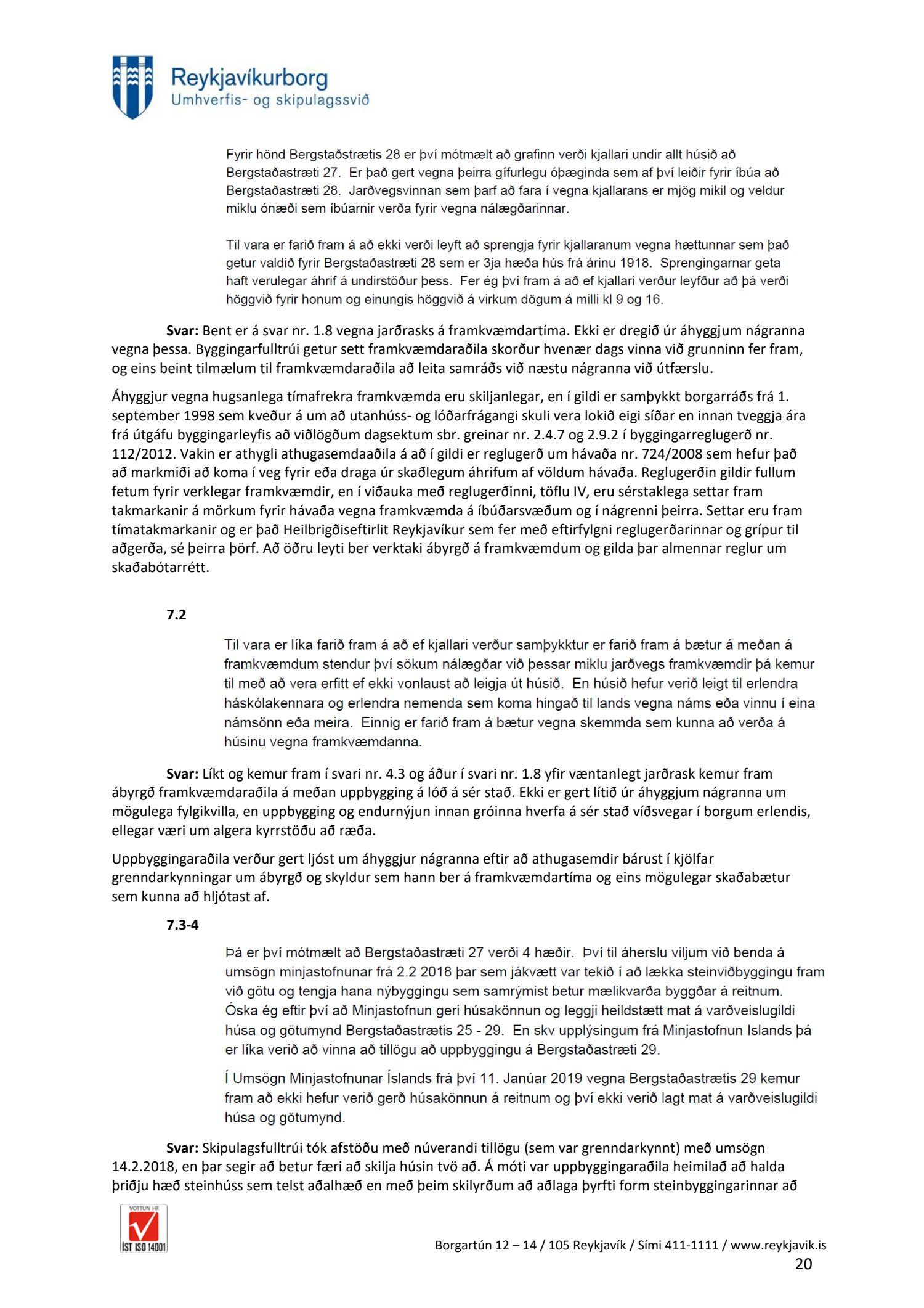 Erindi var grenndarkynnt frá 15. apríl 2019 til og með 13. maí 2019. Eftirtaldir aðilar sendu athugasemdir: Steinunn Sveinbjarnardóttir, Helga Völundardóttir, Mímir Völundarson og Lind Völundardóttir dags. 4. maí 2019, Guðrún Jarþrúður Baldvinsdóttir og Hildur Heimisdóttir dags. 5. maí 2019, Ásdís Thoroddsen dags. 11. maí 2019, Sigríður Halldórsdóttir dags. 11. maí 2019, Steinunn Stefánsdóttir dags. 12. maí 2019, Anna Lára Lárusdóttir dags. 13. maí 2019, Katrín Rós Gýmisdóttir f.h. eigenda að Bergstaðastræti 28 dags. 13. maí 2019, Katrín Rós Gýmisdóttir f.h. Ránarhóls ehf. dags. 13. maí 2019, Baldur Héðinsson og Anna Helga Jónsdóttir dags. 13. maí 2019 og Húseigendafélagið f.h. Telmu Huld Jóhannesdóttur dags. 13. maí 2019. Einnig er lögð fram umsögn skipulagsfulltrúa dags. 30. september 2019.