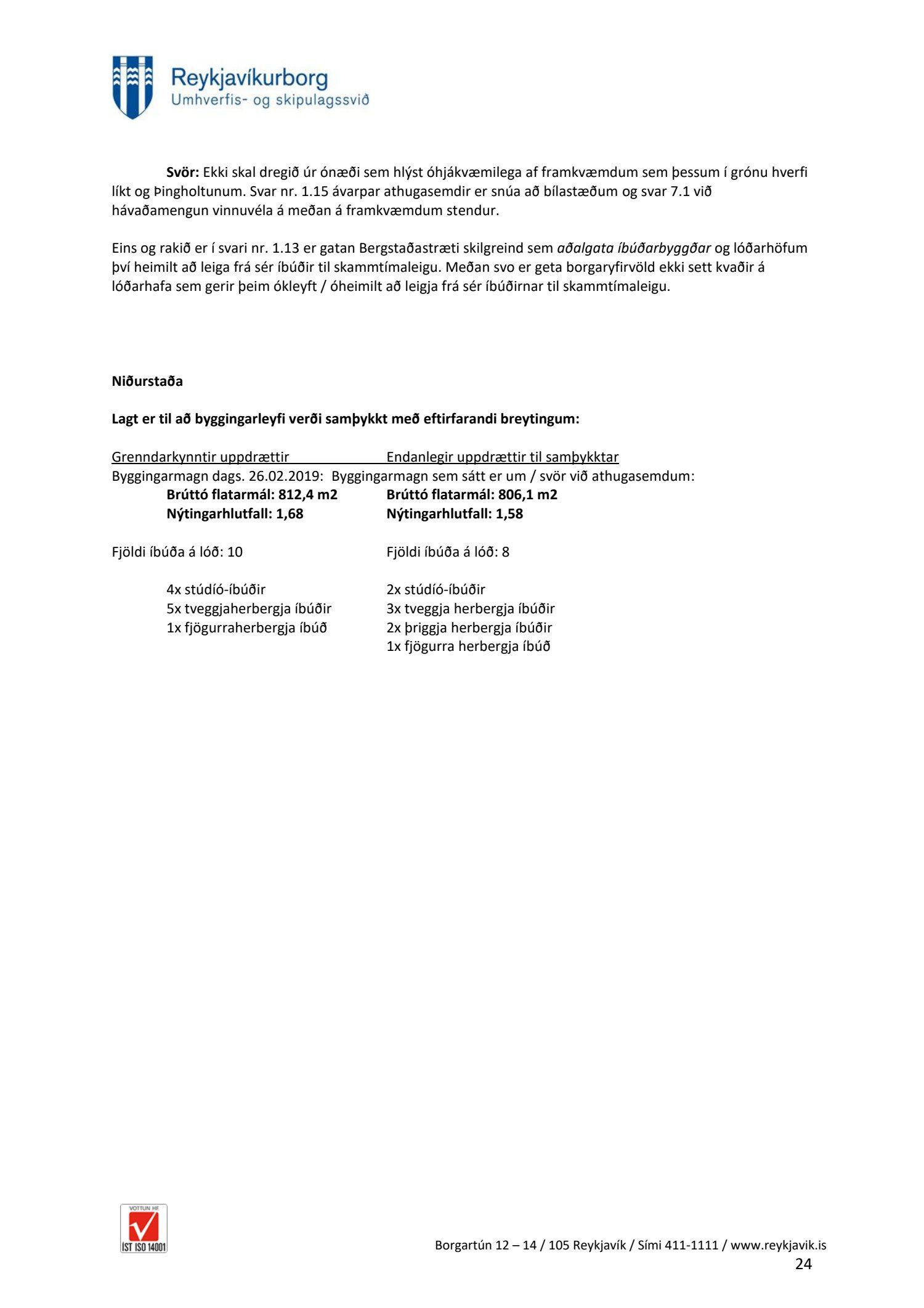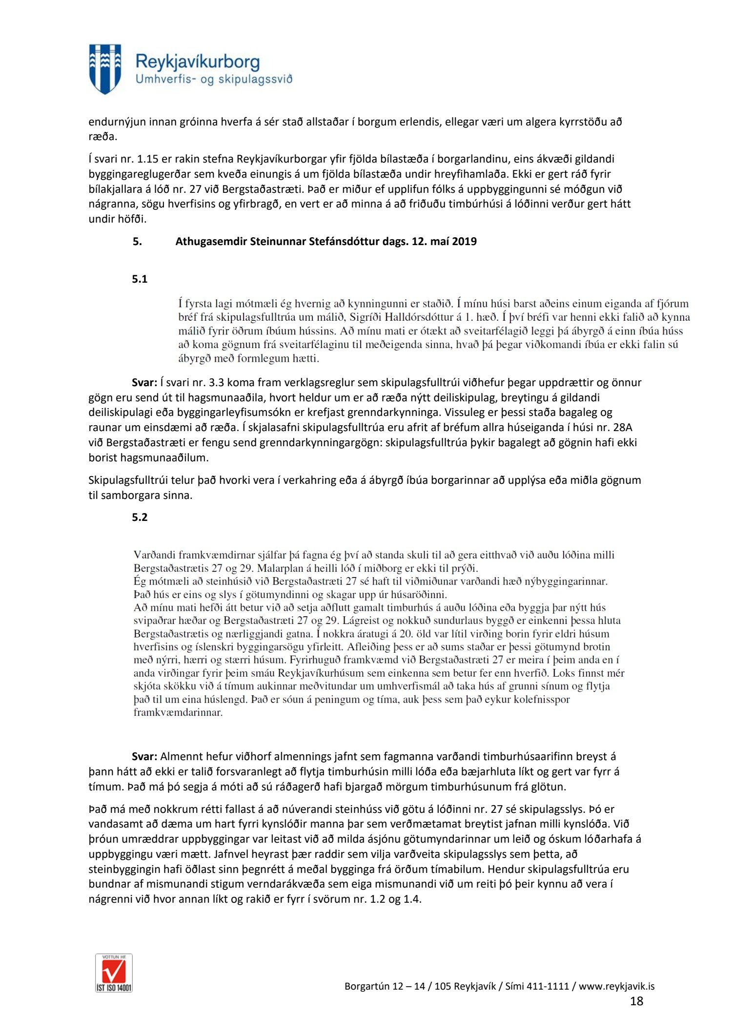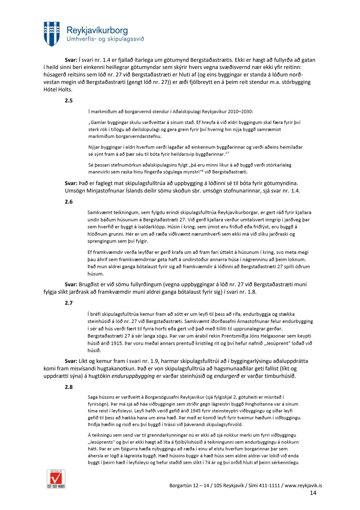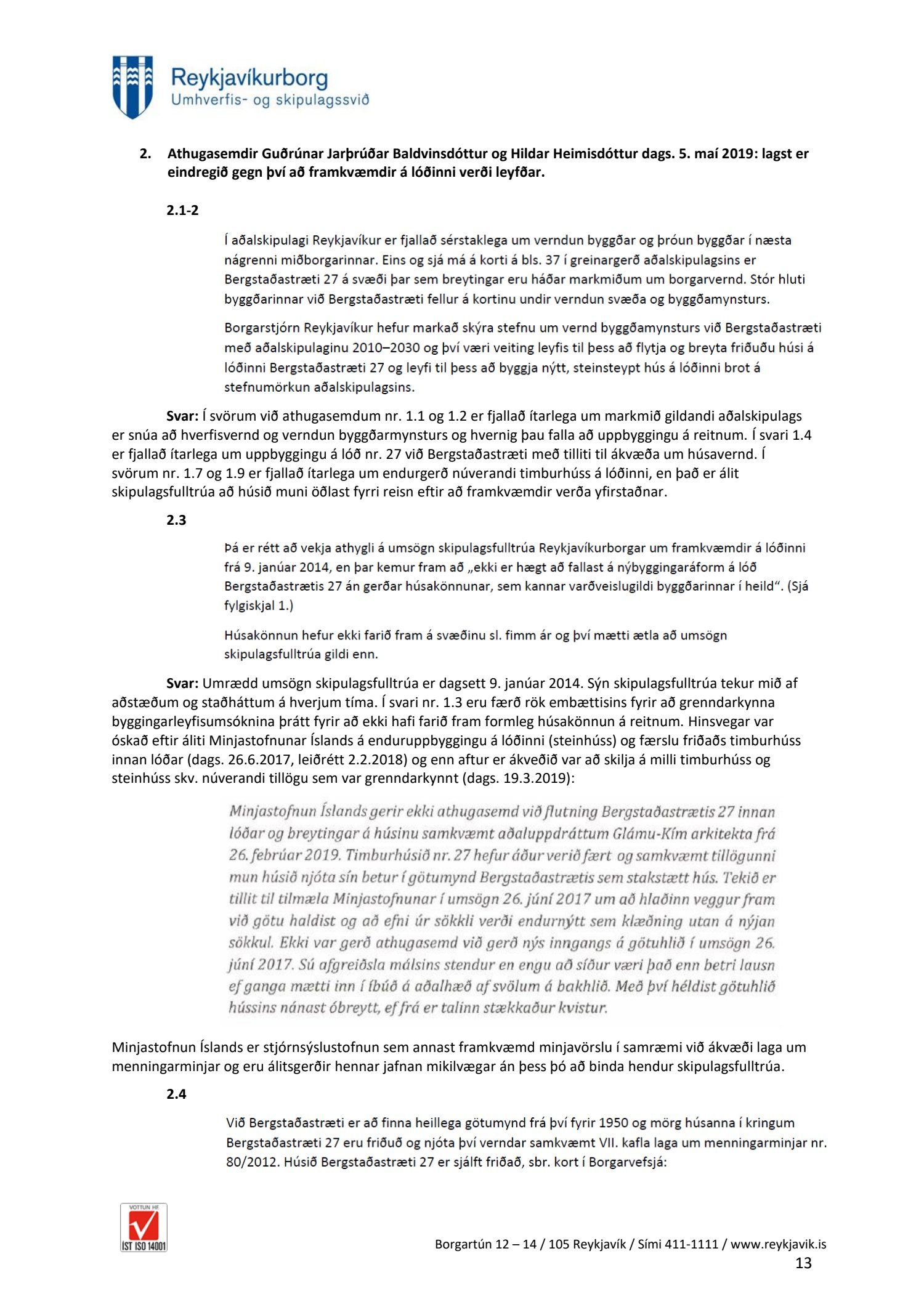 Erindi var grenndarkynnt frá 15. apríl 2019 til og með 13. maí 2019. Eftirtaldir aðilar sendu athugasemdir: Steinunn Sveinbjarnardóttir, Helga Völundardóttir, Mímir Völundarson og Lind Völundardóttir dags. 4. maí 2019, Guðrún Jarþrúður Baldvinsdóttir og Hildur Heimisdóttir dags. 5. maí 2019, Ásdís Thoroddsen dags. 11. maí 2019, Sigríður Halldórsdóttir dags. 11. maí 2019, Steinunn Stefánsdóttir dags. 12. maí 2019, Anna Lára Lárusdóttir dags. 13. maí 2019, Katrín Rós Gýmisdóttir f.h. eigenda að Bergstaðastræti 28 dags. 13. maí 2019, Katrín Rós Gýmisdóttir f.h. Ránarhóls ehf. dags. 13. maí 2019, Baldur Héðinsson og Anna Helga Jónsdóttir dags. 13. maí 2019 og Húseigendafélagið f.h. Telmu Huld Jóhannesdóttur dags. 13. maí 2019. Einnig er lögð fram umsögn skipulagsfulltrúa dags. 30. september 2019.