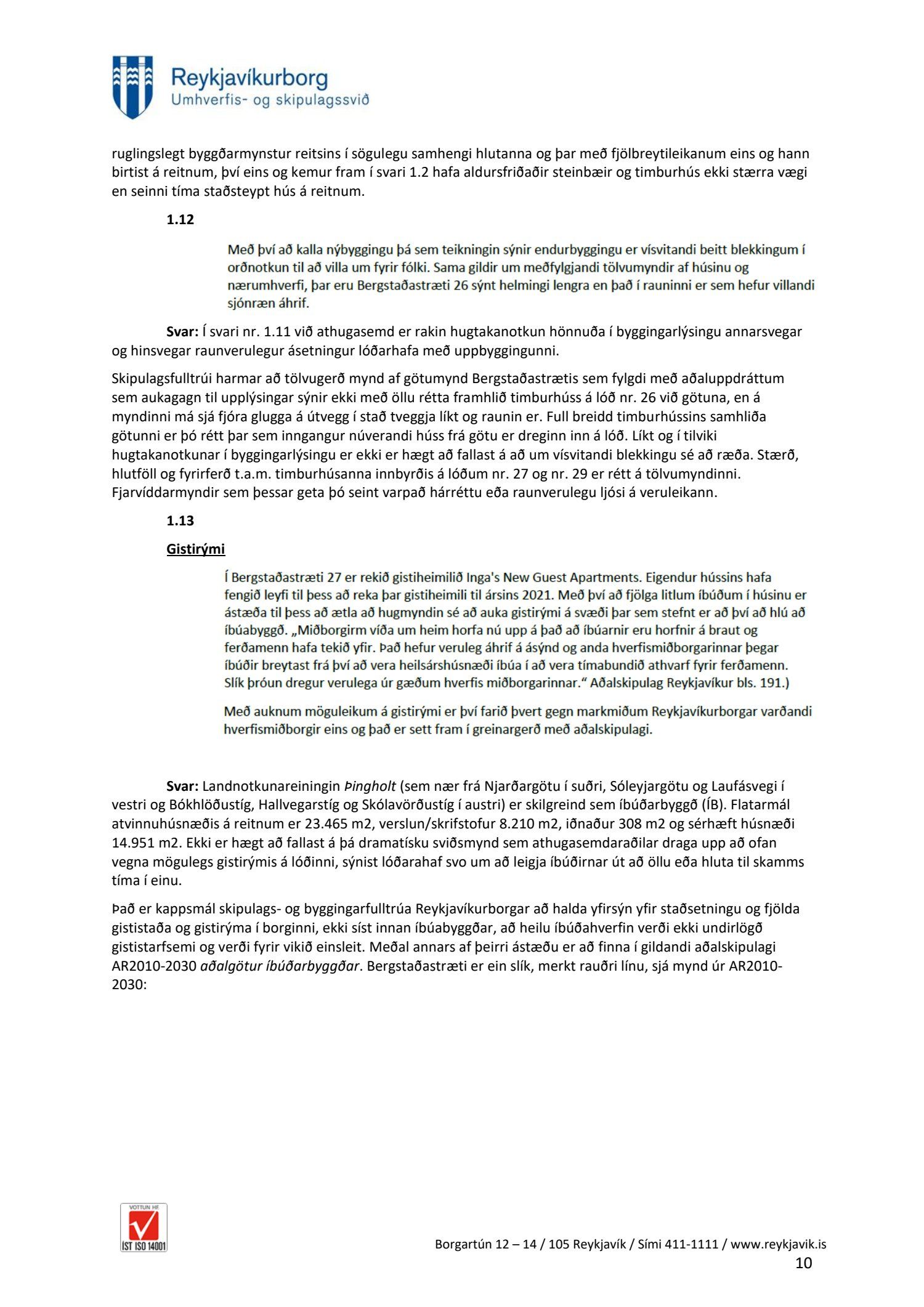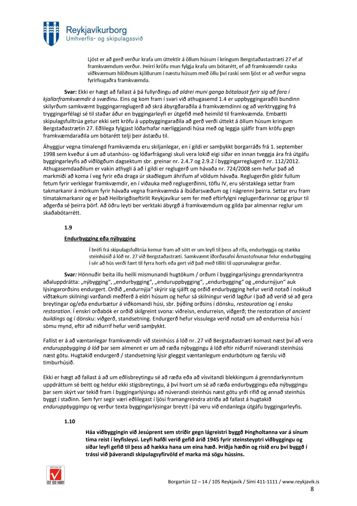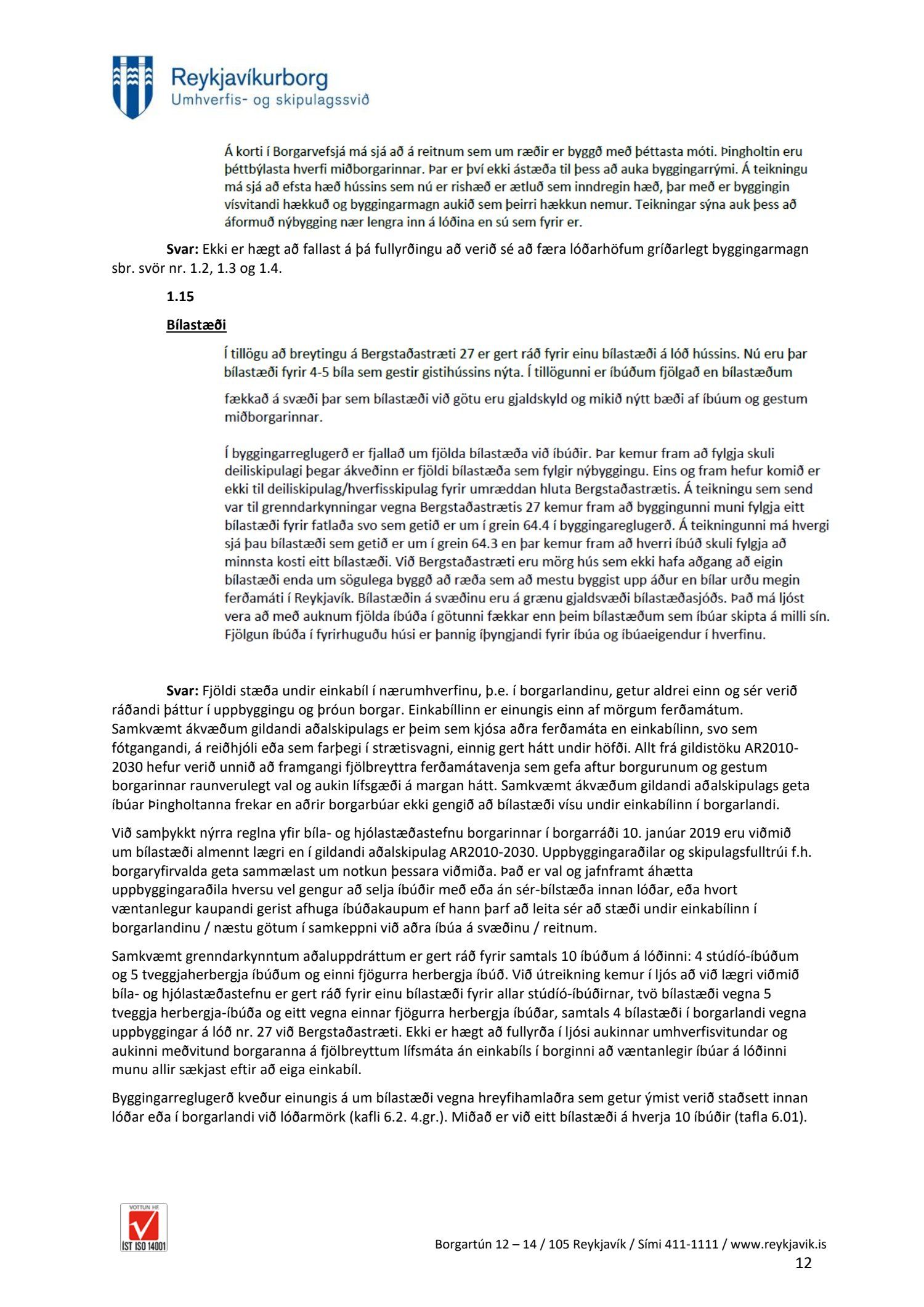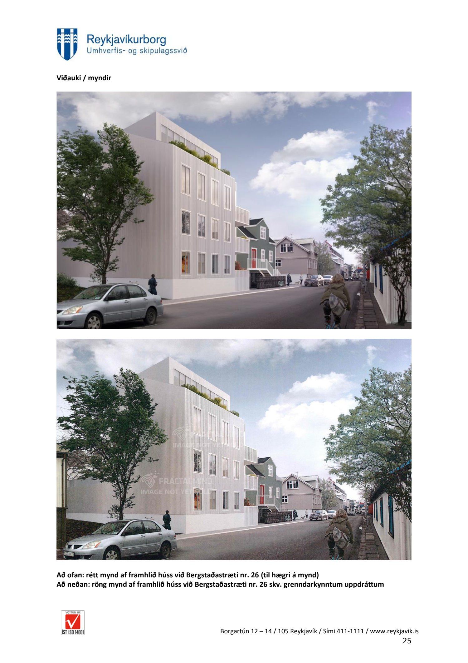 Erindi var grenndarkynnt frá 15. apríl 2019 til og með 13. maí 2019. Eftirtaldir aðilar sendu athugasemdir: Steinunn Sveinbjarnardóttir, Helga Völundardóttir, Mímir Völundarson og Lind Völundardóttir dags. 4. maí 2019, Guðrún Jarþrúður Baldvinsdóttir og Hildur Heimisdóttir dags. 5. maí 2019, Ásdís Thoroddsen dags. 11. maí 2019, Sigríður Halldórsdóttir dags. 11. maí 2019, Steinunn Stefánsdóttir dags. 12. maí 2019, Anna Lára Lárusdóttir dags. 13. maí 2019, Katrín Rós Gýmisdóttir f.h. eigenda að Bergstaðastræti 28 dags. 13. maí 2019, Katrín Rós Gýmisdóttir f.h. Ránarhóls ehf. dags. 13. maí 2019, Baldur Héðinsson og Anna Helga Jónsdóttir dags. 13. maí 2019 og Húseigendafélagið f.h. Telmu Huld Jóhannesdóttur dags. 13. maí 2019. Einnig er lögð fram umsögn skipulagsfulltrúa dags. 30. september 2019.