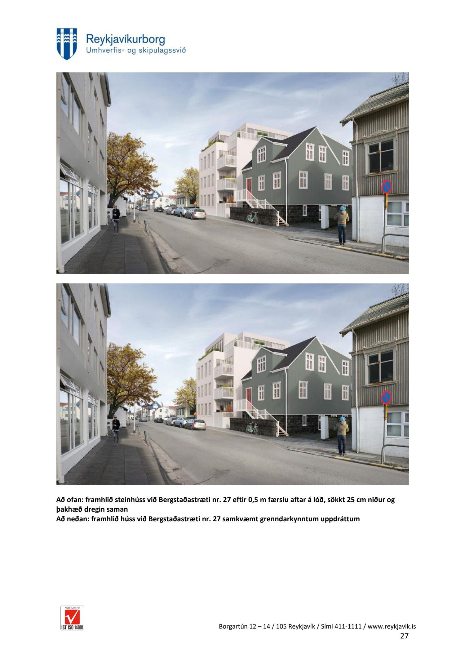 Að lokinni grenndarkynningu er lagt fram að nýju erindi frá afgreiðslufundi byggingarfulltrúa frá 5. mars 2019 þar sem sótt er um leyfi til að flytja friðað timburhús um lengd sína til suðurs á nýjan steinsteyptan kjallara, endurgera og innrétta tvær íbúðir og til að rífa, endurbyggja og stækka steinhús sem fyrir er á lóð og innrétta átta íbúðir á lóð nr. 27 við Bergstaðastræti, samkvæmt uppdráttum Glámu-Kím dags. 26. febrúar 2019. Einnig eru lagðir fram skýringaruppdrættir Glámu-Kím dags. 14. mars 2019.