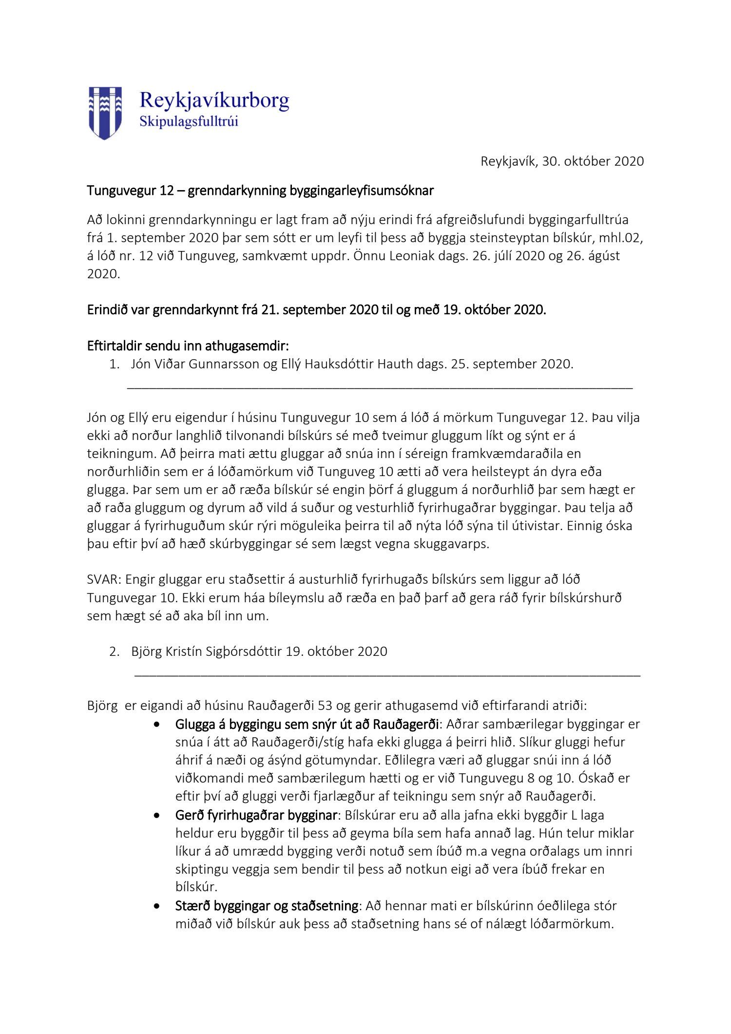 Að lokinni grenndarkynningu er lagt fram að nýju erindi þar sem sótt er um leyfi til þess að byggja steinsteyptan bílskúr, mhl.02, á lóð nr. 12 við Tunguveg, samkvæmt uppdr. Önnu Leoniak dags. 26. júlí 2020 og 26. ágúst 2020. Erindi var grenndarkynnt frá 21. september 2020 til og með 19. október 2020. Eftirtaldir sendu inn athugasemdir: Jón Viðar Gunnarsson og Ellý Hauksdóttir Hauth dags. 25. september 2020, Björg Kristín Sigþórsdóttir 19. október 2020 og Helgi Kristján Pálsson dags. 19. október 2020.