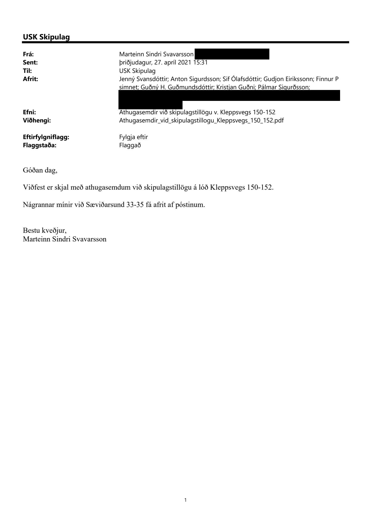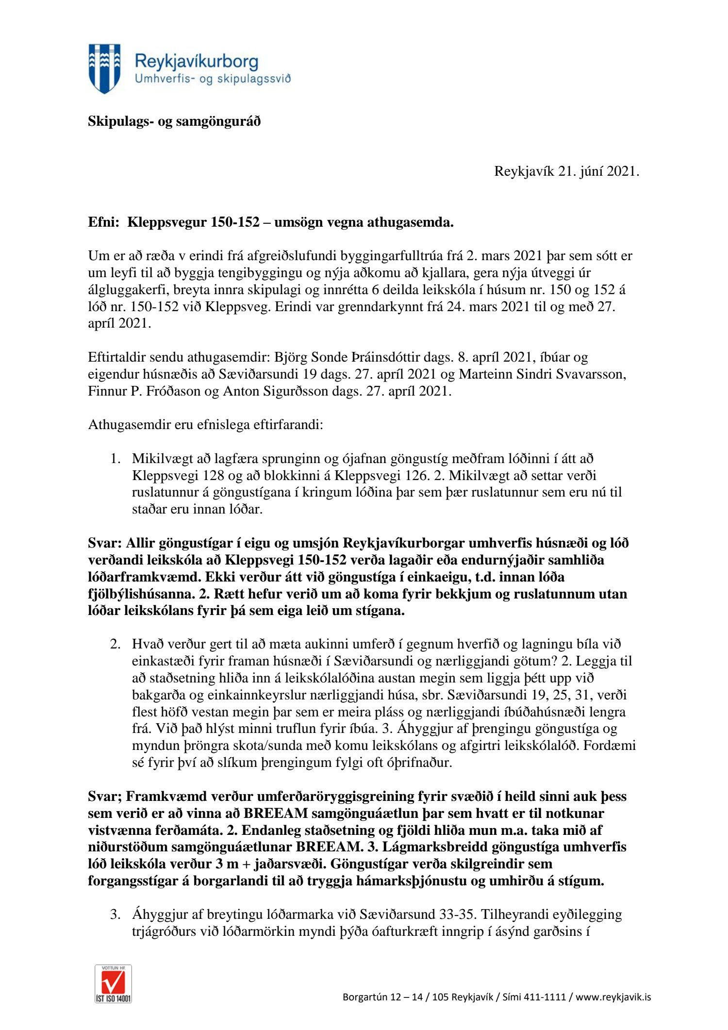 Að lokinni grenndarkynningu er lagt fram að erindi frá afgreiðslufundi byggingarfulltrúa frá 2. mars 2021 þar sem sótt er um leyfi til að byggja tengibyggingu og nýja aðkomu að kjallara, gera nýja útveggi úr álgluggakerfi, breyta innra skipulagi og innrétta 6 deilda leikskóla í húsum nr. 150 og 152 á lóð nr. 150-152 við Kleppsveg. Erindi var grenndarkynnt frá 24. mars 2021 til og með 27. apríl 2021. Eftirtaldir sendu athugasemdir: Björg Sonde Þráinsdóttir dags. 8. apríl 2021, íbúar og eigendur húsnæðis að Sæviðarsundi 19 dags. 27. apríl 2021 og Marteinn Sindri Svavarsson, Finnur P. Fróðason og Anton Sigurðsson dags. 27. apríl 2021. Einnig er lögð fram umsögn skipulagsfulltrúa dags. 21. júní 2021.
