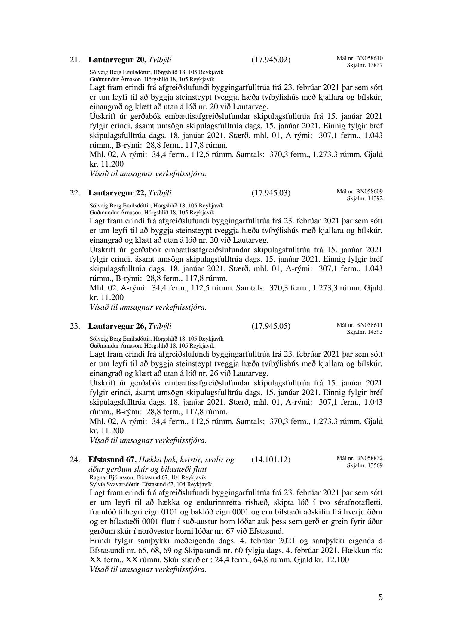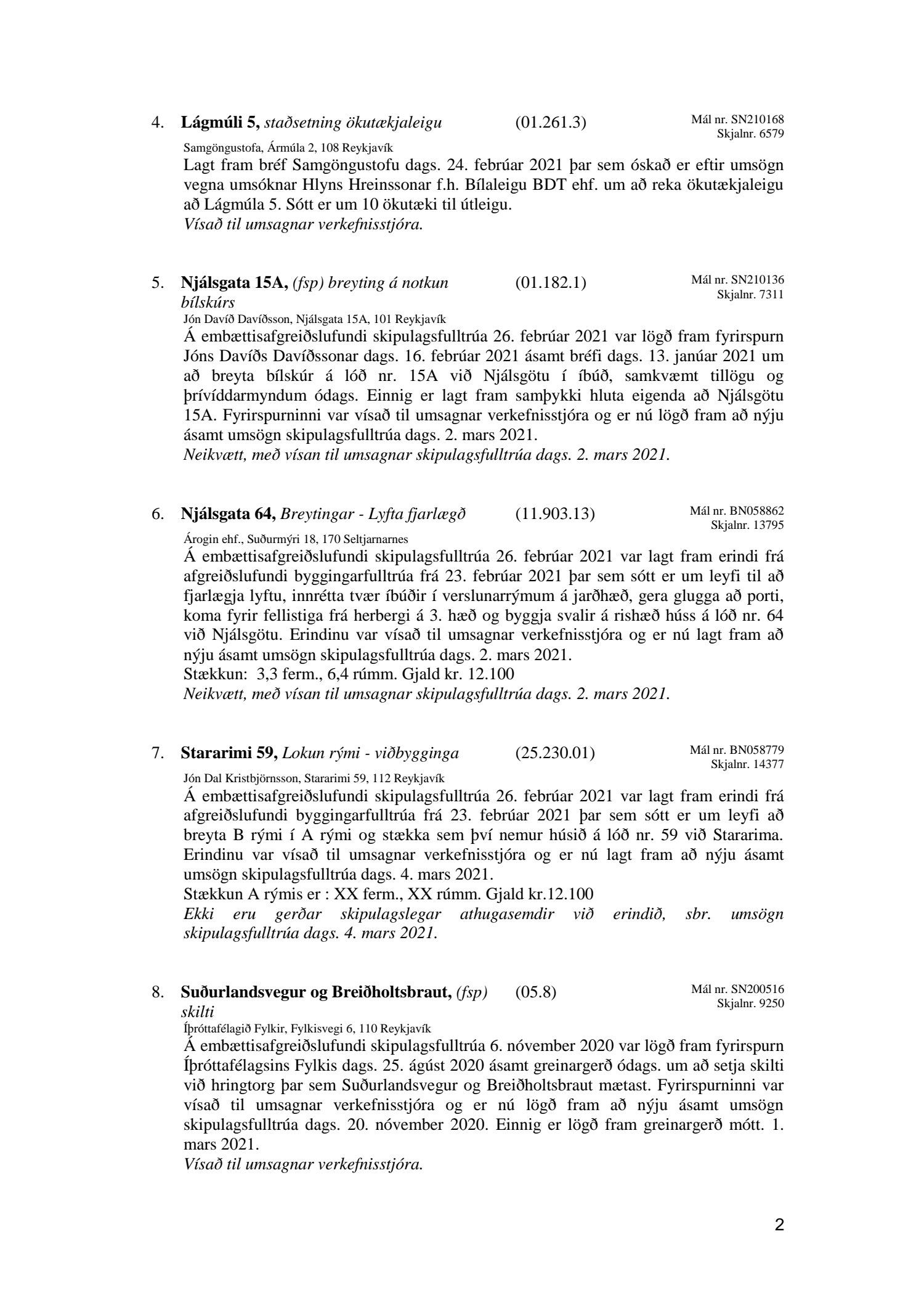 Lagðar fram fundargerðir embættisafgreiðslufunda skipulagsfulltrúa frá 26. febrúar 2021 og 5. mars 2021.