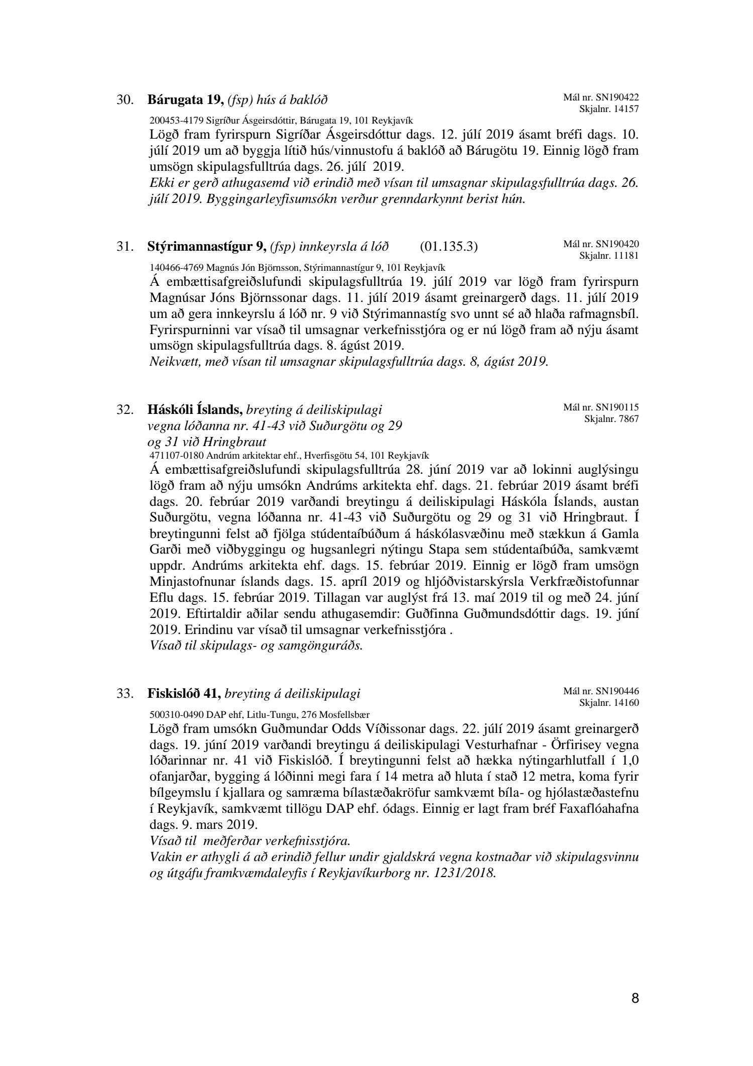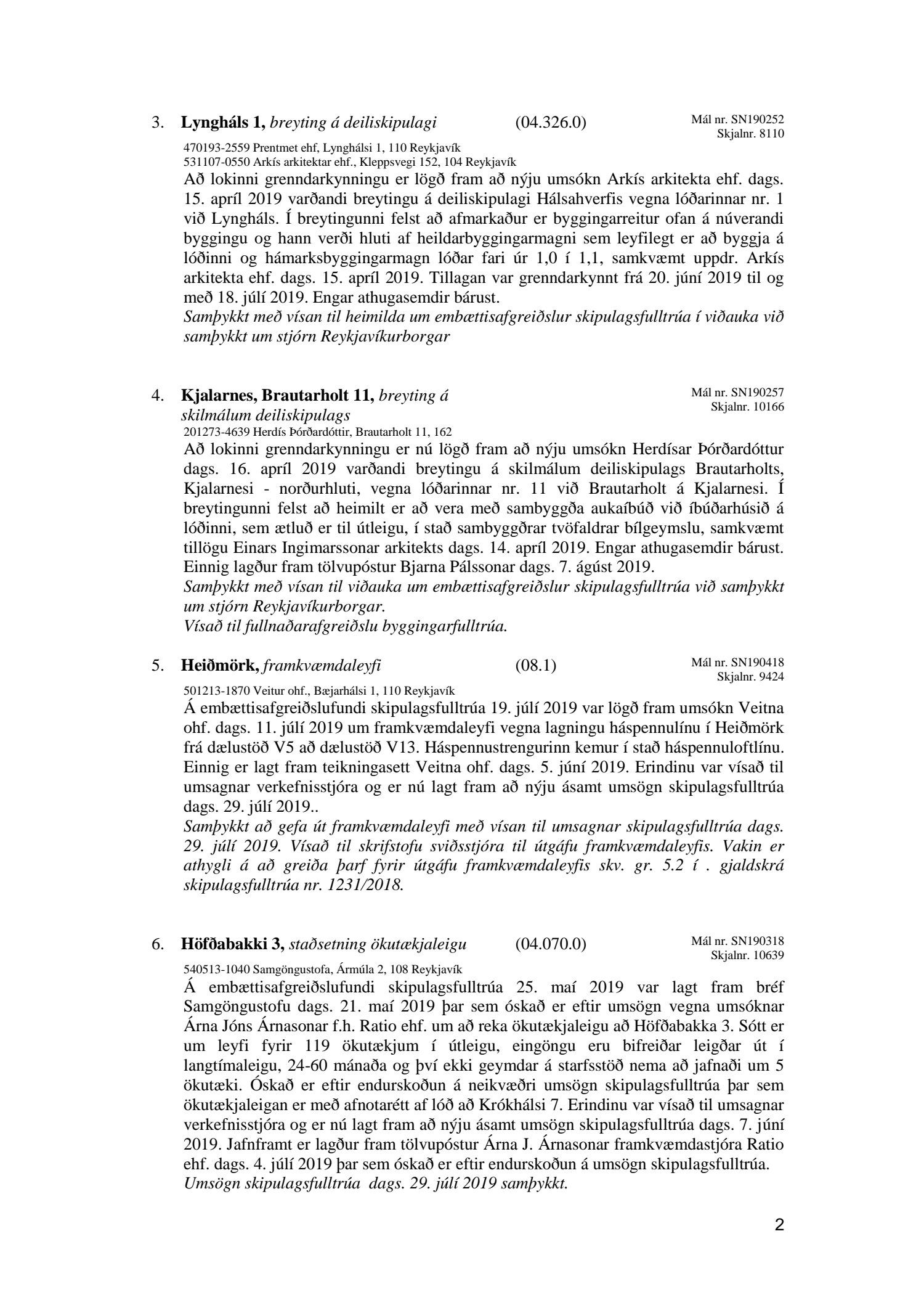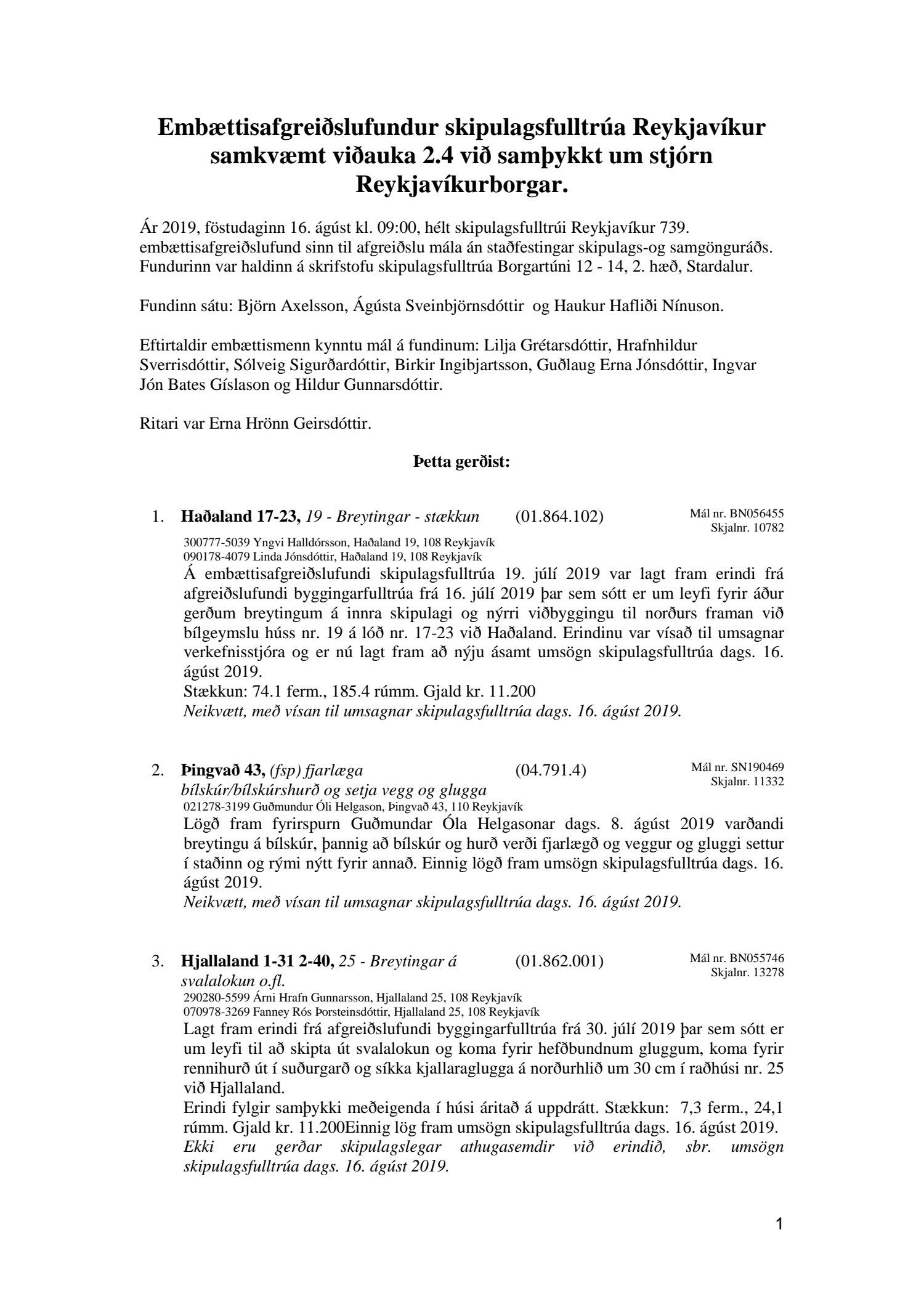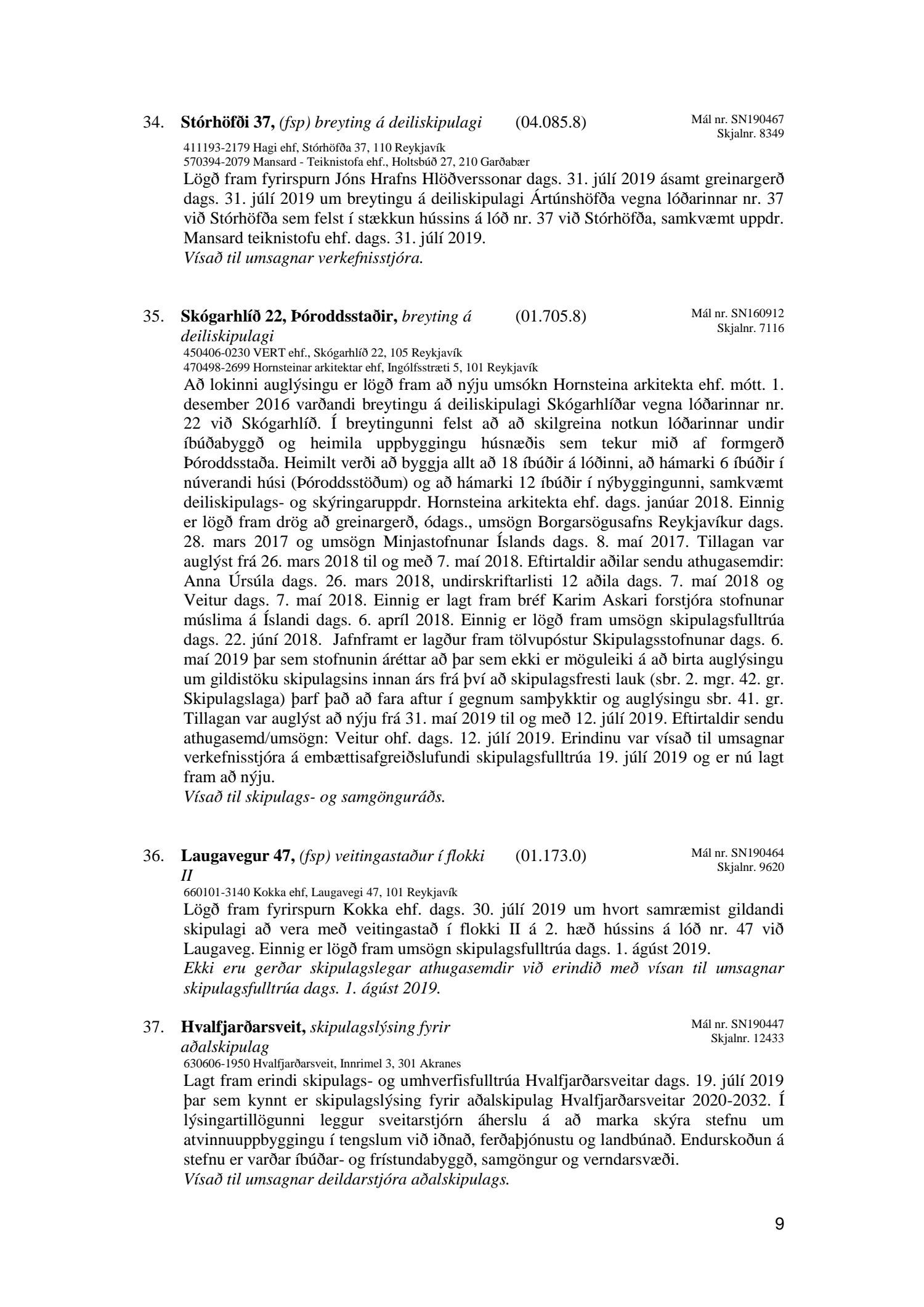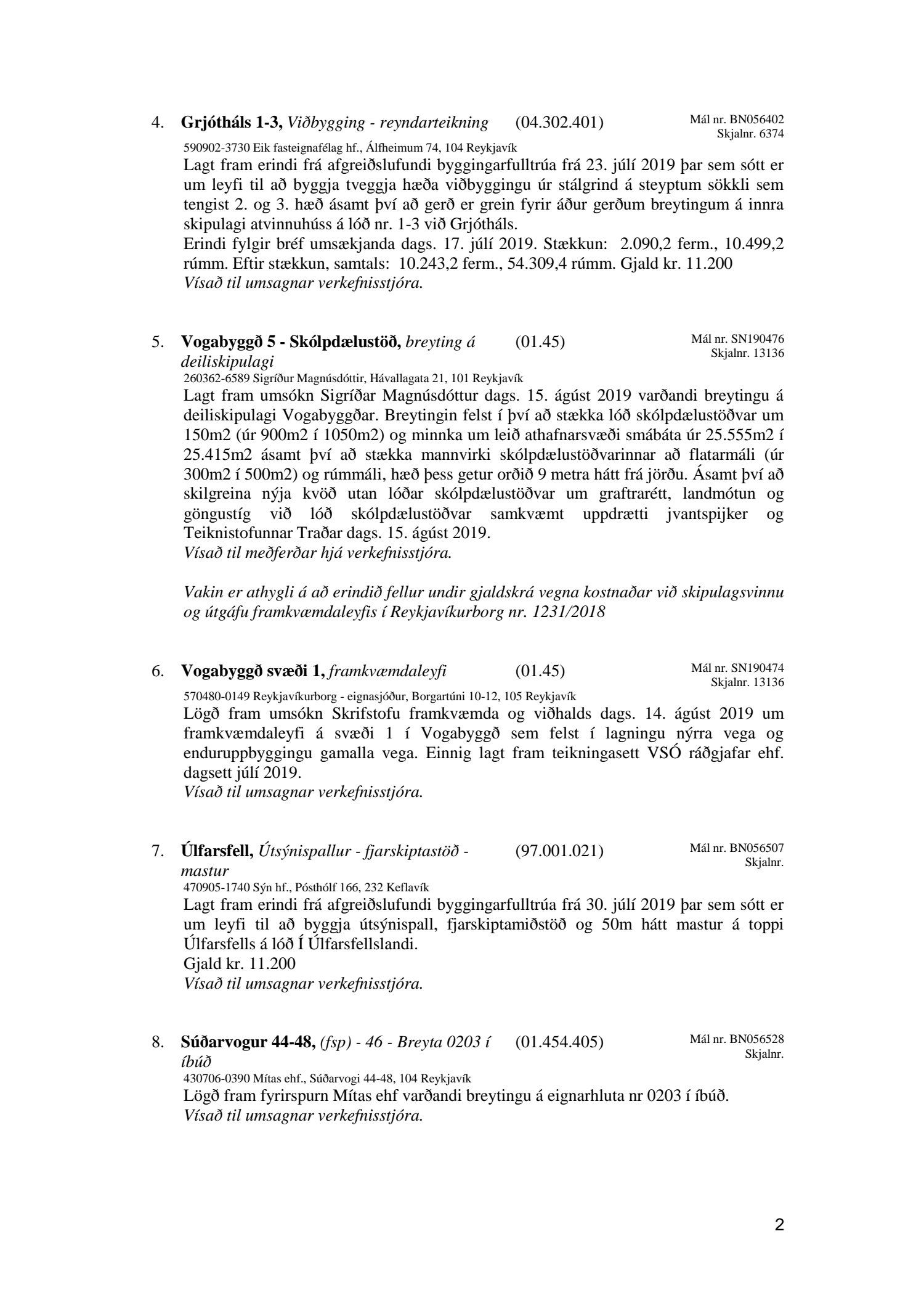 Bókun vegna liðs nr.1 – Fundargerð Skipulagsfulltrúa frá 9.ágúst 2019, liður 7.Úlfarsfell Fulltrúi Miðflokksins leggst alfarið gegn fyrirhuguðum framkvæmdum á einum vinsælasta útsýnisstað borgarinnar og vísar í fyrri bókanir vegna málsins. Eftirtekt vekur hversu hart Reykjavíkurborg hefur gengið fram í þessu máli þvert gegn vilja íbúa Úlfarsárdals,Grafarholts sem og íbúa borgarinnar almennt. 50m hátt stálmastur hlaðið tækjabúnaði og allt það fargan sem því fylgir skal nú reist, þvert gegn vilja íbúa. Fyrir liggur að hér er um að ræða hagsmuni einkafyritækis, ekki íbúa. Fyrir liggur að Úlfarsfell er EKKI talinn besti kostur, þar trónir efst á lista Þverfellshorn í Esju og Bláfjöll,þar sem fyrir er sendir frá öðru fyrirtæki, þykir og góður kostur. Það er því alvarlegt mál að því fullyrt sé að þetta sé eina færa leiðin. Fjöldi athugasemda í kjölfar auglýsingar téðs deiliskipulags var slíkur að elstu menn muna ekki annað eins. Það er tillaga Miðflokksins að þessari aðför að ljúki hér og sú gríðarlega andstaða sem fram kemur í aðsendum athugasemdum í kjölfar auglýsingar um fyrirhugaðar framkvæmdir verði virt. Tilgangurinn með auglýsingum af þessu tagi, er að fá fram vilja borgaranna og hann er skýr: Nei takk. Jafnframt mælist undirritaður til þess að núverandi óleyfisbúnaður verði fjarlægður tafarlaust.