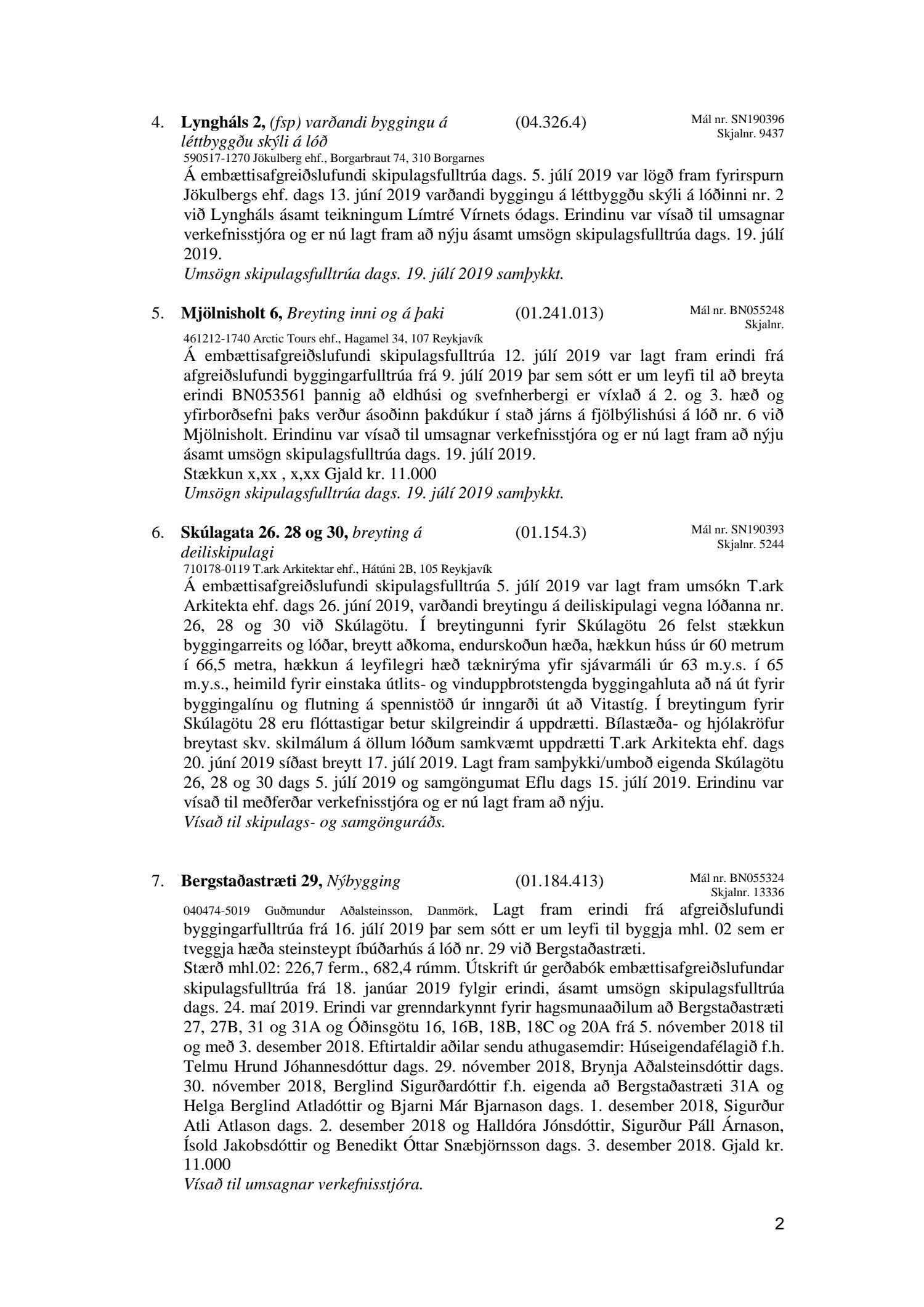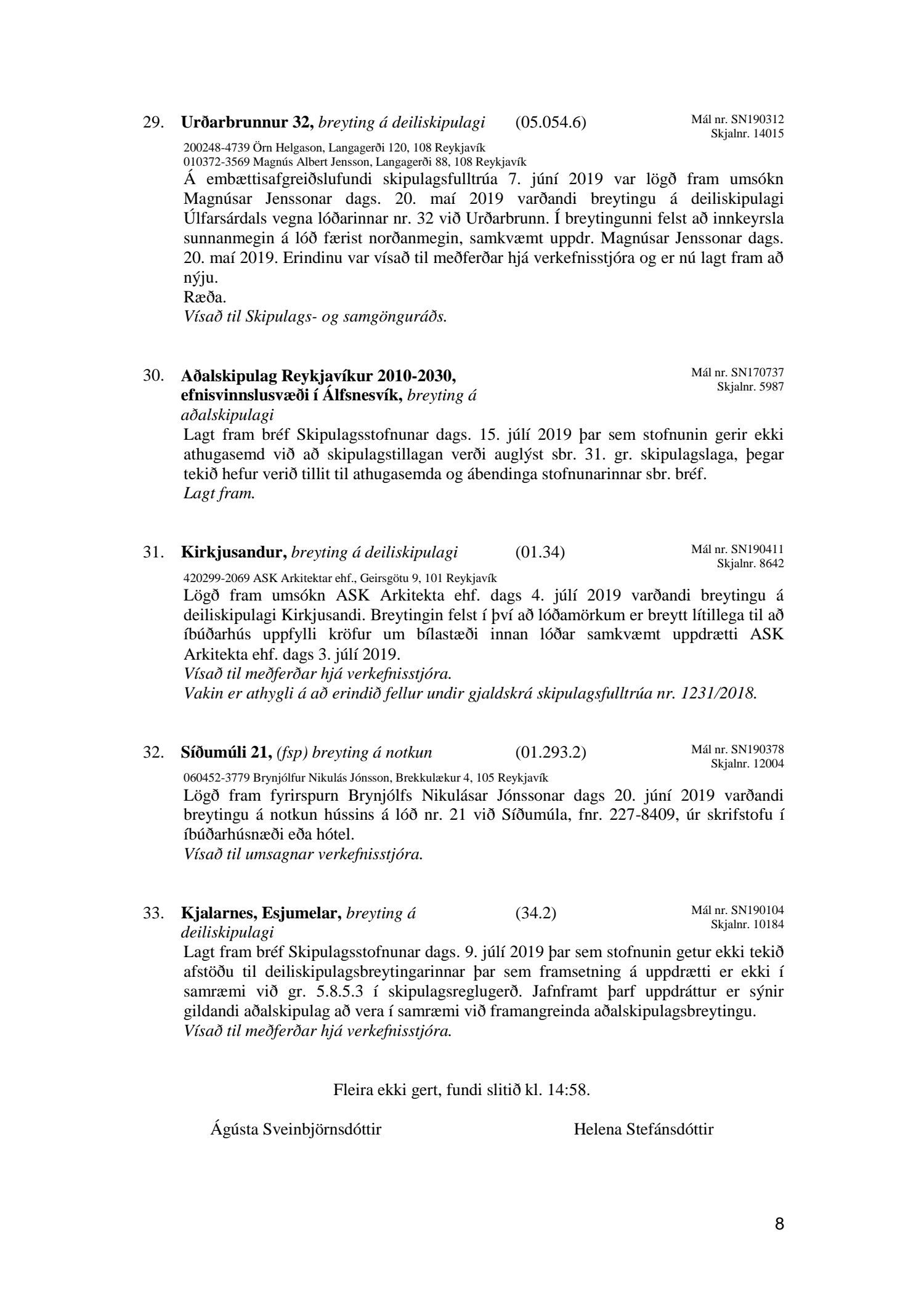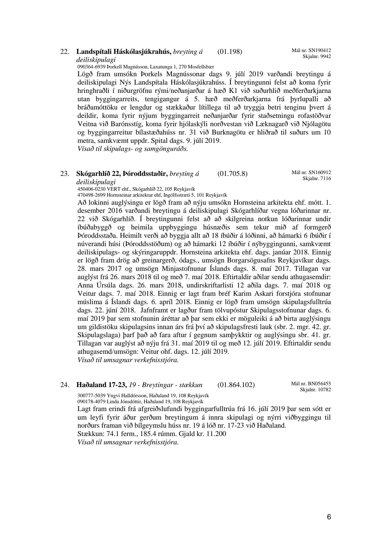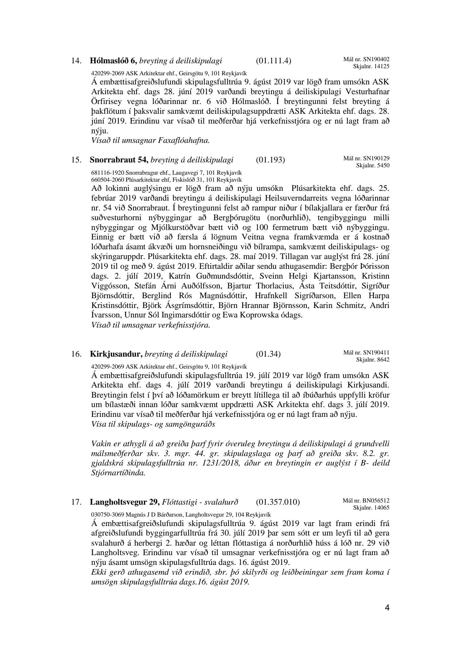 Bókun vegna liðs nr.1 – Fundargerð Skipulagsfulltrúa frá 9.ágúst 2019, liður 7.Úlfarsfell Fulltrúi Miðflokksins leggst alfarið gegn fyrirhuguðum framkvæmdum á einum vinsælasta útsýnisstað borgarinnar og vísar í fyrri bókanir vegna málsins. Eftirtekt vekur hversu hart Reykjavíkurborg hefur gengið fram í þessu máli þvert gegn vilja íbúa Úlfarsárdals,Grafarholts sem og íbúa borgarinnar almennt. 50m hátt stálmastur hlaðið tækjabúnaði og allt það fargan sem því fylgir skal nú reist, þvert gegn vilja íbúa. Fyrir liggur að hér er um að ræða hagsmuni einkafyritækis, ekki íbúa. Fyrir liggur að Úlfarsfell er EKKI talinn besti kostur, þar trónir efst á lista Þverfellshorn í Esju og Bláfjöll,þar sem fyrir er sendir frá öðru fyrirtæki, þykir og góður kostur. Það er því alvarlegt mál að því fullyrt sé að þetta sé eina færa leiðin. Fjöldi athugasemda í kjölfar auglýsingar téðs deiliskipulags var slíkur að elstu menn muna ekki annað eins. Það er tillaga Miðflokksins að þessari aðför að ljúki hér og sú gríðarlega andstaða sem fram kemur í aðsendum athugasemdum í kjölfar auglýsingar um fyrirhugaðar framkvæmdir verði virt. Tilgangurinn með auglýsingum af þessu tagi, er að fá fram vilja borgaranna og hann er skýr: Nei takk. Jafnframt mælist undirritaður til þess að núverandi óleyfisbúnaður verði fjarlægður tafarlaust.
