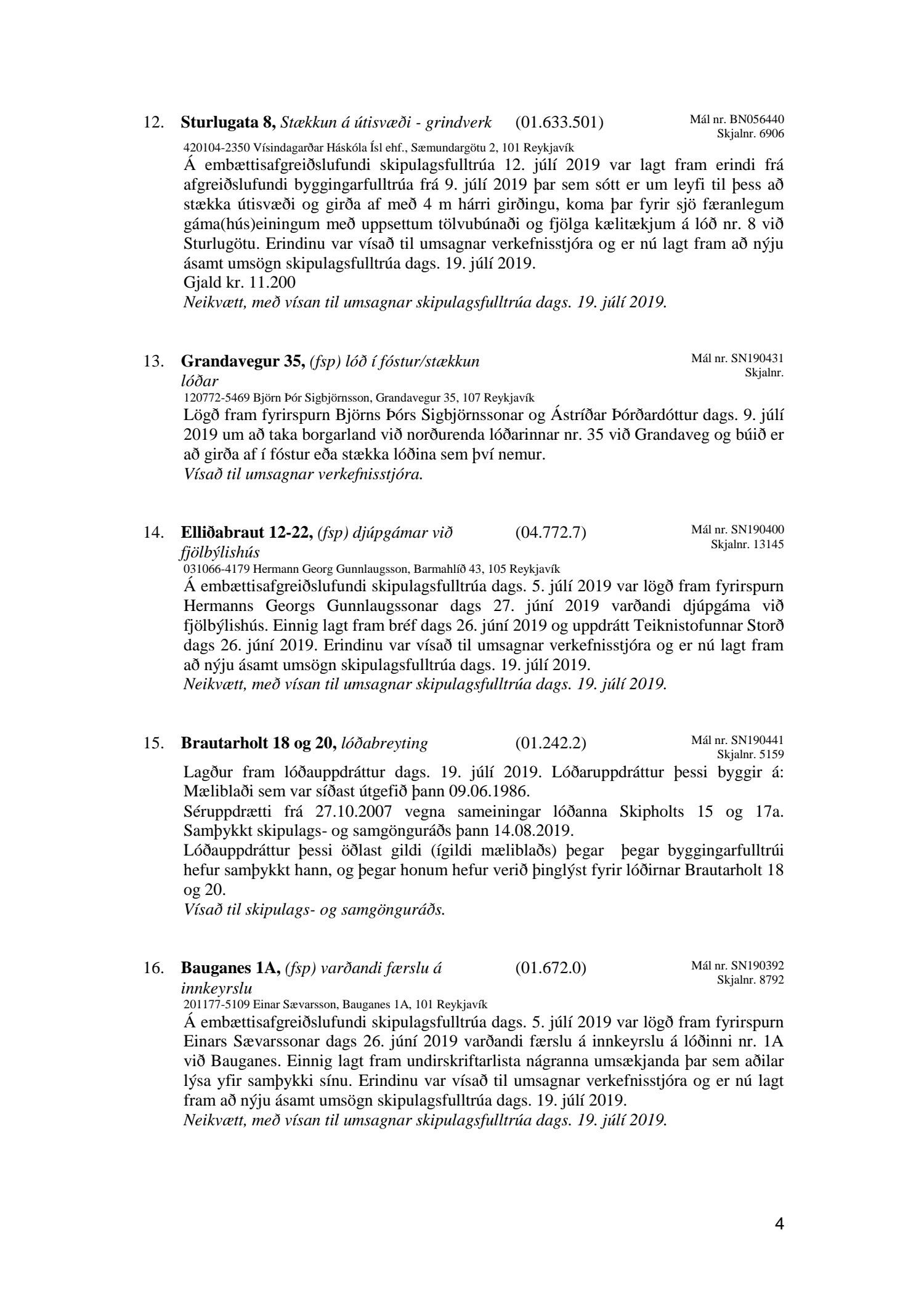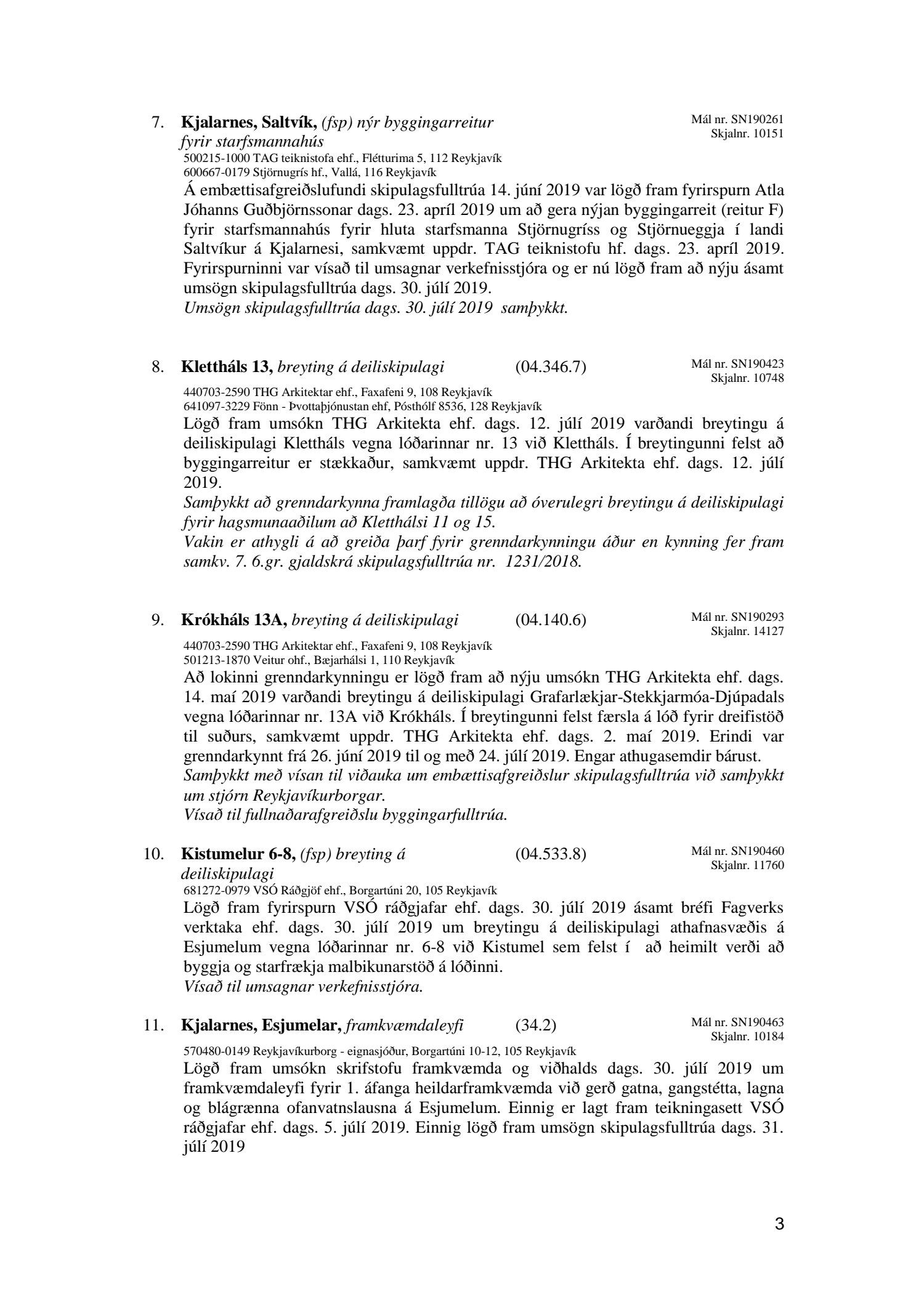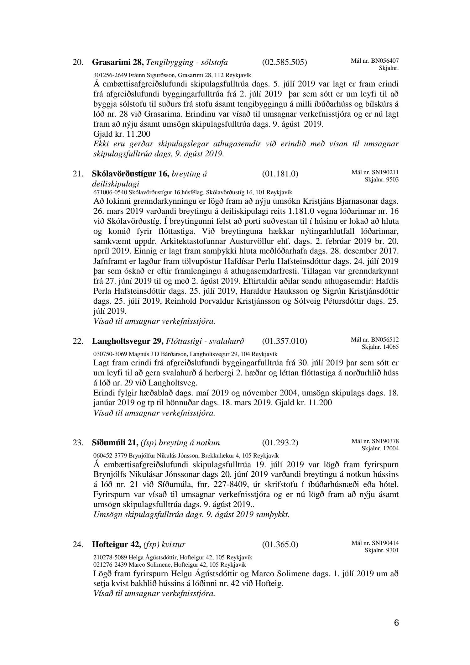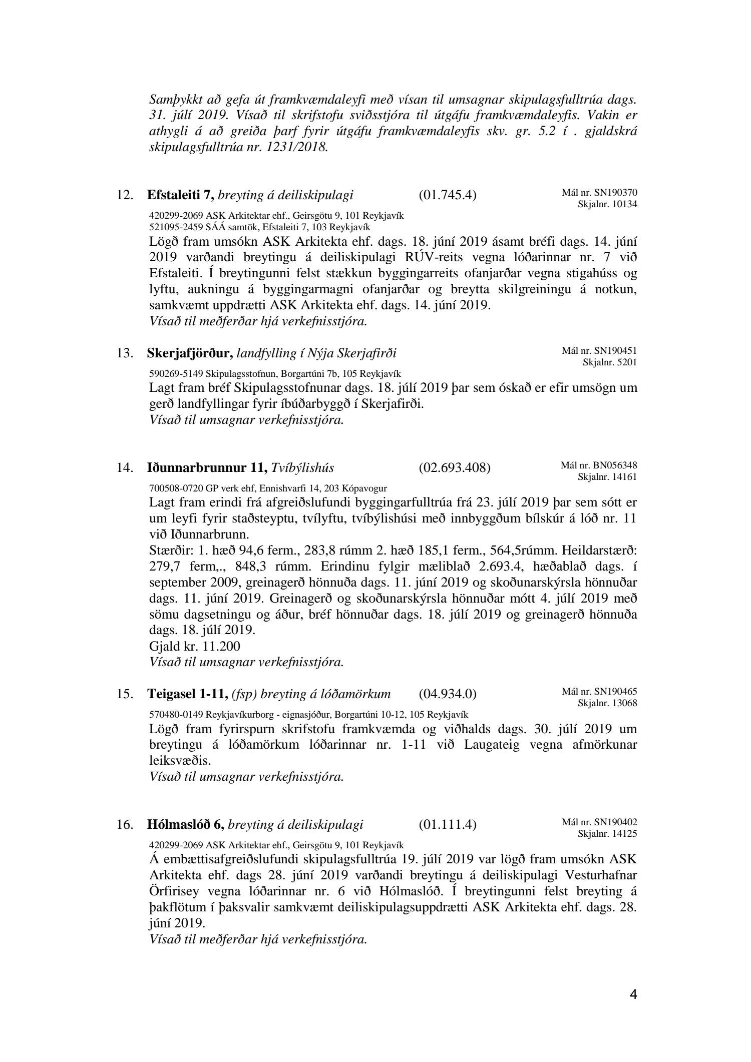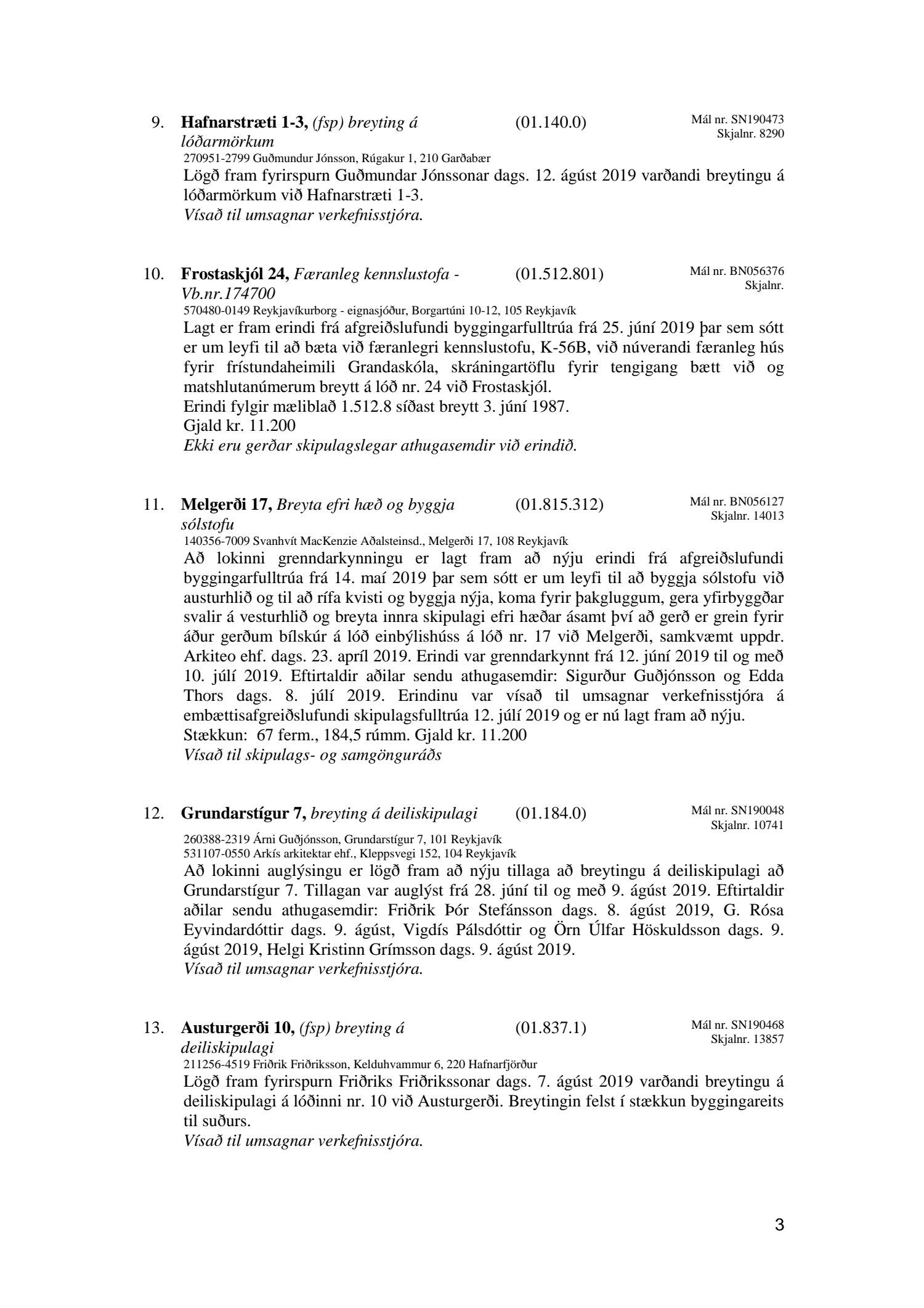 Bókun vegna liðs nr.1 – Fundargerð Skipulagsfulltrúa frá 9.ágúst 2019, liður 7.Úlfarsfell Fulltrúi Miðflokksins leggst alfarið gegn fyrirhuguðum framkvæmdum á einum vinsælasta útsýnisstað borgarinnar og vísar í fyrri bókanir vegna málsins. Eftirtekt vekur hversu hart Reykjavíkurborg hefur gengið fram í þessu máli þvert gegn vilja íbúa Úlfarsárdals,Grafarholts sem og íbúa borgarinnar almennt. 50m hátt stálmastur hlaðið tækjabúnaði og allt það fargan sem því fylgir skal nú reist, þvert gegn vilja íbúa. Fyrir liggur að hér er um að ræða hagsmuni einkafyritækis, ekki íbúa. Fyrir liggur að Úlfarsfell er EKKI talinn besti kostur, þar trónir efst á lista Þverfellshorn í Esju og Bláfjöll,þar sem fyrir er sendir frá öðru fyrirtæki, þykir og góður kostur. Það er því alvarlegt mál að því fullyrt sé að þetta sé eina færa leiðin. Fjöldi athugasemda í kjölfar auglýsingar téðs deiliskipulags var slíkur að elstu menn muna ekki annað eins. Það er tillaga Miðflokksins að þessari aðför að ljúki hér og sú gríðarlega andstaða sem fram kemur í aðsendum athugasemdum í kjölfar auglýsingar um fyrirhugaðar framkvæmdir verði virt. Tilgangurinn með auglýsingum af þessu tagi, er að fá fram vilja borgaranna og hann er skýr: Nei takk. Jafnframt mælist undirritaður til þess að núverandi óleyfisbúnaður verði fjarlægður tafarlaust.