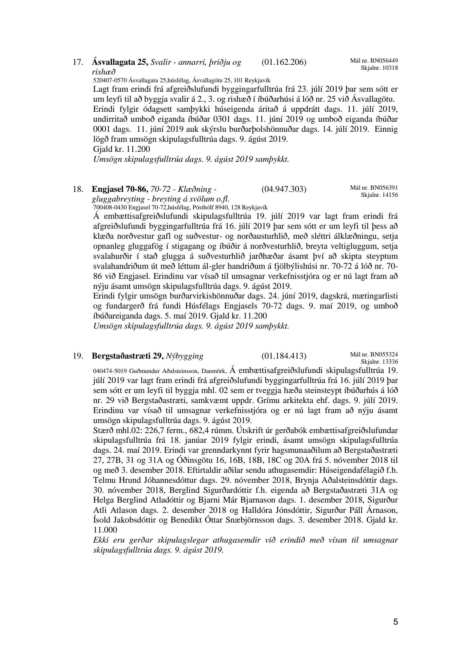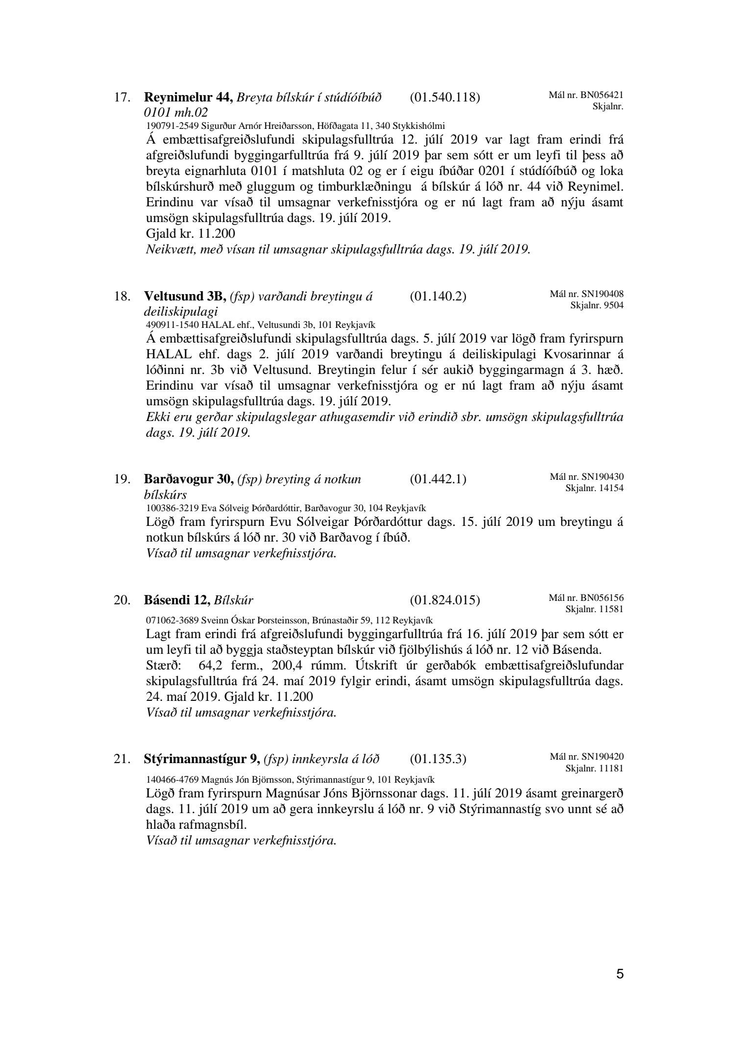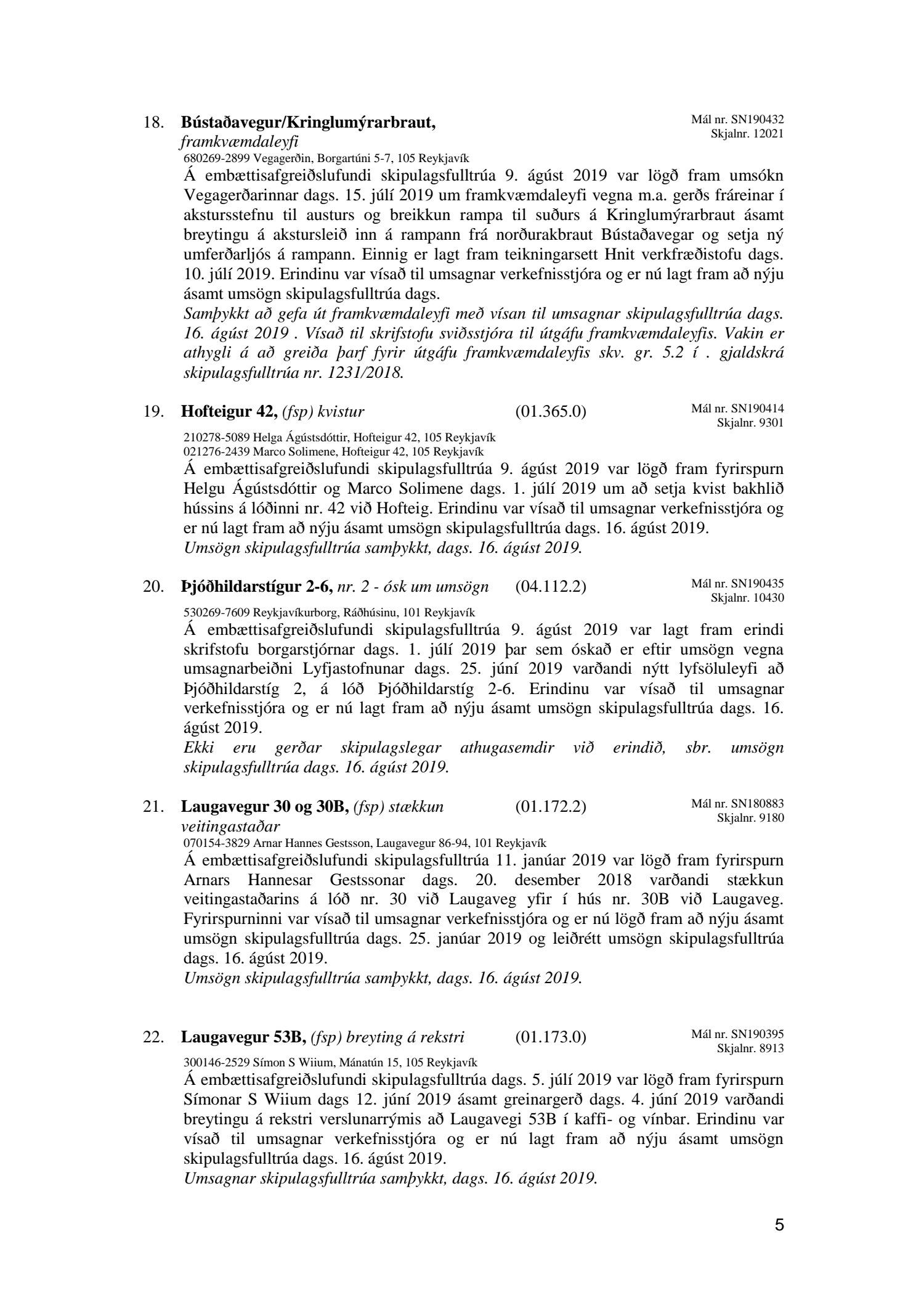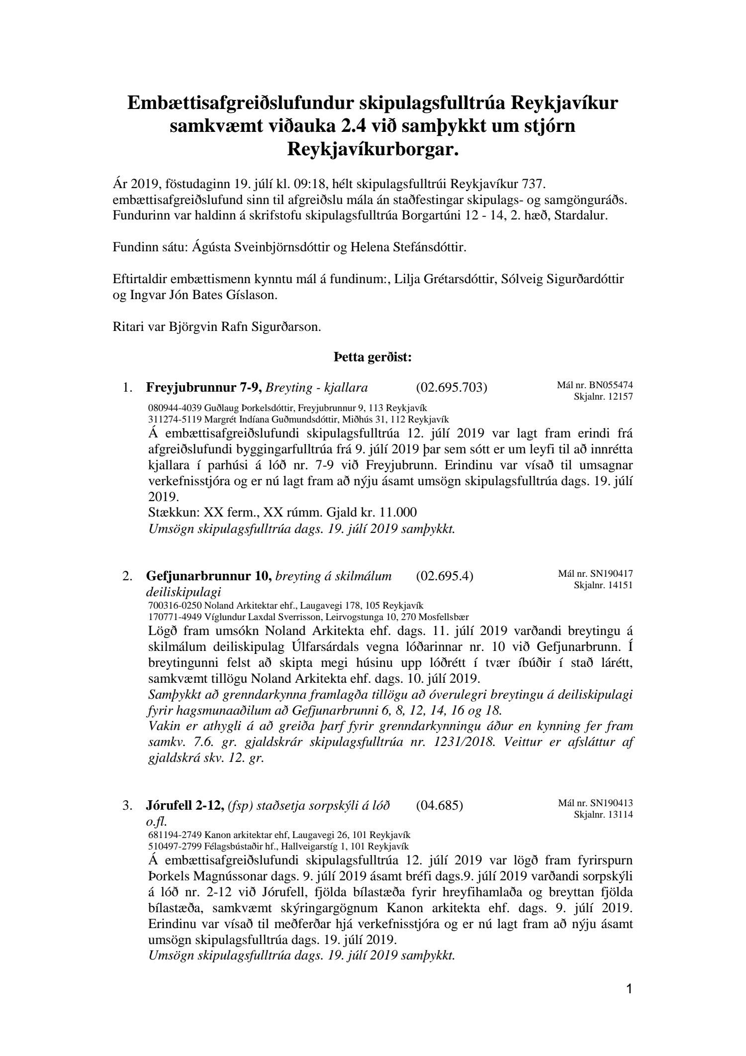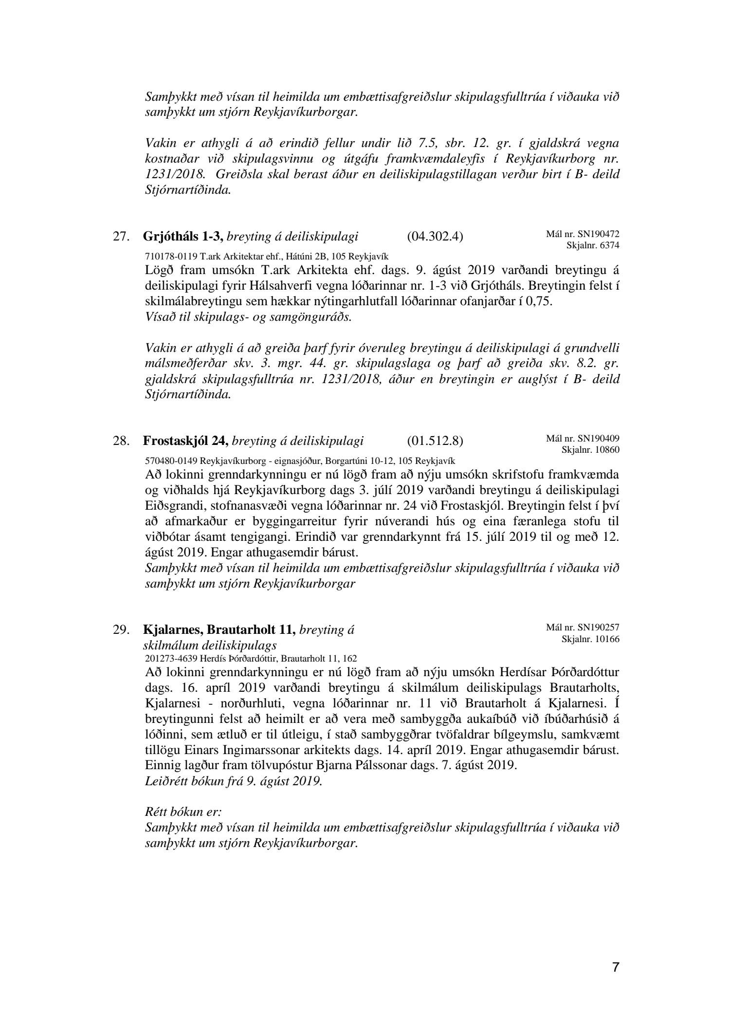 Bókun vegna liðs nr.1 – Fundargerð Skipulagsfulltrúa frá 9.ágúst 2019, liður 7.Úlfarsfell Fulltrúi Miðflokksins leggst alfarið gegn fyrirhuguðum framkvæmdum á einum vinsælasta útsýnisstað borgarinnar og vísar í fyrri bókanir vegna málsins. Eftirtekt vekur hversu hart Reykjavíkurborg hefur gengið fram í þessu máli þvert gegn vilja íbúa Úlfarsárdals,Grafarholts sem og íbúa borgarinnar almennt. 50m hátt stálmastur hlaðið tækjabúnaði og allt það fargan sem því fylgir skal nú reist, þvert gegn vilja íbúa. Fyrir liggur að hér er um að ræða hagsmuni einkafyritækis, ekki íbúa. Fyrir liggur að Úlfarsfell er EKKI talinn besti kostur, þar trónir efst á lista Þverfellshorn í Esju og Bláfjöll,þar sem fyrir er sendir frá öðru fyrirtæki, þykir og góður kostur. Það er því alvarlegt mál að því fullyrt sé að þetta sé eina færa leiðin. Fjöldi athugasemda í kjölfar auglýsingar téðs deiliskipulags var slíkur að elstu menn muna ekki annað eins. Það er tillaga Miðflokksins að þessari aðför að ljúki hér og sú gríðarlega andstaða sem fram kemur í aðsendum athugasemdum í kjölfar auglýsingar um fyrirhugaðar framkvæmdir verði virt. Tilgangurinn með auglýsingum af þessu tagi, er að fá fram vilja borgaranna og hann er skýr: Nei takk. Jafnframt mælist undirritaður til þess að núverandi óleyfisbúnaður verði fjarlægður tafarlaust.