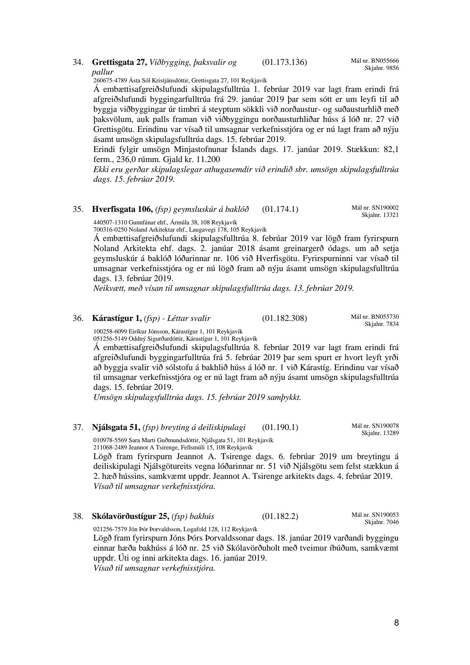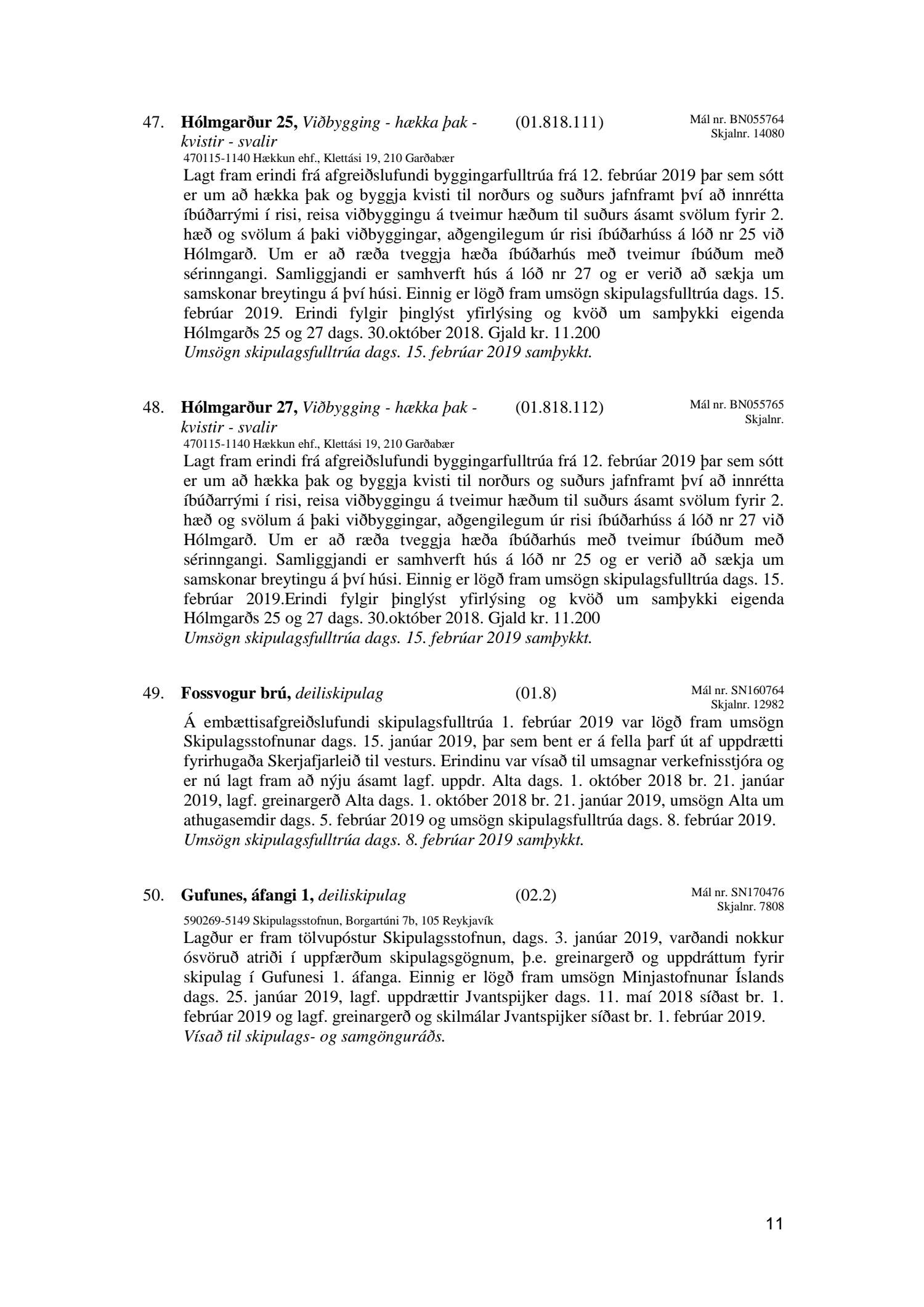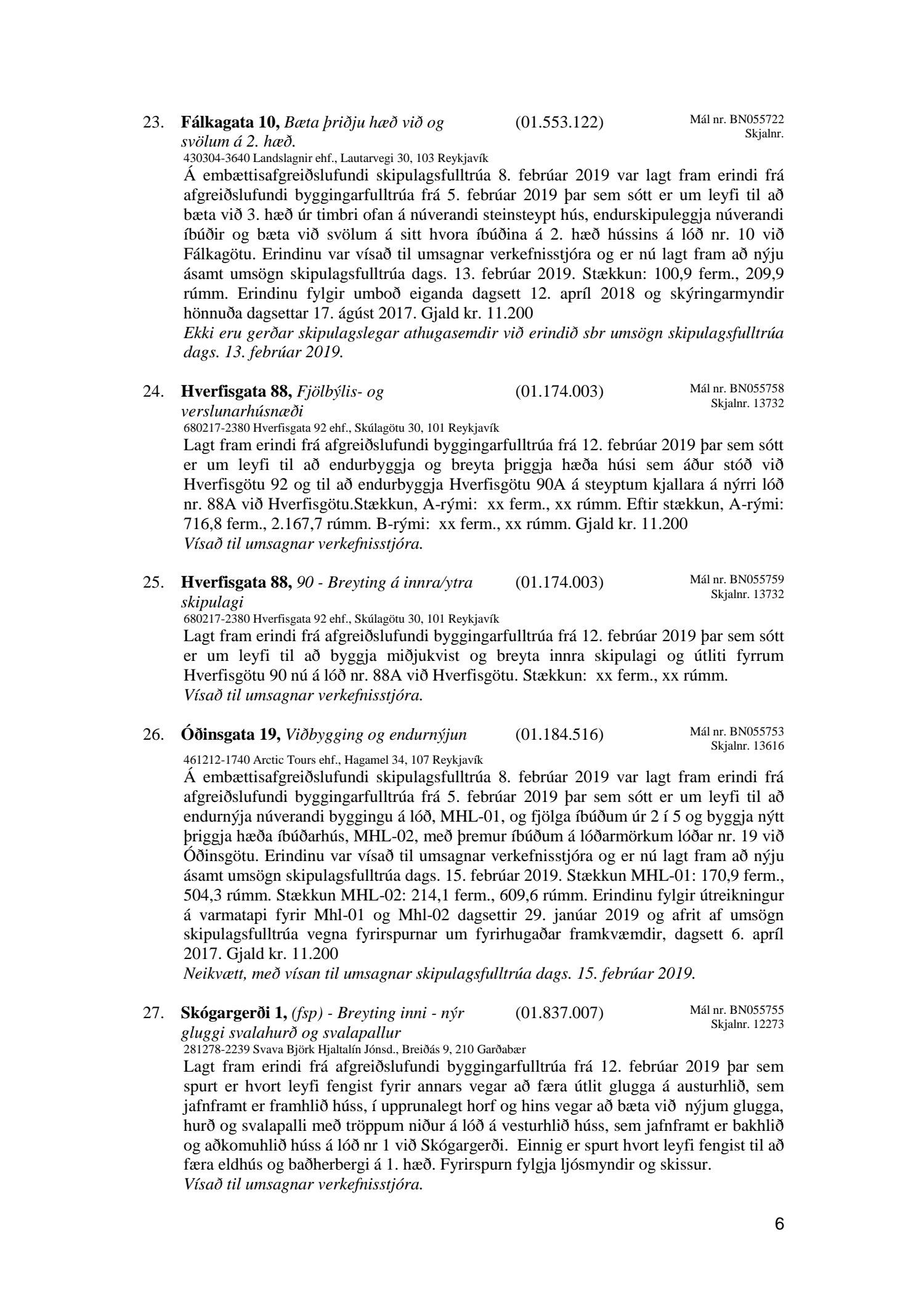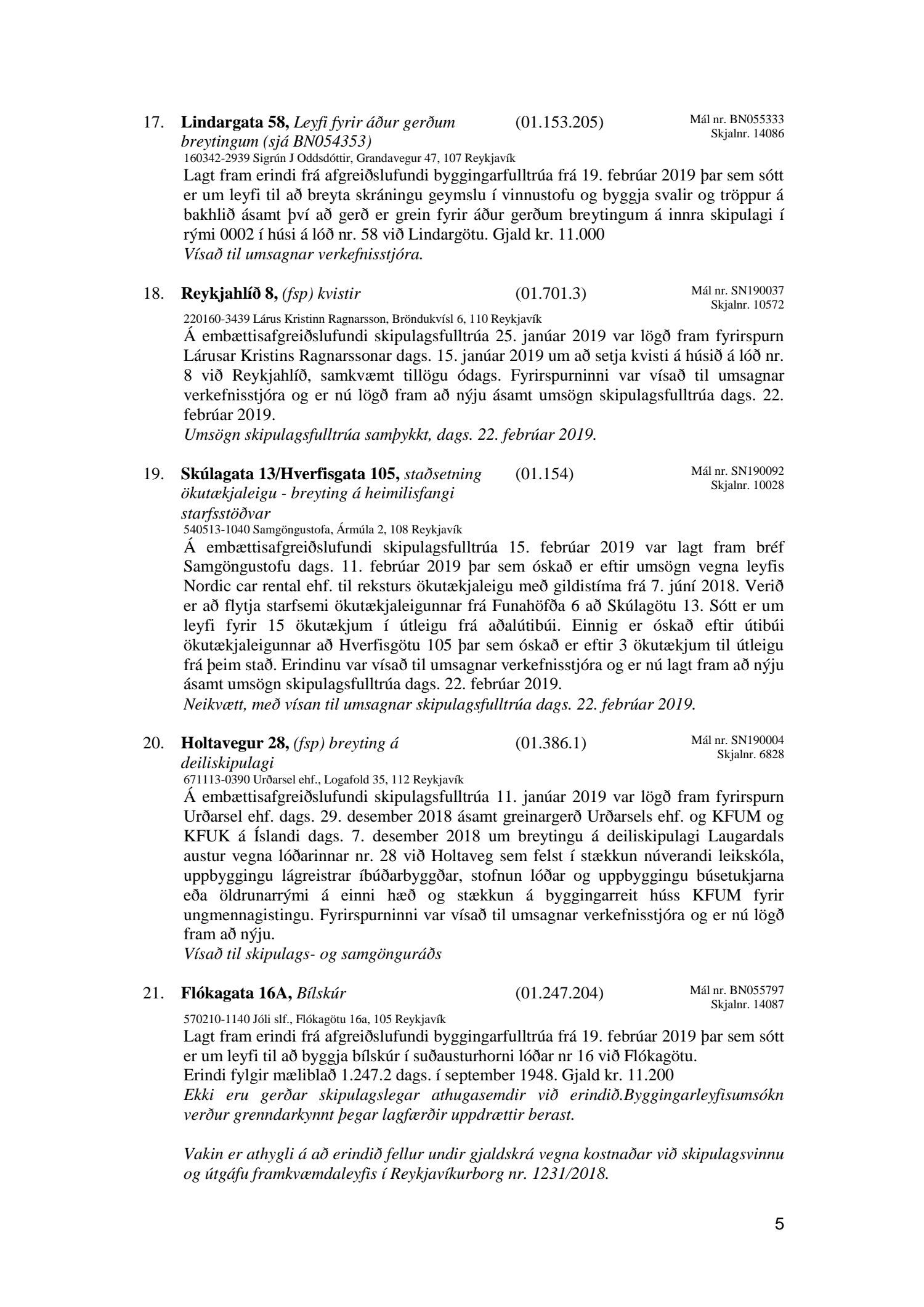 Afgreiðslufundir skipulagsfulltrúa 22. febrúar og 1. mars 2019