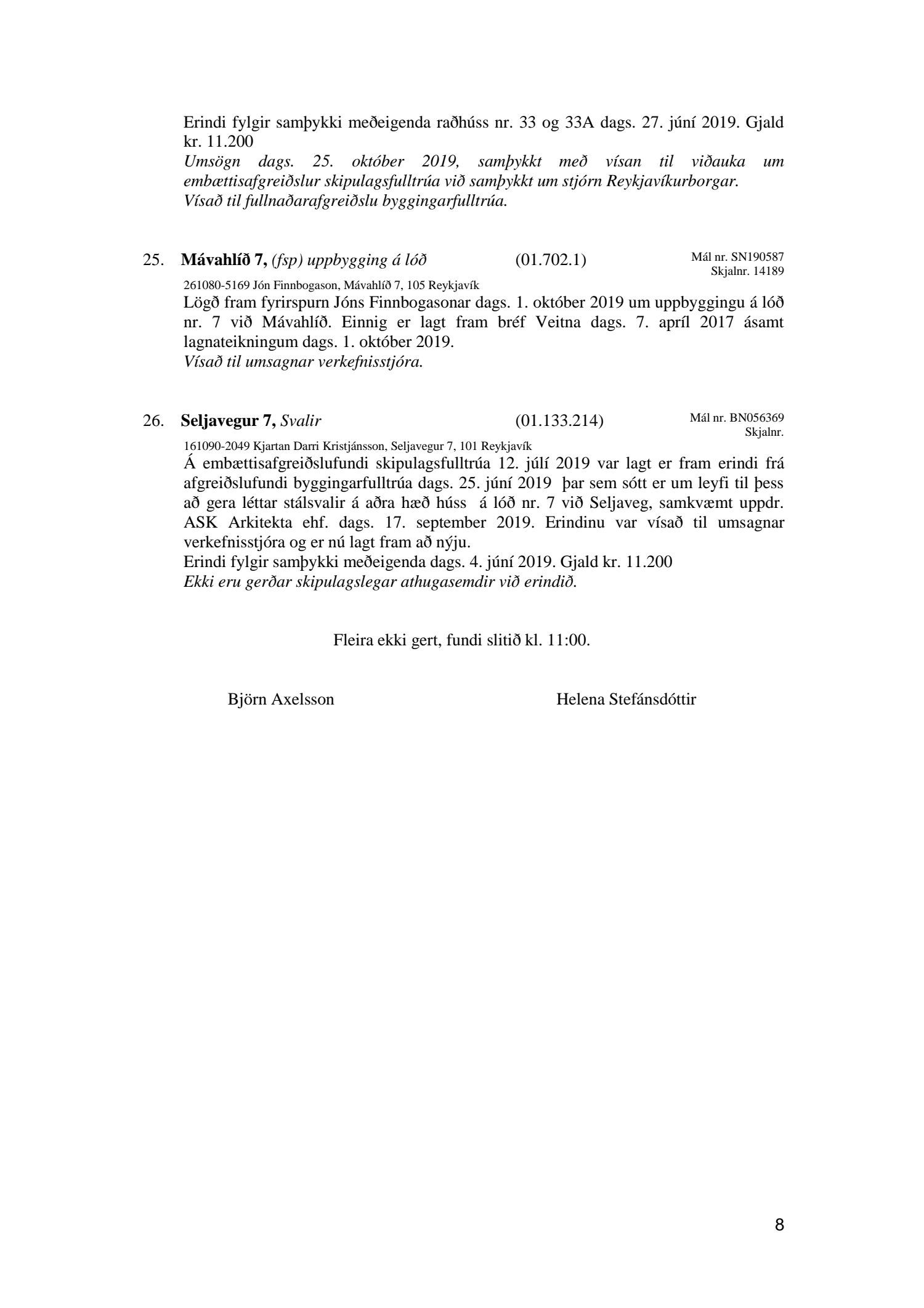 Fundargerðir embættisafgreiðslufunda skipulagsfulltrúa 25.10. og 01.11 2019