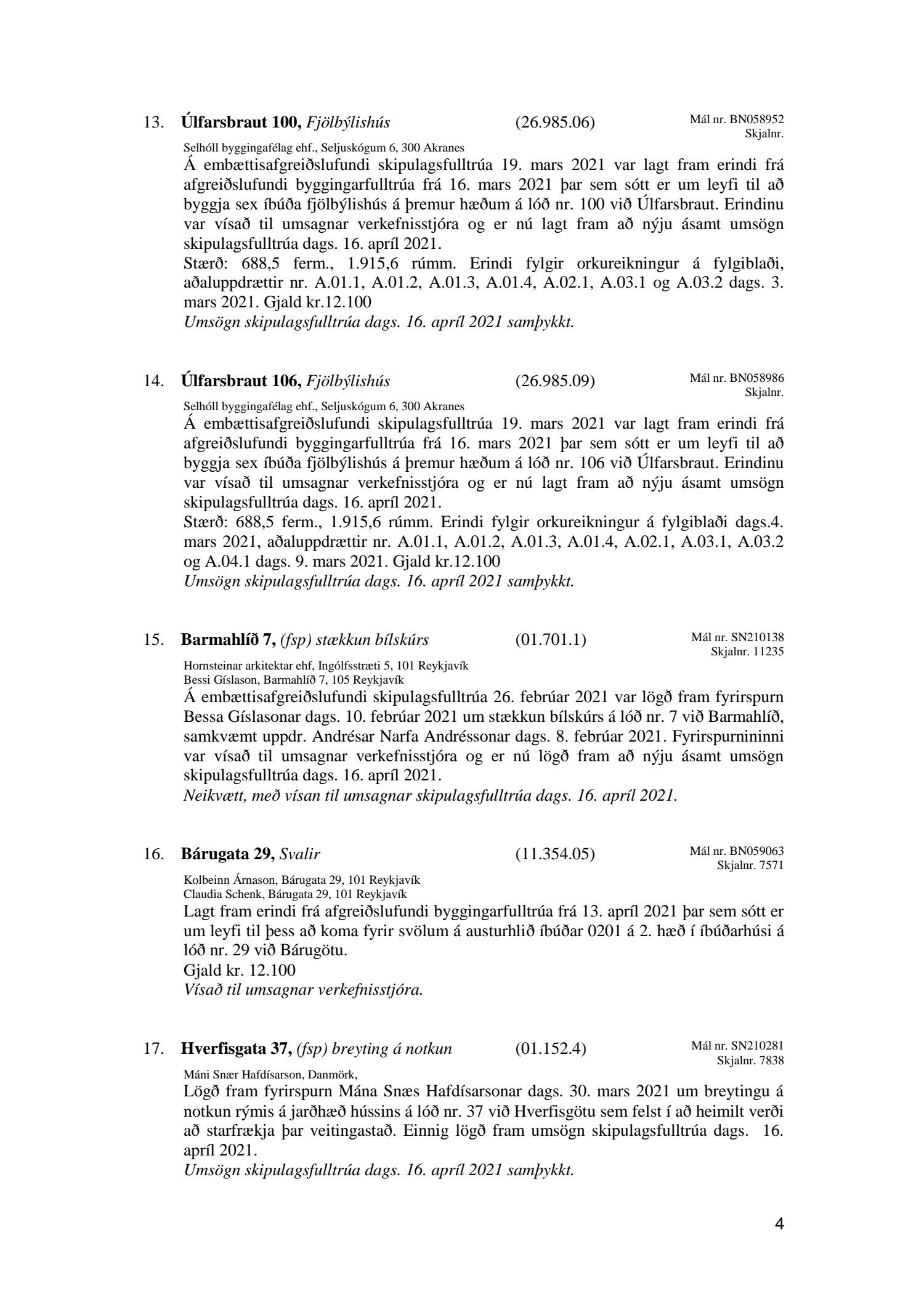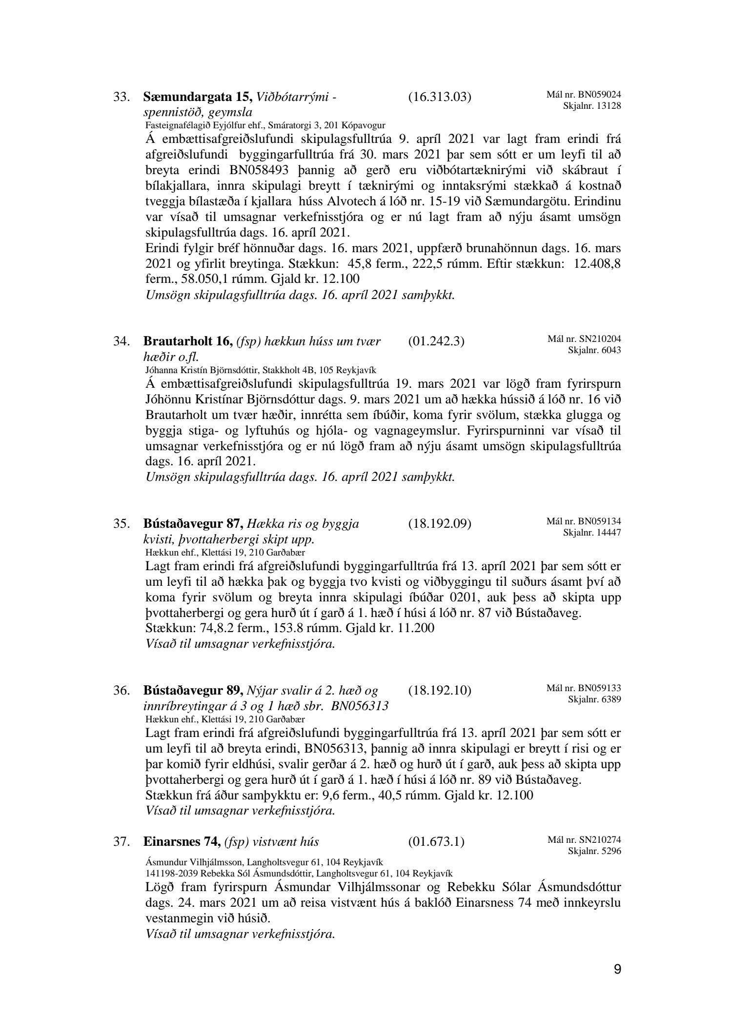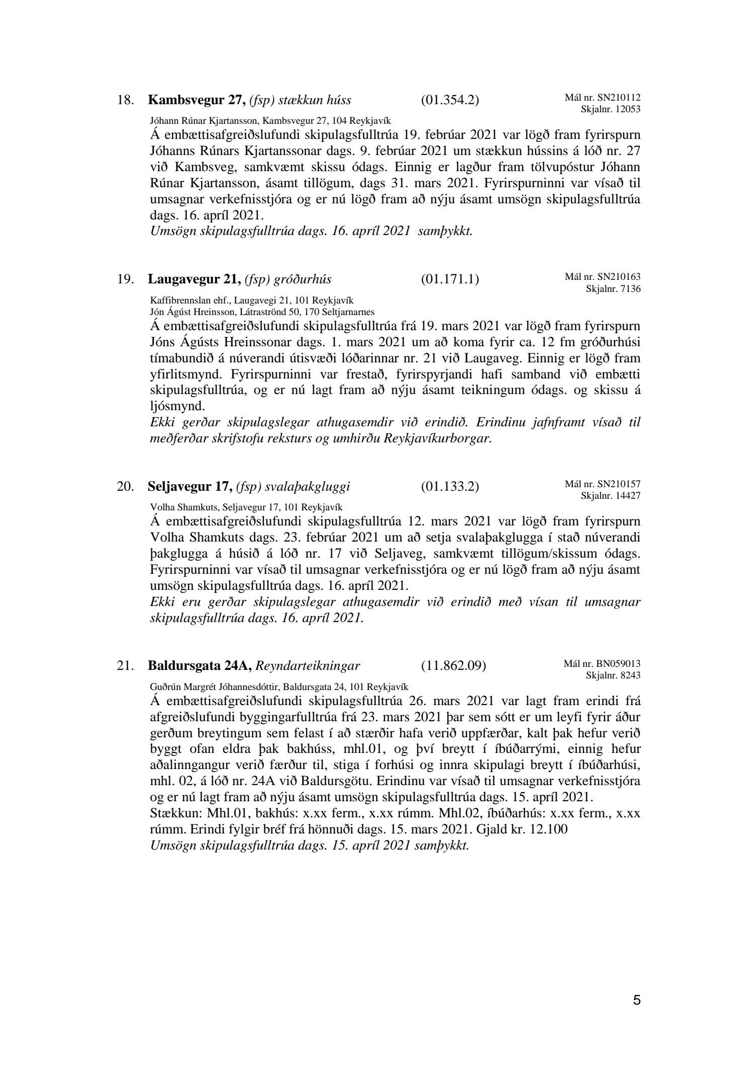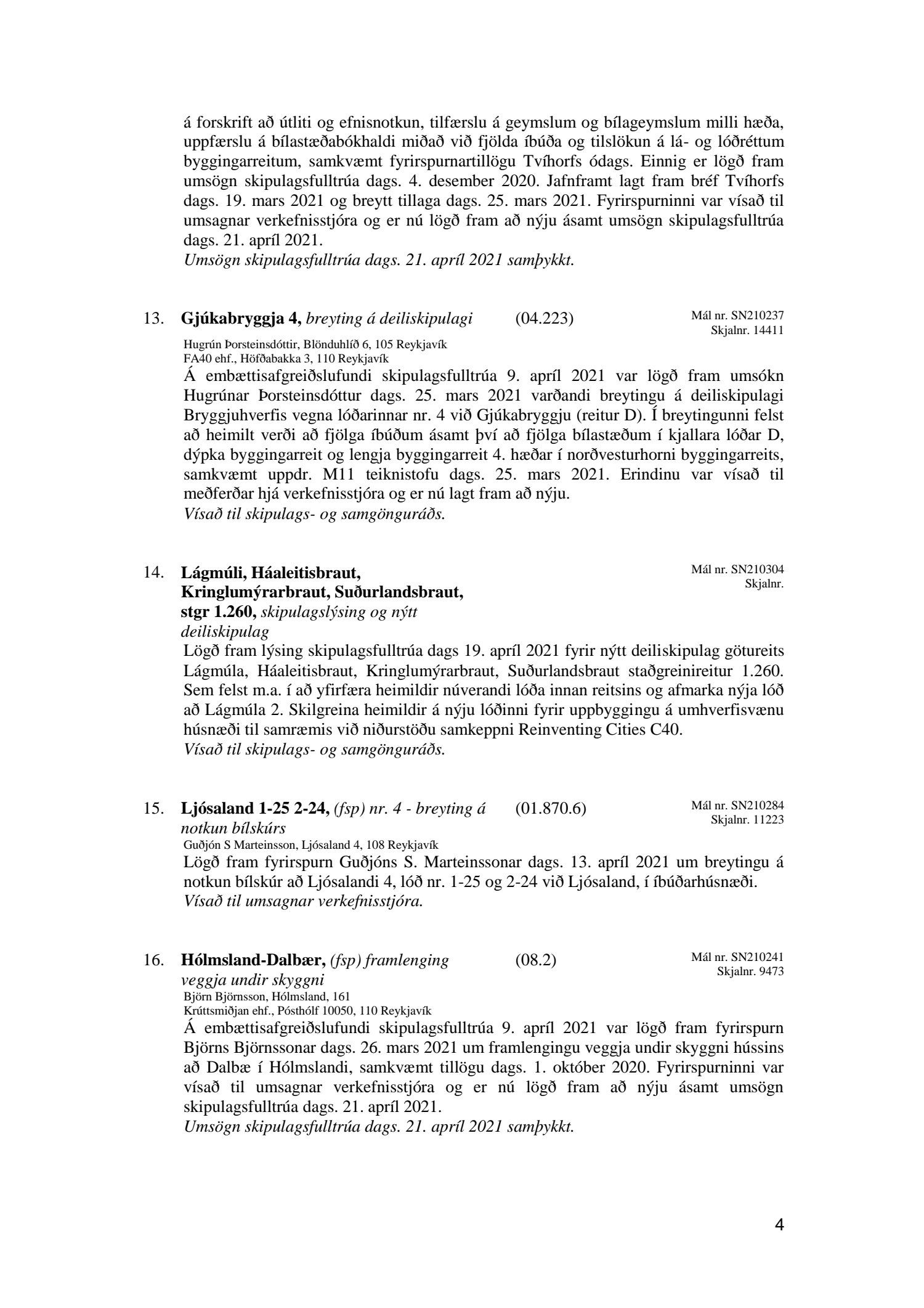 Lagðar fram fundargerðir embættisafgreiðslufunda skipulagsfulltrúa frá 16. og 21. apríl 2021.