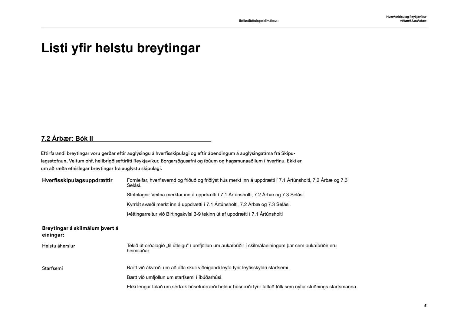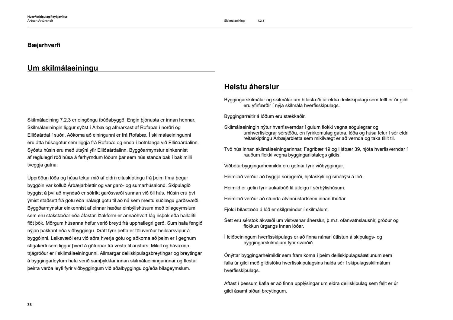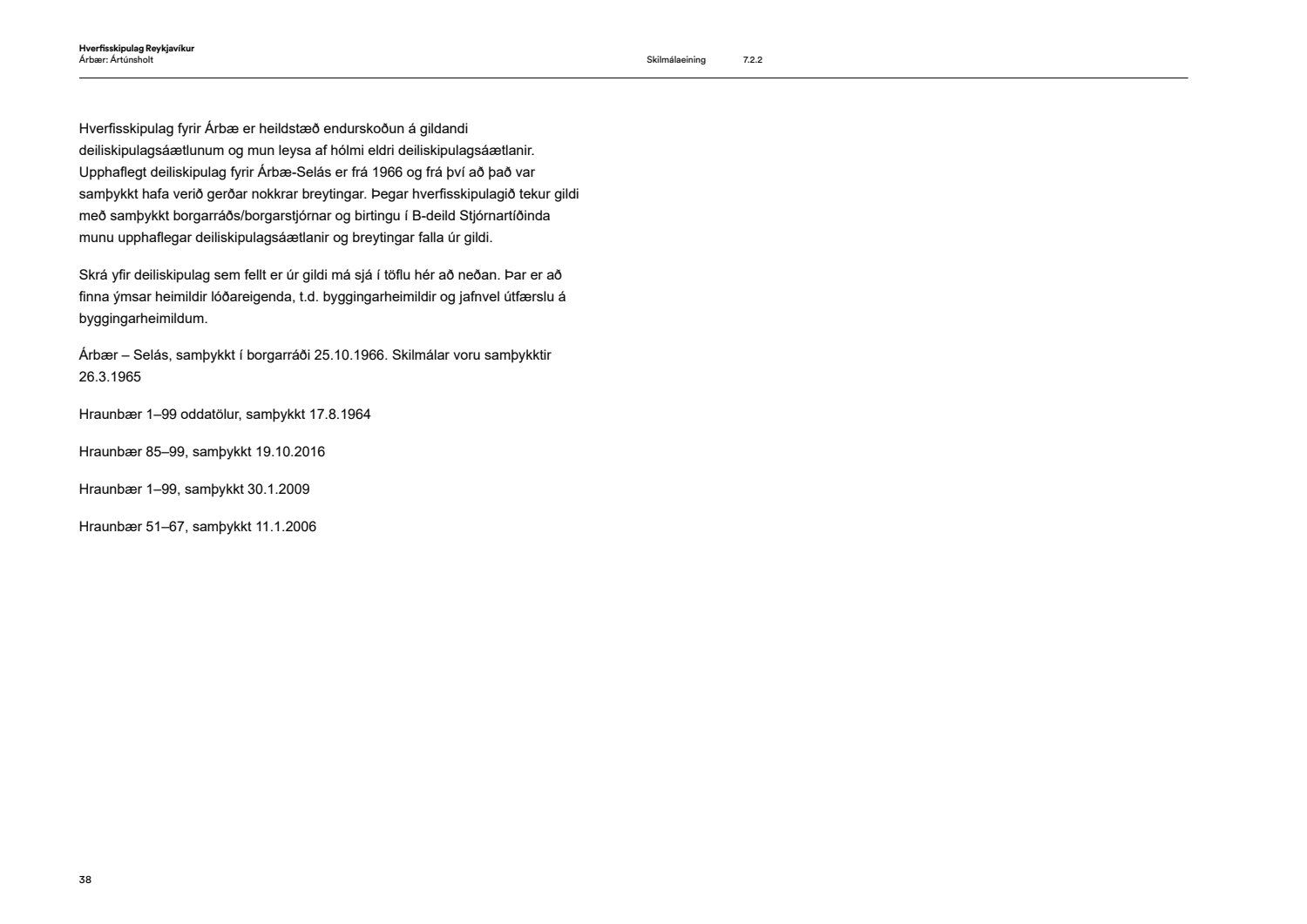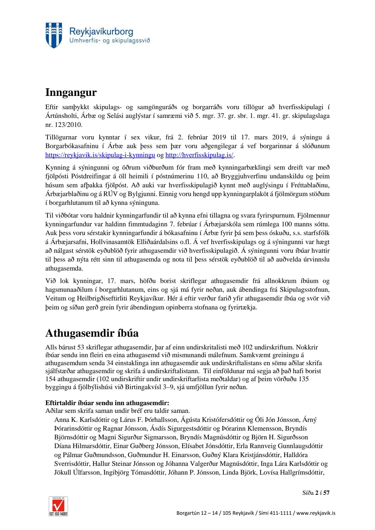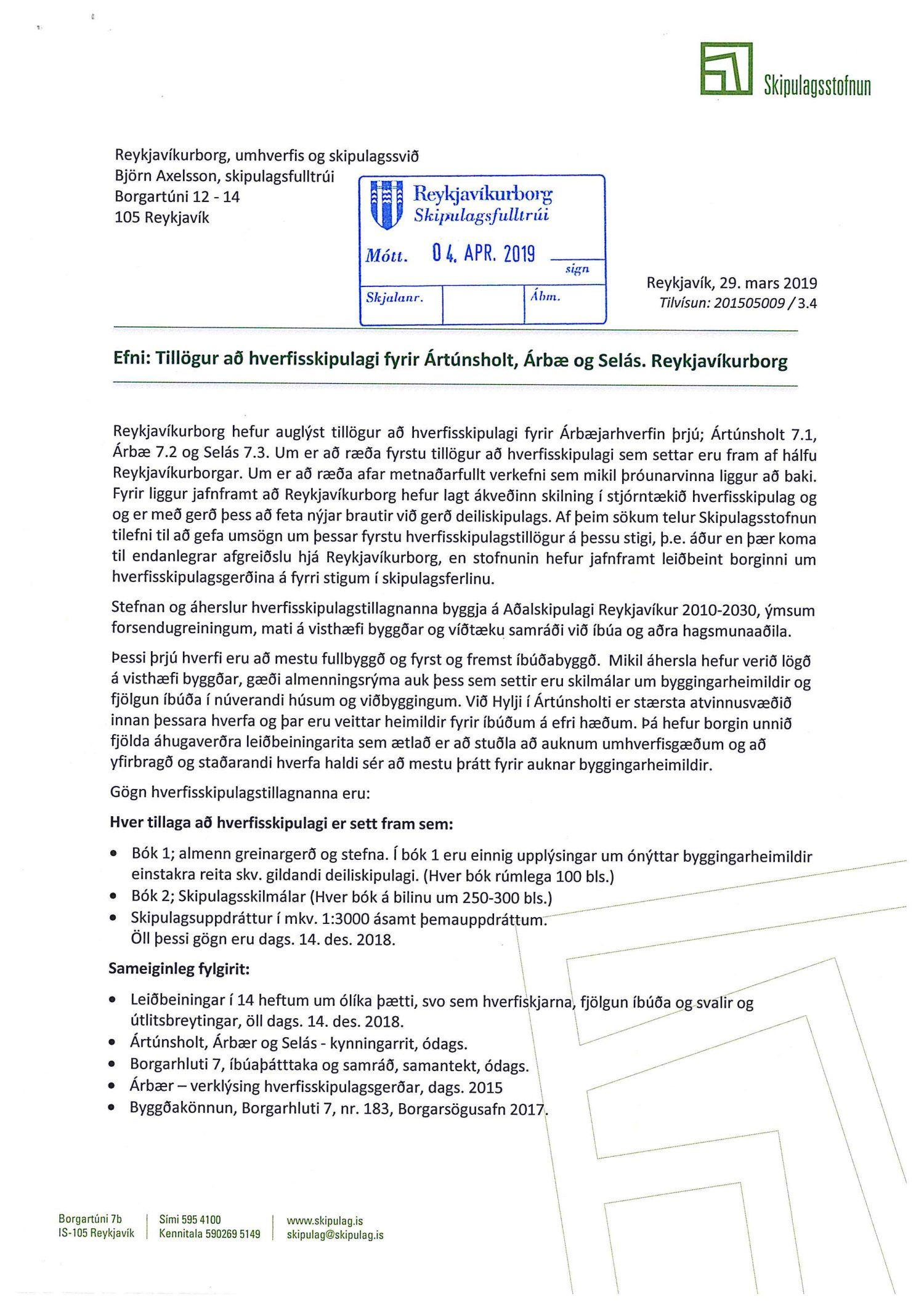 Að lokinni auglýsingu er lögð fram að nýju tillaga að hverfisskipulagi Árbæjar, hverfi 7.2 Árbær dags. 14. desember 2018, br. 12. september 2019 ásamt almennri greinargerð og stefnu dags. 14. desember 2018, br. 12. september 2019 og skipulagsskilmálum dags. 14. desember 2018, br. 12. september 2019. Tillagan var auglýst frá 2. febrúar 2019 til og með 17. mars 2019. Eftirtaldir aðilar sendu athugasemdir: Guðmundur H. Einarsson mótt 17. mars 2019. Einnig sendu eftirtaldar stofnanir inn umsagnir: Heilbrigðiseftirlit Reykjavíkur dags. 20. mars 2019, Skipulagsstofnun dags. 29. mars 2019 og Veitur dags. 22. mars 2019. Einnig er lögð fram umsögn skipulagsfulltrúa dags. 22. september 2019.