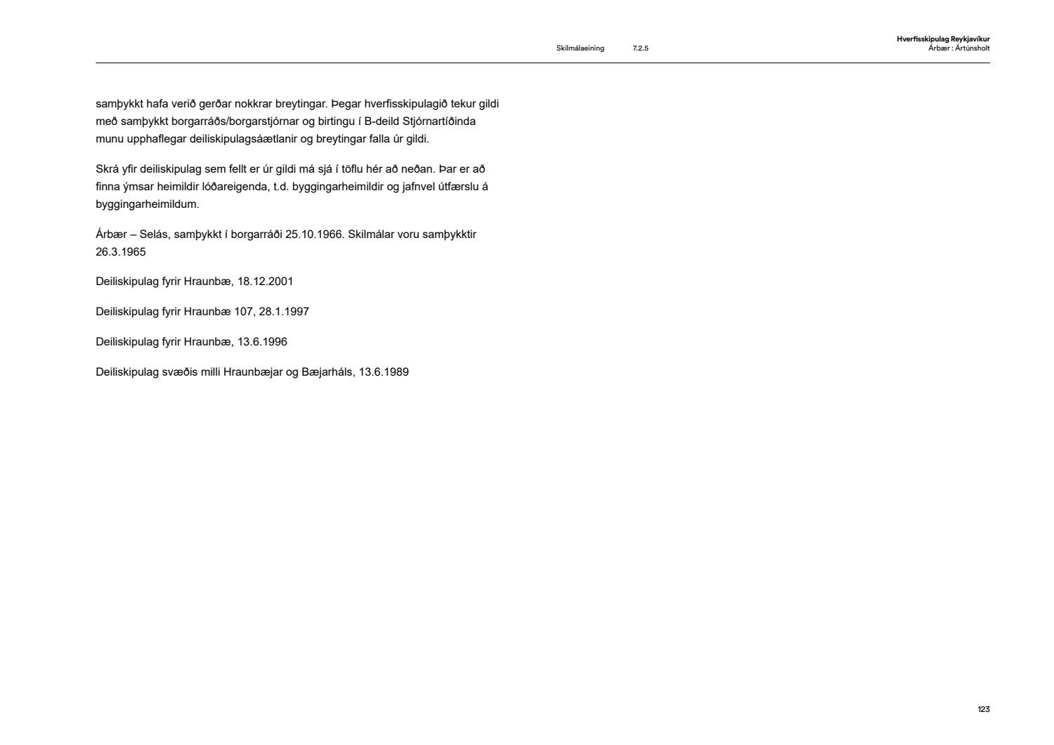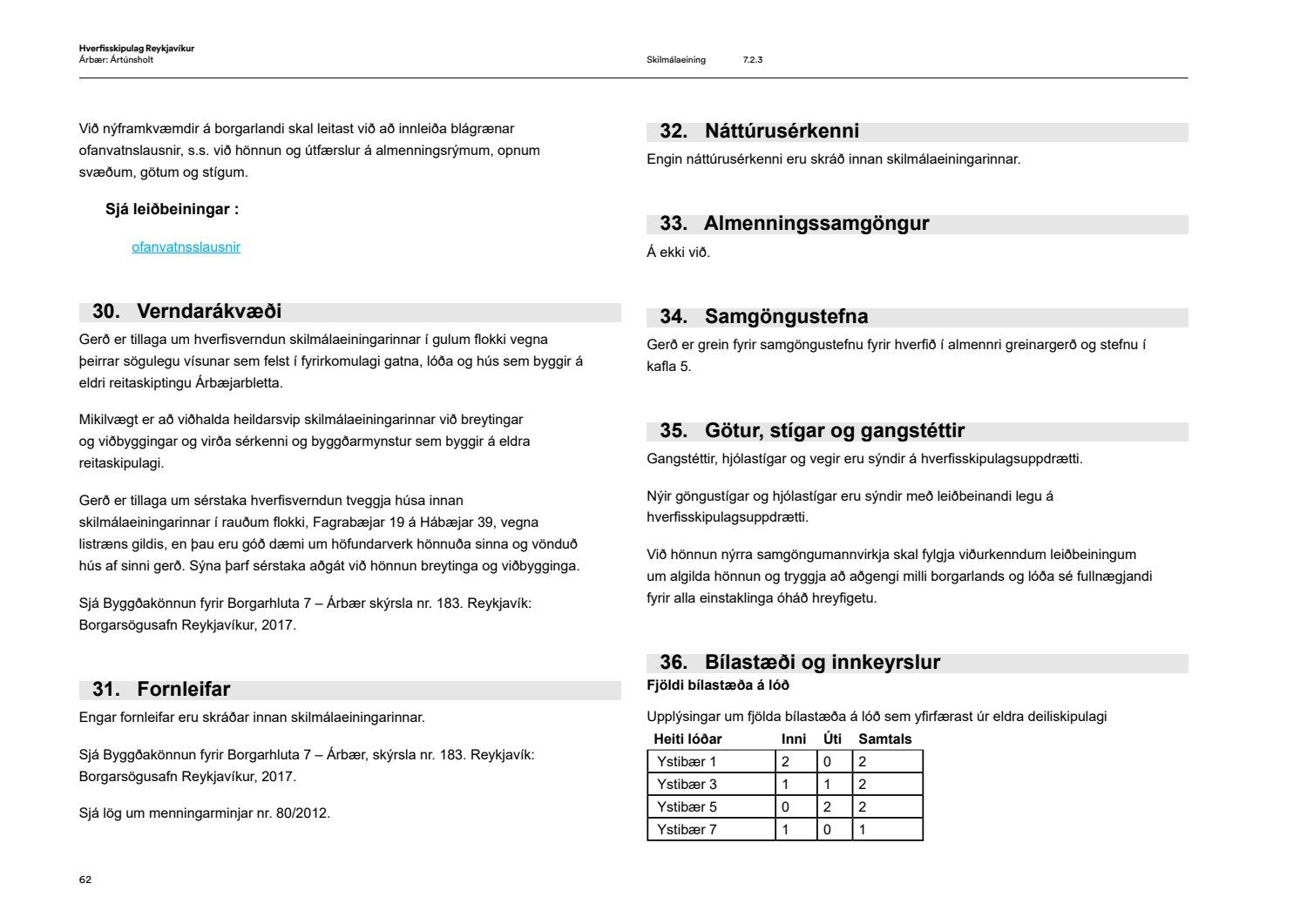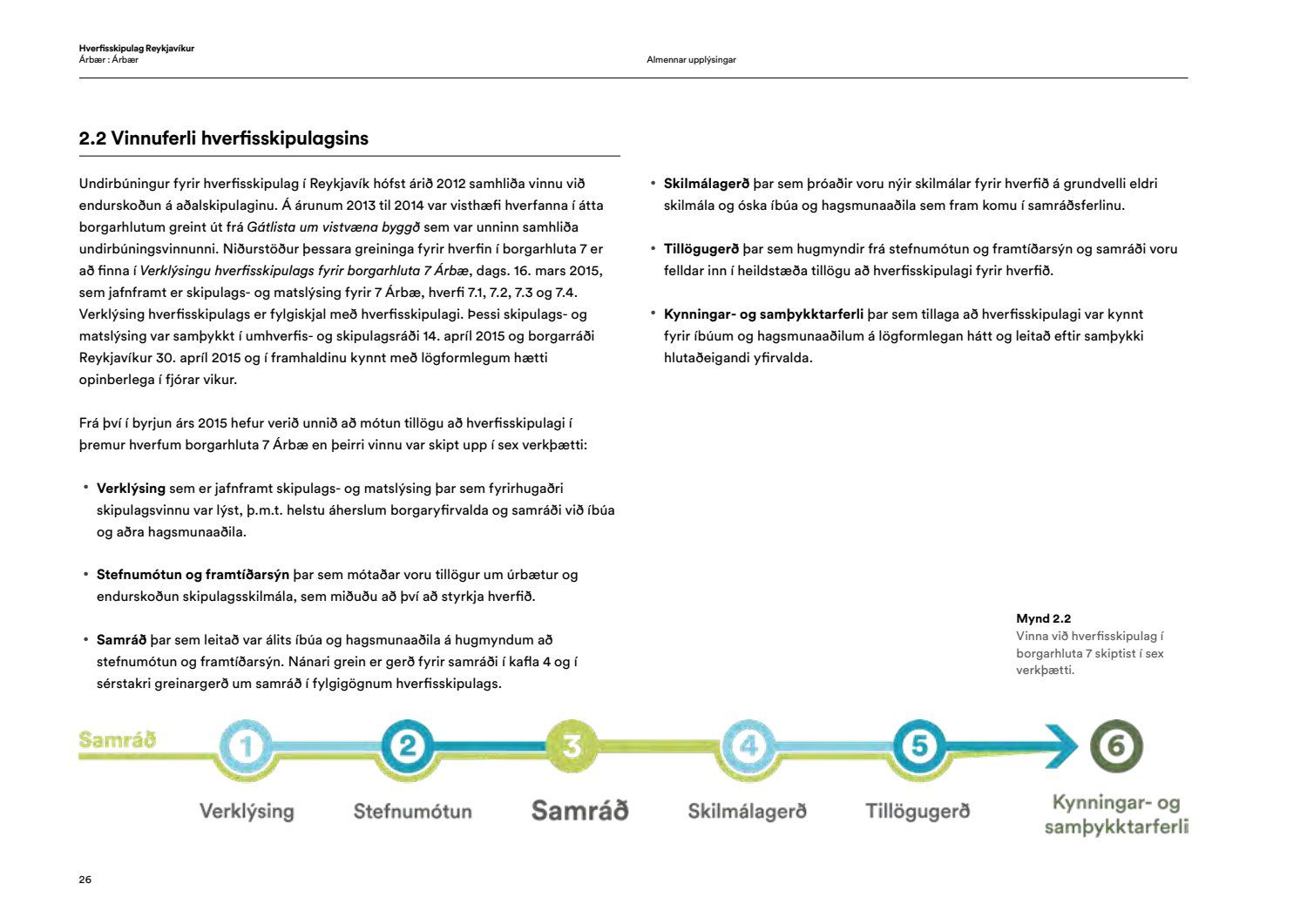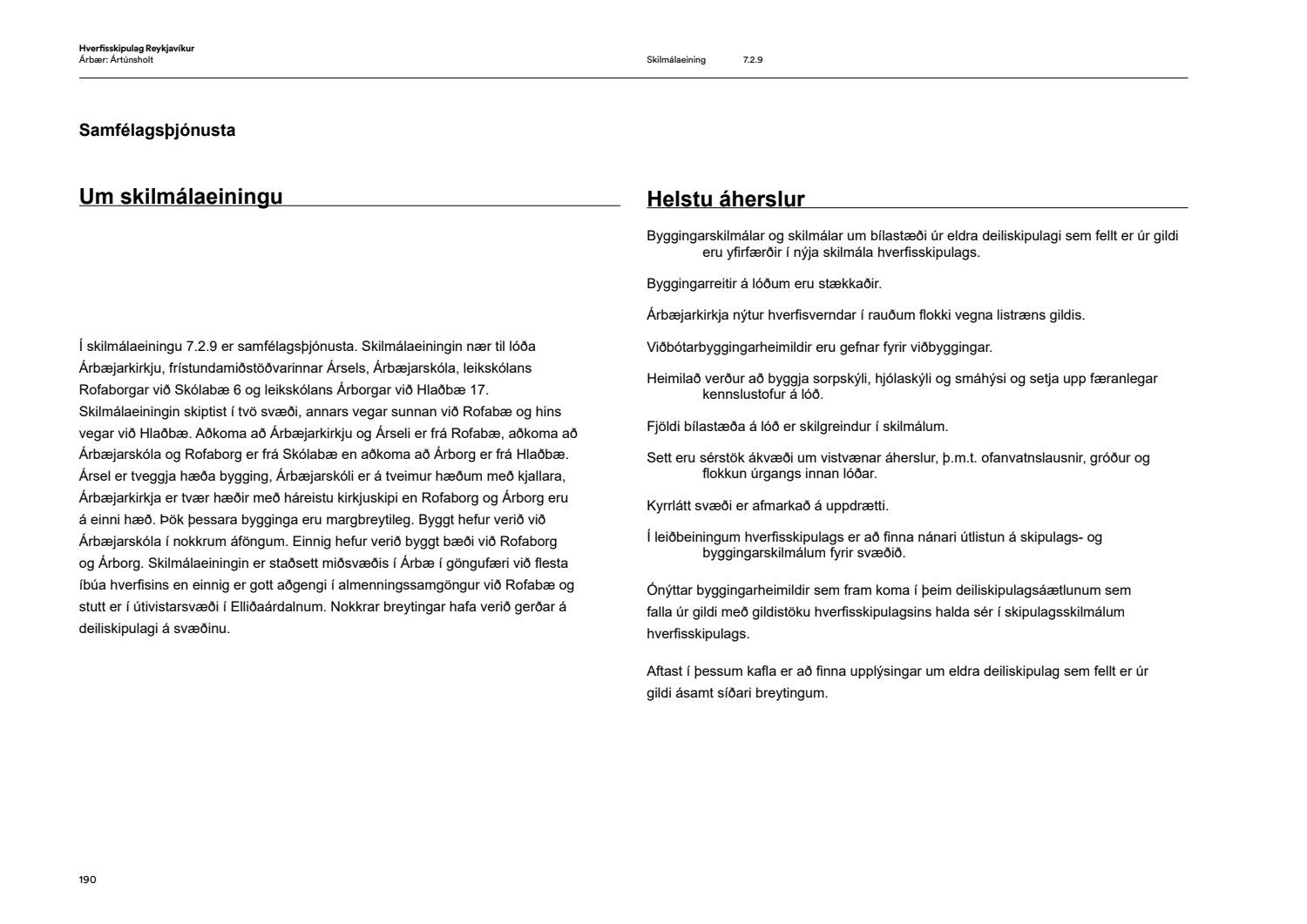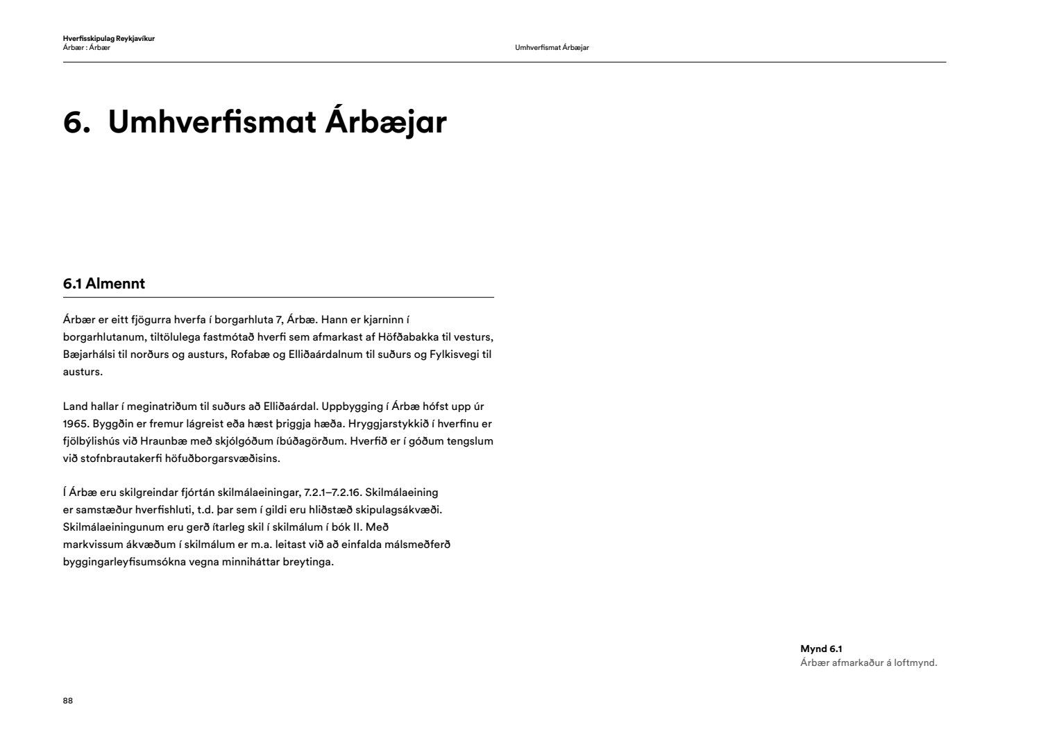 Að lokinni auglýsingu er lögð fram að nýju tillaga að hverfisskipulagi Árbæjar, hverfi 7.2 Árbær dags. 14. desember 2018, br. 12. september 2019 ásamt almennri greinargerð og stefnu dags. 14. desember 2018, br. 12. september 2019 og skipulagsskilmálum dags. 14. desember 2018, br. 12. september 2019. Tillagan var auglýst frá 2. febrúar 2019 til og með 17. mars 2019. Eftirtaldir aðilar sendu athugasemdir: Guðmundur H. Einarsson mótt 17. mars 2019. Einnig sendu eftirtaldar stofnanir inn umsagnir: Heilbrigðiseftirlit Reykjavíkur dags. 20. mars 2019, Skipulagsstofnun dags. 29. mars 2019 og Veitur dags. 22. mars 2019. Einnig er lögð fram umsögn skipulagsfulltrúa dags. 22. september 2019.