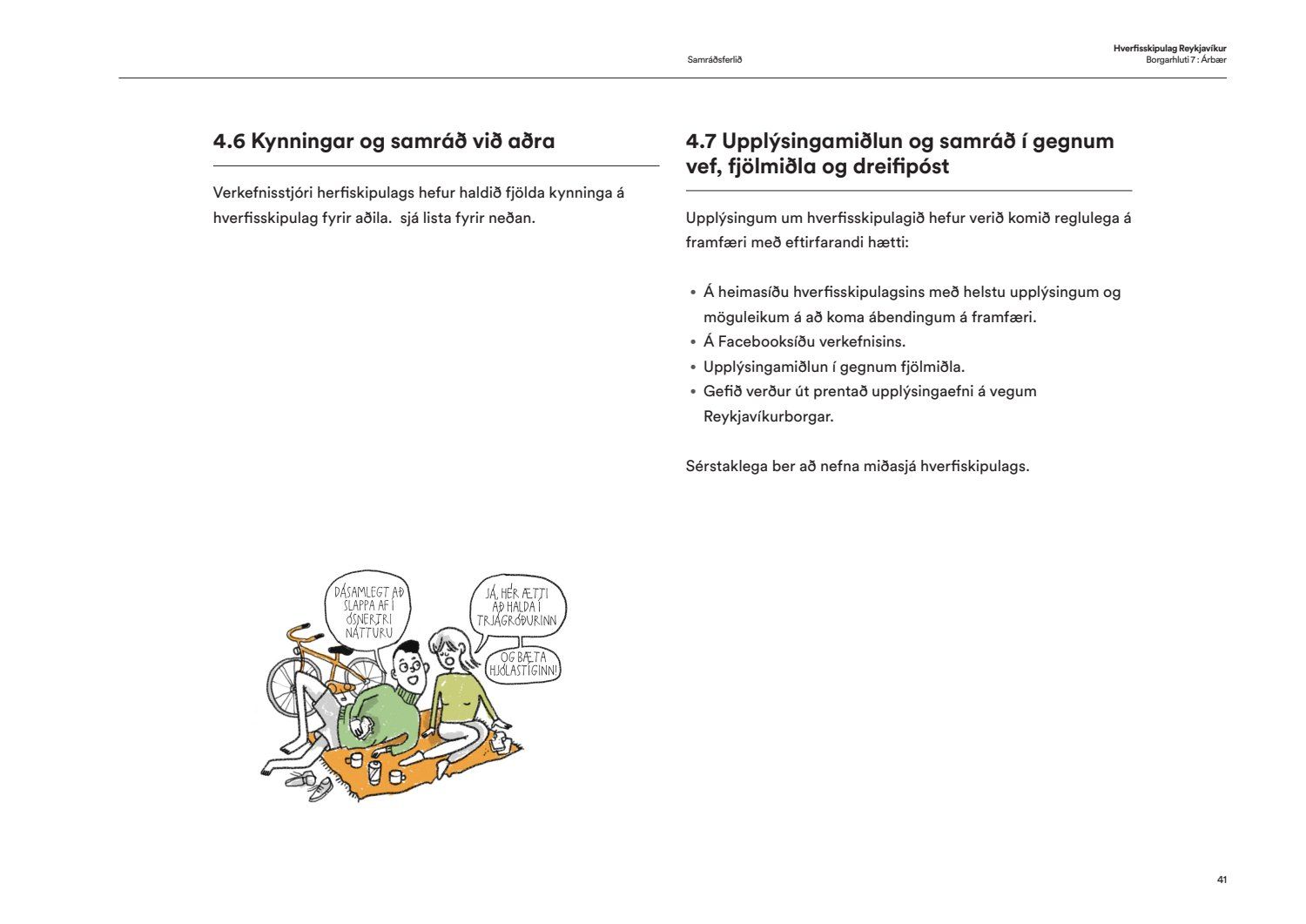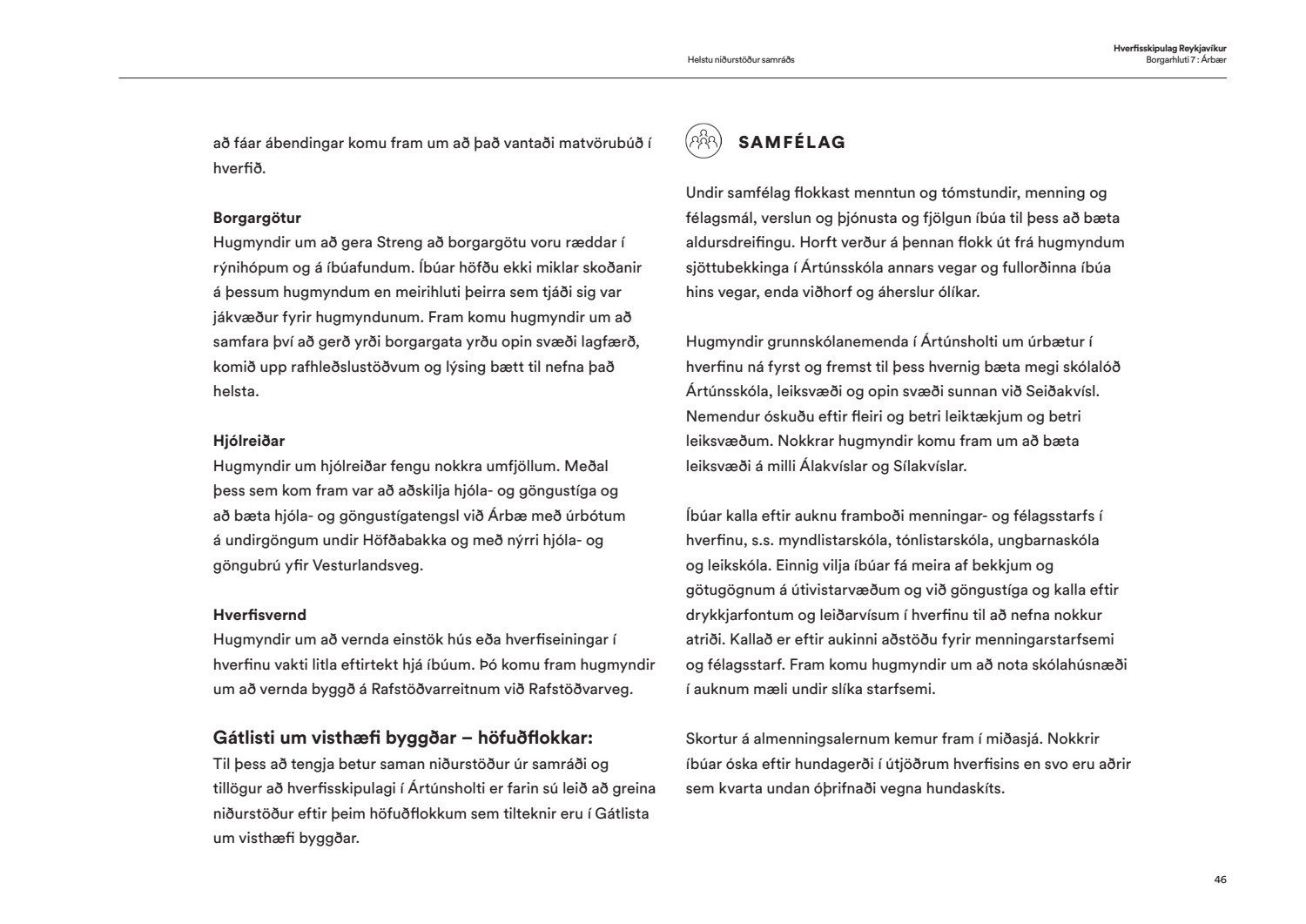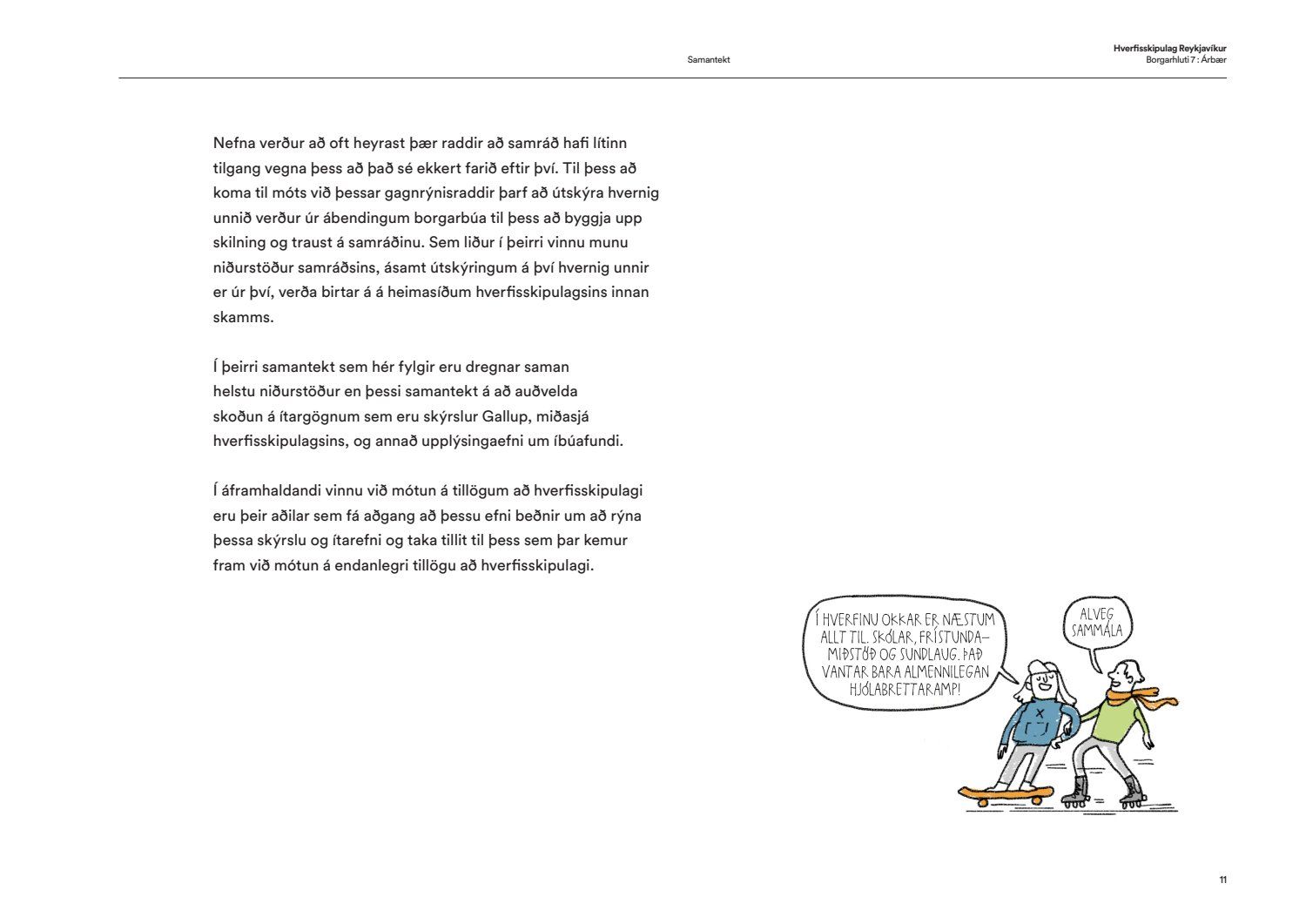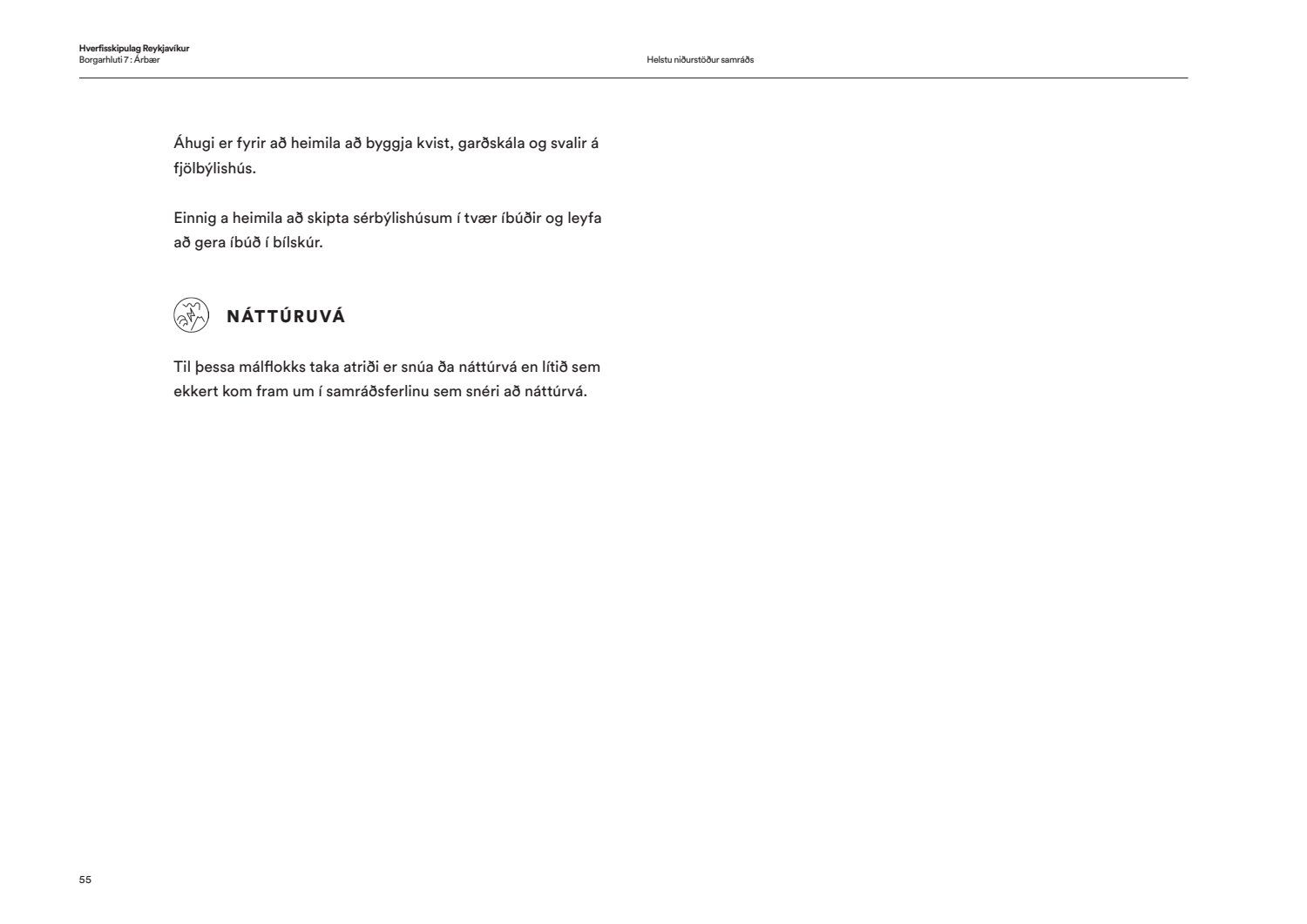 Skipulags- og samgönguráð bókar: “Í hverfisskipulagi birtist framtíðarsýn fyrir gróin hverfi og heimildir til breytinga og minniháttar uppbyggingar verða til. Allt miðaðst að því að hverfin verði sjálfbærari og grænni og að íbúar geti þekkt hverfin sín vel og þær heimildir sem þar er að finna hvort heldur sem það er í verslunarkjörnum eða á einkalóðum. Aldrei hefur verið farið í eins viðamikið samráð við íbúa eins og við gerð hverfisskipulags og hafa þúsundir borgarbúa á öllum aldri komið að vinnunni, allt frá vinnu grunnskólabarna við módel af hverfunum sínum til einstaklinga sem sitja í rýnihópum. Með hverfisskipulaginu fylgja leiðbeiningar til að auðvelda skilning á skipulagi og því hvað sjálfbært hverfi er. Gerð heildstæðs skipulags fyrir hverfi borgarinnar hefur verið lengi í vinnslu enda viðamikið verkefni. Það er því fagnaðarefni að leiðbeiningar og fyrsta hverfisskipulag borgarinnar hafi nú verið samþykkt. Kynningarmynband af hverfisskipulaginu má finna hér: hvsk.is/horfa/hvad-er-hverfisskipulag“
