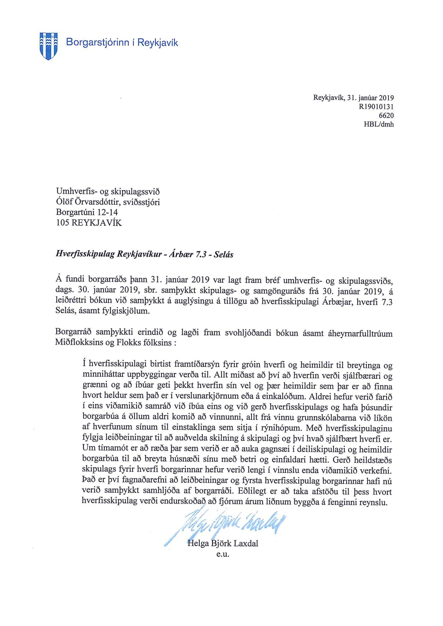 Lagt fram bréf borgarstjóra dags. 31. janúar 2019 vegna samþykktar borgarráðs s.d. á auglýsingu á tillögu að hverfisskipulagi Árbæjar, hverfi 7.3 Selás.