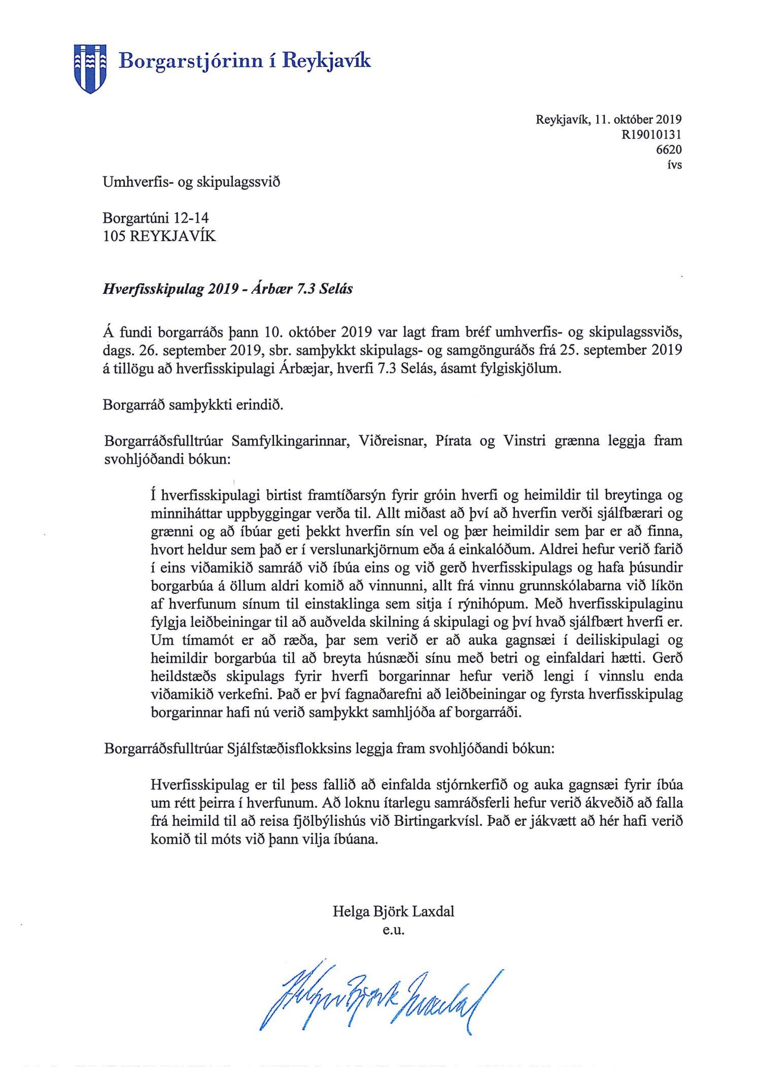 Lagt fram bréf borgarstjóra dags. 11. október 2019 vegna samþykktar borgarráðs frá 10. október 2019 á tillögu að hverfisskipulagi Árbæjar, hverfi 7.3 Selás.
