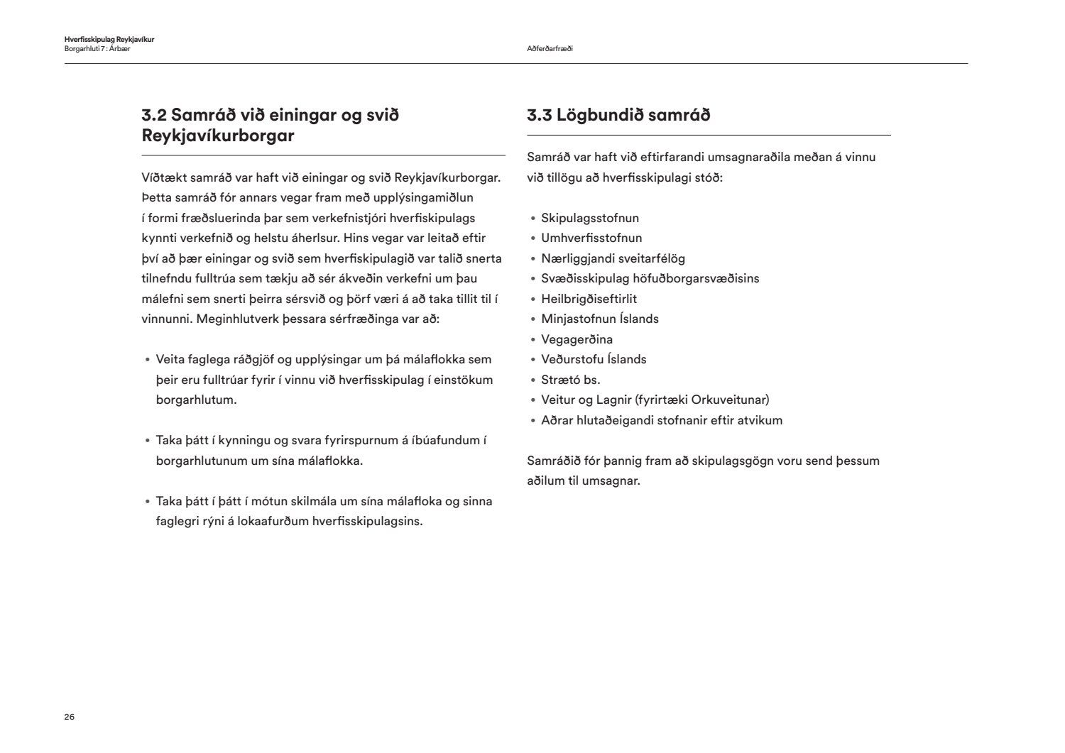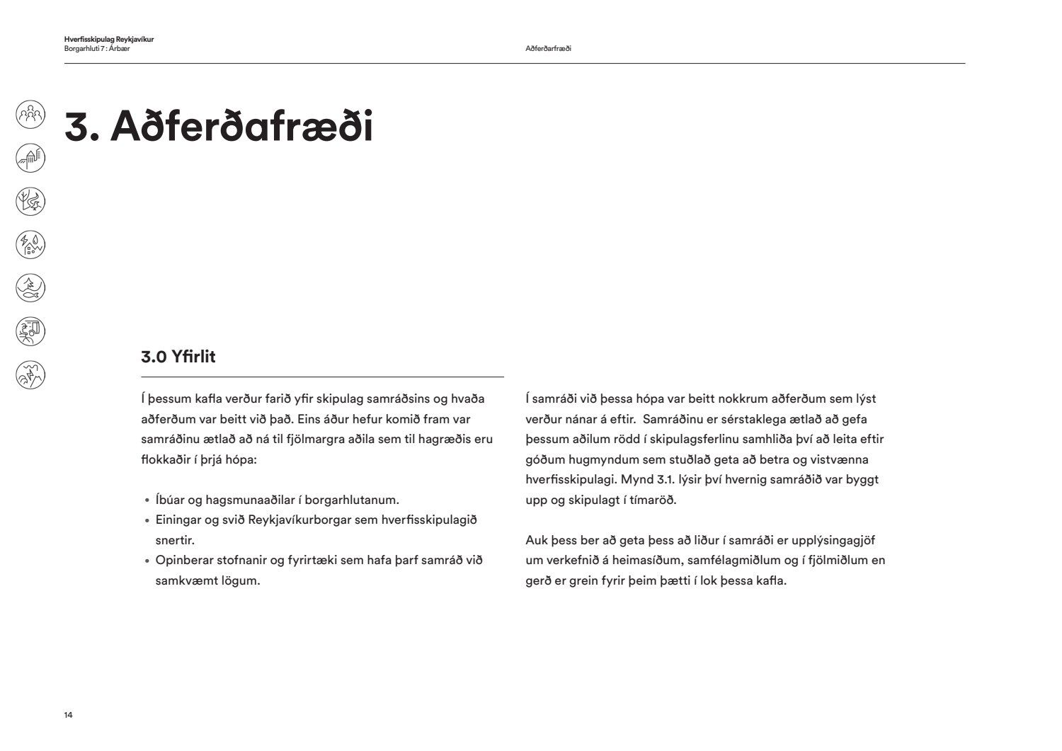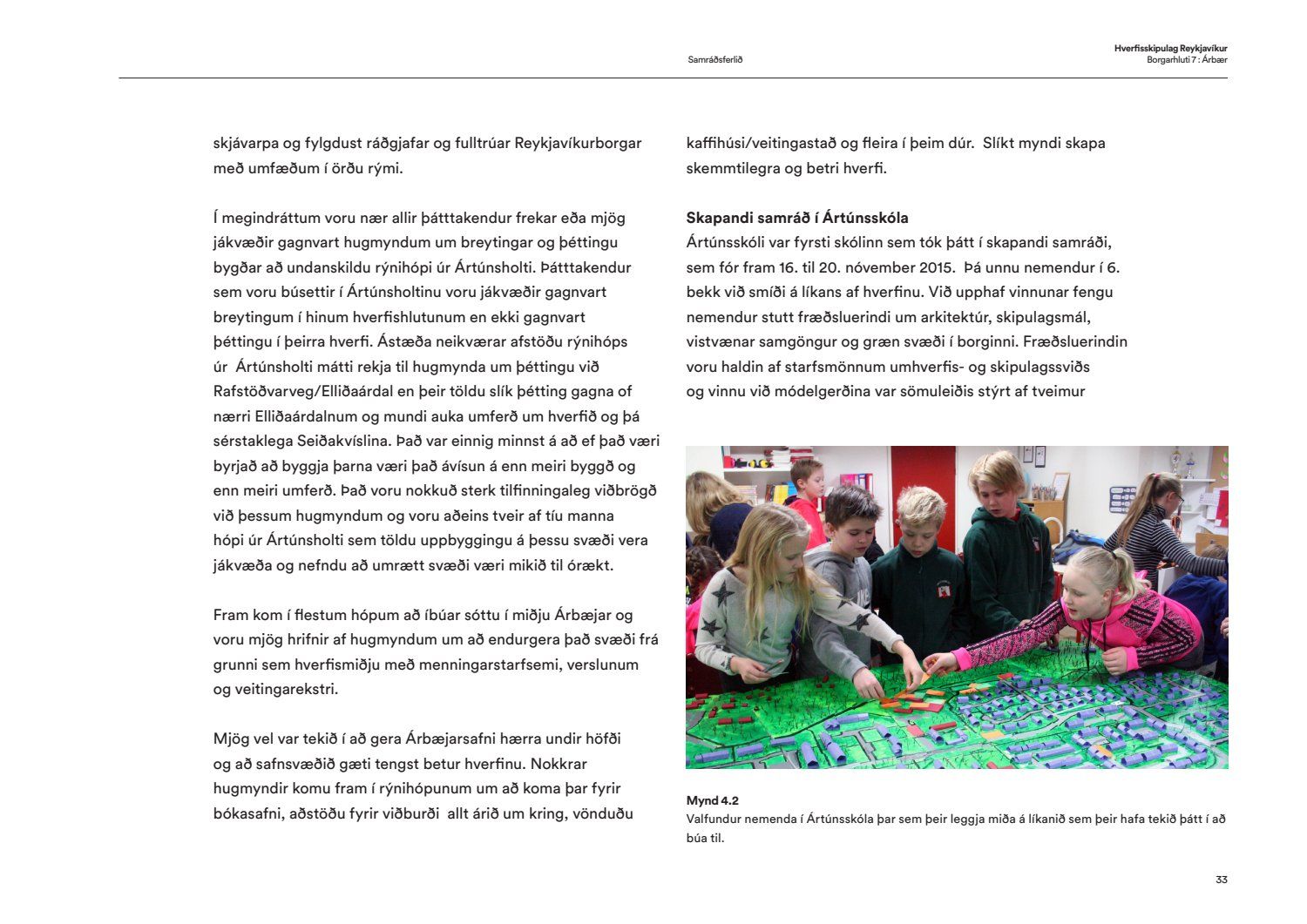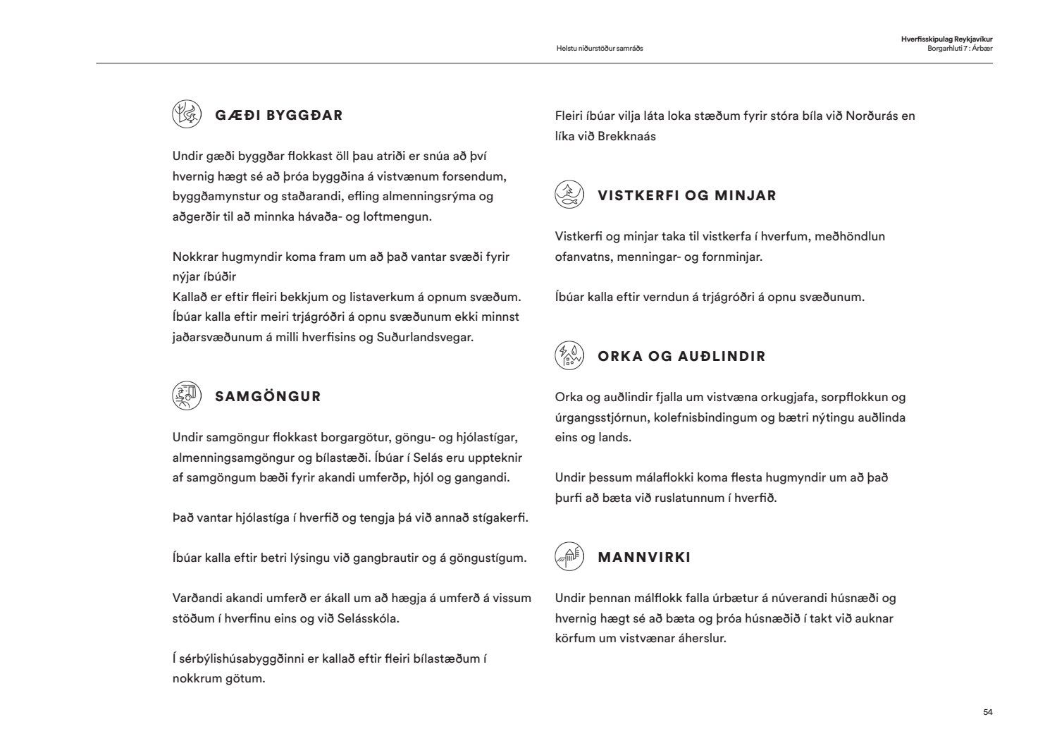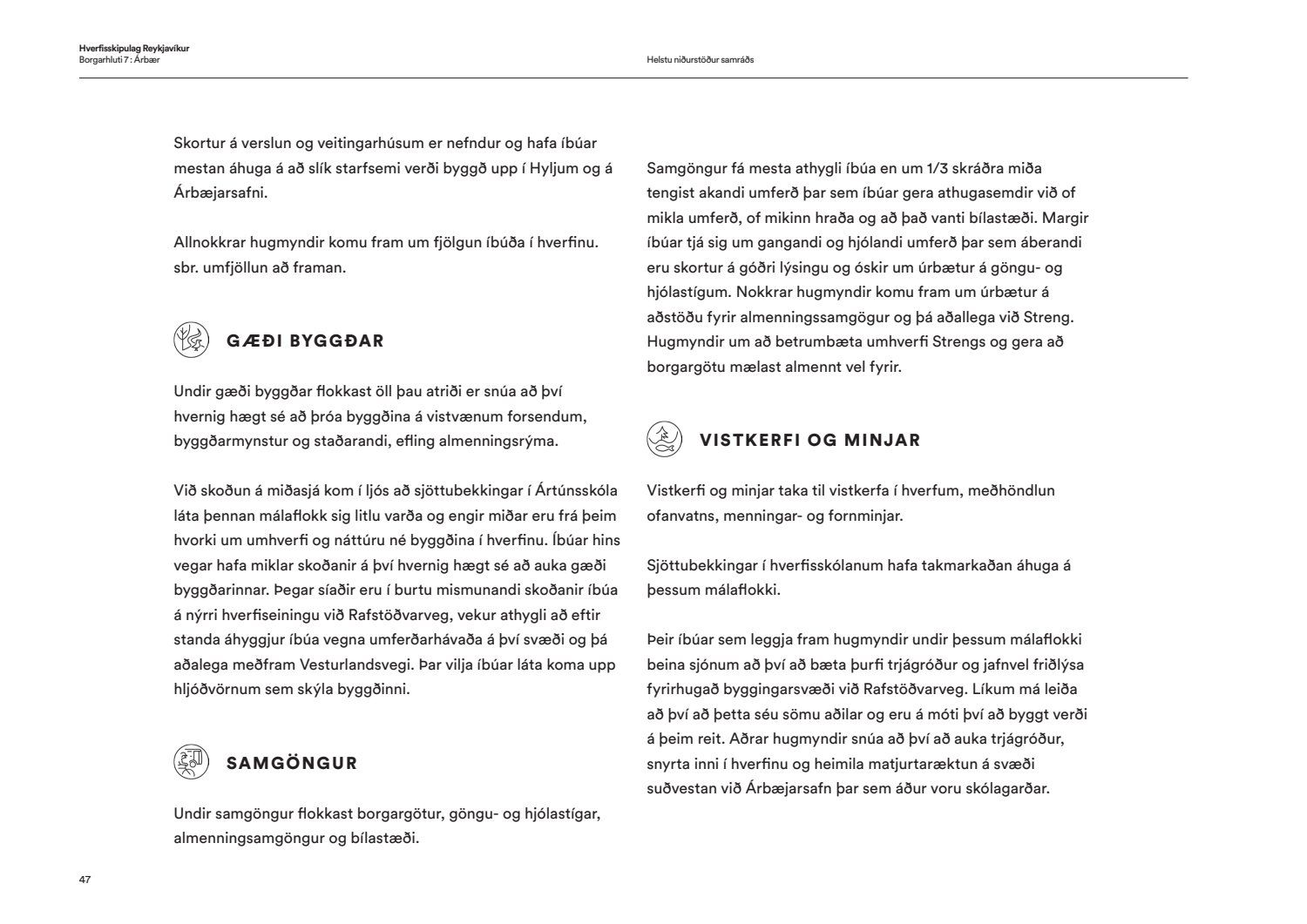 Skipulags- og samgönguráð bókar: “Í hverfisskipulagi birtist framtíðarsýn fyrir gróin hverfi og heimildir til breytinga og minniháttar uppbyggingar verða til. Allt miðaðst að því að hverfin verði sjálfbærari og grænni og að íbúar geti þekkt hverfin sín vel og þær heimildir sem þar er að finna hvort heldur sem það er í verslunarkjörnum eða á einkalóðum. Aldrei hefur verið farið í eins viðamikið samráð við íbúa eins og við gerð hverfisskipulags og hafa þúsundir borgarbúa á öllum aldri  komið að vinnunni, allt frá vinnu grunnskólabarna við módel af hverfunum sínum til einstaklinga sem sitja í rýnihópum. Með hverfisskipulaginu fylgja leiðbeiningar til að auðvelda skilning á skipulagi og því hvað sjálfbært hverfi er. Gerð heildstæðs skipulags fyrir hverfi borgarinnar hefur verið lengi í vinnslu enda viðamikið verkefni. Það er því fagnaðarefni að leiðbeiningar og fyrsta hverfisskipulag borgarinnar hafi nú verið samþykkt. Kynningarmynband af hverfisskipulaginu má finna hér: hvsk.is/horfa/hvad-er-hverfisskipulag”