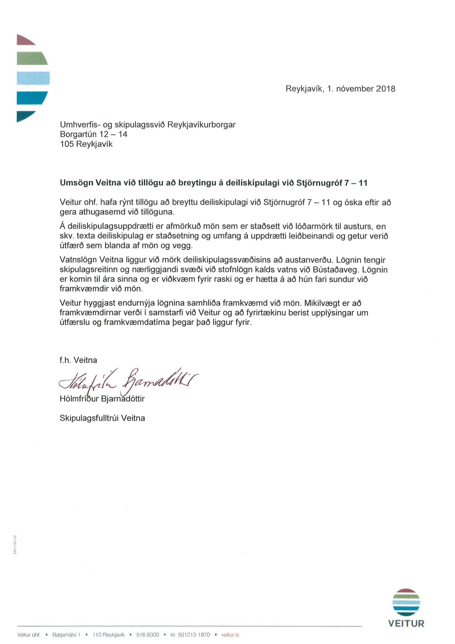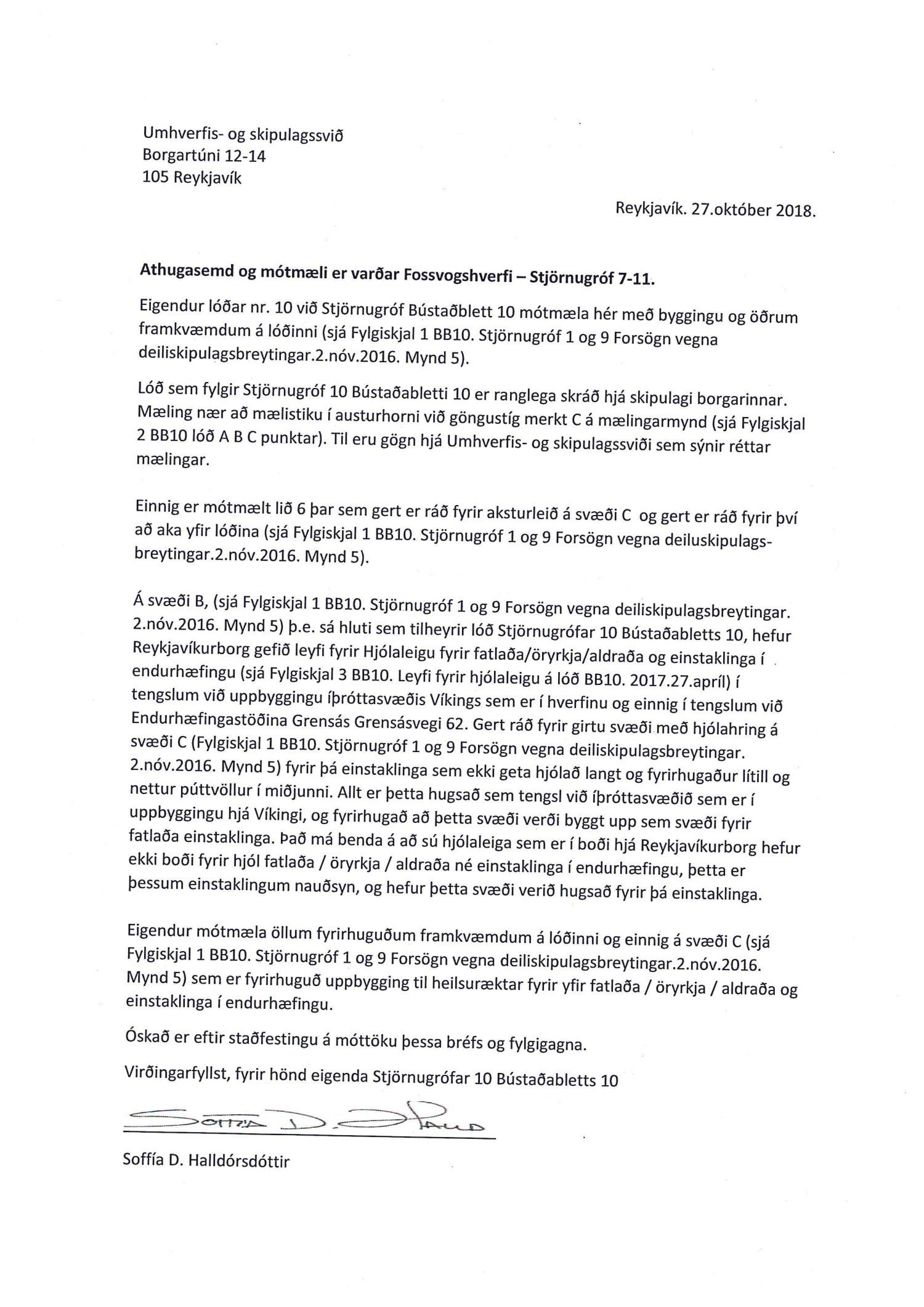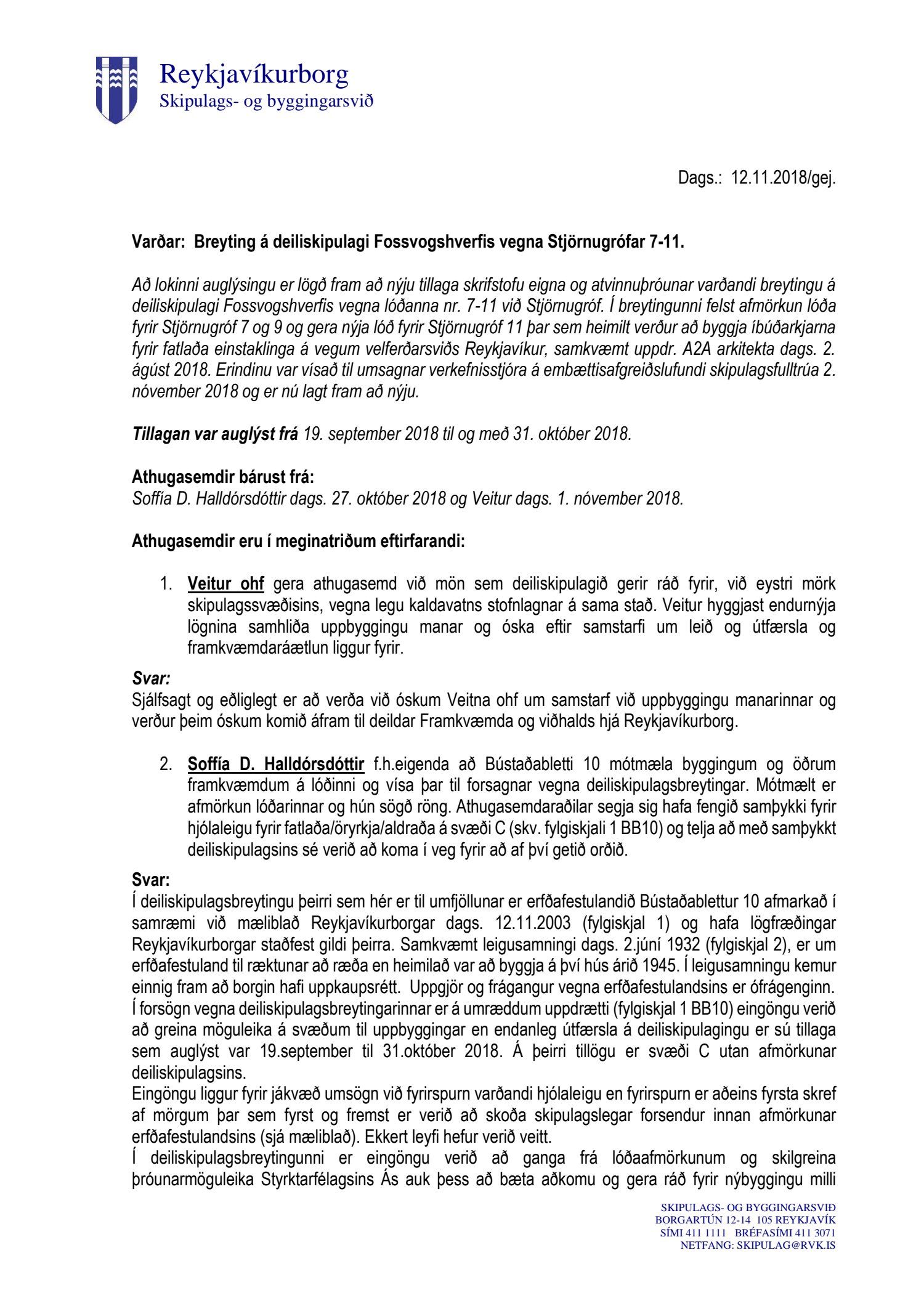 Að lokinni auglýsingu er lögð fram að nýju tillaga skrifstofu eigna og atvinnuþróunar varðandi breytingu á deiliskipulagi Fossvogshverfis vegna lóðanna nr. 7-11 við Stjörnugróf. Í breytingunni felst afmörkun lóða fyrir Stjörnugróf 7 og 9 og gera nýja lóð fyrir Stjörnugróf 11 þar sem heimilt verður að byggja íbúðarkjarna fyrir fatlaða einstaklinga á vegum velferðarsviðs Reykjavíkur, samkvæmt uppdr. A2A arkitekta dags. 2. ágúst 2018. Tillagan var auglýst frá 19. september 2018 til og með 31. október 2018. Eftirtaldir aðilar sendu athugasemdir: Soffía D. Halldórsdóttir dags. 27. október 2018 og Veitur dags. 1. nóvember 2018. Erindinu var vísað til umsagnar verkefnisstjóra á embættisafgreiðslufundi skipulagsfulltrúa 2. nóvember 2018 og er nú lagt fram að nýju.