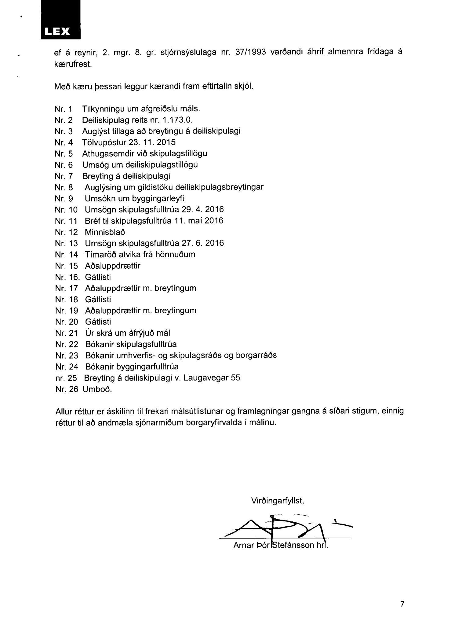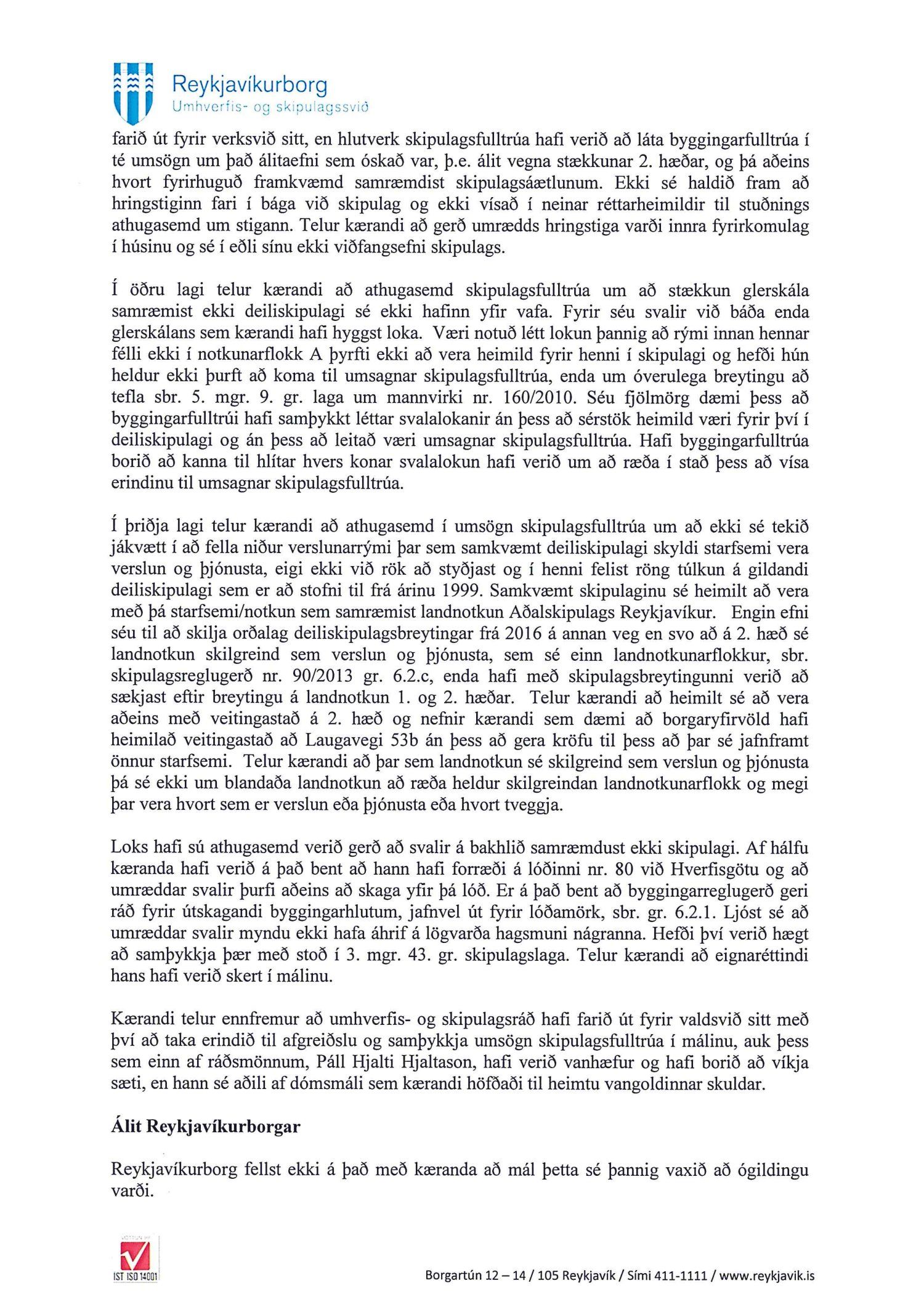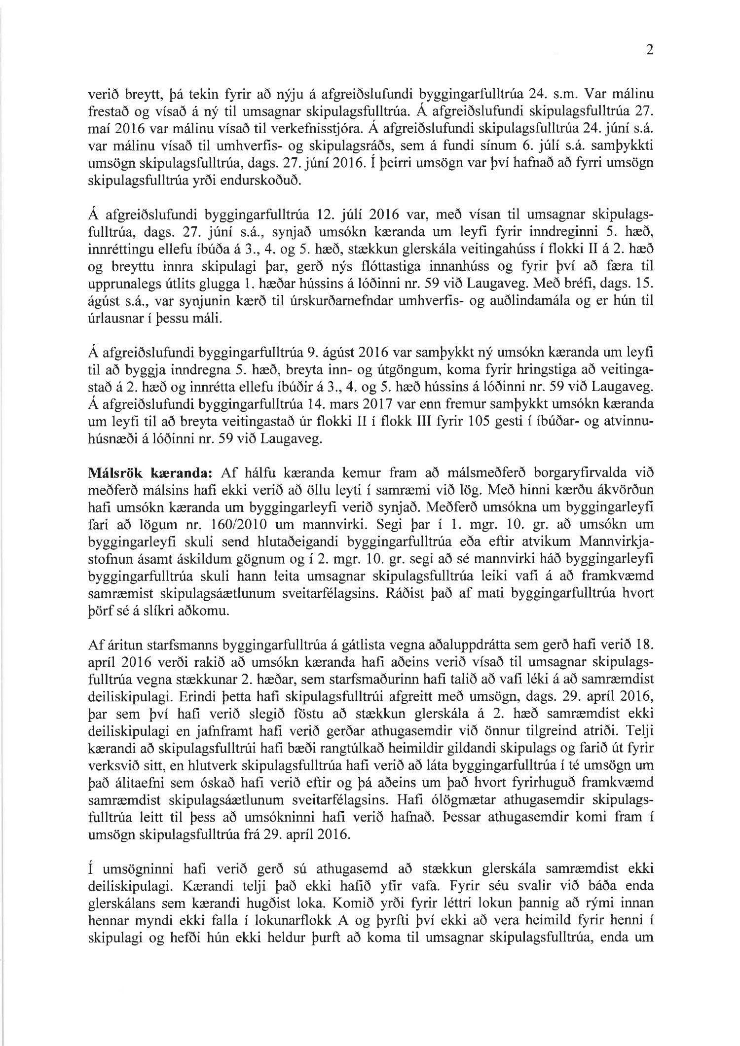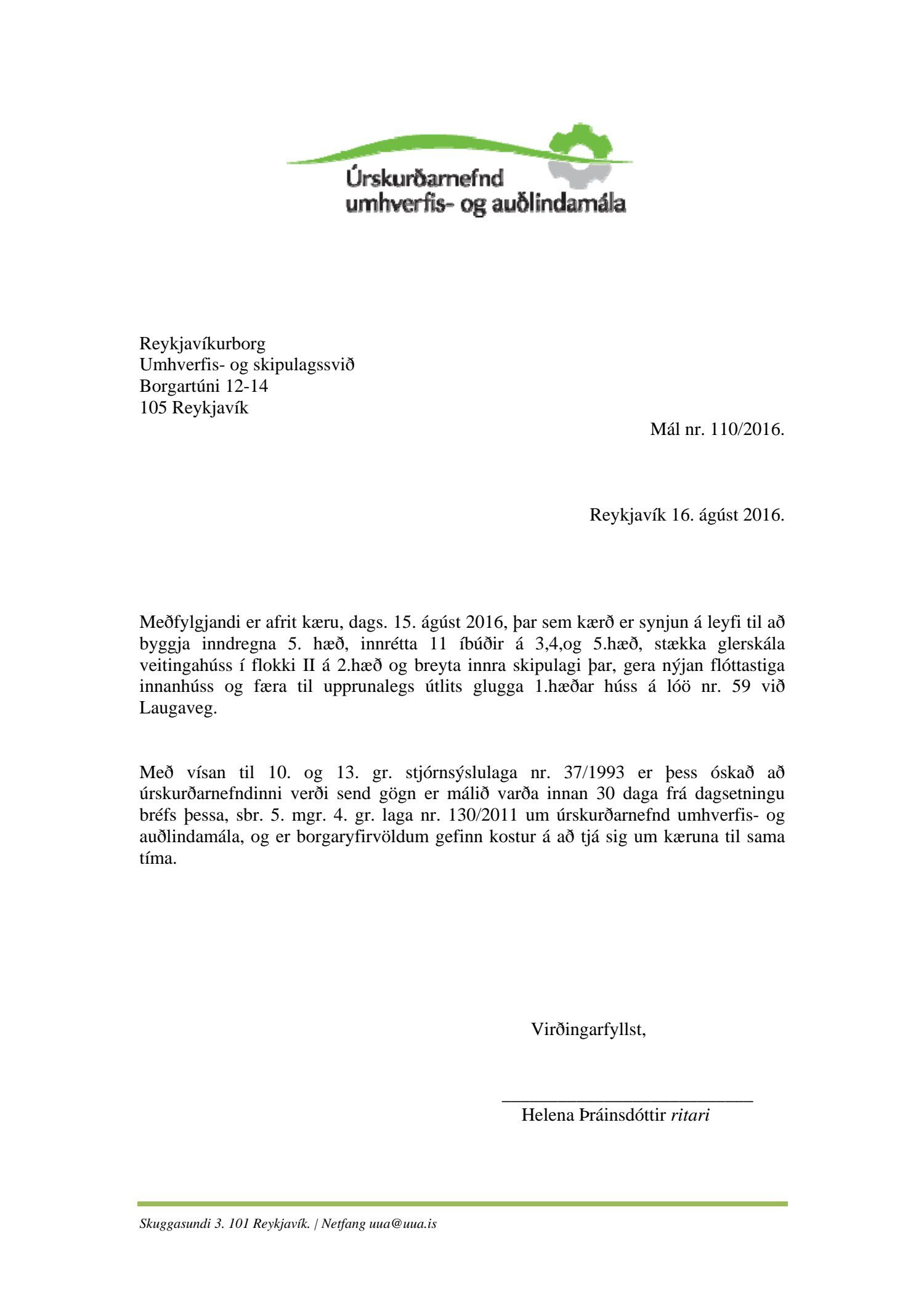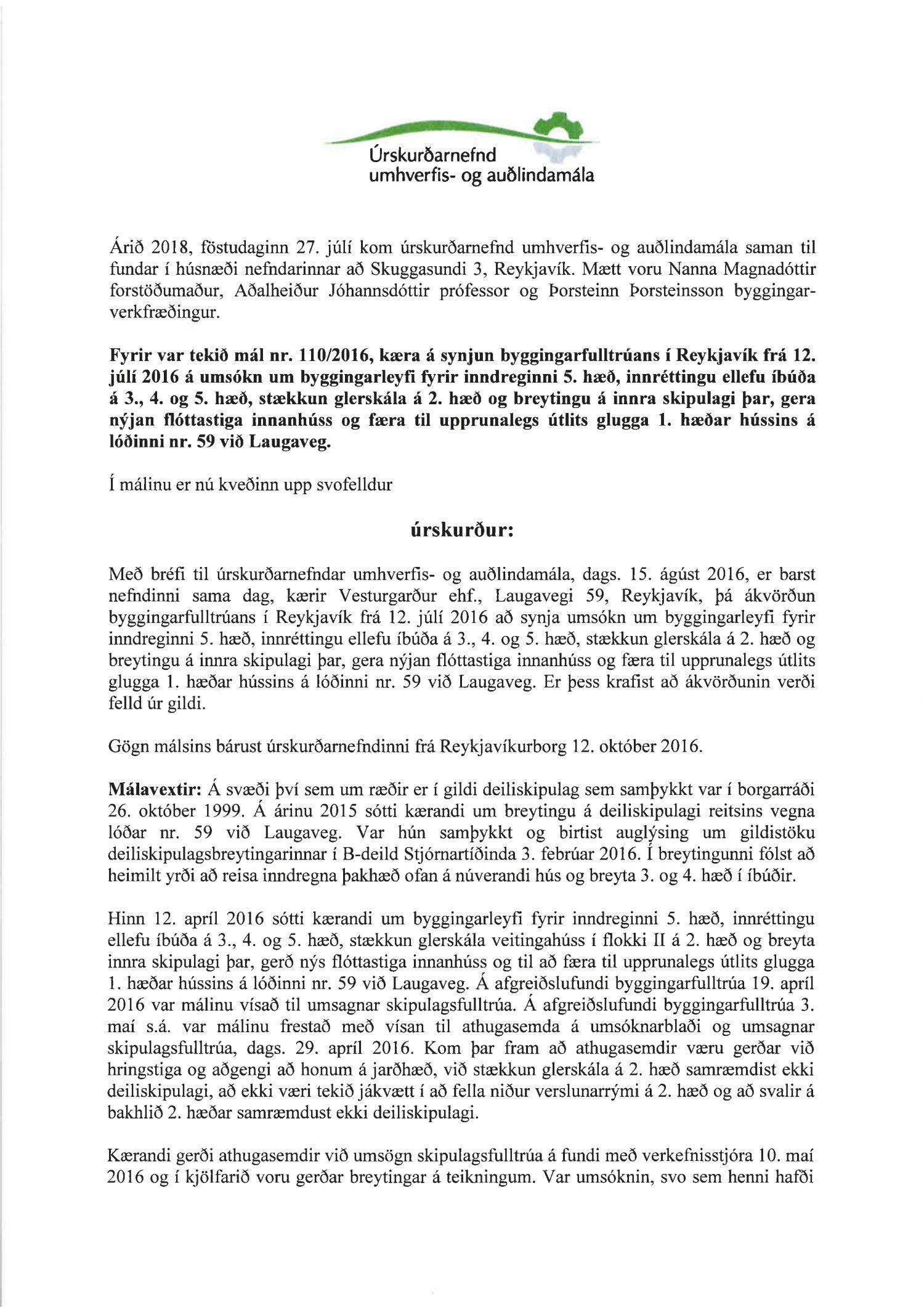 Lagt fram bréf úrskurðarnefnar umhverfis- og auðlindamála, dags. 16. ágúst 2016, ásamt kæru þar sem kærð er synjun á leyfi til að byggja inndregna 5. hæð, innrétta 11 íbúðir á 3,4,og 5.hæð, stækka glerskála veitingahúss í flokki II á 2.hæð og breyta innra skipulagi þar, gera nýjan flóttastiga innanhúss og færa til upprunalegs útlits glugga 1.hæðar húss á lóö nr. 59 við Laugaveg. Einnig lögð fram umsögn umhverfis- og skipulagssviðs, skrifstofu sviðsstjóra, dags. 10. október 2016. Jafnframt er lagður fram úrskurður úrskurðarnefndar umhverfis- og auðlindamála frá 27. júlí 2018. Úrskurðarorð: Kærumáli þessu er vísað frá úrskurðarnefndinni.