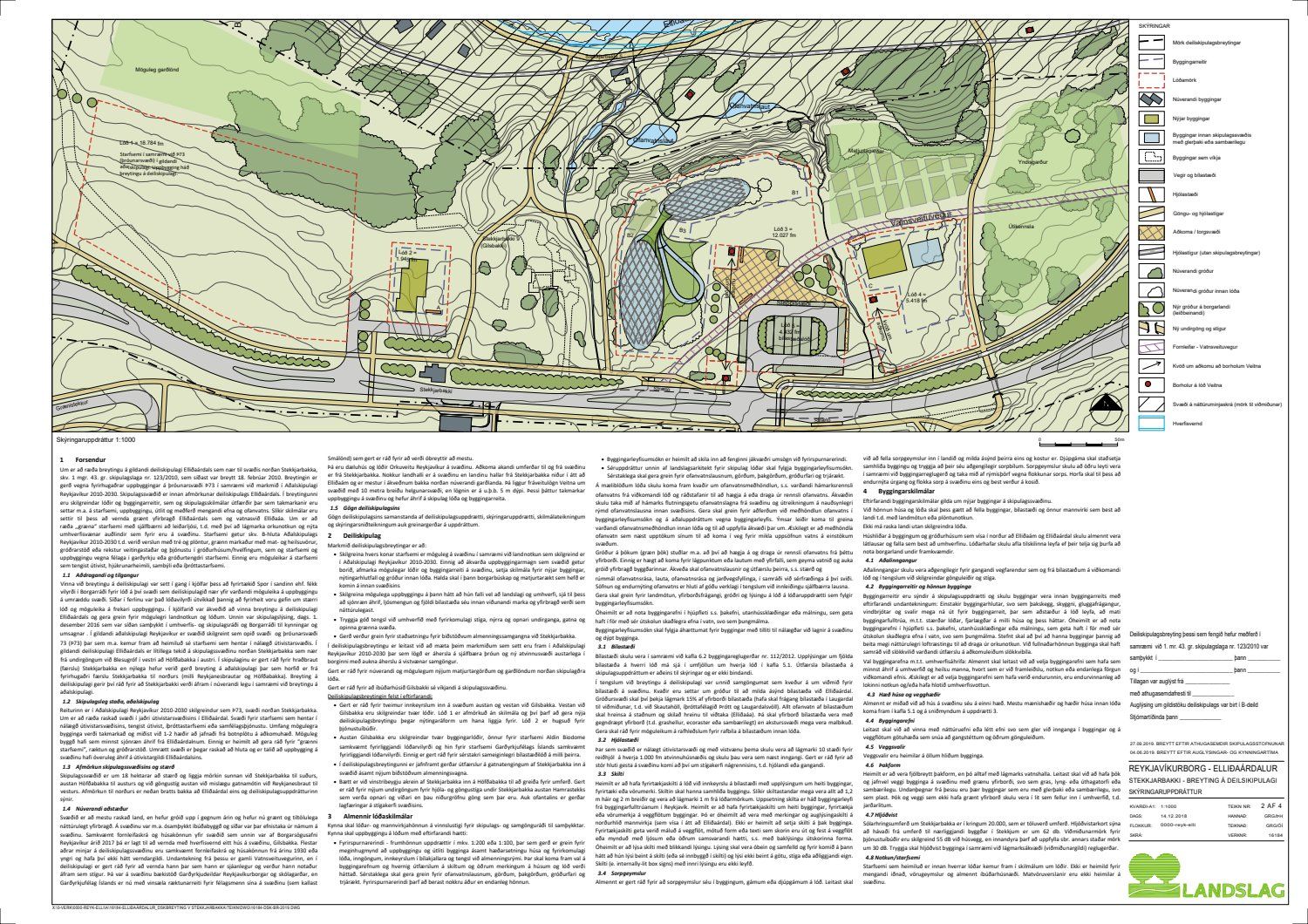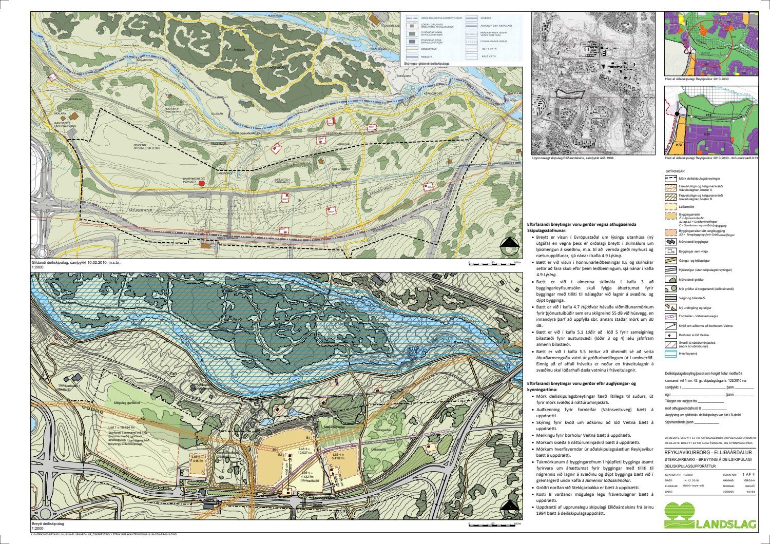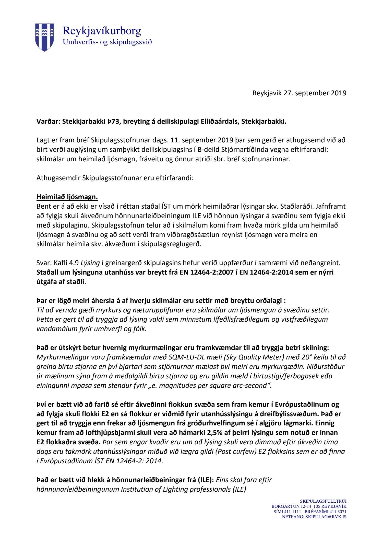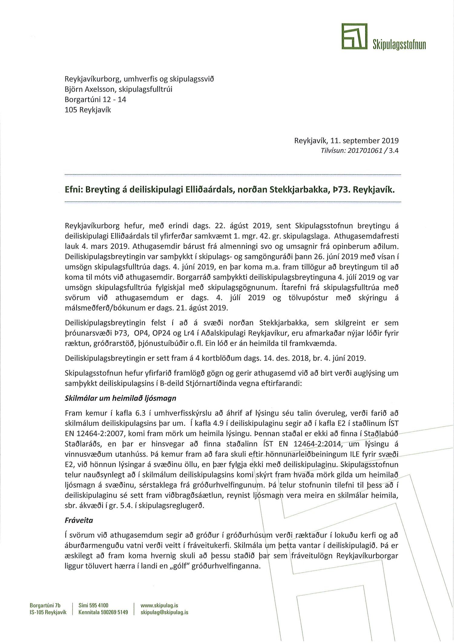 Lagt fram bréf Skipulagsstofnunar dags. 11. september 2019 þar sem bent er á að áður en gengið verður frá auglýsingu um samþykkt deiliskipulagsins í B-deild Stjórnartíðinda þurfi að gera betur grein fyrir eftirfarandi: Skilmálum um heimilað ljósmagn, leitað verði afstöðu Heilbrigðiseftirlits um viðmiðunarmörk vegna umferðarhávaða fyrir þjónustuíbúðir, fyrirkomulag á fráveitulögnum og önnur atriði sbr. bréfi stofnunarinnar. Einnig eru lagðir fram uppdrættir Landslags dags. 14. desember 2018, síðast breyttir 27. september 2019 ásamt umsögn skipulagsfulltrúa dags. 27. sept. 2019.